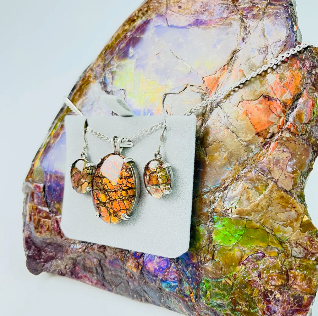 The tremendous iridescence of Ammolite is due to the microstructure of the numerous aragonite layers. Ammolite has been compared to the most expensive Black Opal. Ocular Dynamics is the visual experience achieved when rotating and moving the Ammolite around a central light source to expose the gemstone's natural beauty.