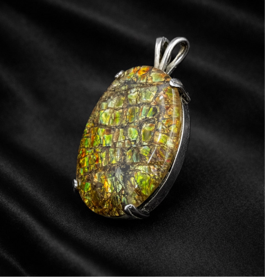 The tremendous iridescence of Ammolite is due to the microstructure of the numerous aragonite layers. Ammolite has been compared to the most expensive Black Opal. Ocular Dynamics is the visual experience achieved when rotating and moving the Ammolite around a central light source to expose the gemstone's natural beauty.