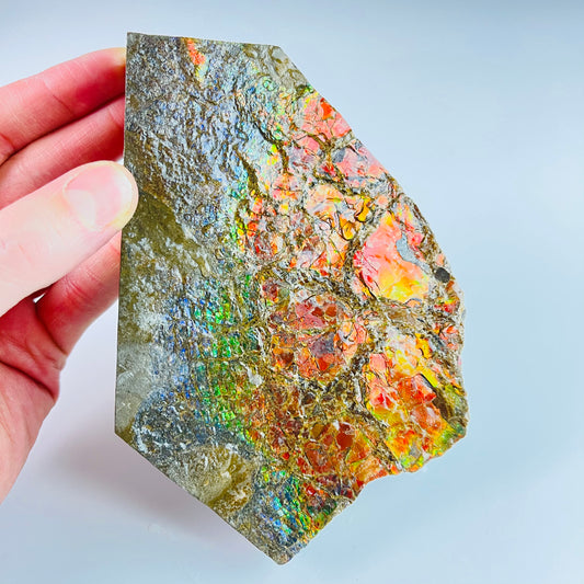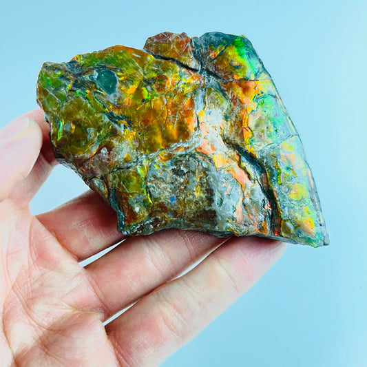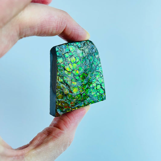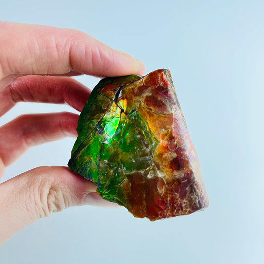 Beauty is in the eye of the beholder. Ammolite fossils can have all the colors of the rainbow. Red and green are the most common. Most gemstone colors come from light absorption like the way a diamond sparkles when the light comes in through the table. The color of Ammolite however is achieved from light interference as it rebounds through the stacked layers of aragonite.