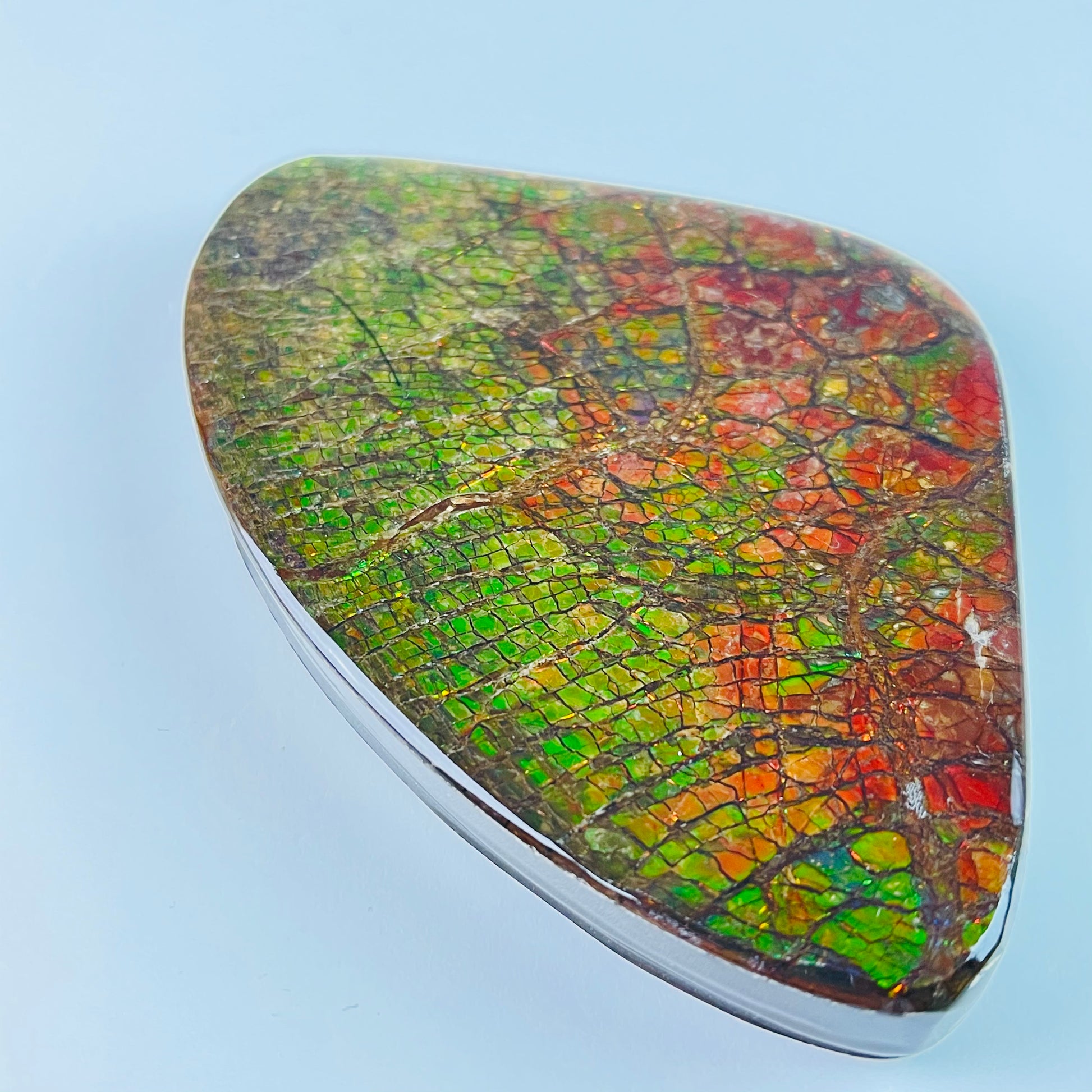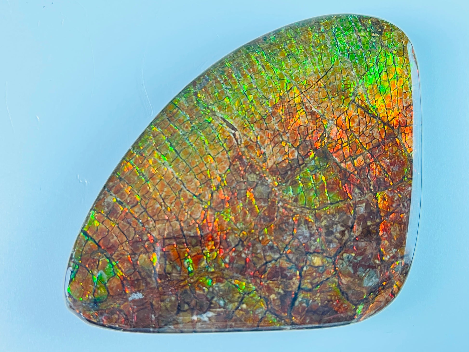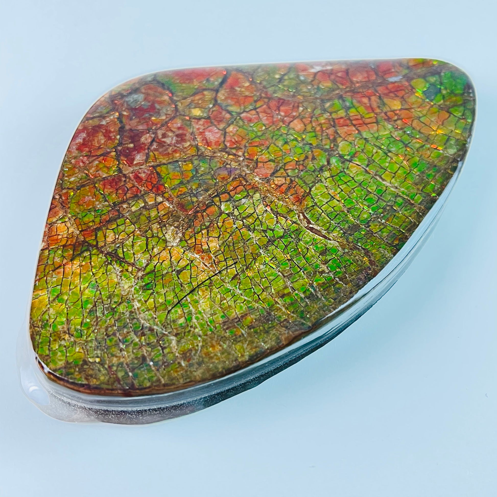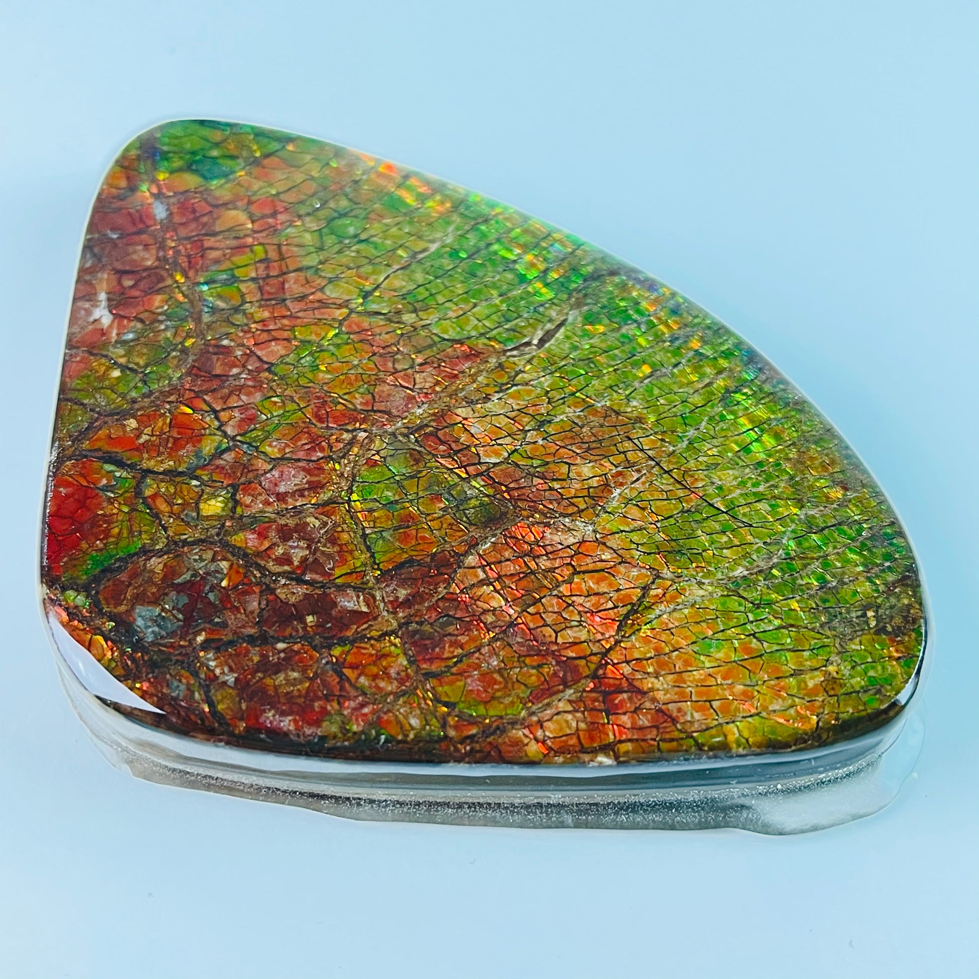 Description: A multicolor beautiful desktop palm-size ammolite art piece.