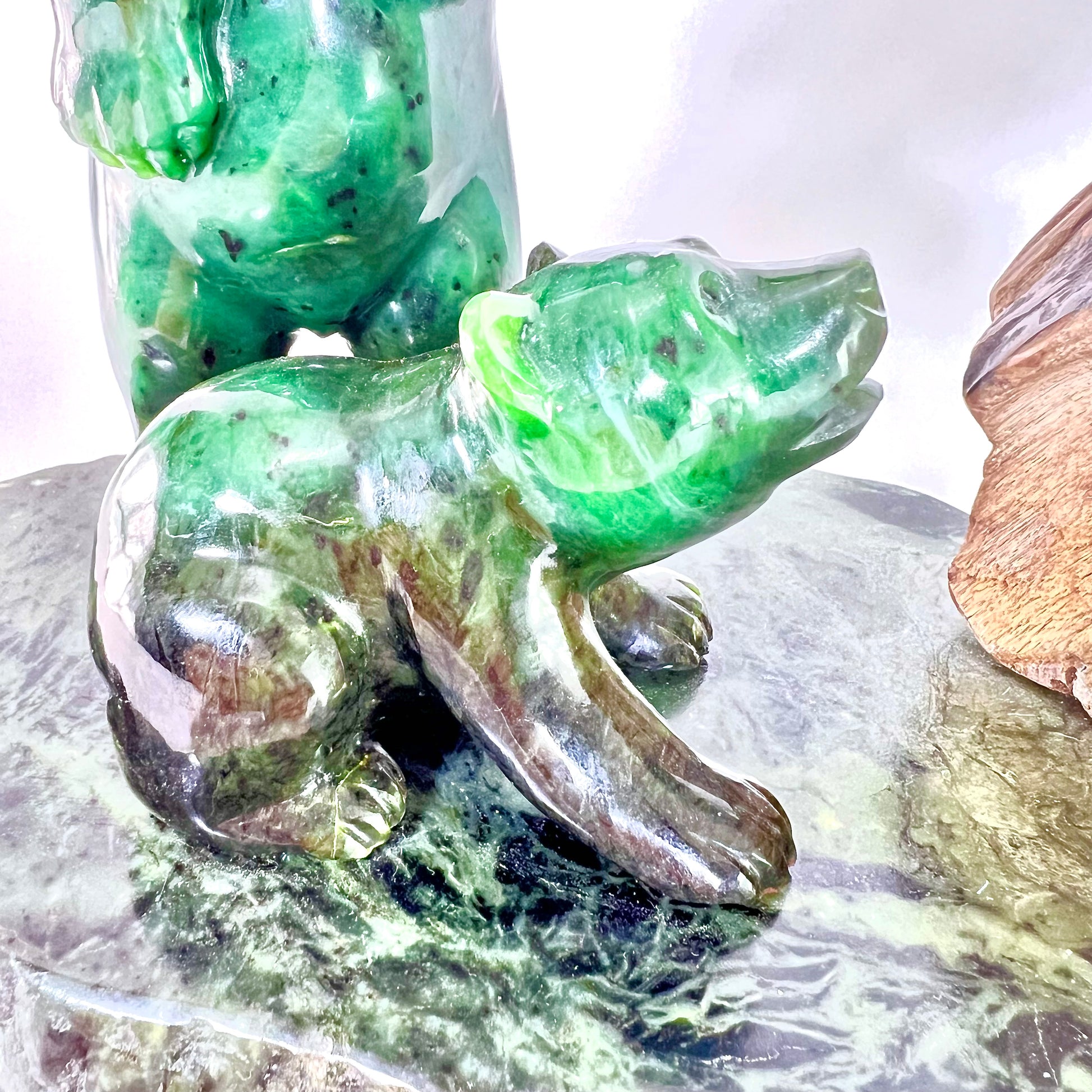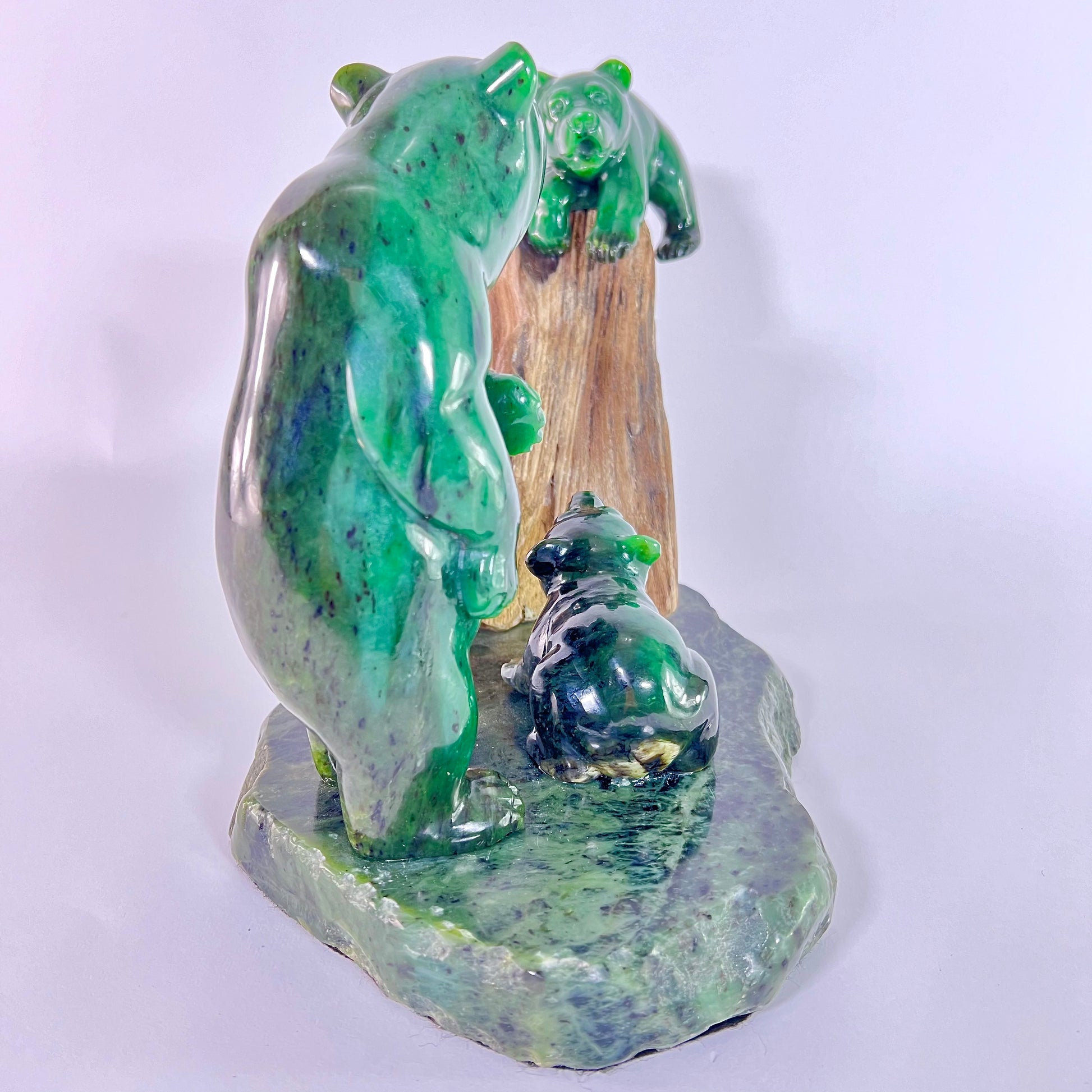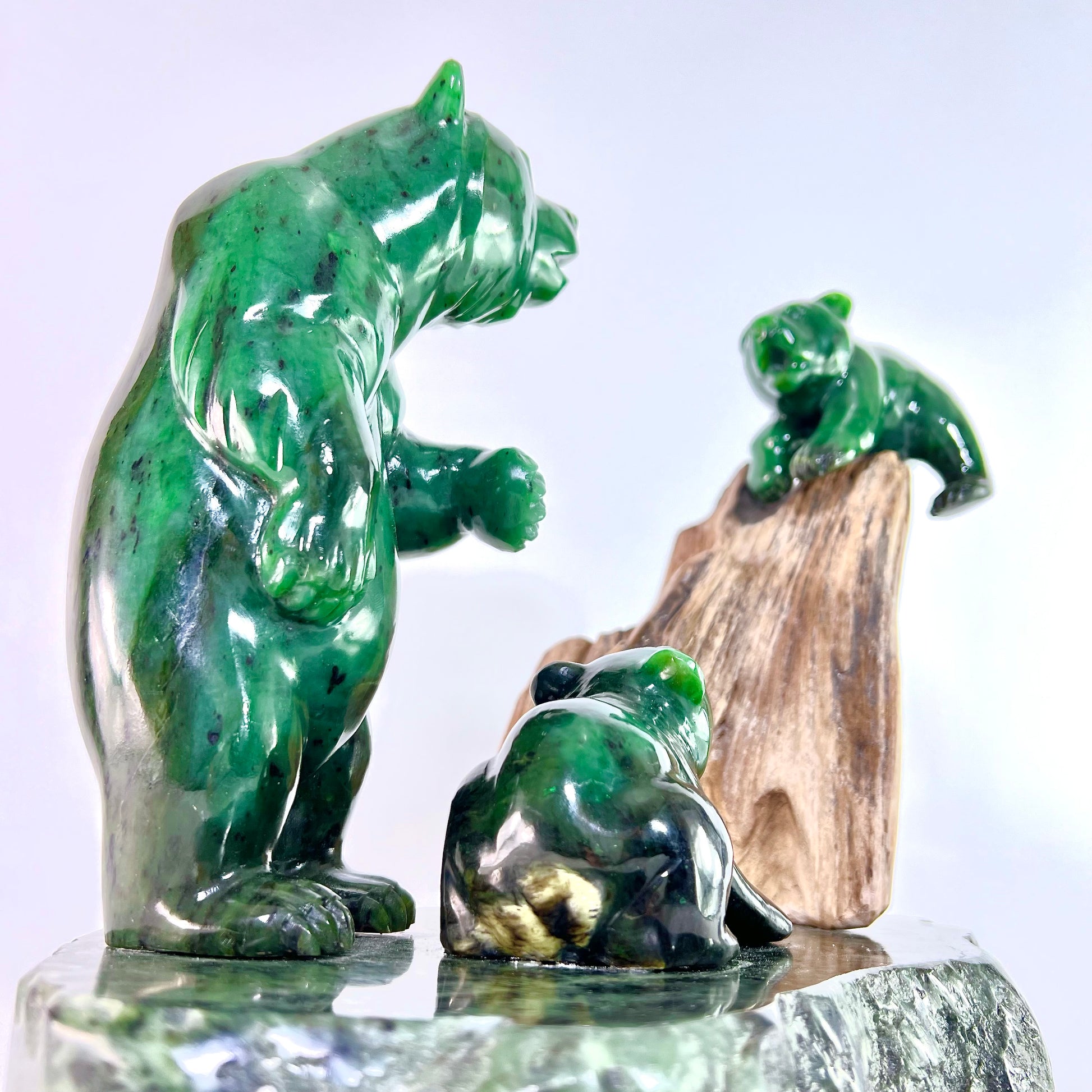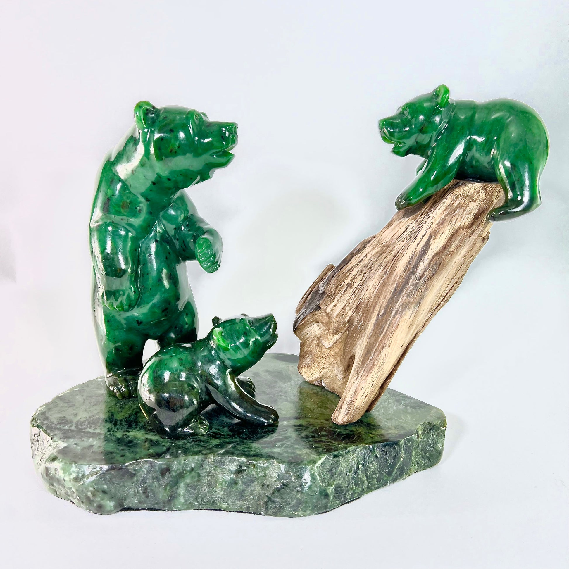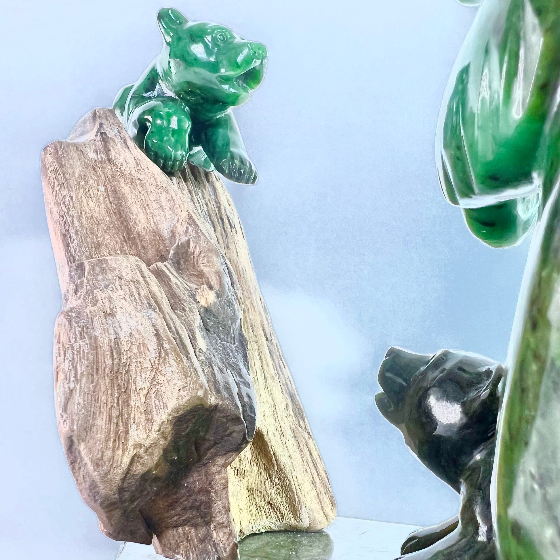 "Cub Time" is a delightful sculpture that beautifully captures the playful essence of a bear family. Crafted from Whistler, BC nephrite jade, this piece showcases a mother bear and her two cubs engaged in a moment of exploration and joy. The sculpture stands 9.5 inches tall, with dimensions of 12.5 by 7 inches, and weighs 14 pounds. The rich green hue of the nephrite jade brings a lifelike vibrancy to the bears, highlighting their smooth, polished surfaces and the detailed expressions on their faces. A piece of natural wood is skillfully integrated into the composition, serving as a playful perch for one of the cubs, adding a dynamic element to the scene. The solid jade base ensures stability and coherence in the overall design. Made in British Columbia, Canada, "Cub Time" exemplifies the artist's ability to blend natural materials with artistic creativity, celebrating the tender and joyous moments of wildlife. This sculpture not only captures a heartwarming narrative but also stands as a testament to the beauty and versatility of nephrite jade in contemporary art.