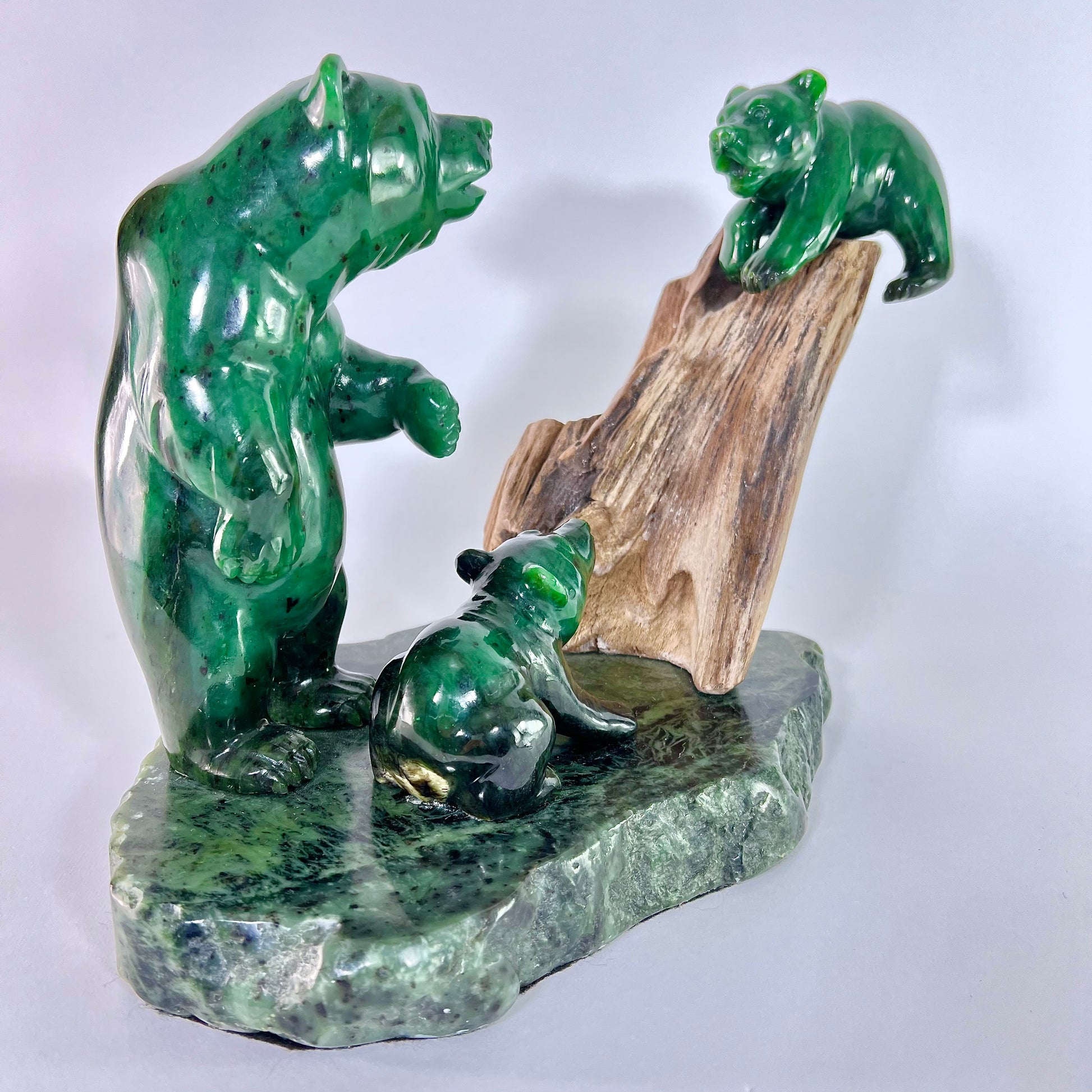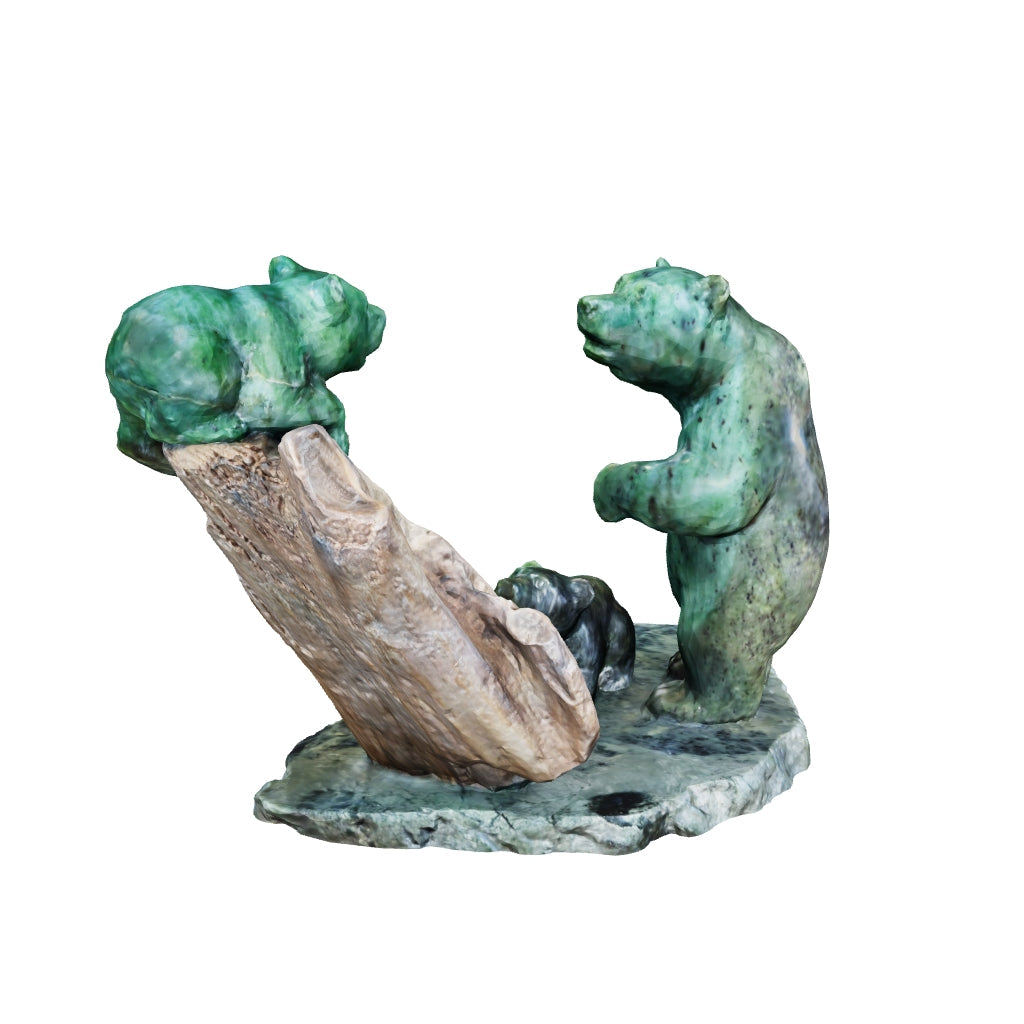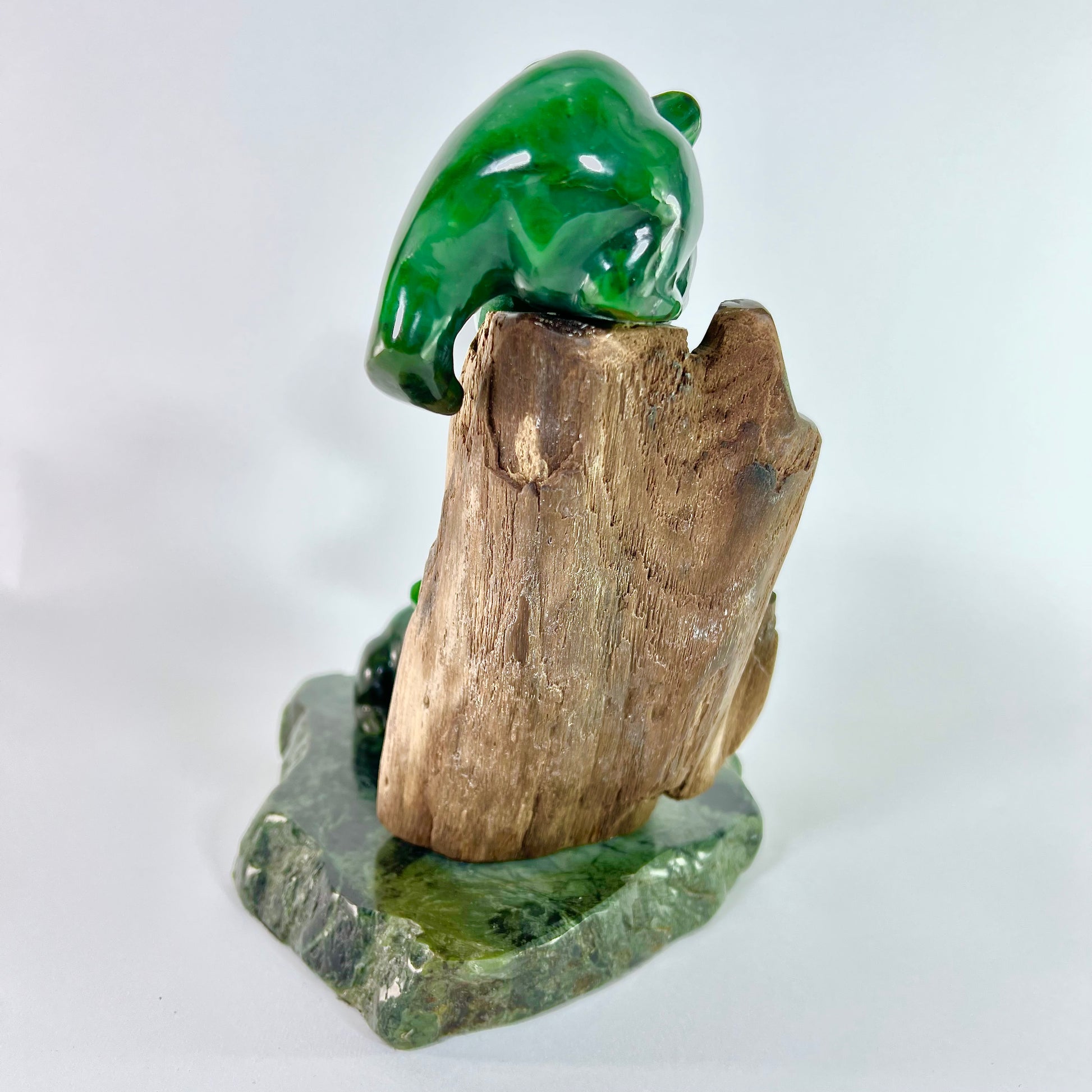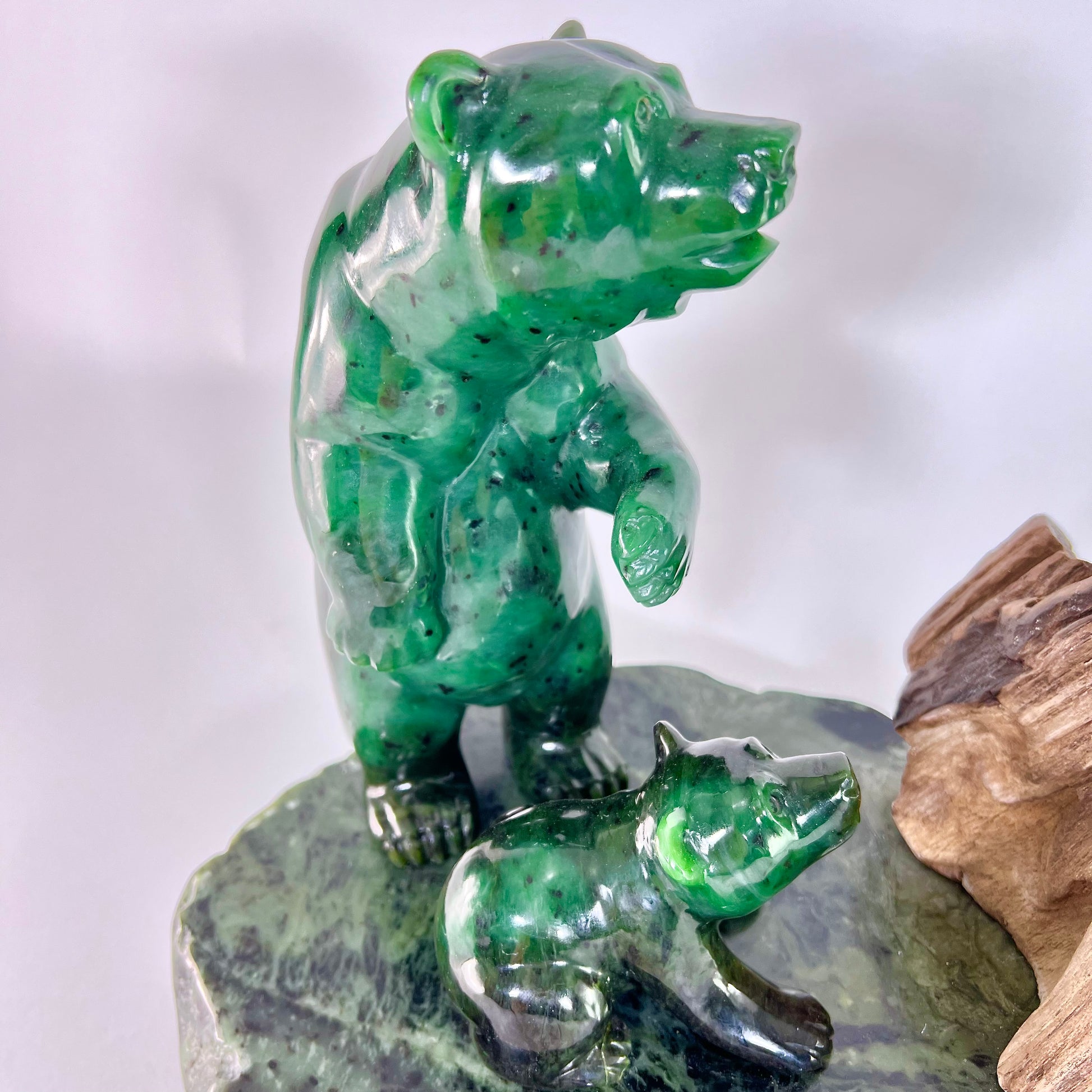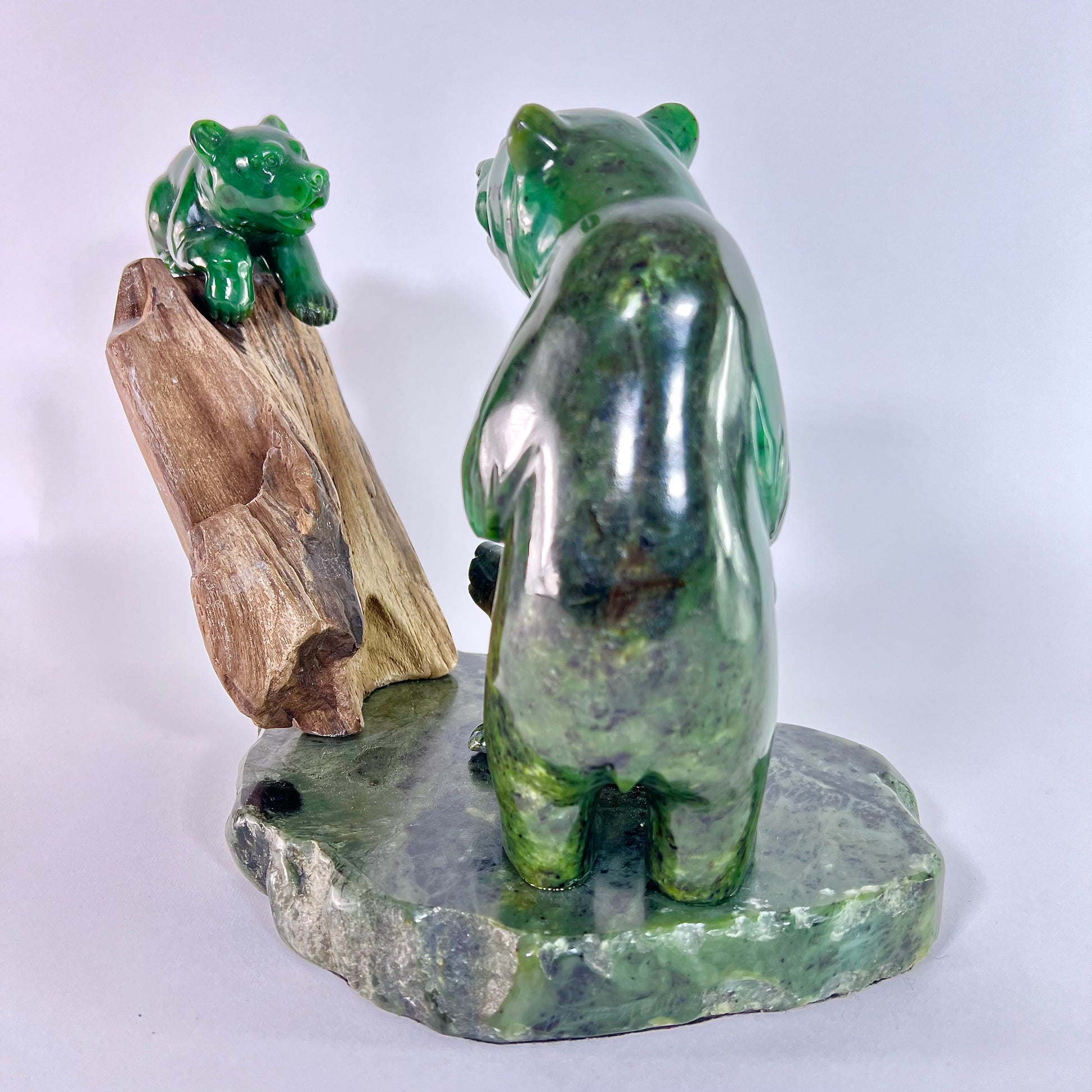 "Cub Time" is a delightful sculpture that beautifully captures the playful essence of a bear family. Crafted from Whistler, BC nephrite jade, this piece showcases a mother bear and her two cubs engaged in a moment of exploration and joy. The sculpture stands 9.5 inches tall, with dimensions of 12.5 by 7 inches, and weighs 14 pounds. The rich green hue of the nephrite jade brings a lifelike vibrancy to the bears, highlighting their smooth, polished surfaces and the detailed expressions on their faces. A piece of natural wood is skillfully integrated into the composition, serving as a playful perch for one of the cubs, adding a dynamic element to the scene. The solid jade base ensures stability and coherence in the overall design. Made in British Columbia, Canada, "Cub Time" exemplifies the artist's ability to blend natural materials with artistic creativity, celebrating the tender and joyous moments of wildlife. This sculpture not only captures a heartwarming narrative but also stands as a testament to the beauty and versatility of nephrite jade in contemporary art.