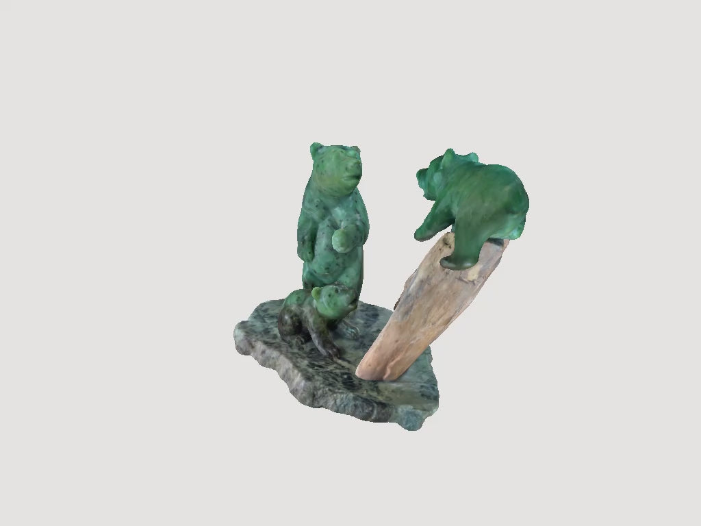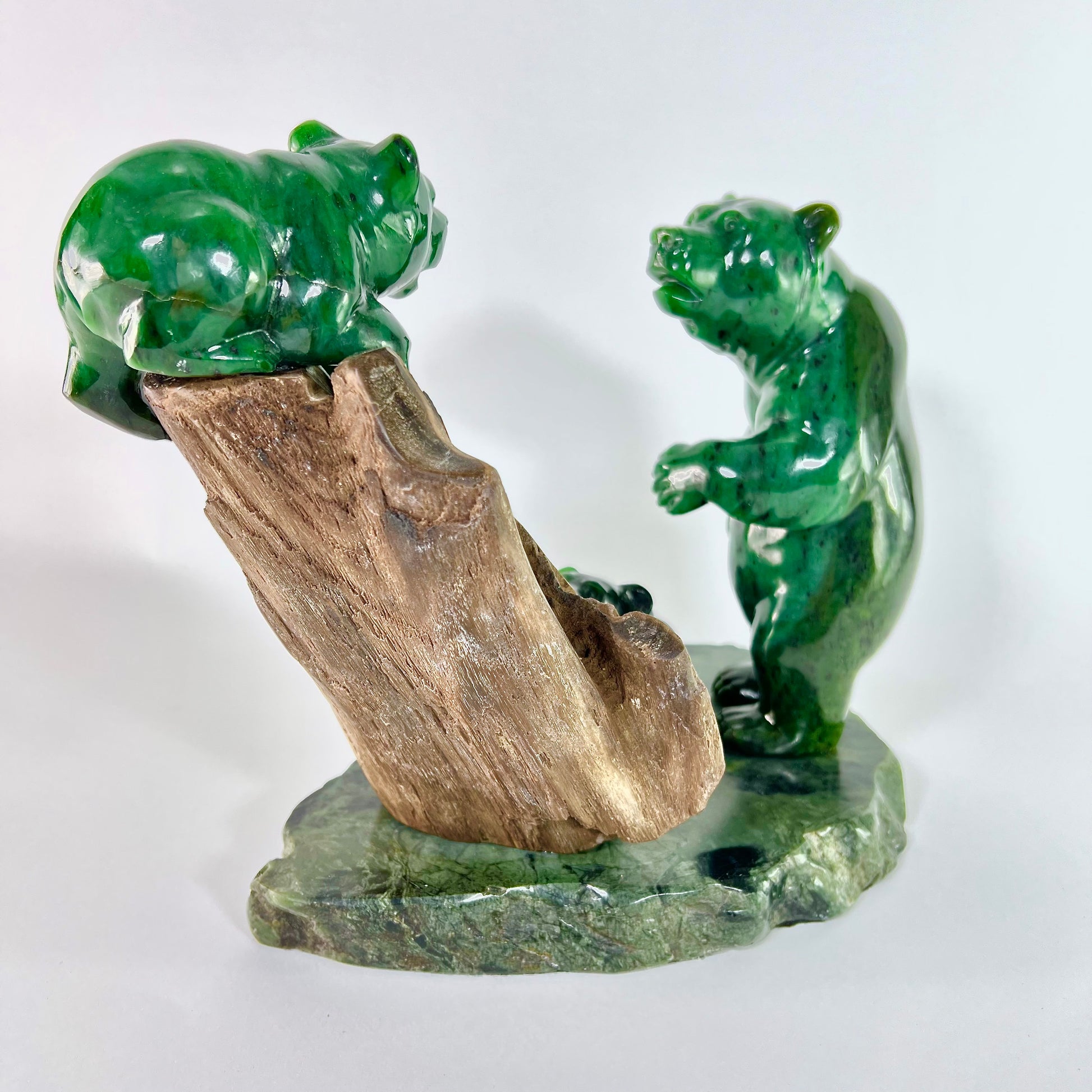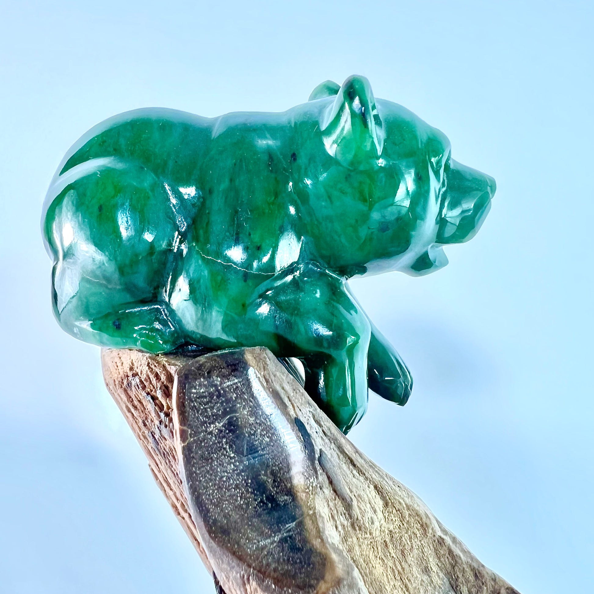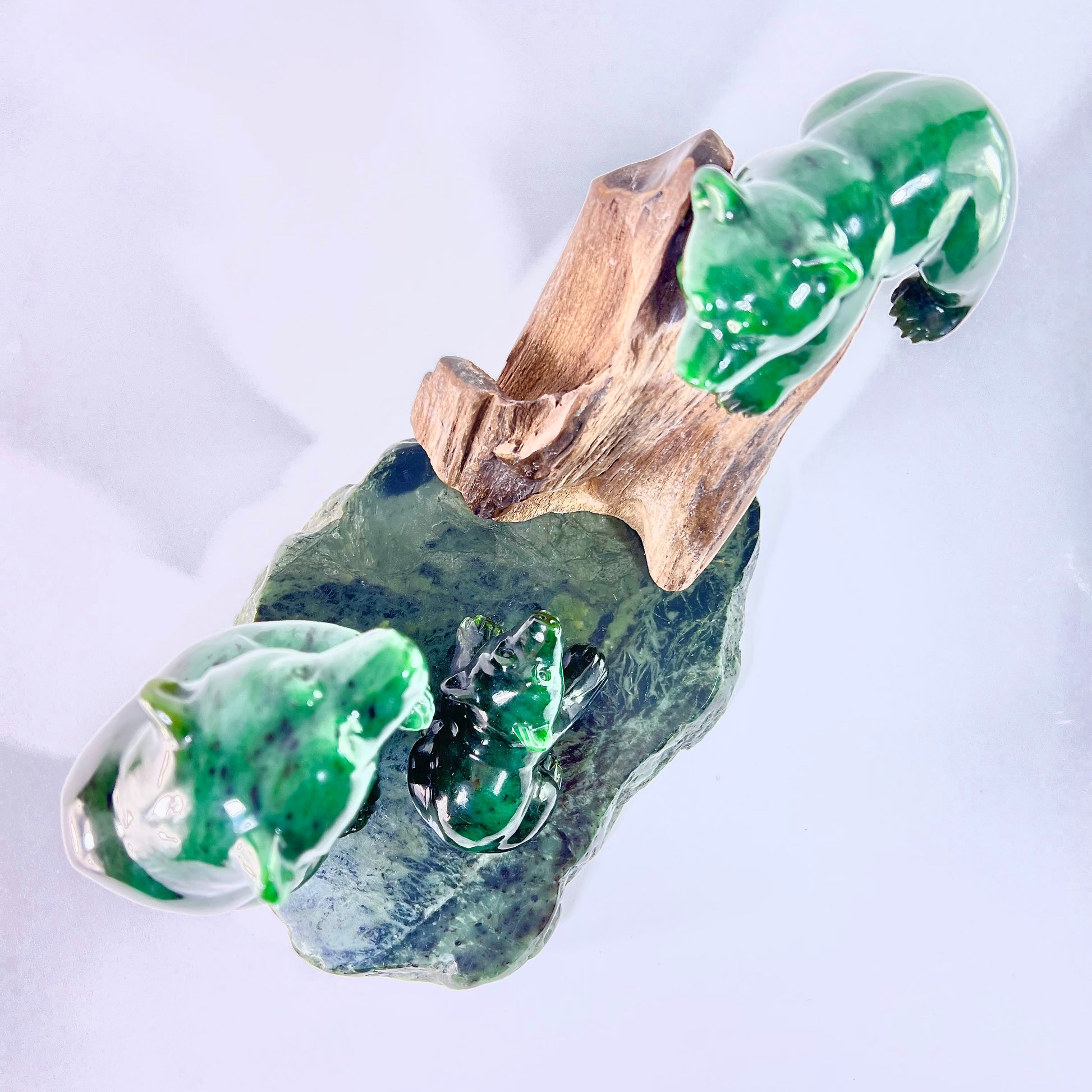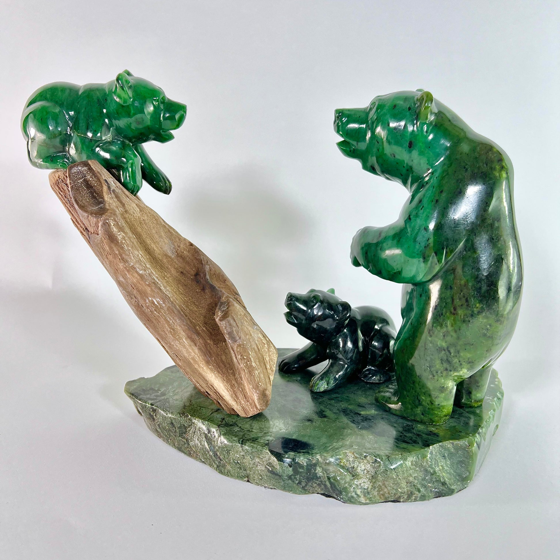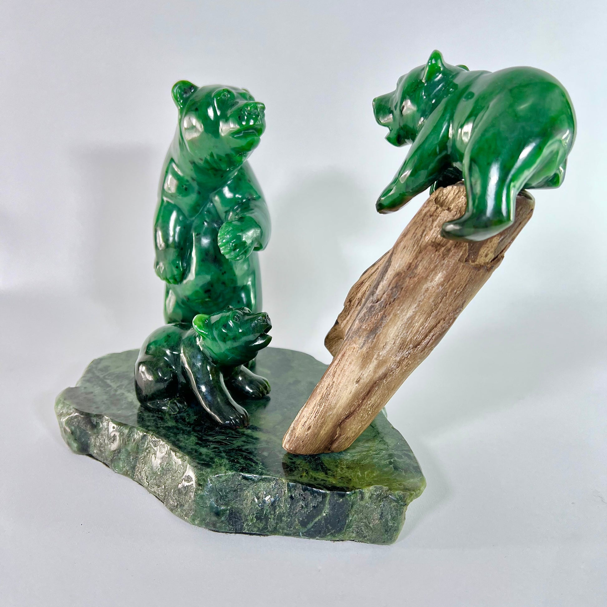 "Cub Time" is a delightful sculpture that beautifully captures the playful essence of a bear family. Crafted from Whistler, BC nephrite jade, this piece showcases a mother bear and her two cubs engaged in a moment of exploration and joy. The sculpture stands 9.5 inches tall, with dimensions of 12.5 by 7 inches, and weighs 14 pounds. The rich green hue of the nephrite jade brings a lifelike vibrancy to the bears, highlighting their smooth, polished surfaces and the detailed expressions on their faces. A piece of natural wood is skillfully integrated into the composition, serving as a playful perch for one of the cubs, adding a dynamic element to the scene. The solid jade base ensures stability and coherence in the overall design. Made in British Columbia, Canada, "Cub Time" exemplifies the artist's ability to blend natural materials with artistic creativity, celebrating the tender and joyous moments of wildlife. This sculpture not only captures a heartwarming narrative but also stands as a testament to the beauty and versatility of nephrite jade in contemporary art.