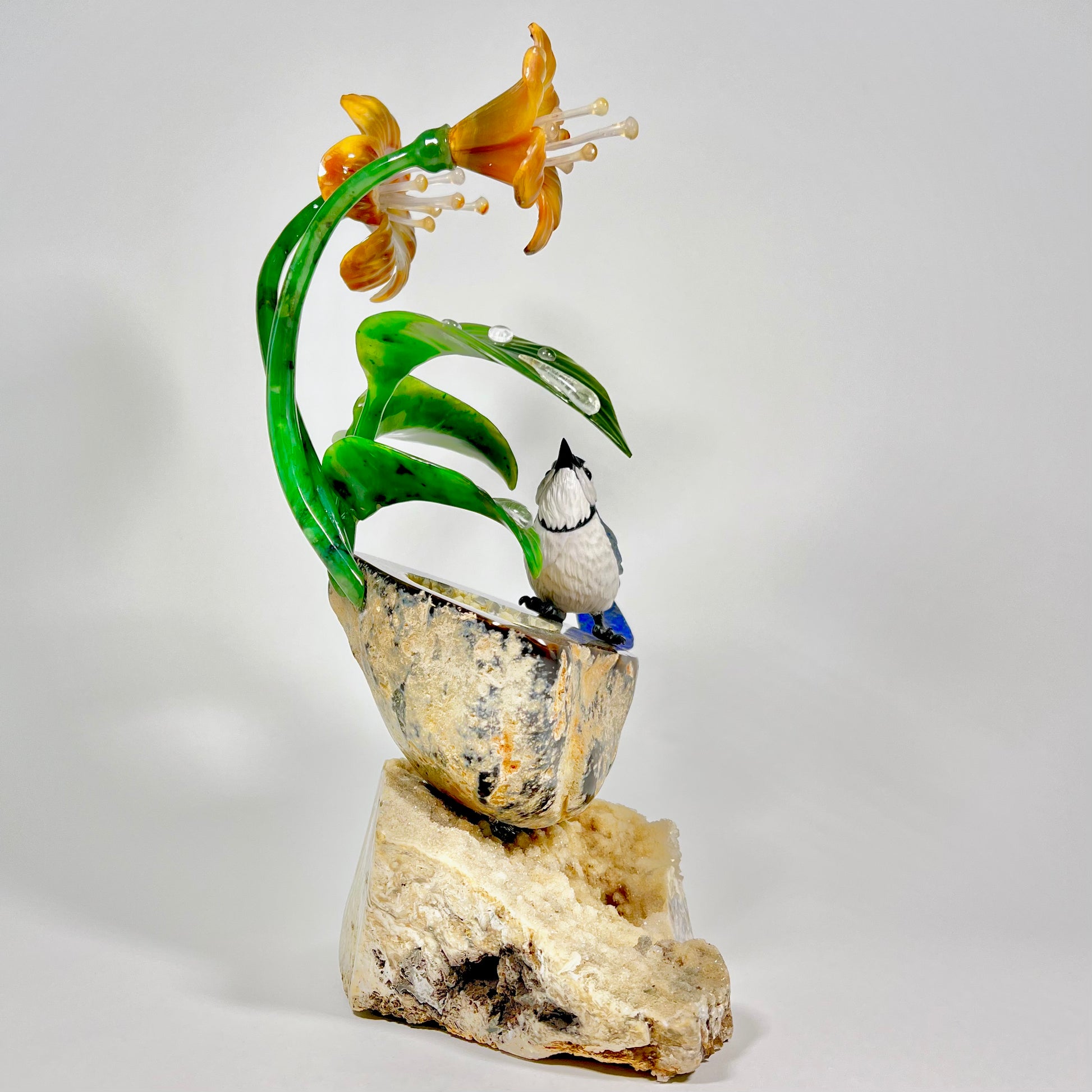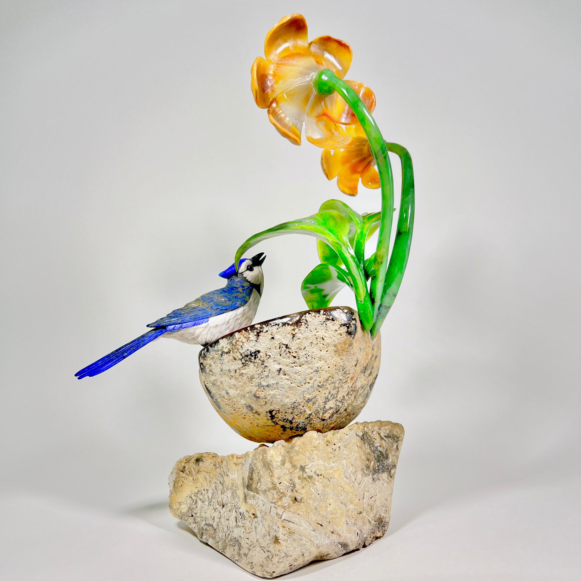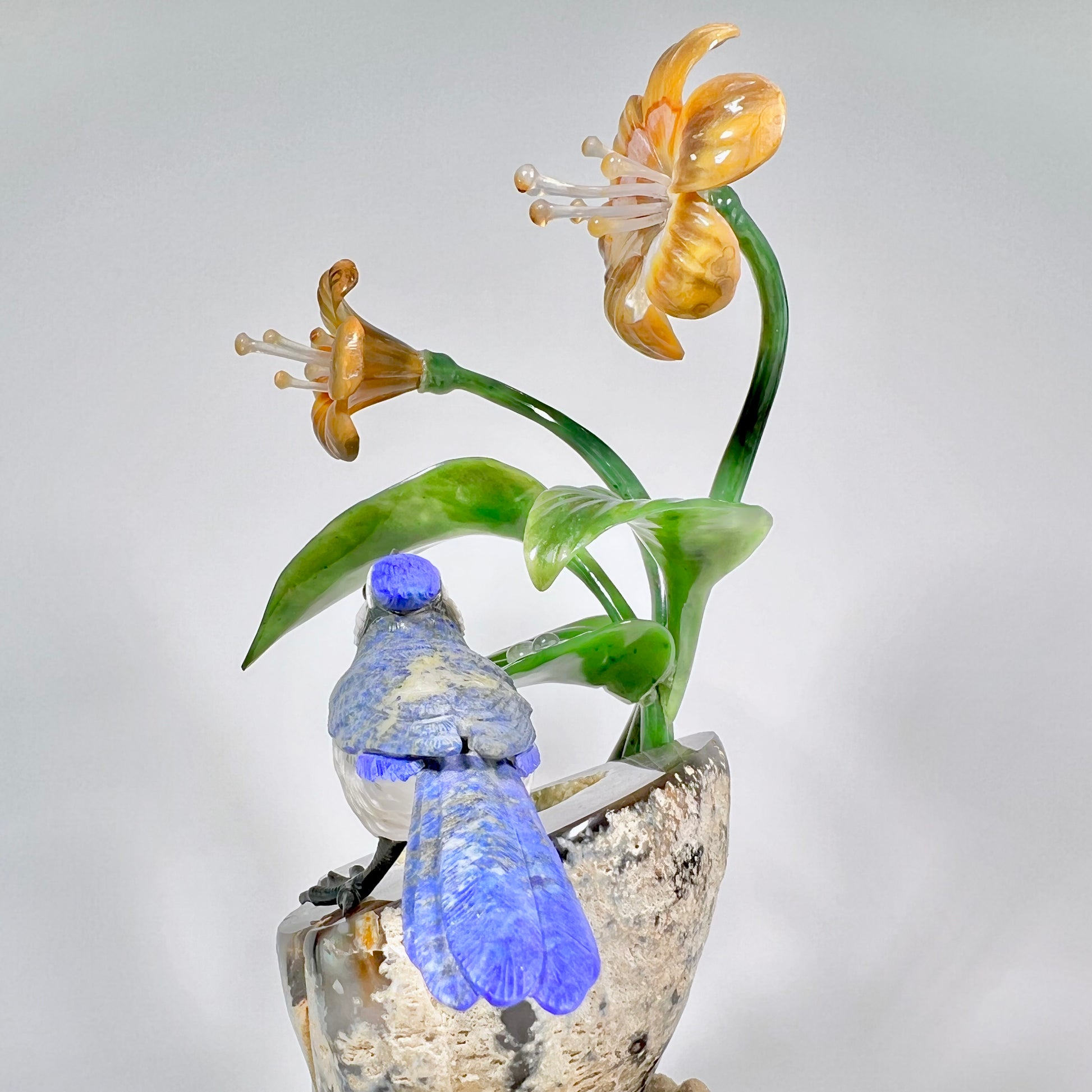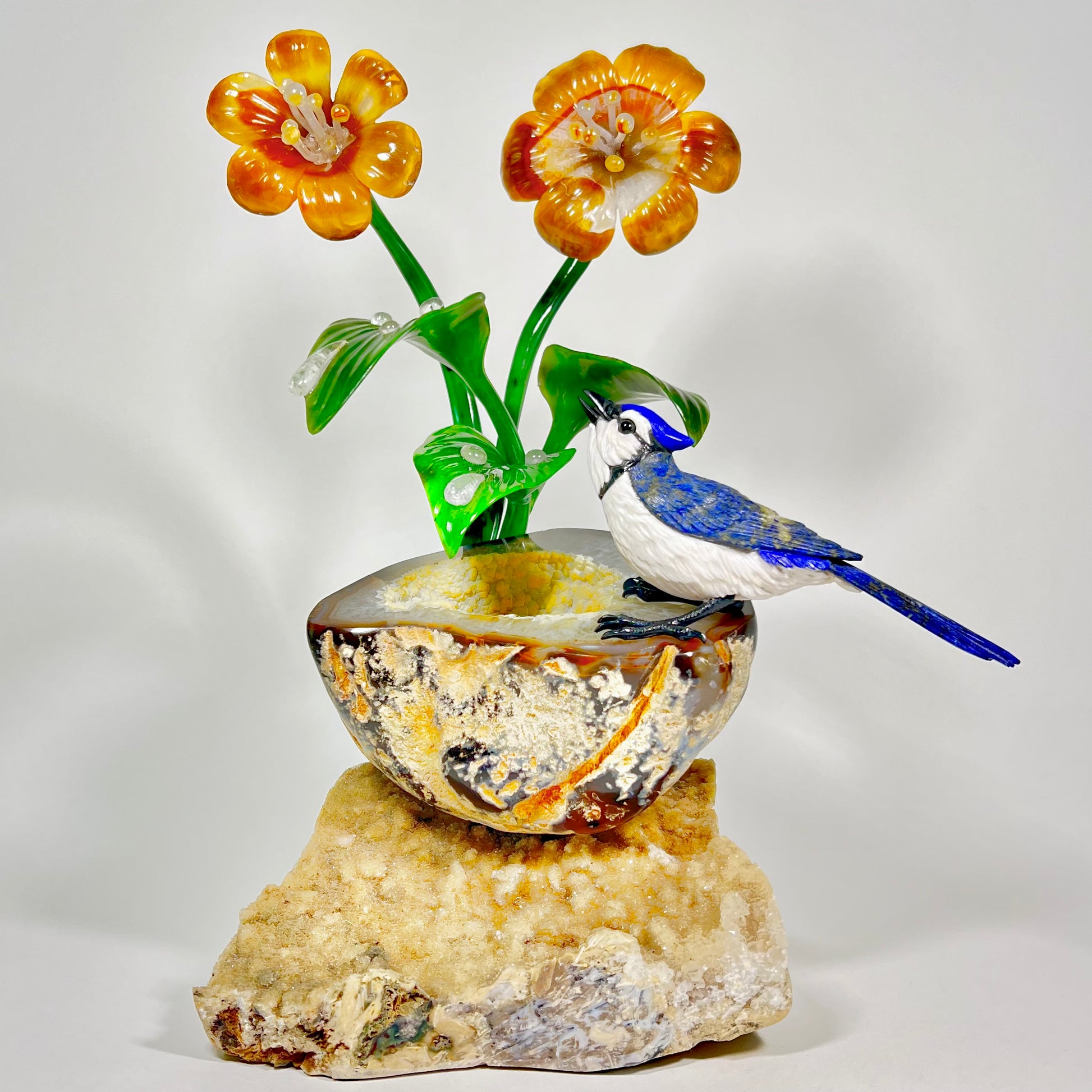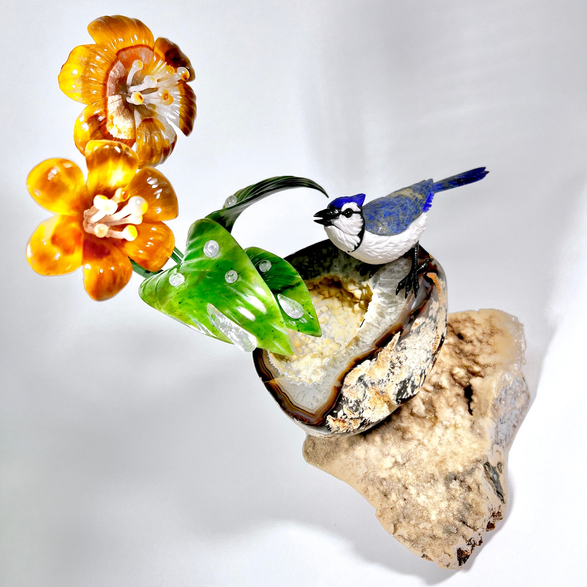 "Blue Jay" was inspired by a blue jays continuous visits to a small garden. It is a masterfully crafted gemstone sculpture featuring a blue jay made from blue lapis lazuli, perched beside a vibrant agate flower. The bird's realistic plumage, highlighted with gold pyrite, and its attentive gaze, rendered in black jade, bring lifelike detail to the piece. The flower's amber petals and green nephrite jade leaves evoke the freshness of dawn. Anchored by a base of natural quartz and agate, the sculpture balances refined artistry with raw, natural textures. This piece celebrates nature's serene beauty, captured in the timeless medium of gemstone. A testament to exquisite craftsmanship, it invites viewers to pause and reflect on the simple yet profound beauty of the natural world.