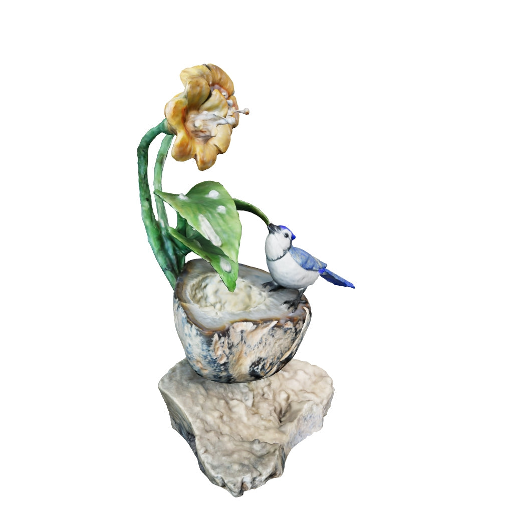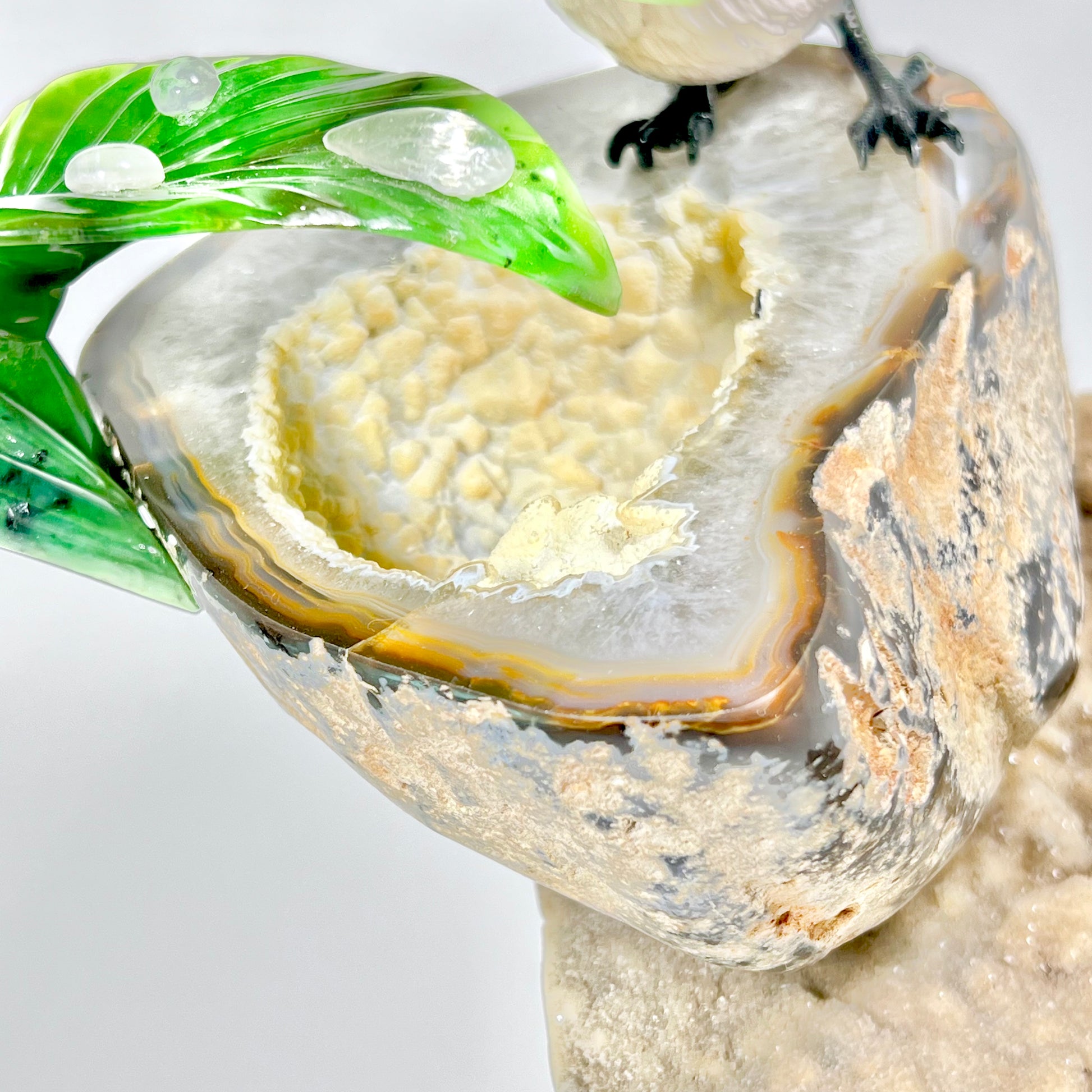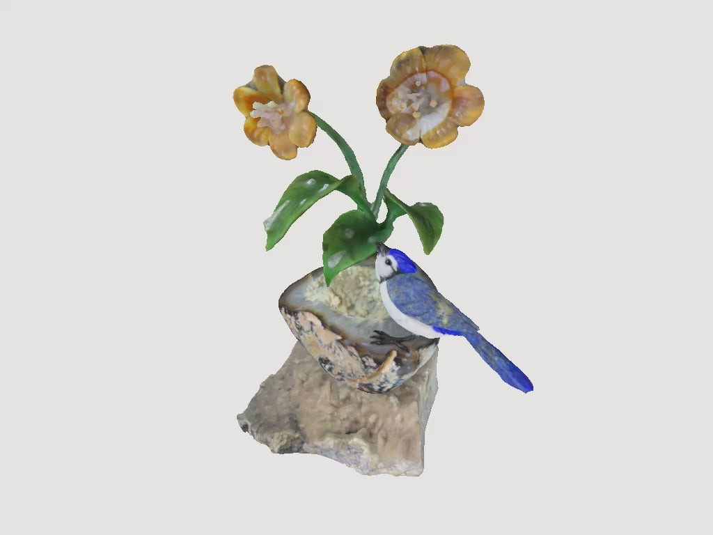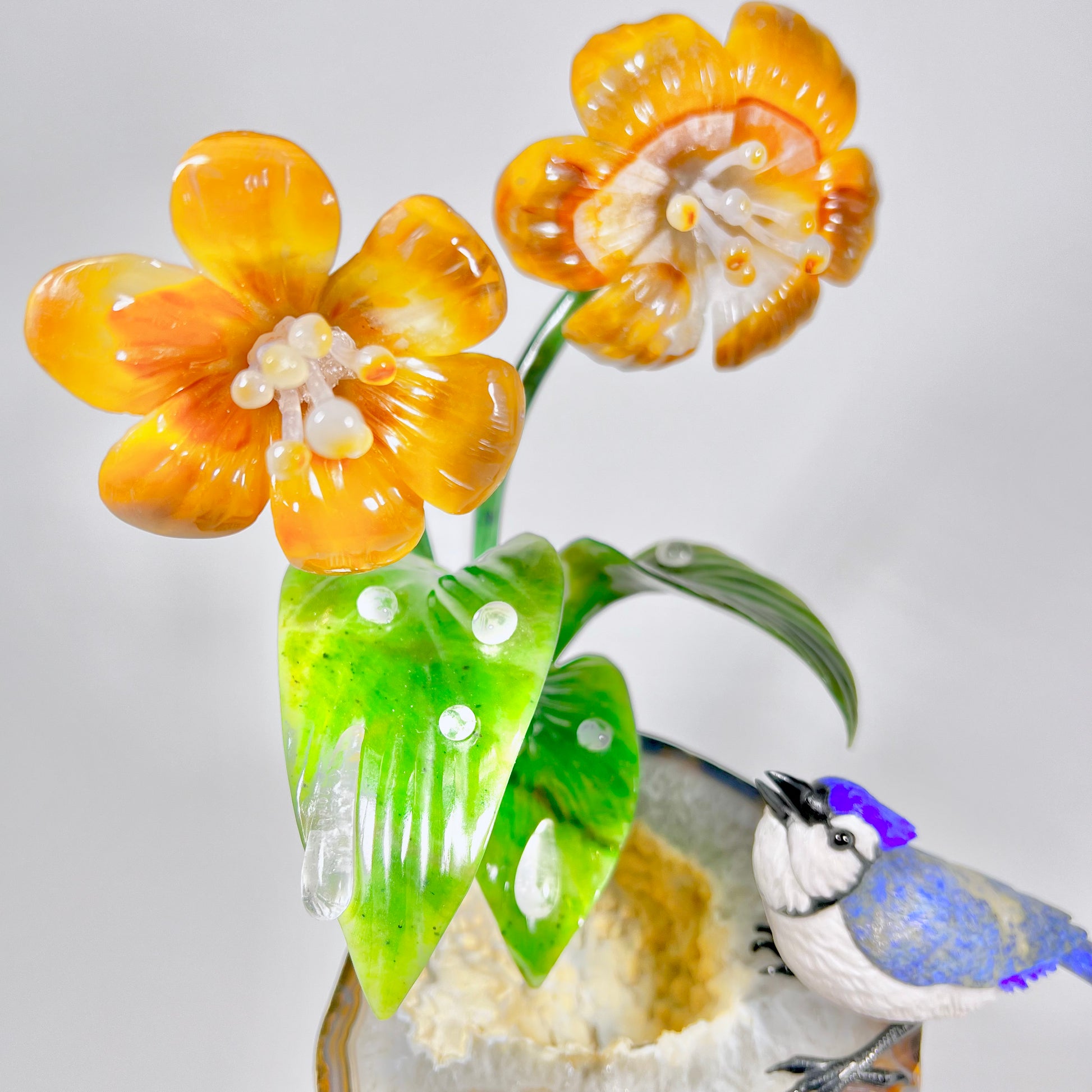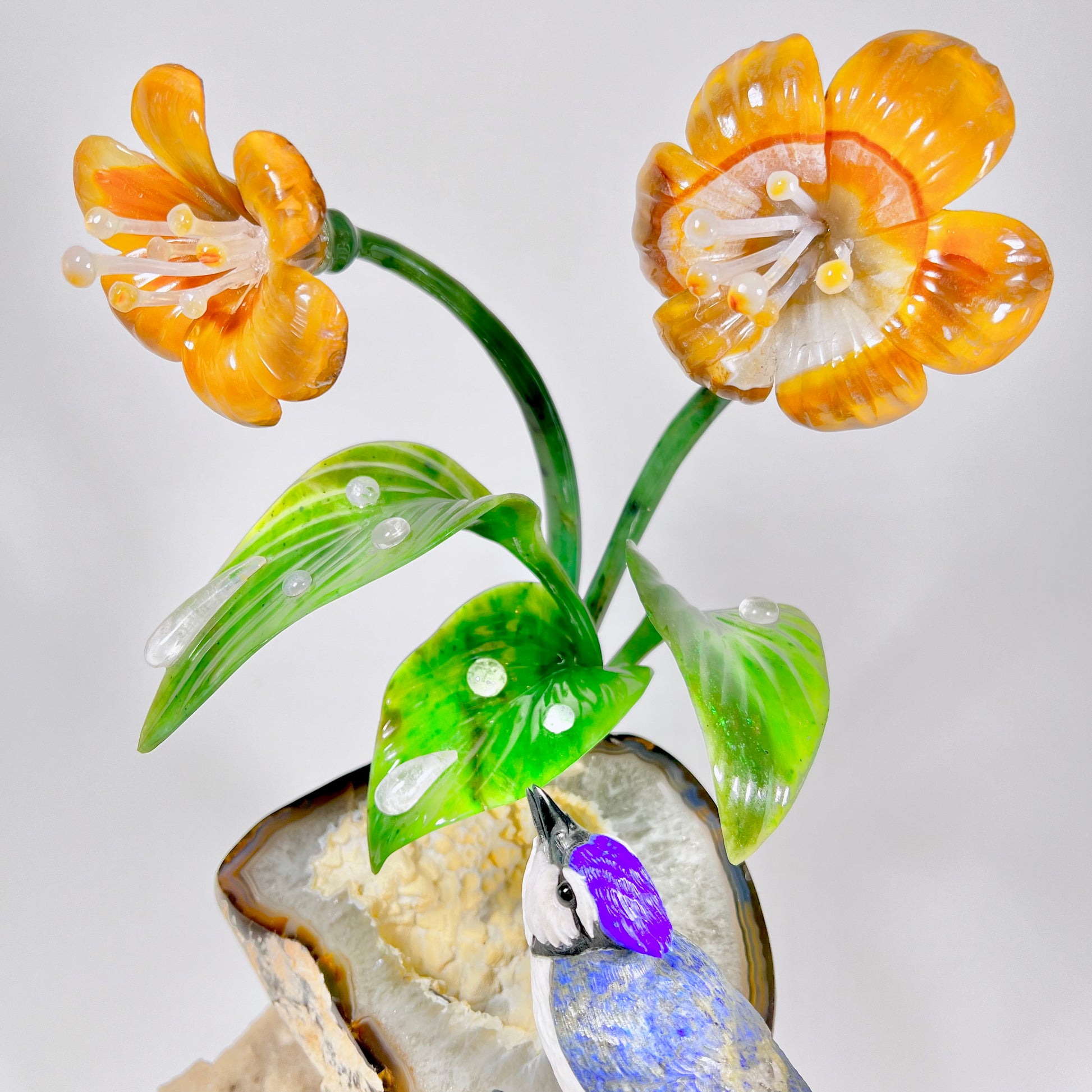 "Blue Jay" was inspired by a blue jays continuous visits to a small garden. It is a masterfully crafted gemstone sculpture featuring a blue jay made from blue lapis lazuli, perched beside a vibrant agate flower. The bird's realistic plumage, highlighted with gold pyrite, and its attentive gaze, rendered in black jade, bring lifelike detail to the piece. The flower's amber petals and green nephrite jade leaves evoke the freshness of dawn. Anchored by a base of natural quartz and agate, the sculpture balances refined artistry with raw, natural textures. This piece celebrates nature's serene beauty, captured in the timeless medium of gemstone. A testament to exquisite craftsmanship, it invites viewers to pause and reflect on the simple yet profound beauty of the natural world.