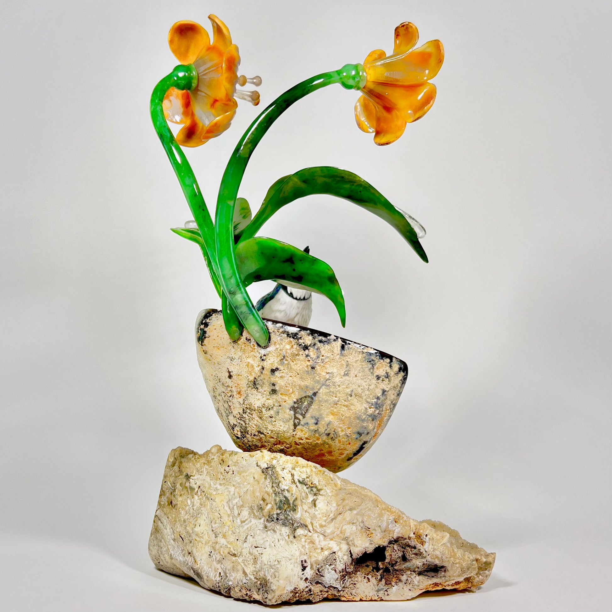 Stone: Blue Lapis Lazuli, Black Jade, BC Green Nephrite Polar Jade, Quartz base, Agate base Lilly flowers