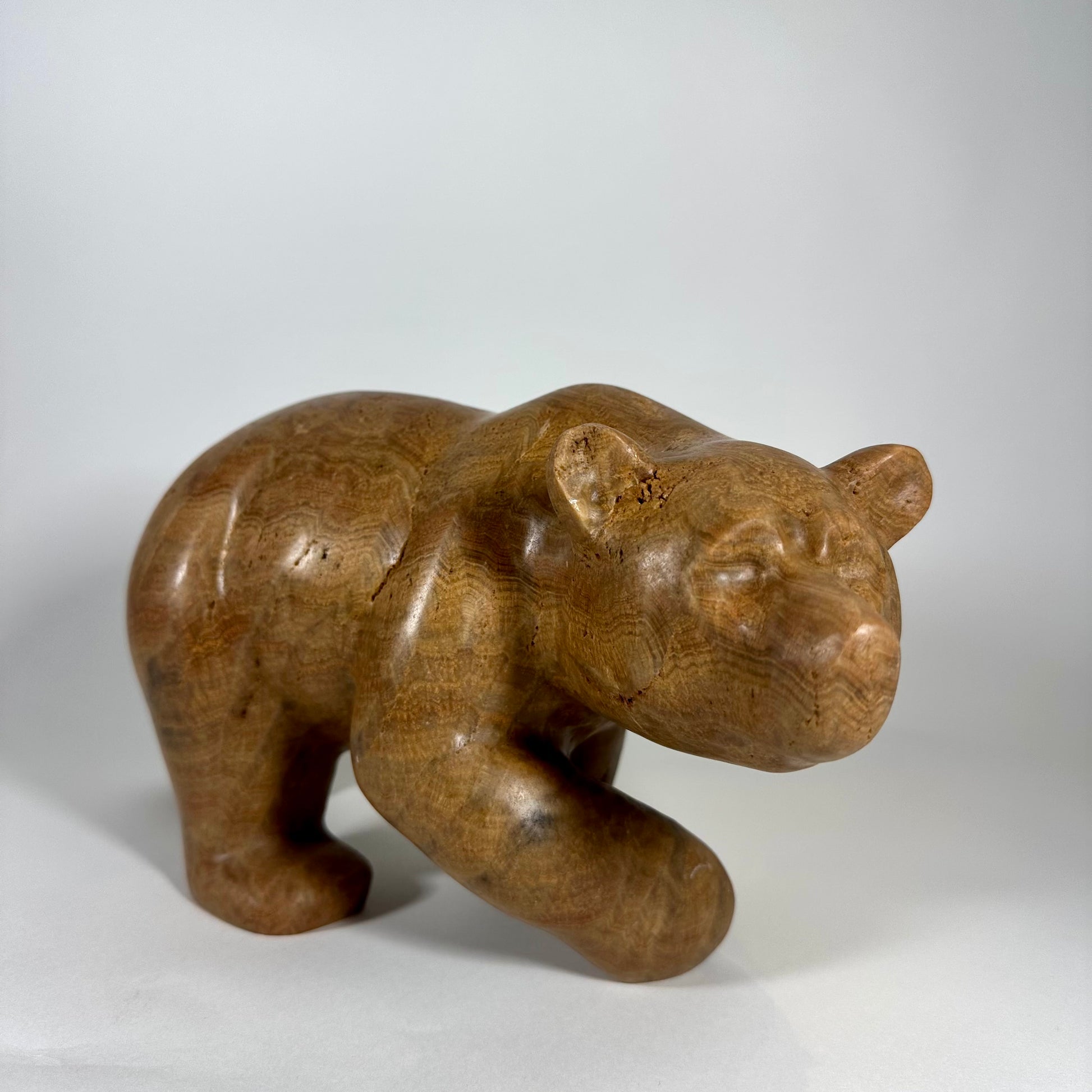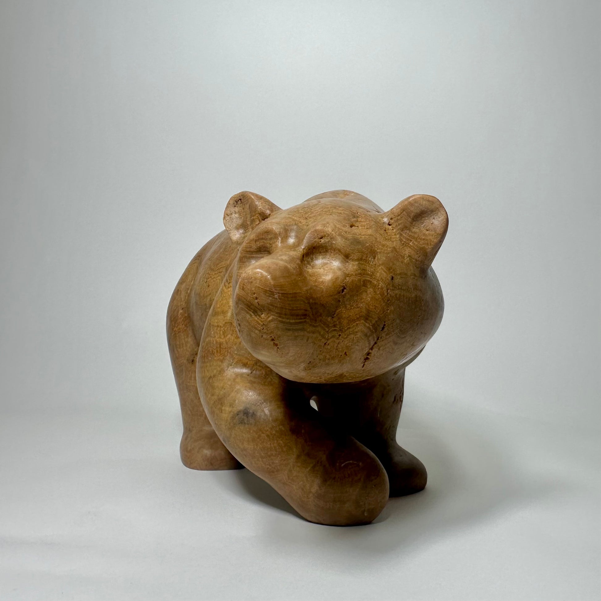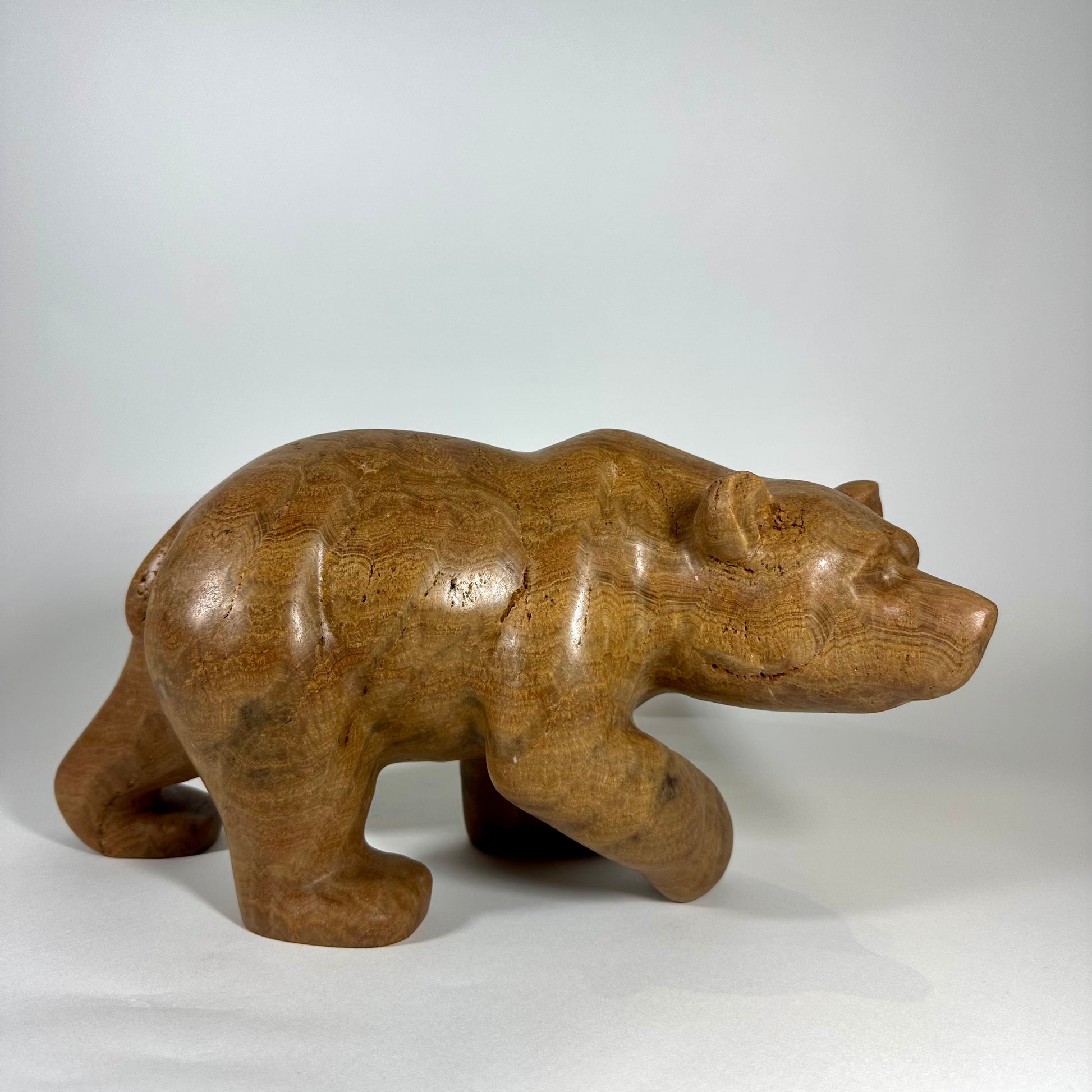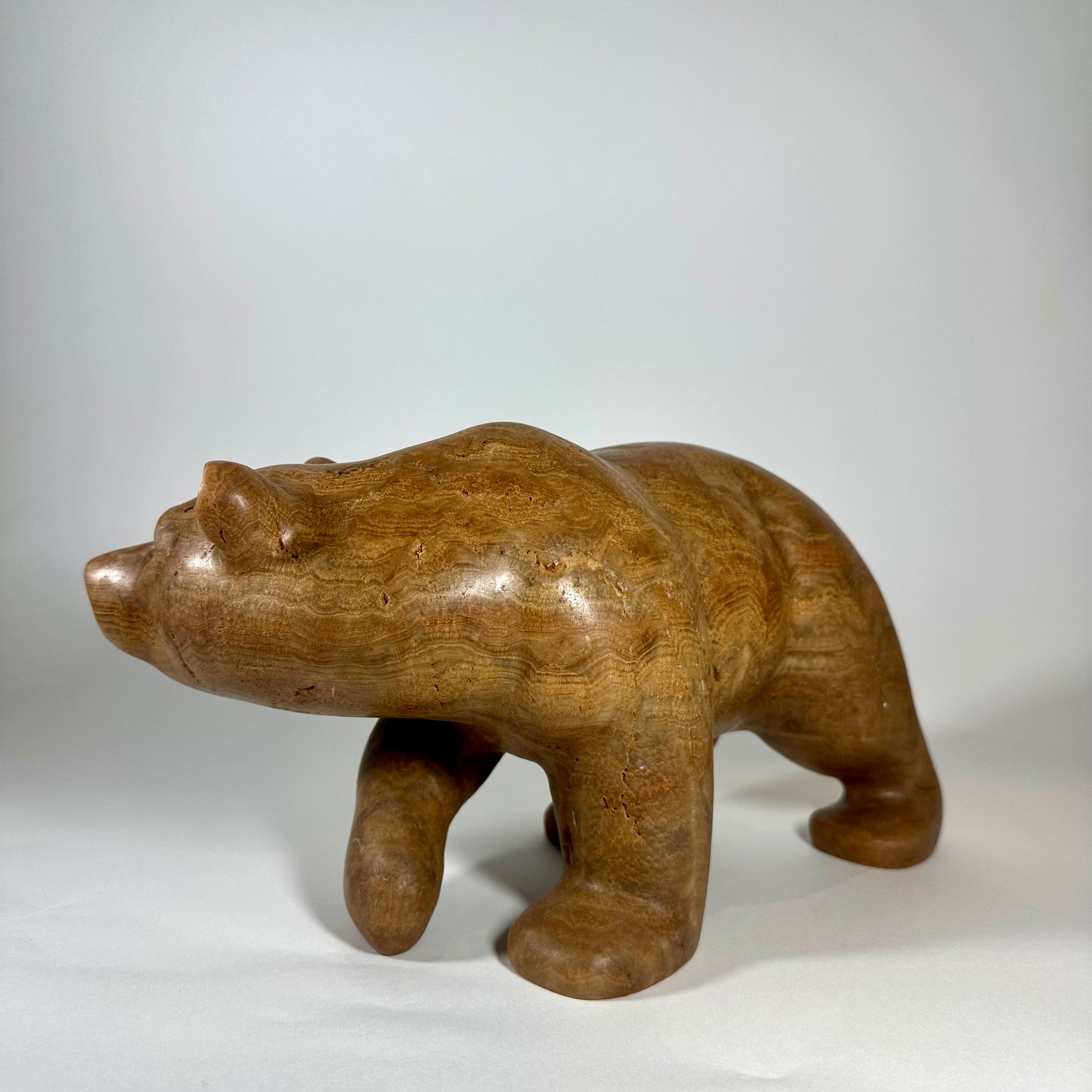 “Calypso” is a hand-carved grizzly bear sculpted from richly banded brown onyx, a stone prized for its warm earth tones and natural flowing striations. Layers of caramel, honey, and deep umber move across the surface, creating depth and a quiet sense of movement.“