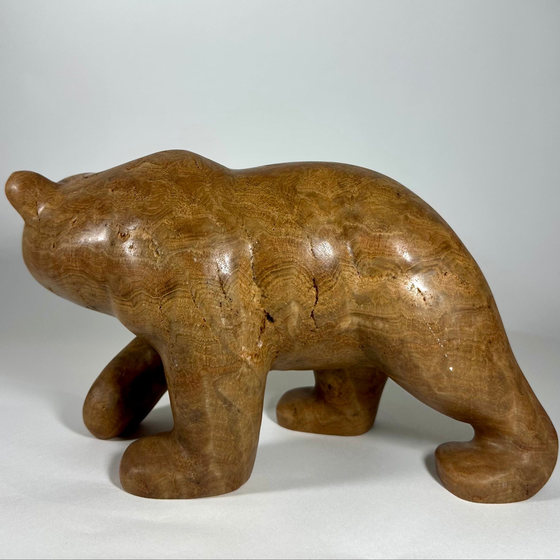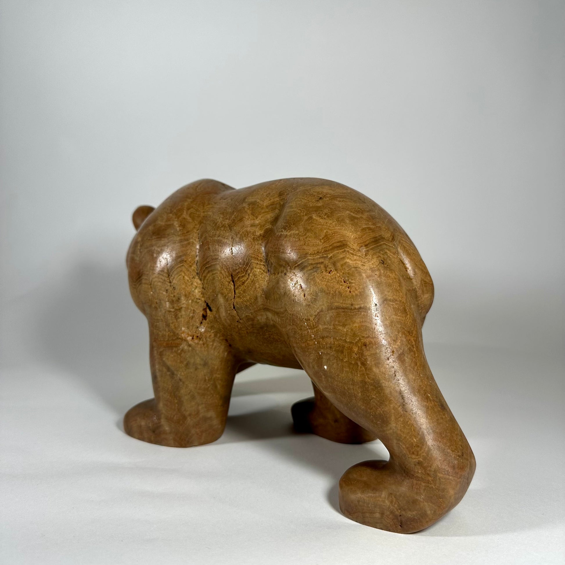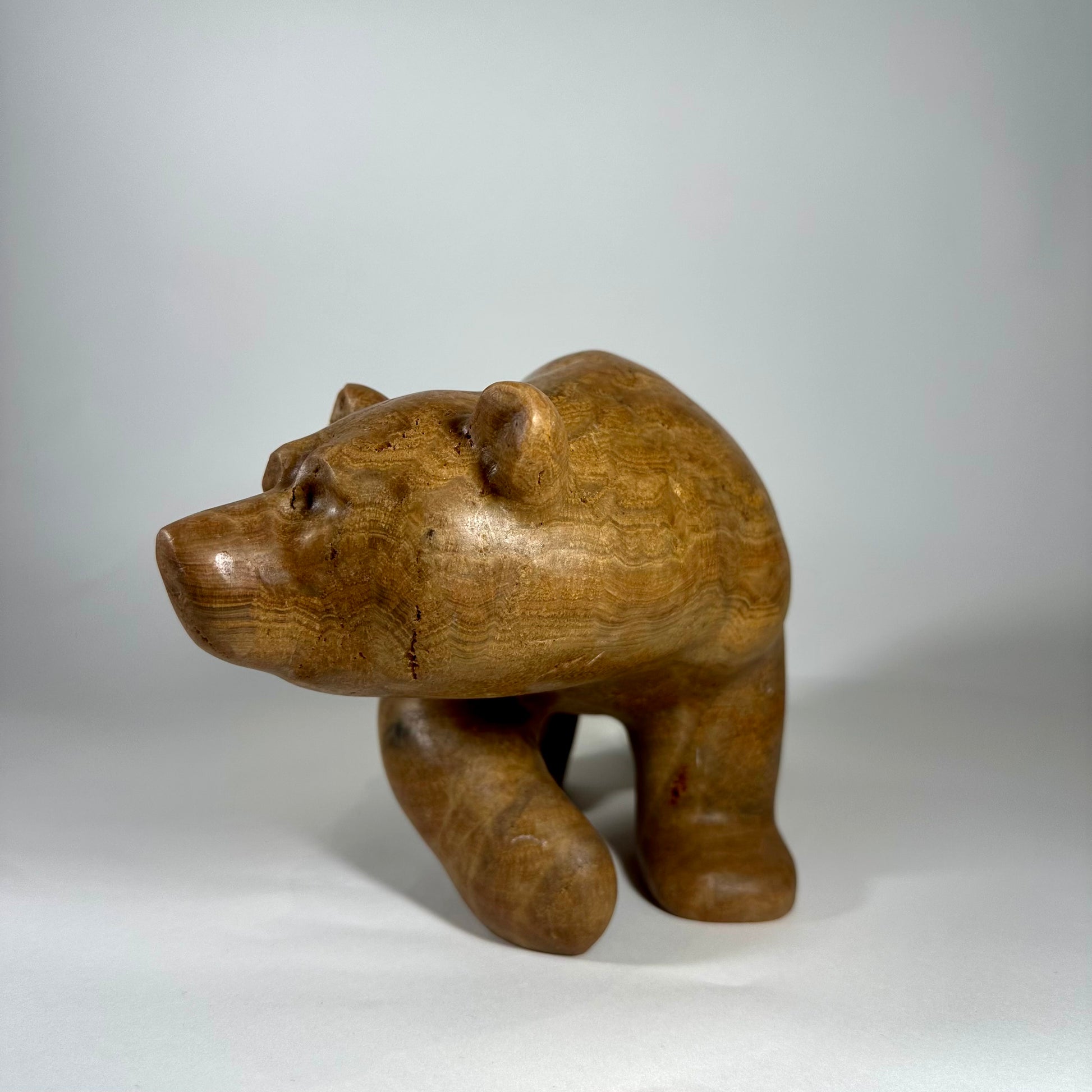 “Calypso” is a hand-carved grizzly bear sculpted from richly banded brown onyx, a stone prized for its warm earth tones and natural flowing striations. Layers of caramel, honey, and deep umber move across the surface, creating depth and a quiet sense of movement.“