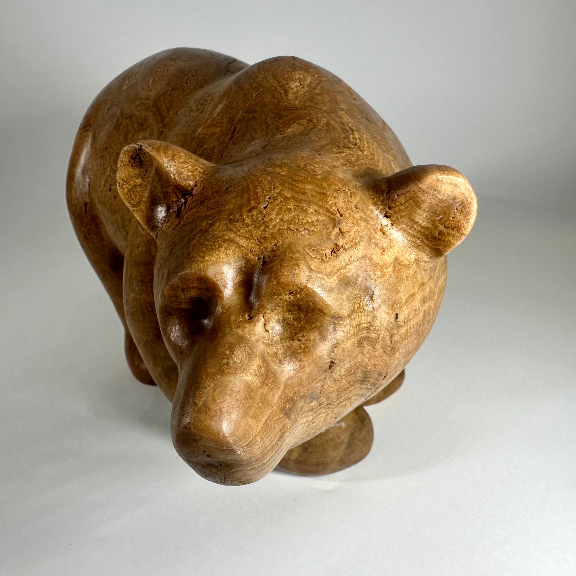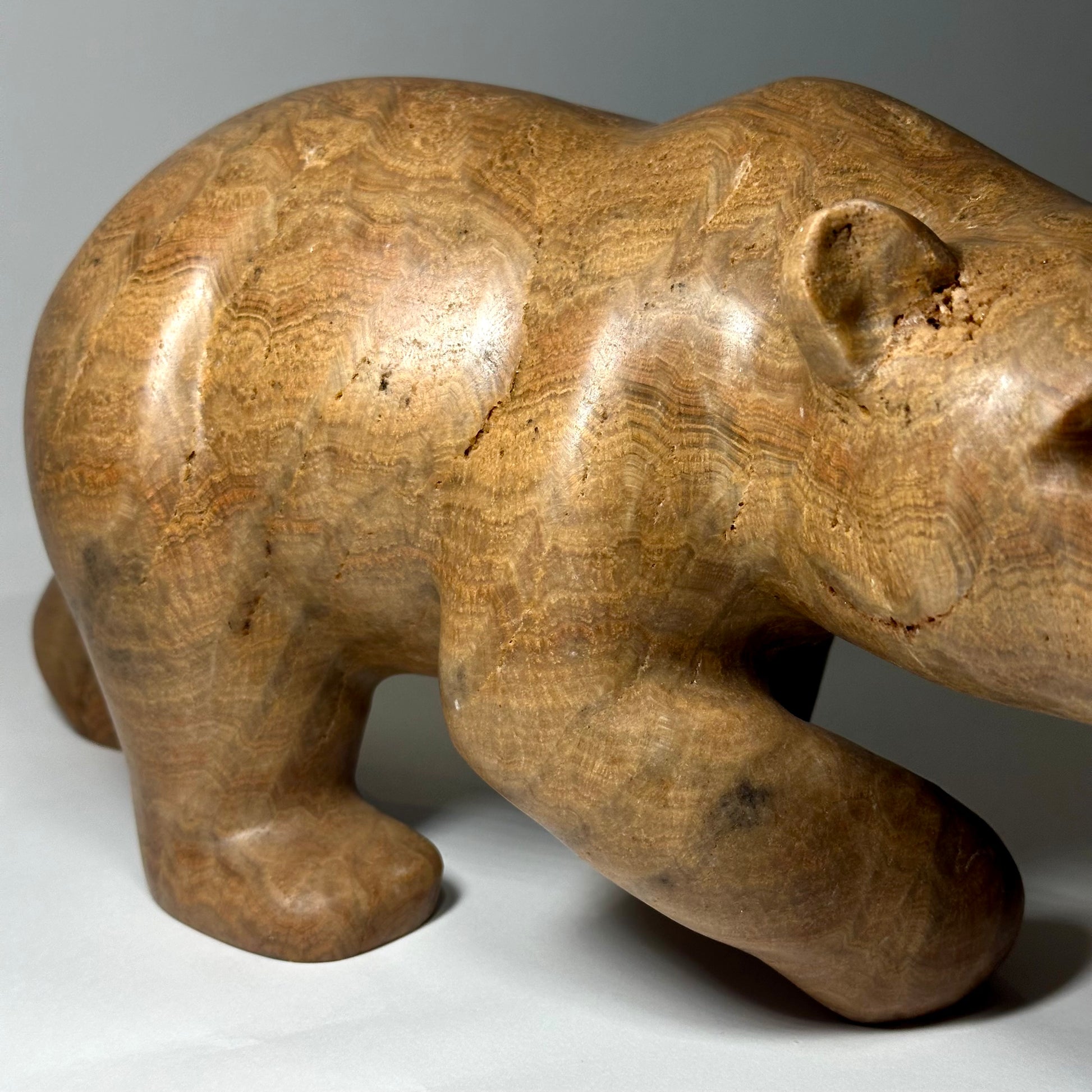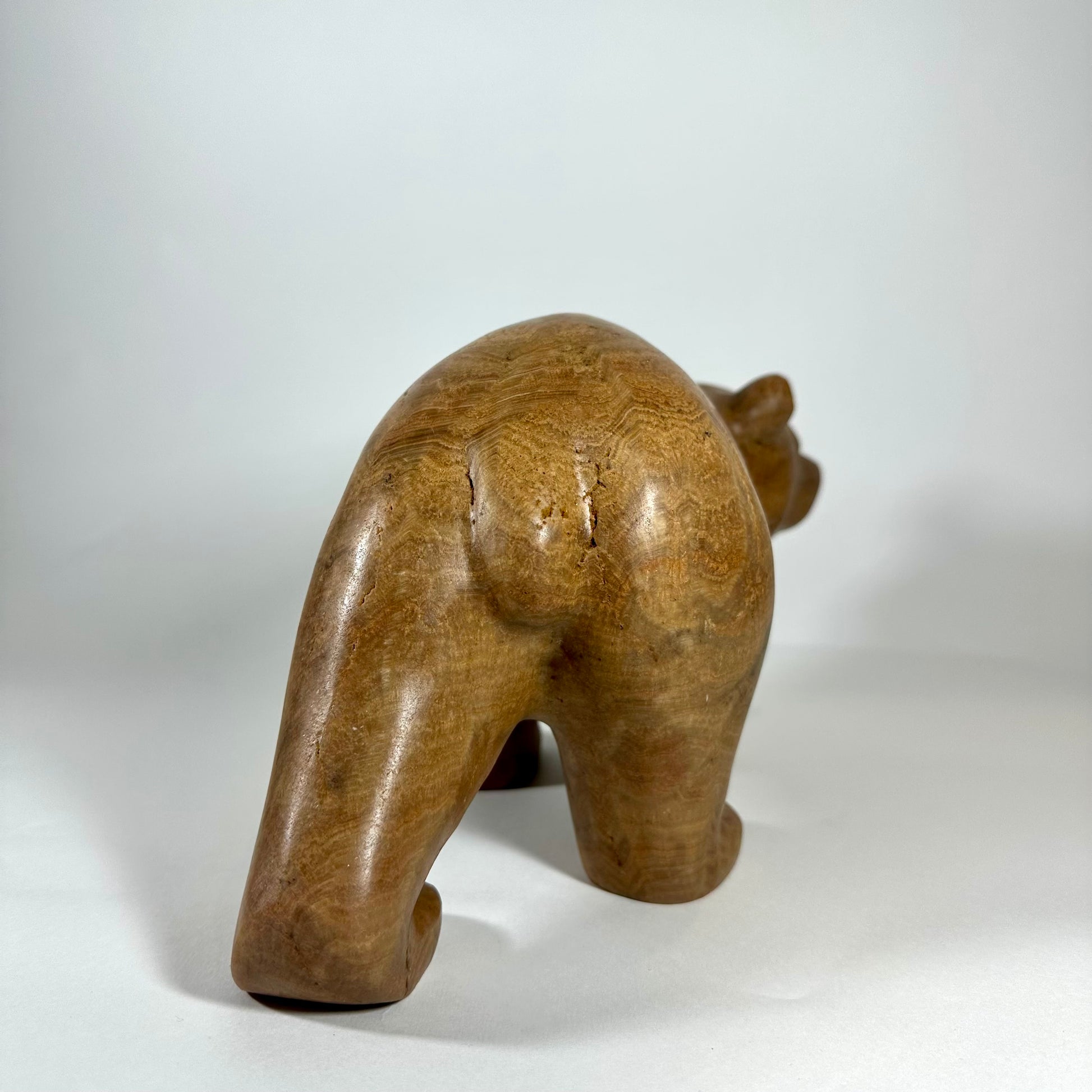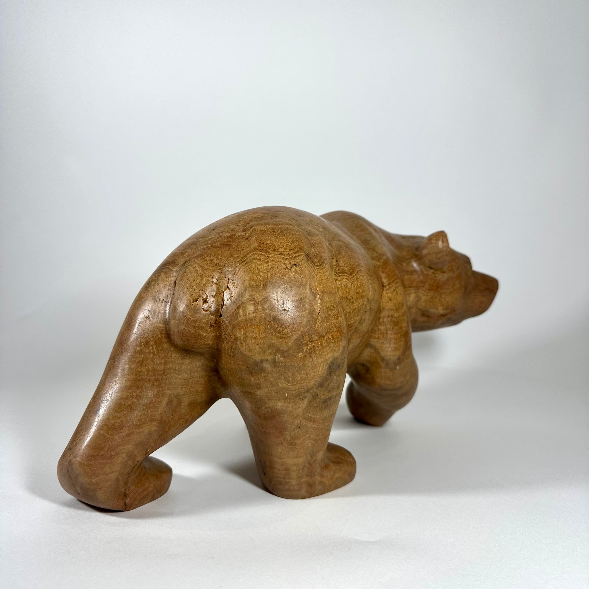 “Calypso” is a hand-carved grizzly bear sculpted from richly banded brown onyx, a stone prized for its warm earth tones and natural flowing striations. Layers of caramel, honey, and deep umber move across the surface, creating depth and a quiet sense of movement.“