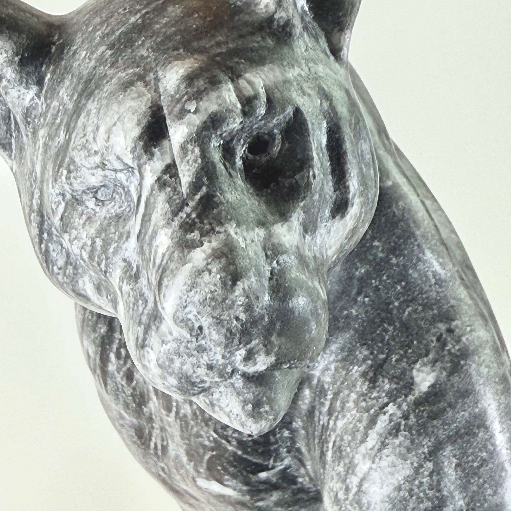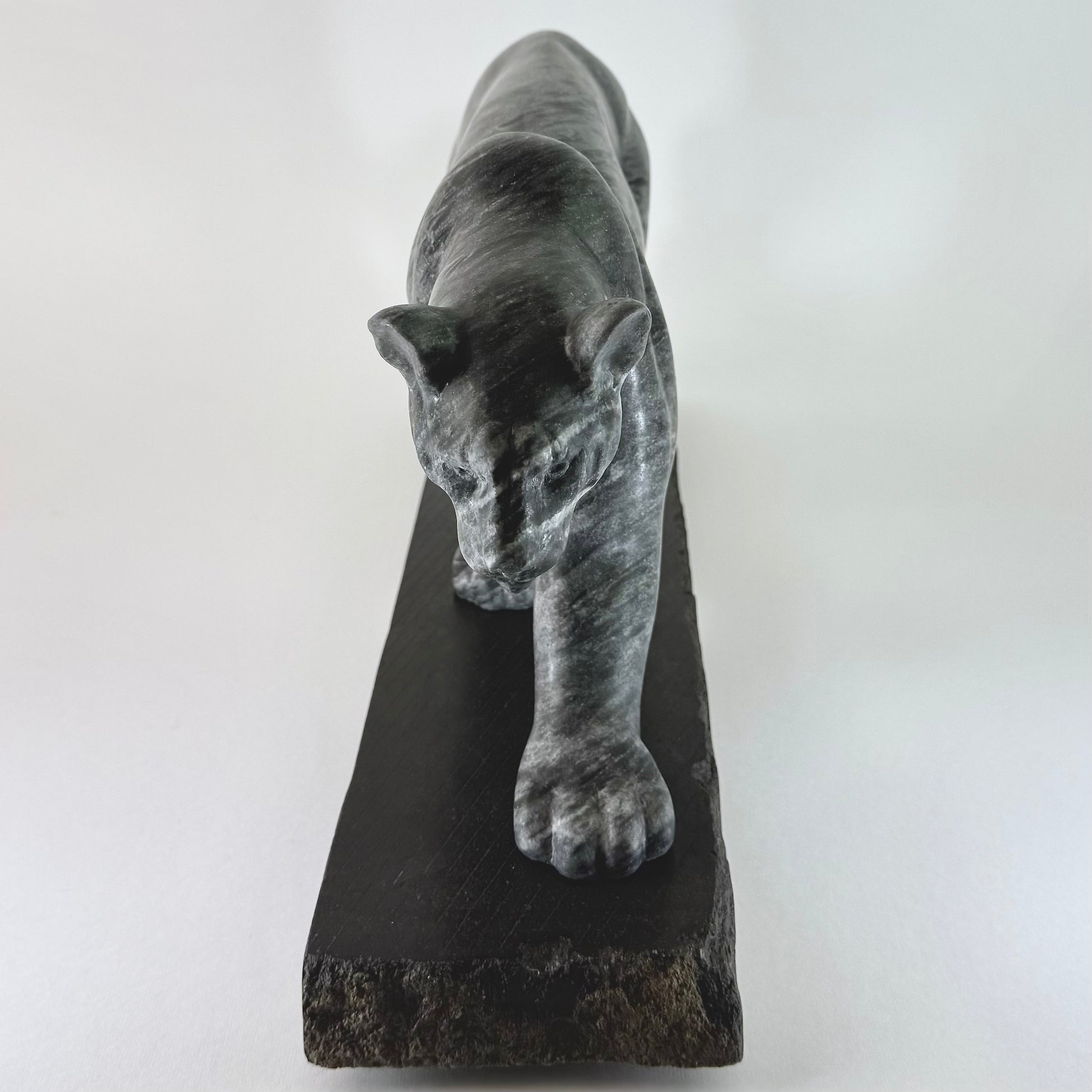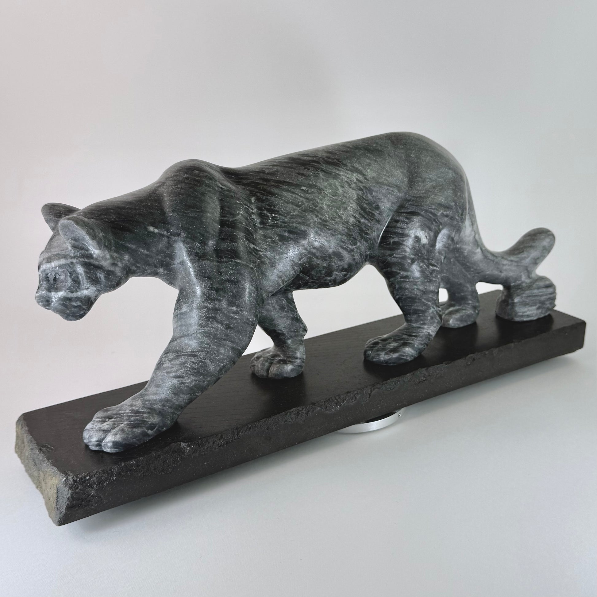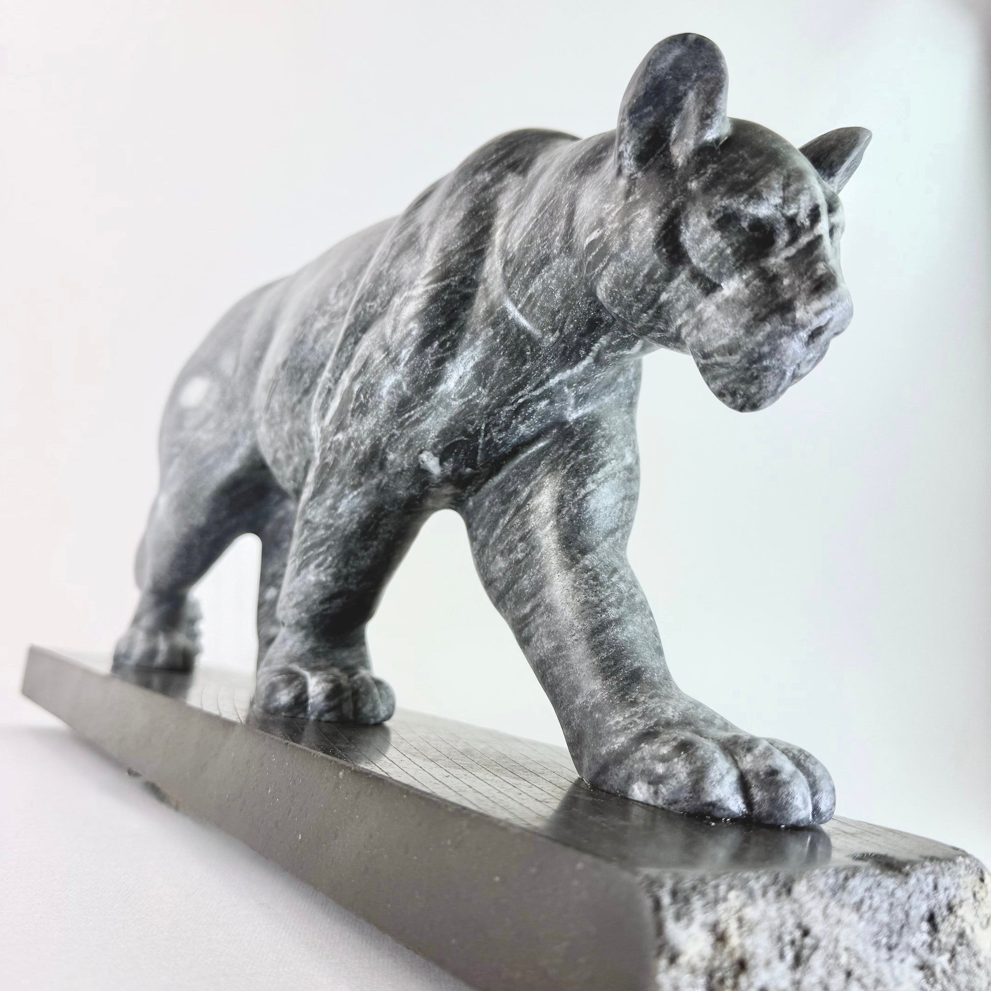 Carved from Vancouver Island Gray Marble, this striking Cougar sculpture captures the raw power and grace of nature's apex predator. Standing 22" tall and weighing a substantial 28 lbs, this handcrafted piece brings dramatic presence to any space. Each sculpture is proudly made in British Columbia, showcasing the artistry and quality that defines Fathom Stone Art. A bold statement for collectors who appreciate wildlife art and the natural beauty of Canadian stone.
