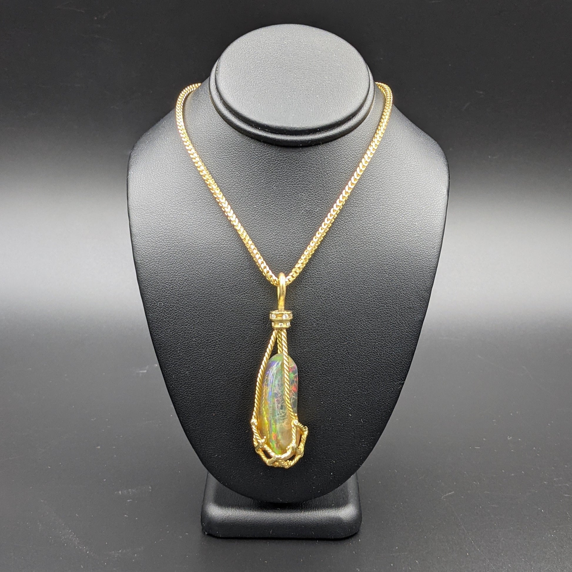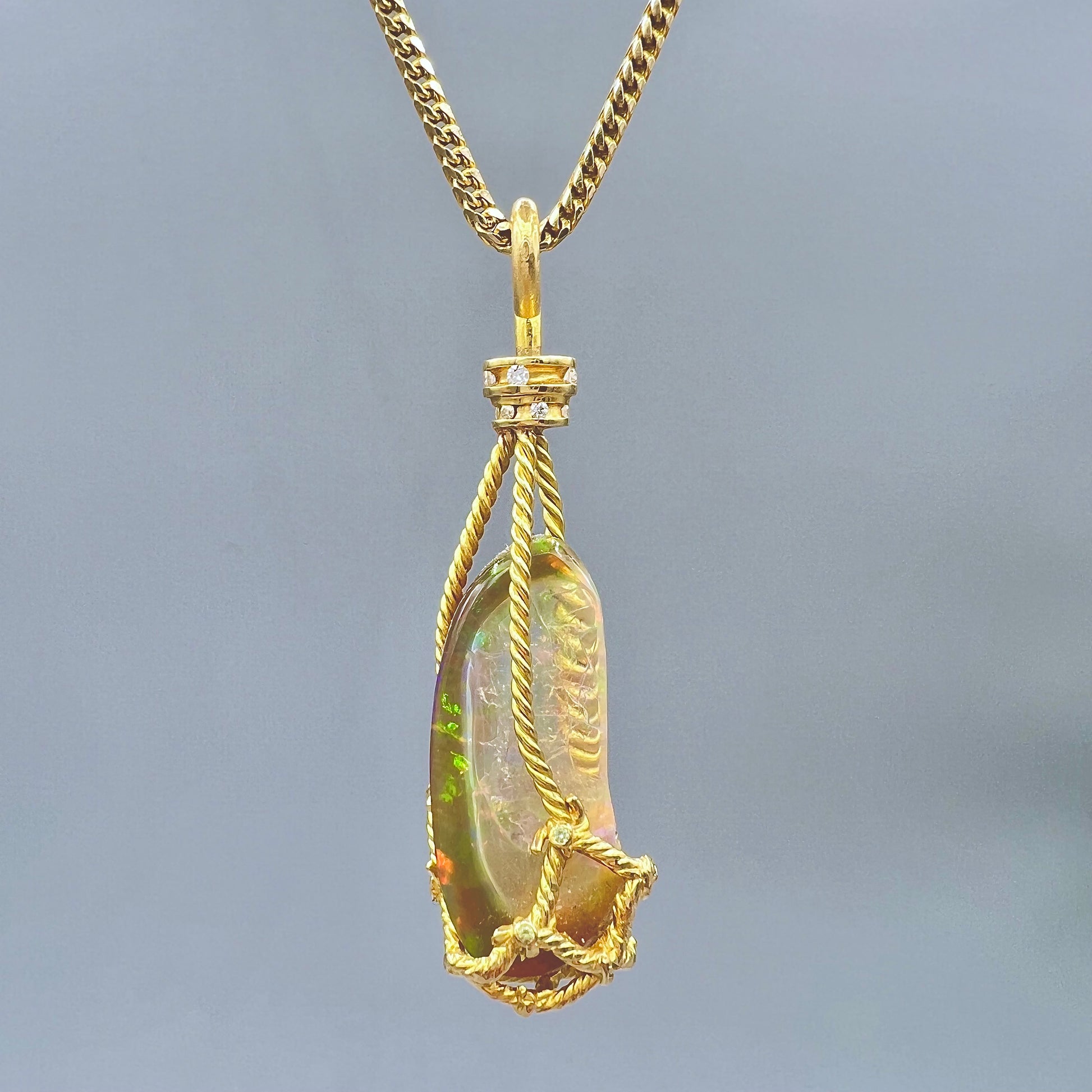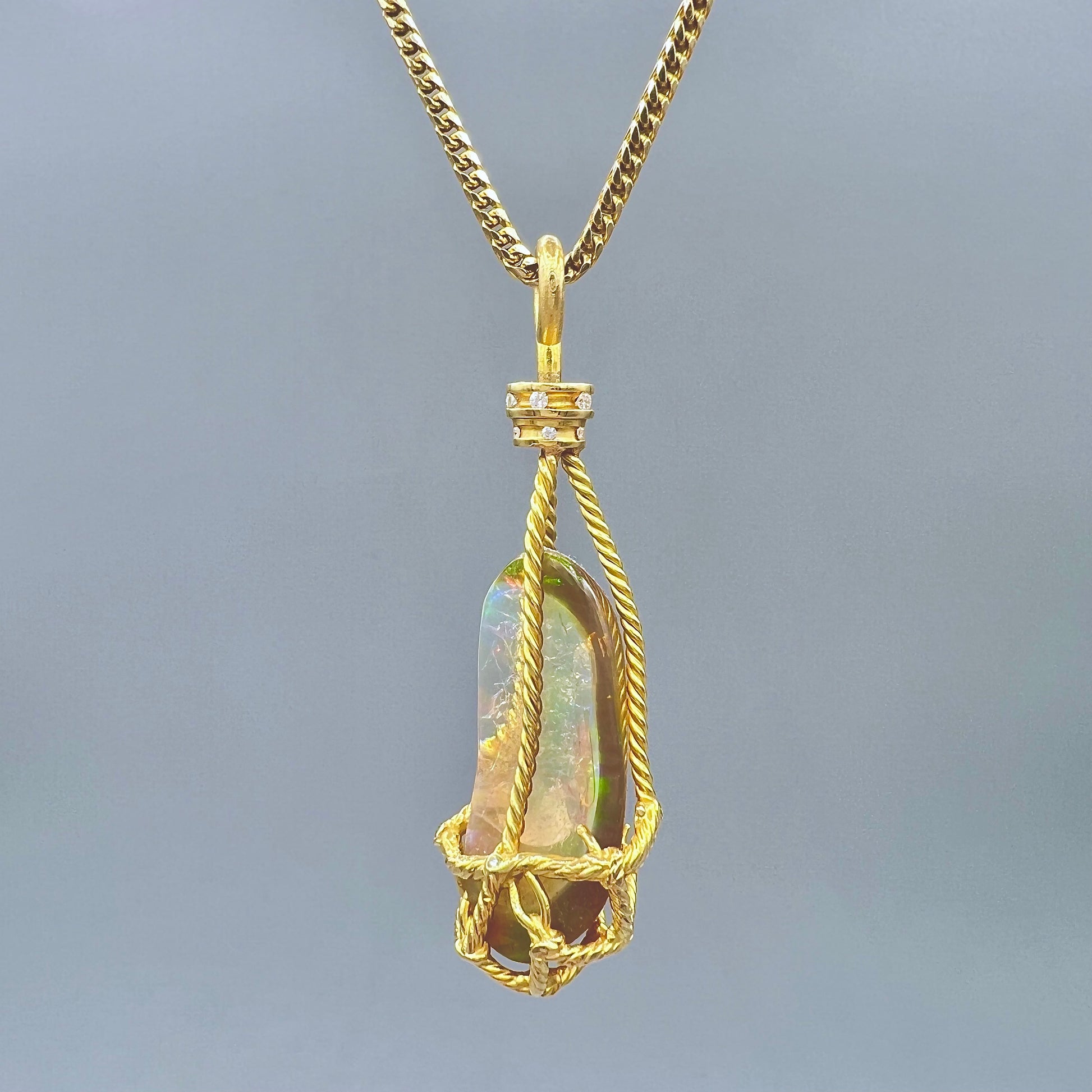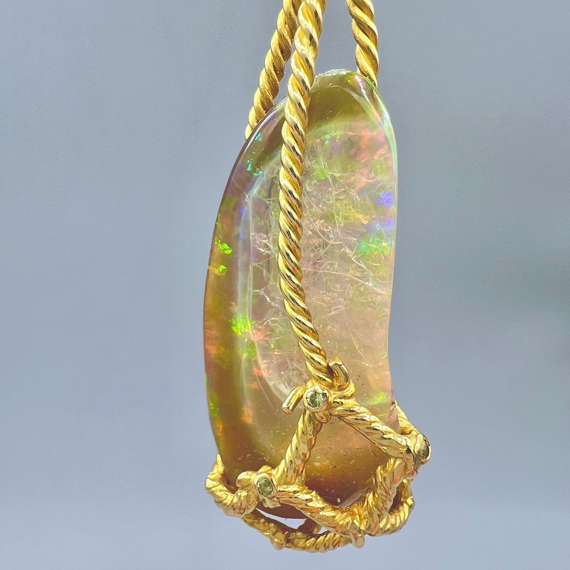 The "Opal Net" pendant is part of Fathom Stone's nautical fine jewellery collection. It is as if the giant 20-carat crystal opal is being hauled out of the ocean by the 18k yellow gold net. The net hangs from a 360-degree rotational pulley inlaid with 13 diamonds, along with 7 green demantoids inlaid to the connection points near the bottom. The giant crystal opal emanates a full spectrum of colors.