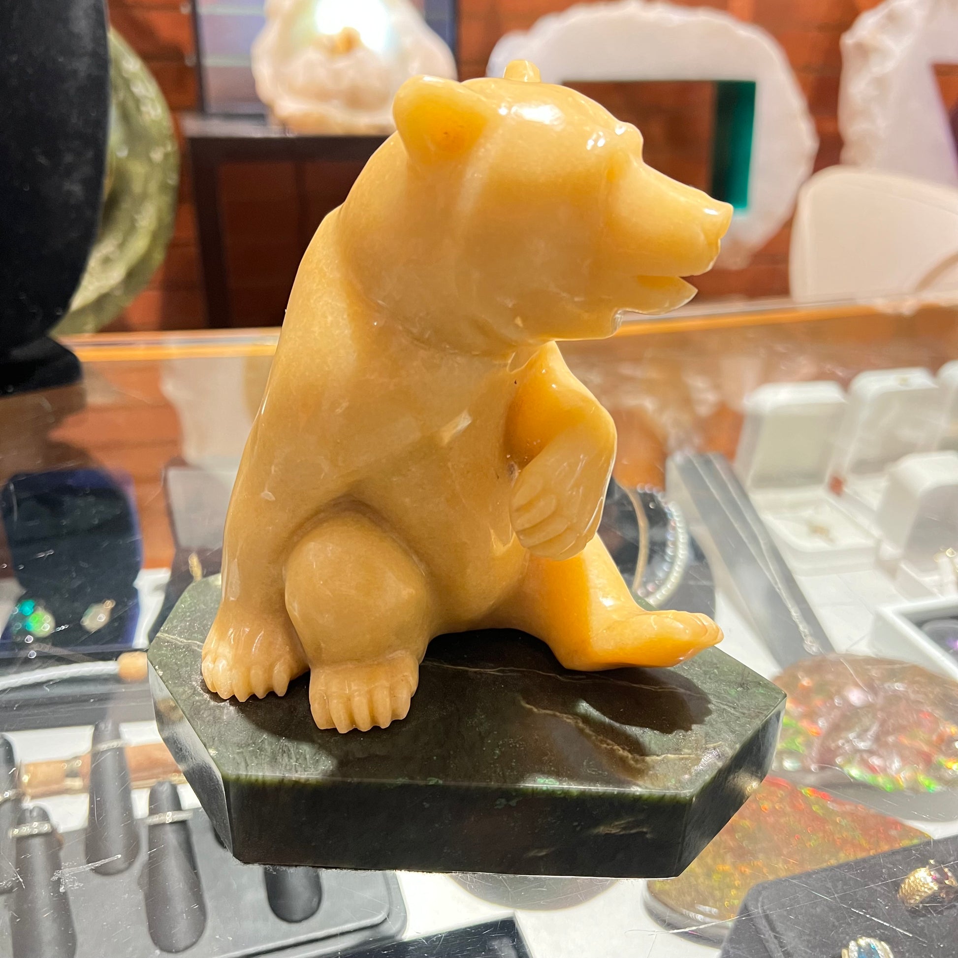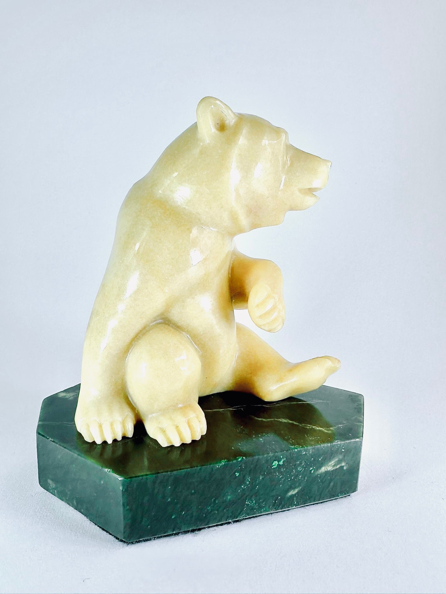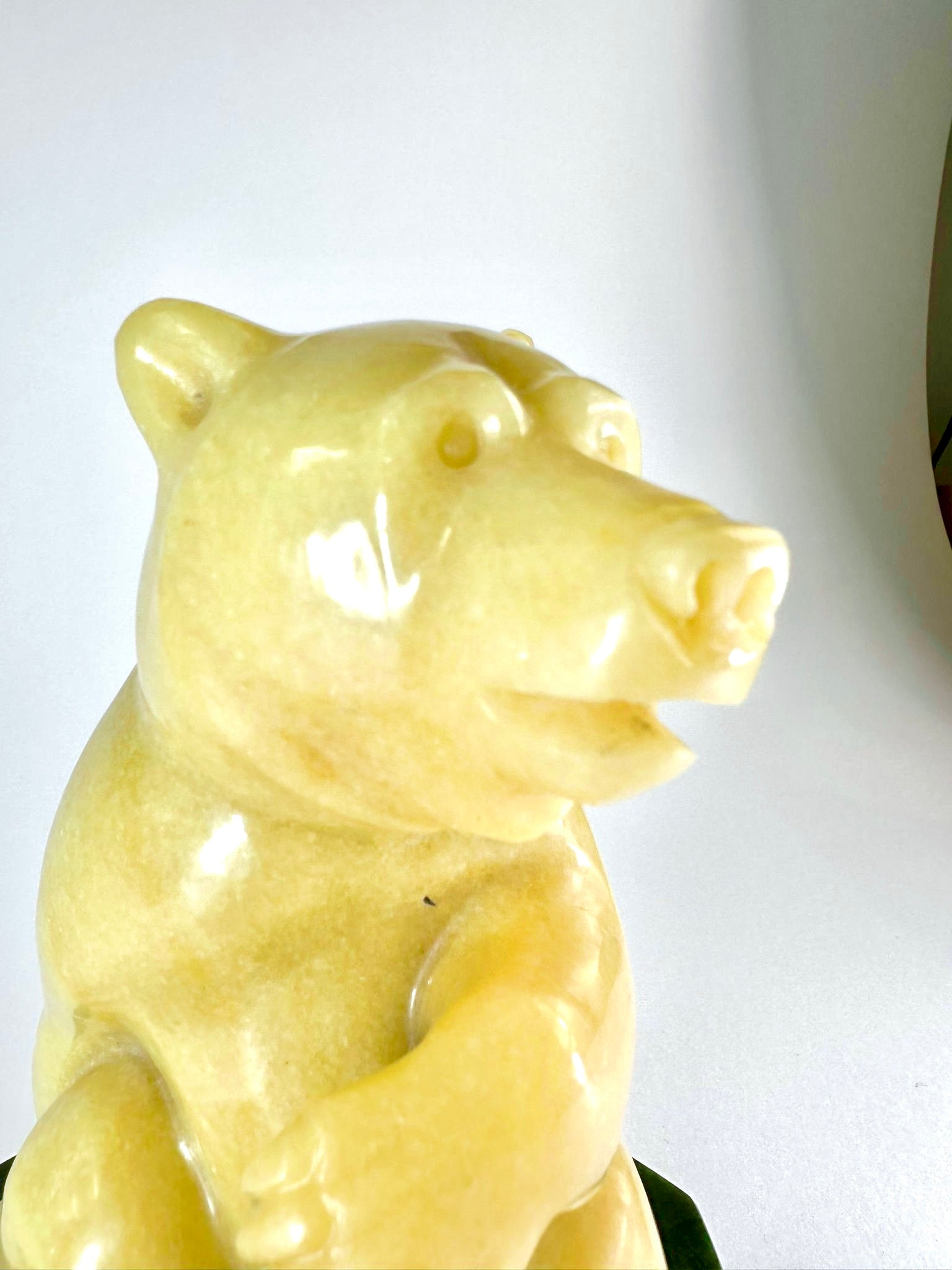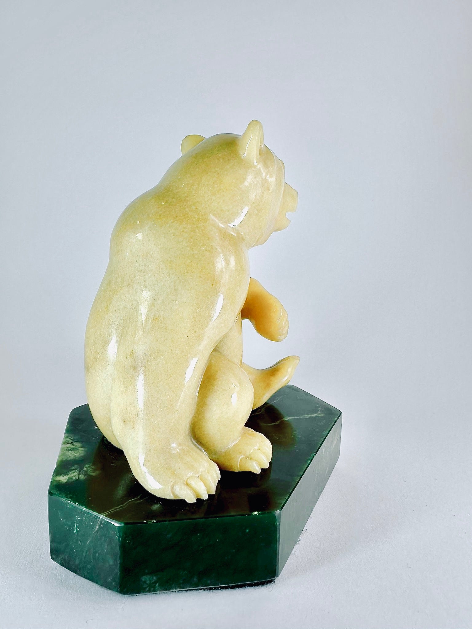 This adorable BC Golden Marlbe Grizzly is sitting on a AA BC Green Nepherite Jade base and is fully satisfied with life.
