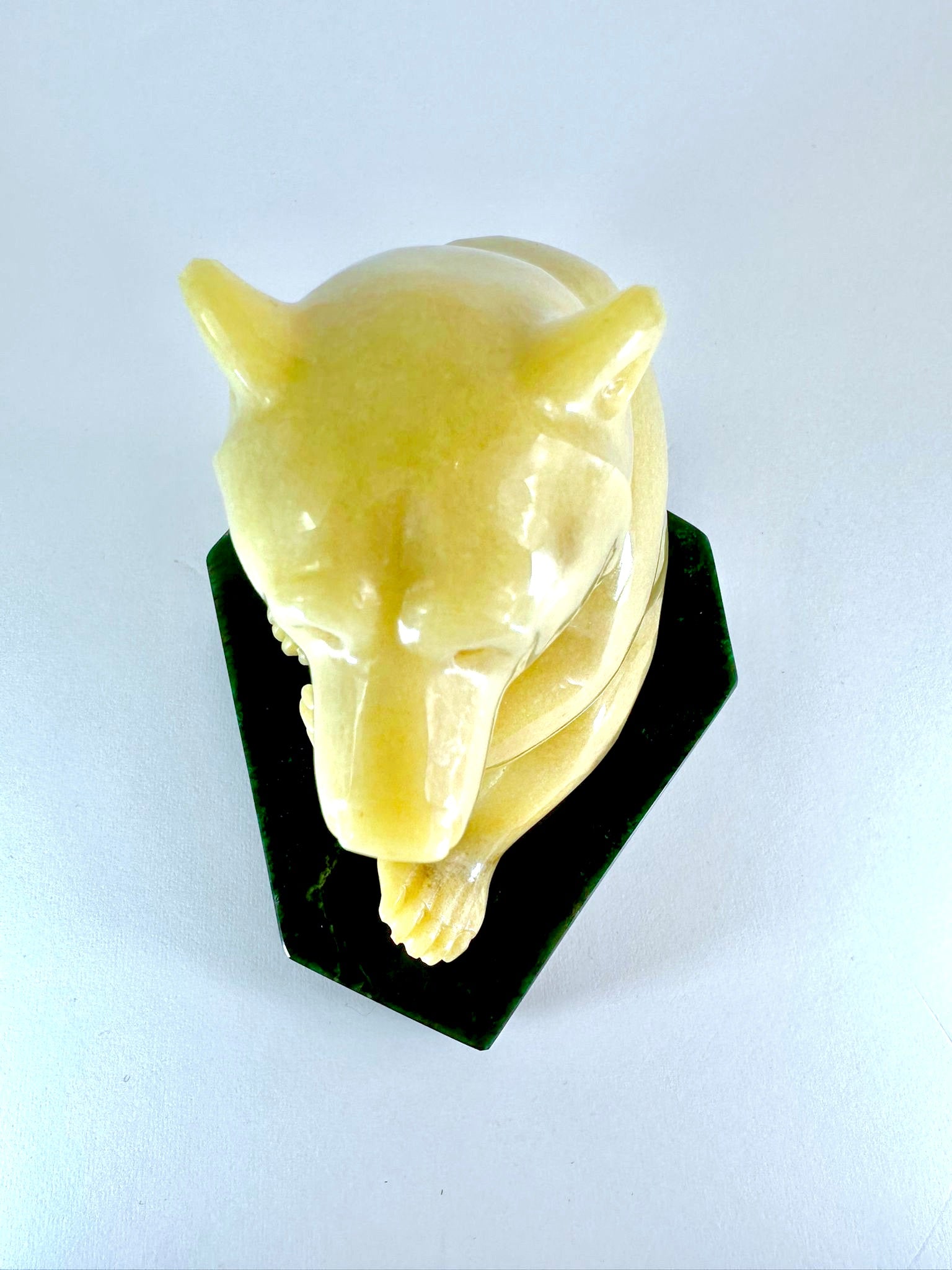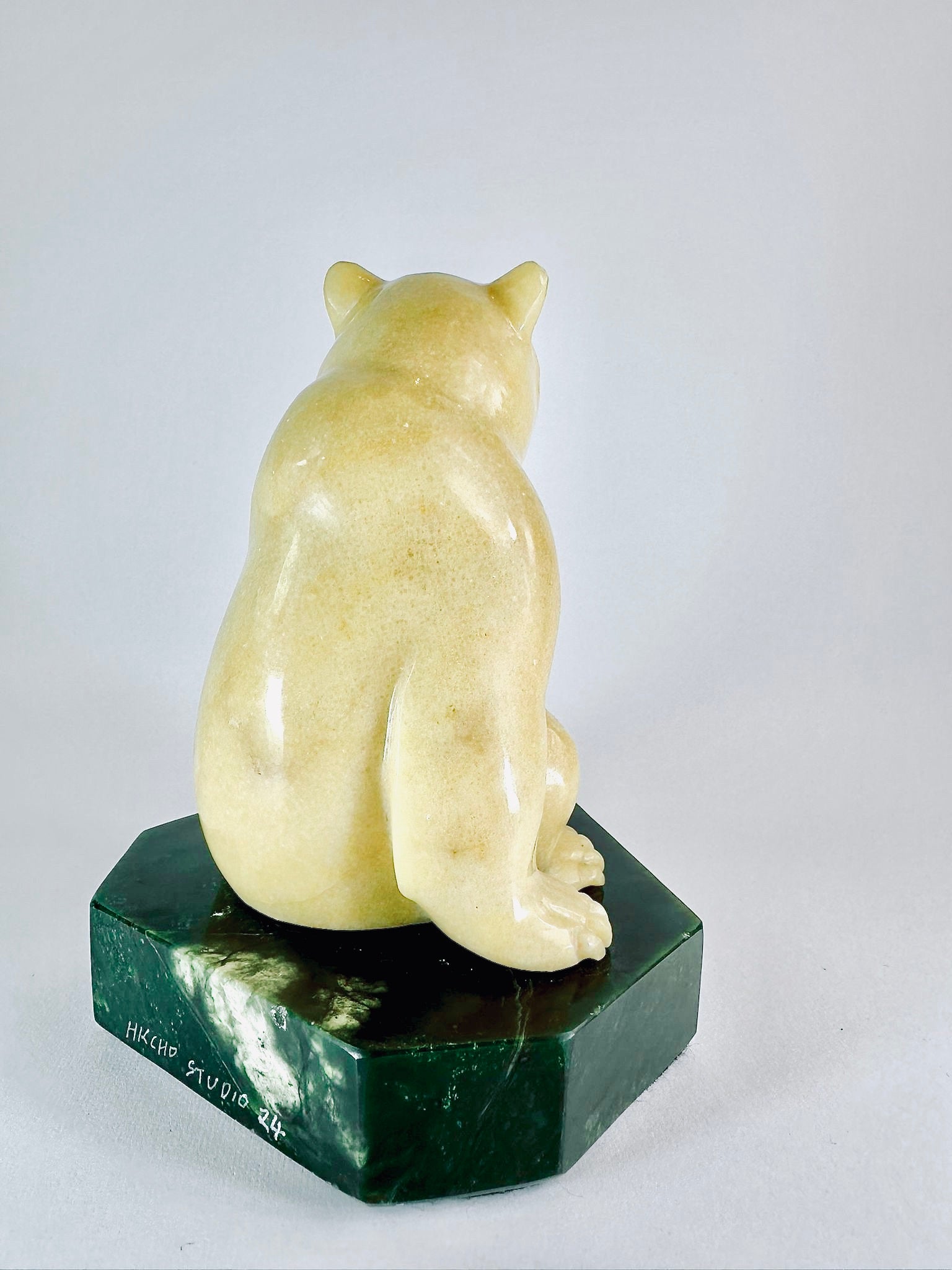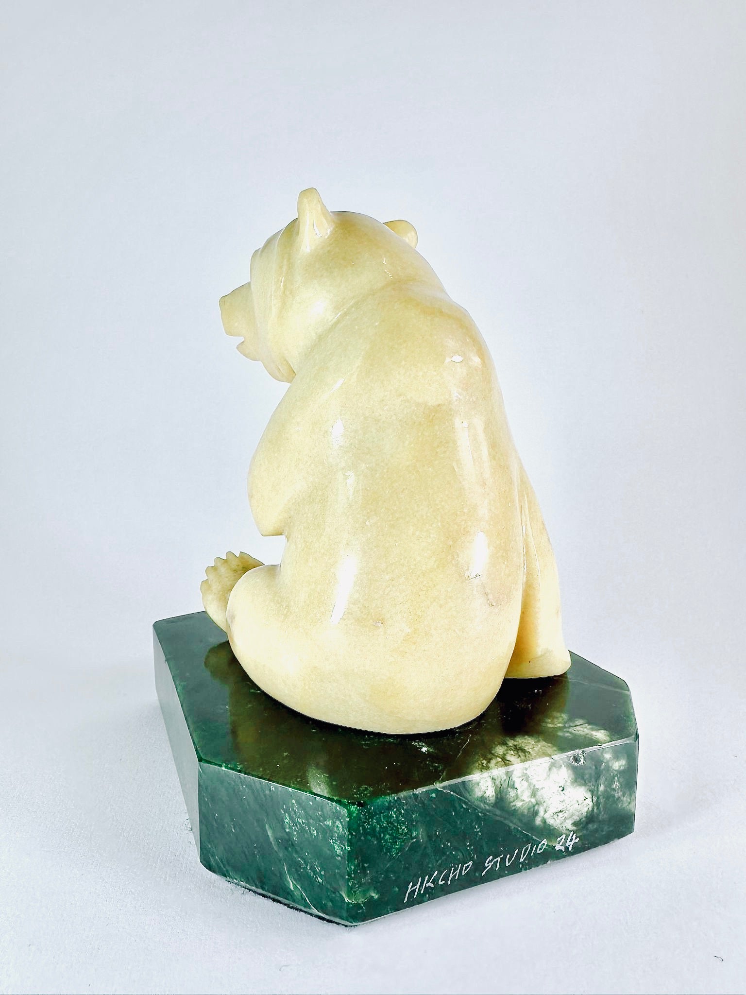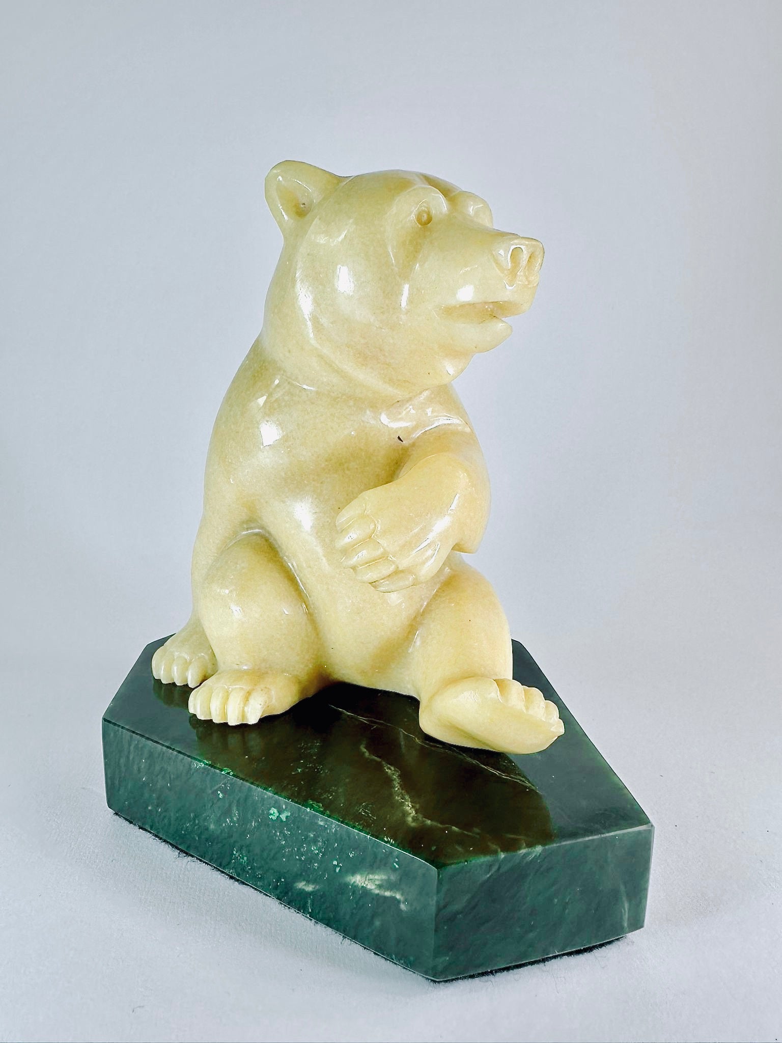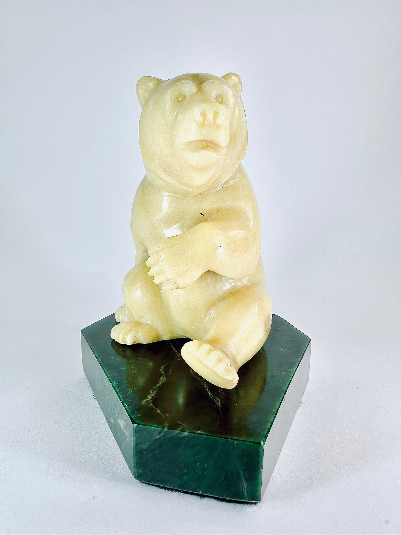 This adorable BC Golden Marlbe Grizzly is sitting on a AA BC Green Nepherite Jade base and is fully satisfied with life.