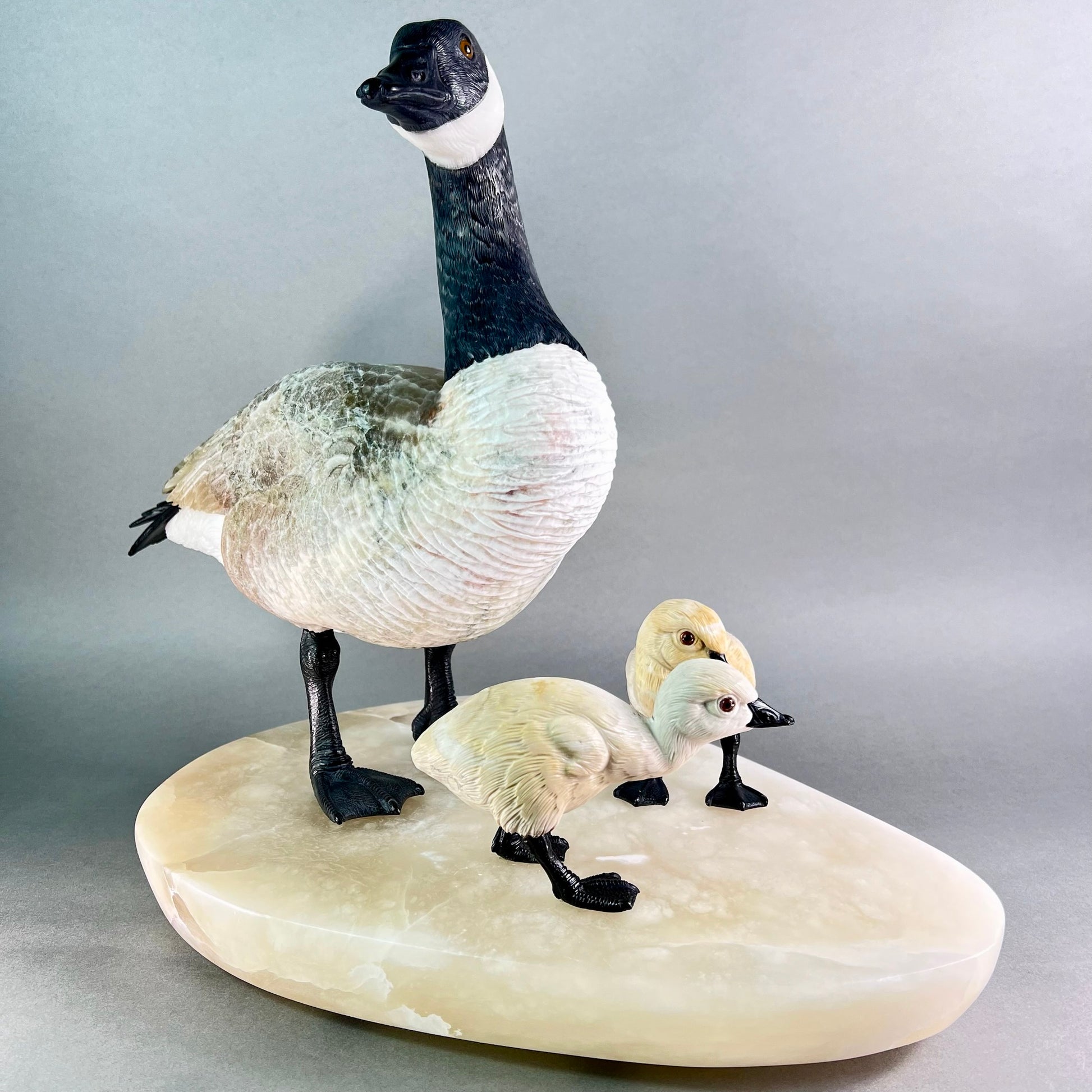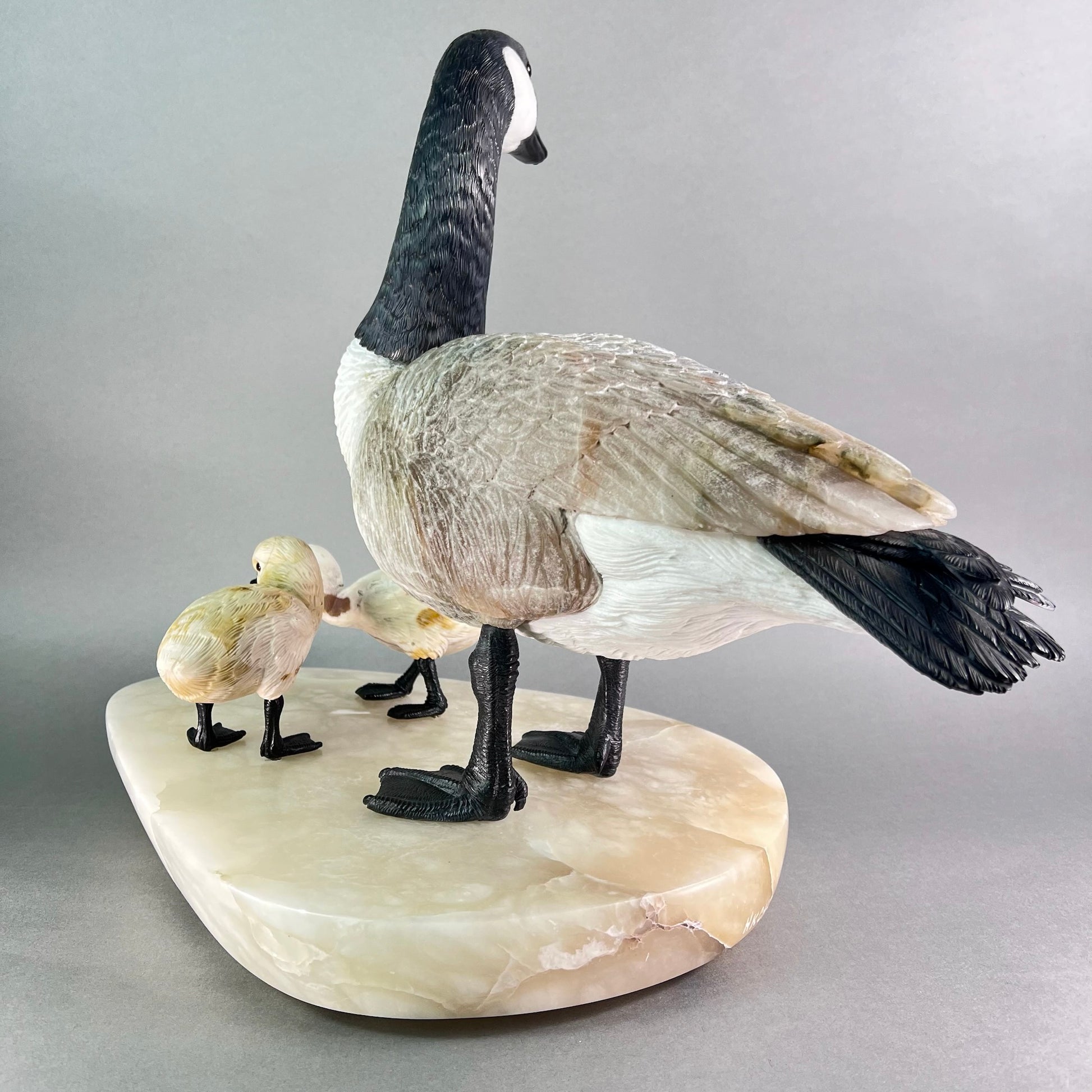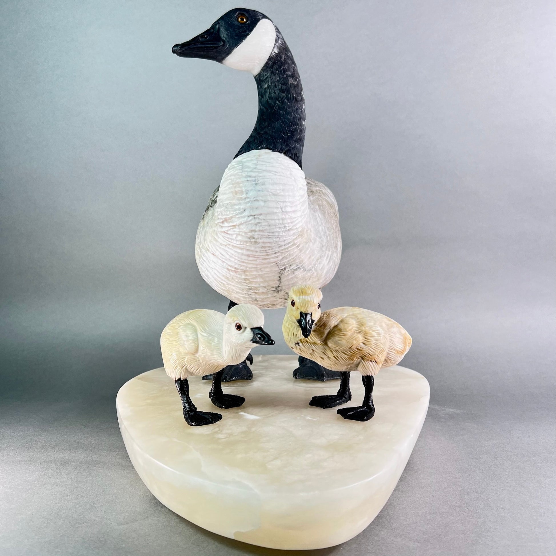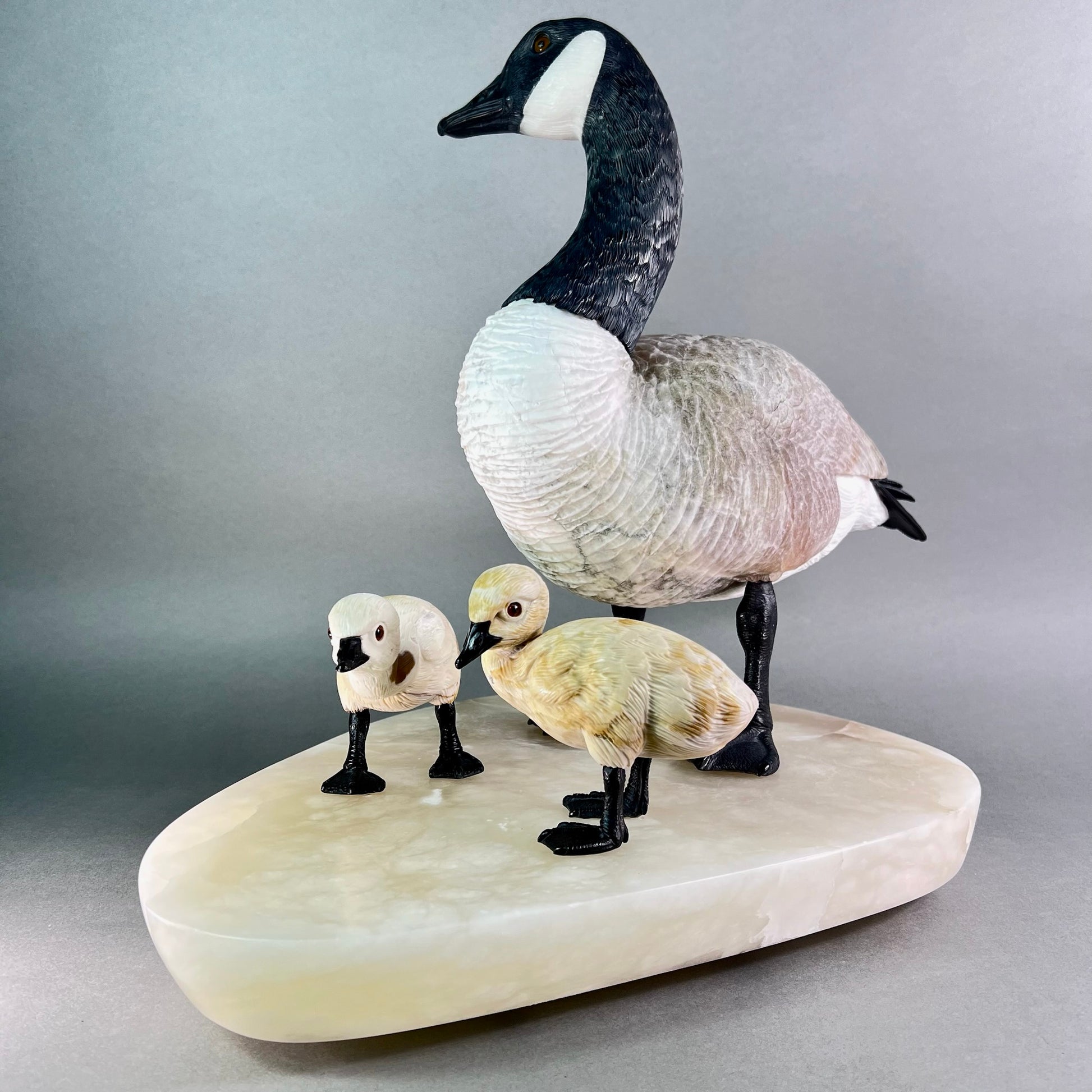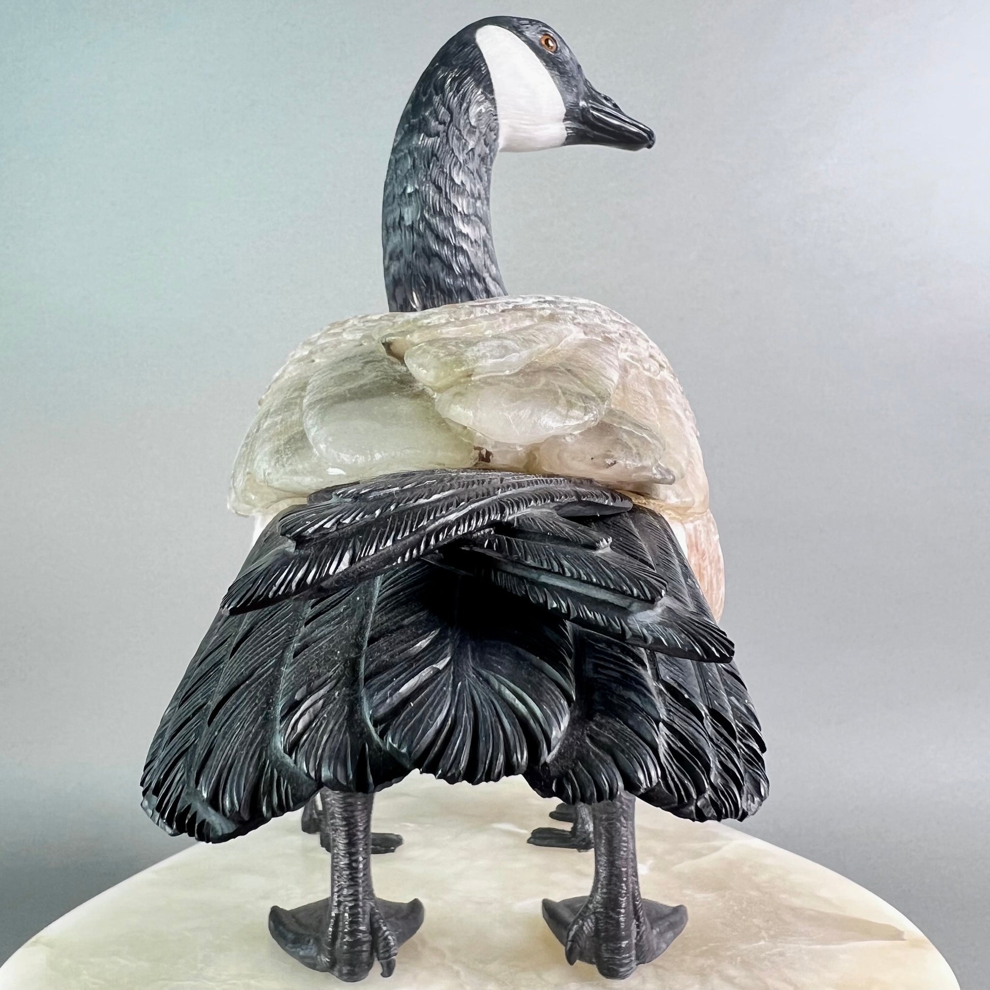 Behold a sculptural celebration one of nature's most devoted guardians. This Canadian Goose Family captures the tender bond between mother and goslings in exquisite stone, each figure meticulously carved to embody grace and familial devotion. The matriarch stands sentinel in luxurious black and white marble, her neck elegantly rendered while her body flows in creamy alabaster. Black jade legs ground her presence, while smoky quartz eyes gleam with maternal wisdom. Her goslings mirror her majesty in miniature—their bodies crafted from warm jasper, adorned with black jade beaks and legs, their eyes reflecting the same smoky quartz luminescence. At an impressive 22" x 13" x 17" and weighing 42 pounds, this monumental piece commands attention in any space. Hand-carved in British Columbia by artisans who understand stone's soul, it transforms raw earth into a timeless testament to nature's most enduring love. A gallery-worthy centerpiece that speaks to the heart.