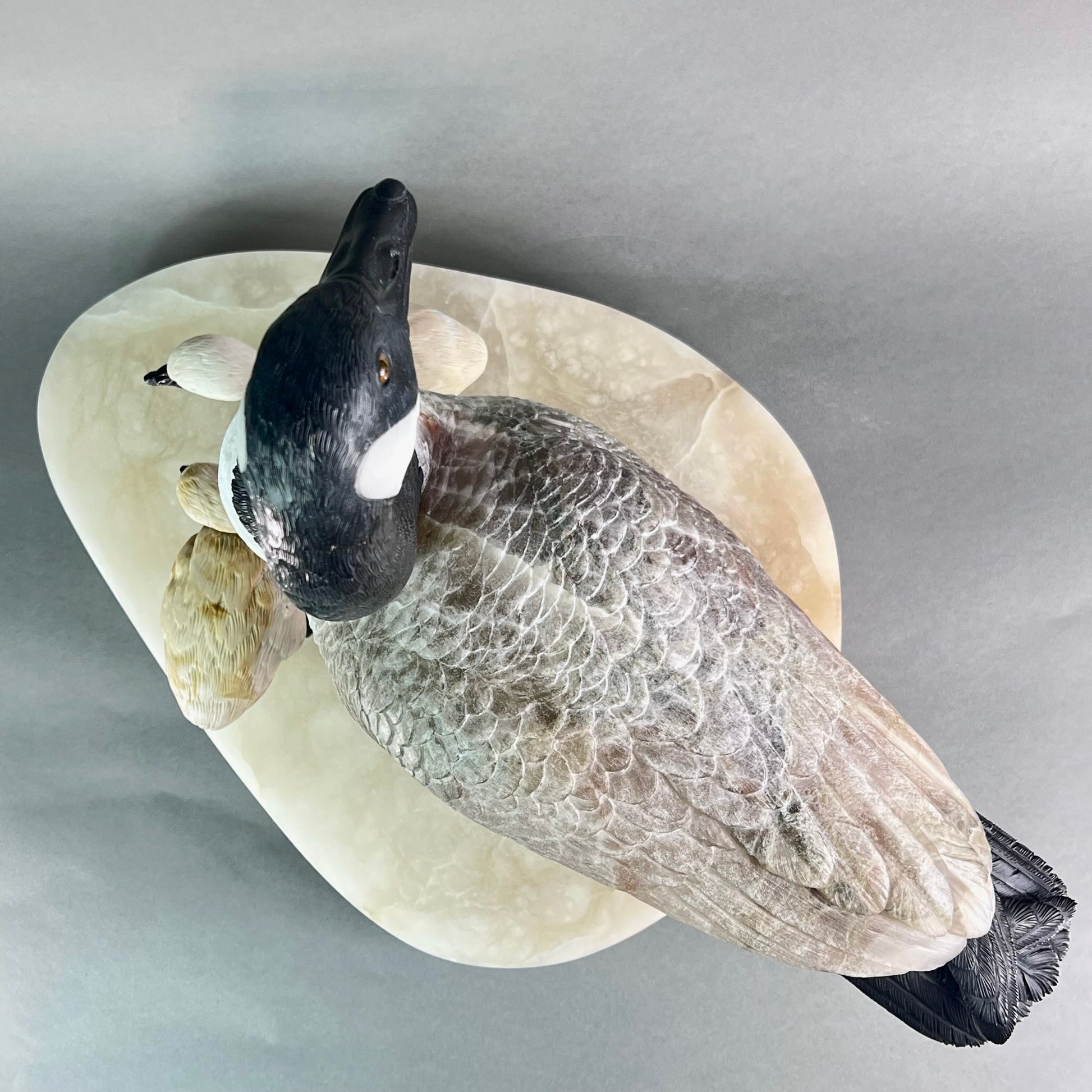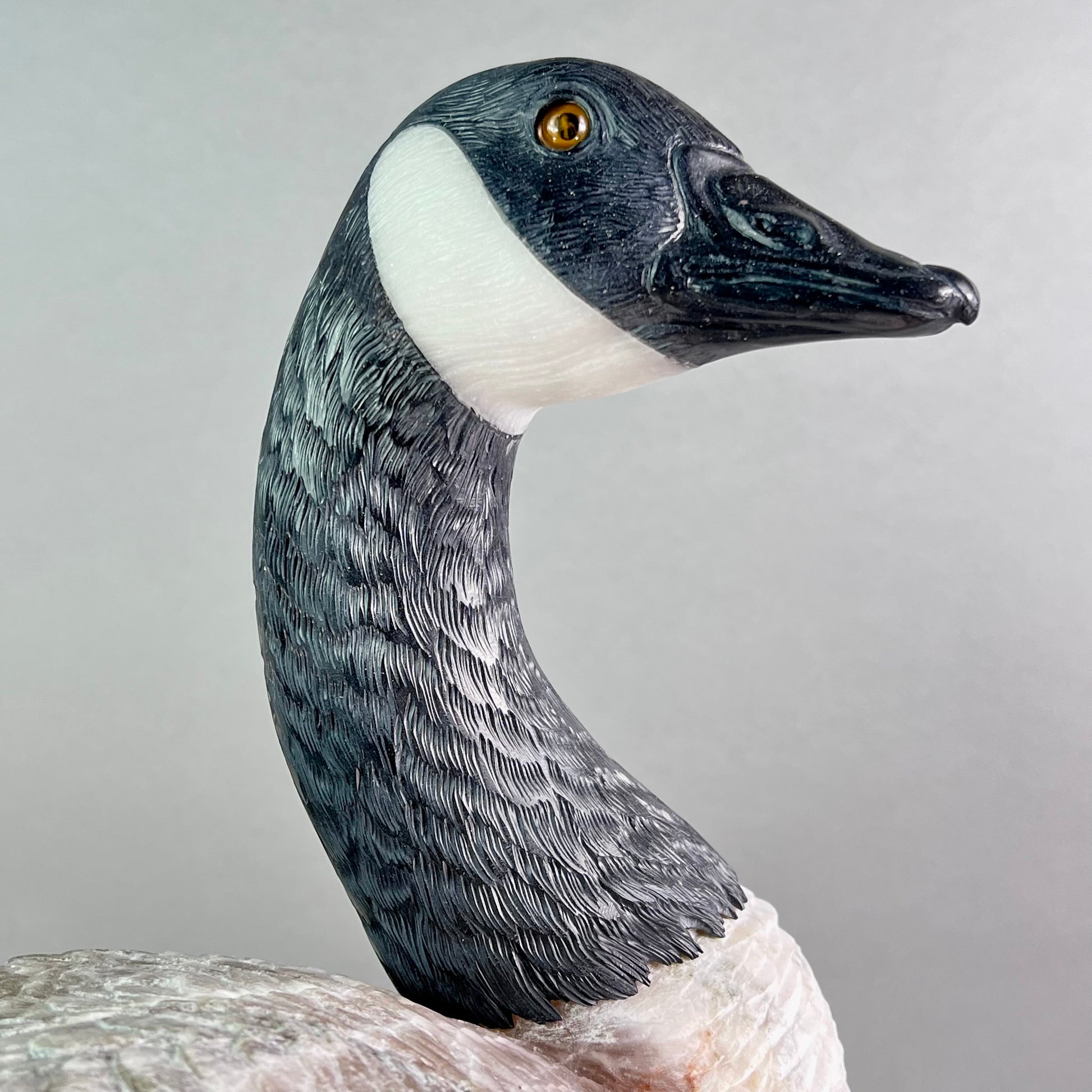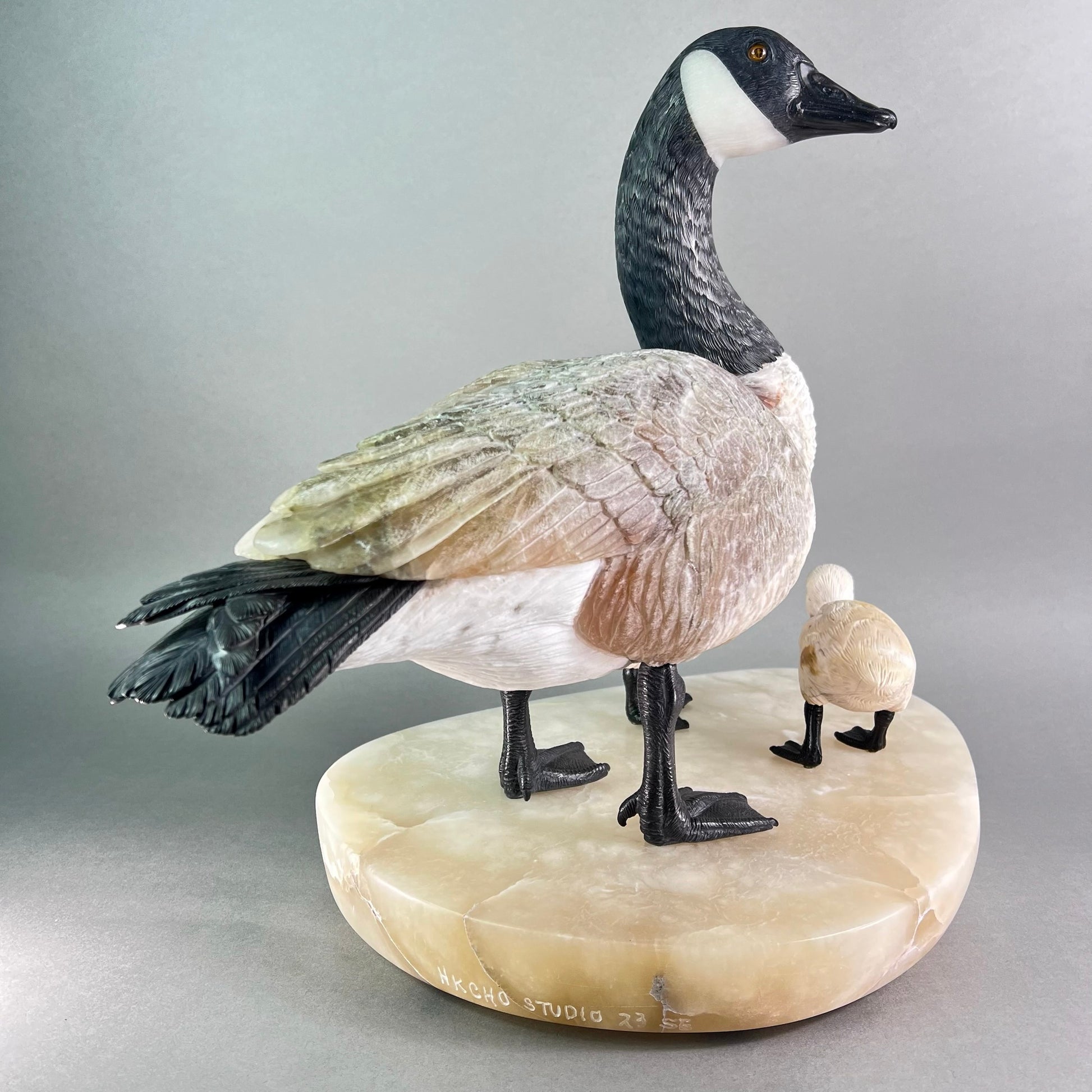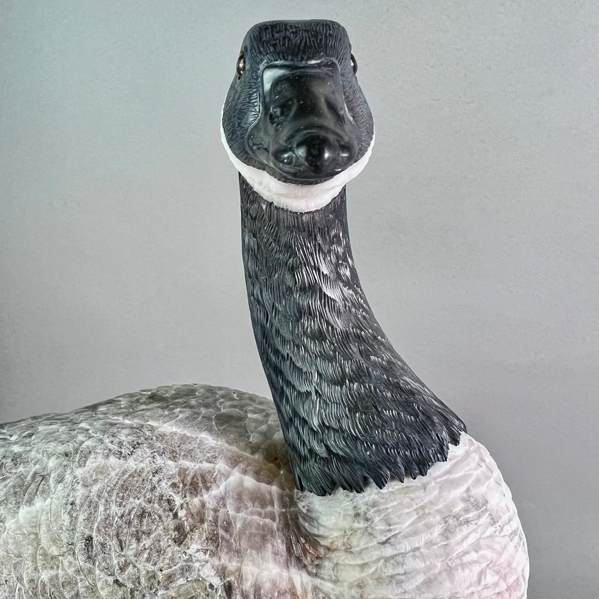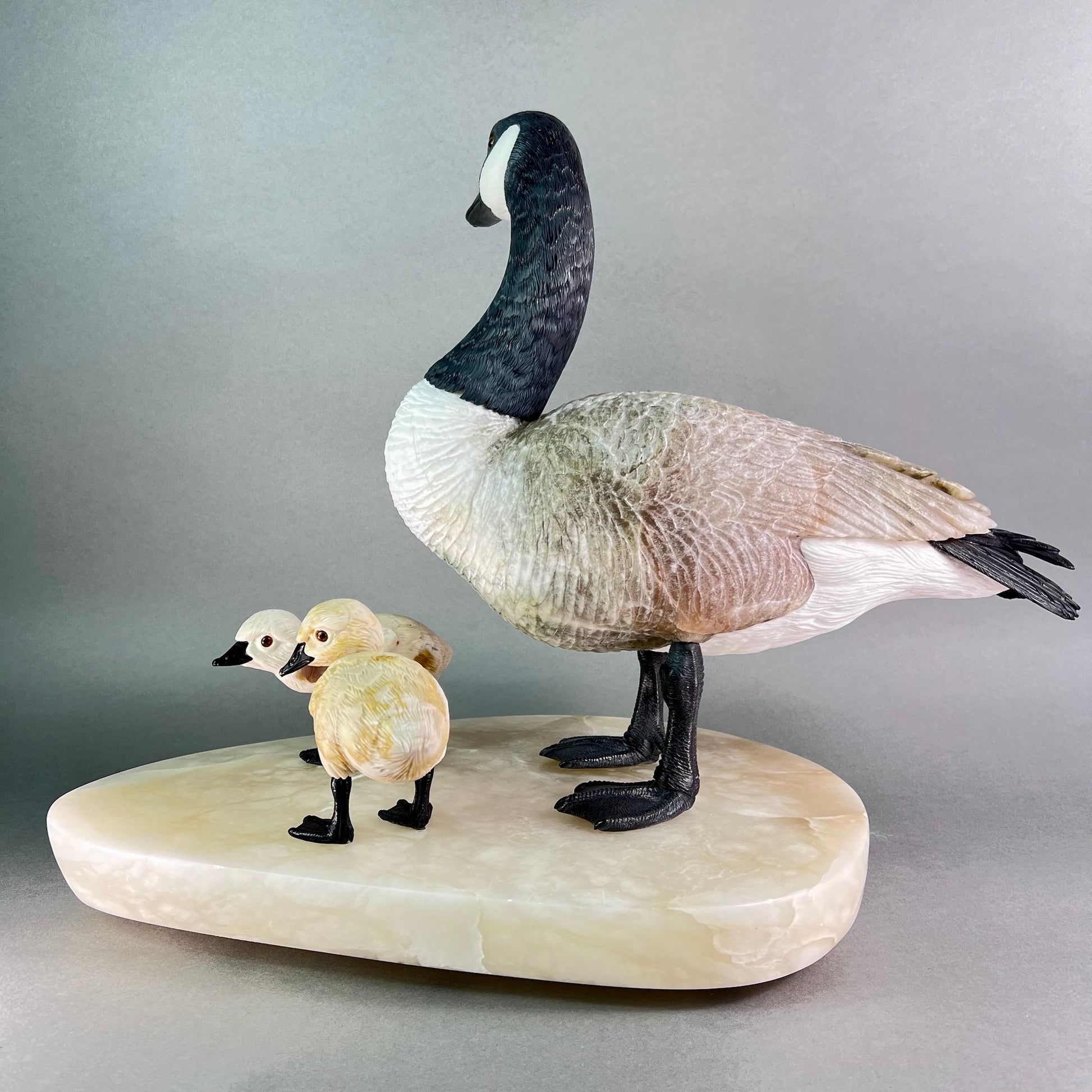 Behold a sculptural celebration one of nature's most devoted guardians. This Canadian Goose Family captures the tender bond between mother and goslings in exquisite stone, each figure meticulously carved to embody grace and familial devotion. The matriarch stands sentinel in luxurious black and white marble, her neck elegantly rendered while her body flows in creamy alabaster. Black jade legs ground her presence, while smoky quartz eyes gleam with maternal wisdom. Her goslings mirror her majesty in miniature—their bodies crafted from warm jasper, adorned with black jade beaks and legs, their eyes reflecting the same smoky quartz luminescence. At an impressive 22" x 13" x 17" and weighing 42 pounds, this monumental piece commands attention in any space. Hand-carved in British Columbia by artisans who understand stone's soul, it transforms raw earth into a timeless testament to nature's most enduring love. A gallery-worthy centerpiece that speaks to the heart.