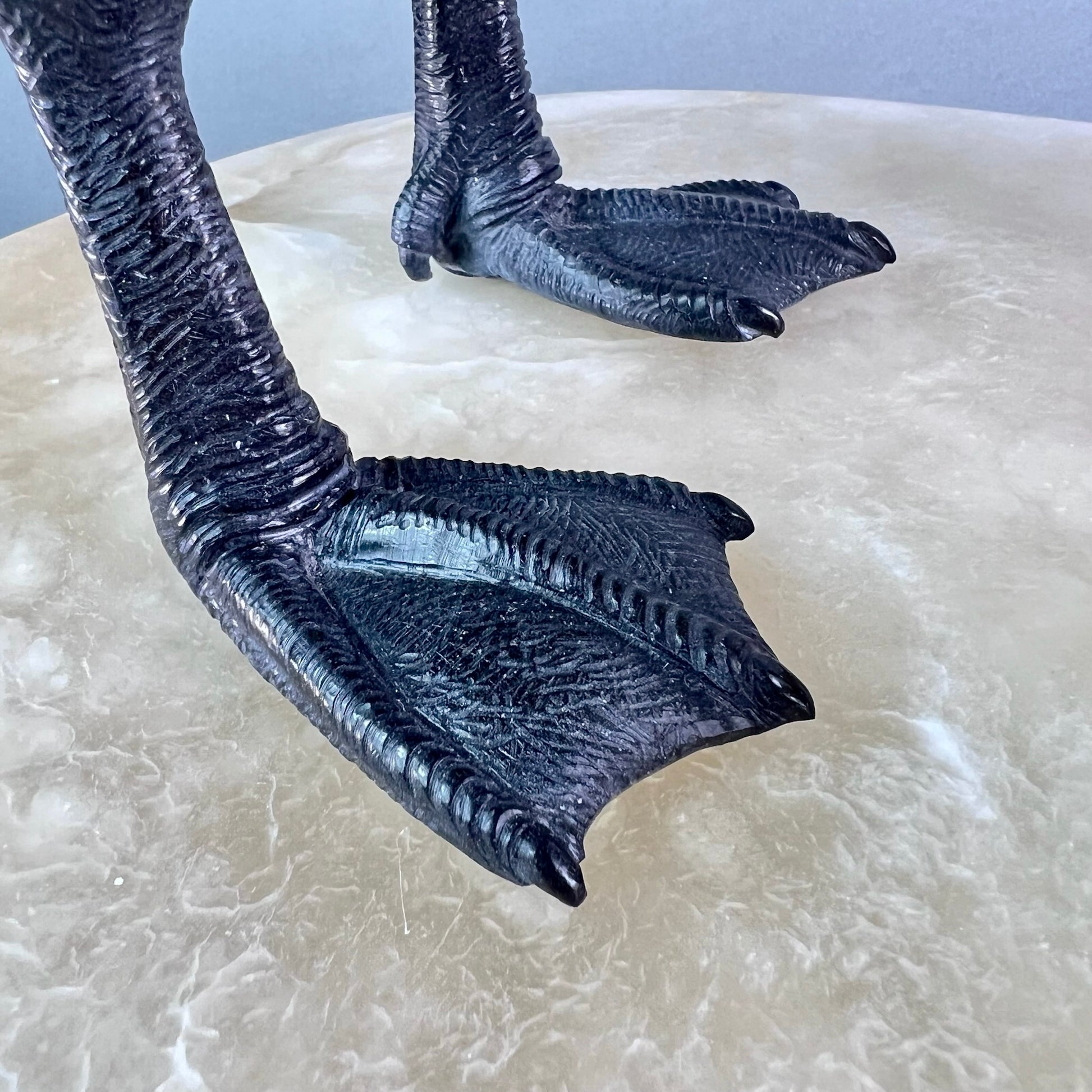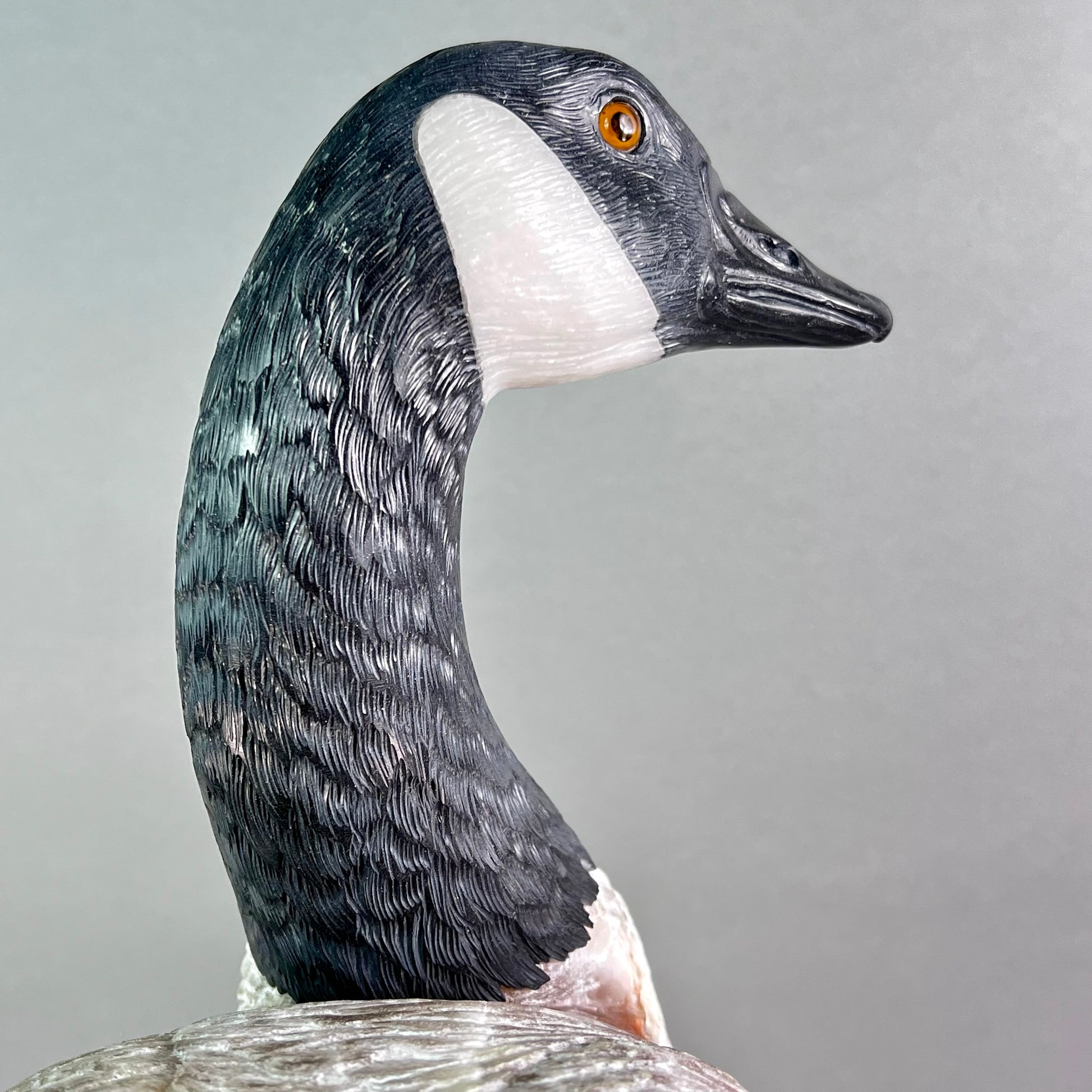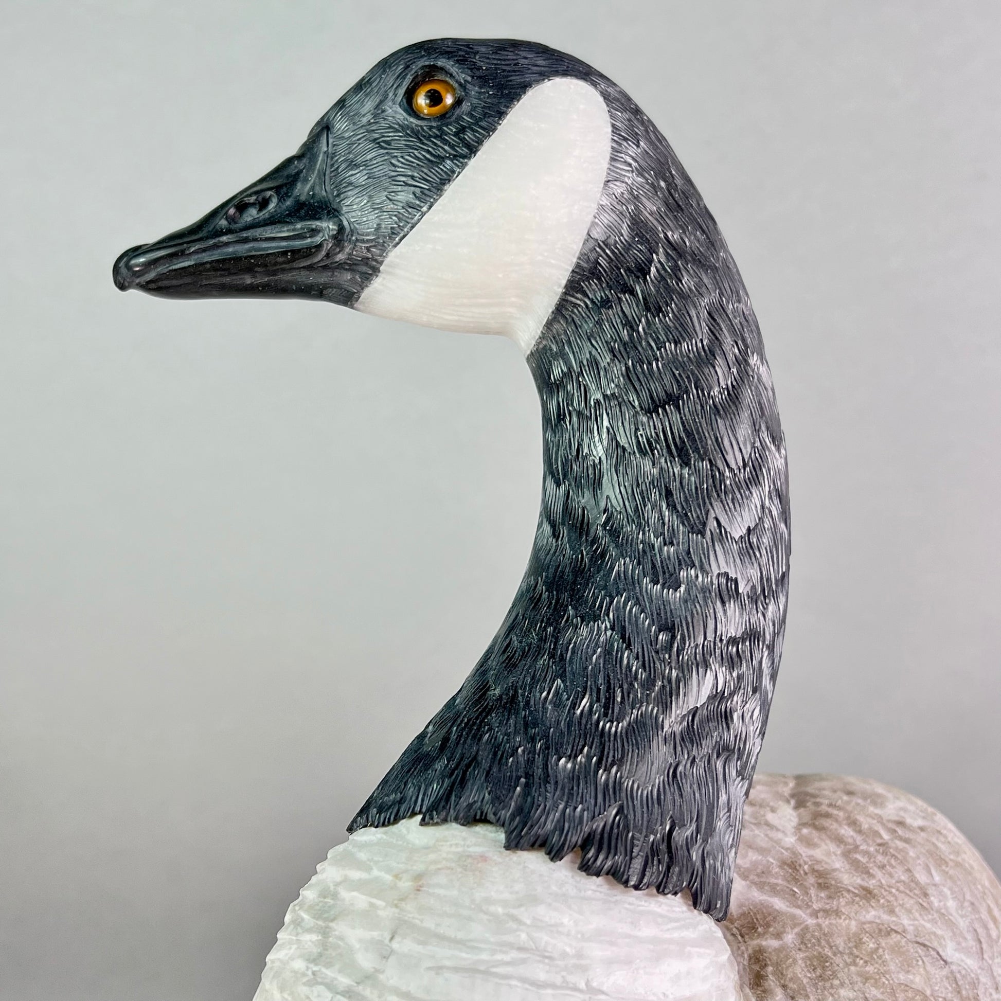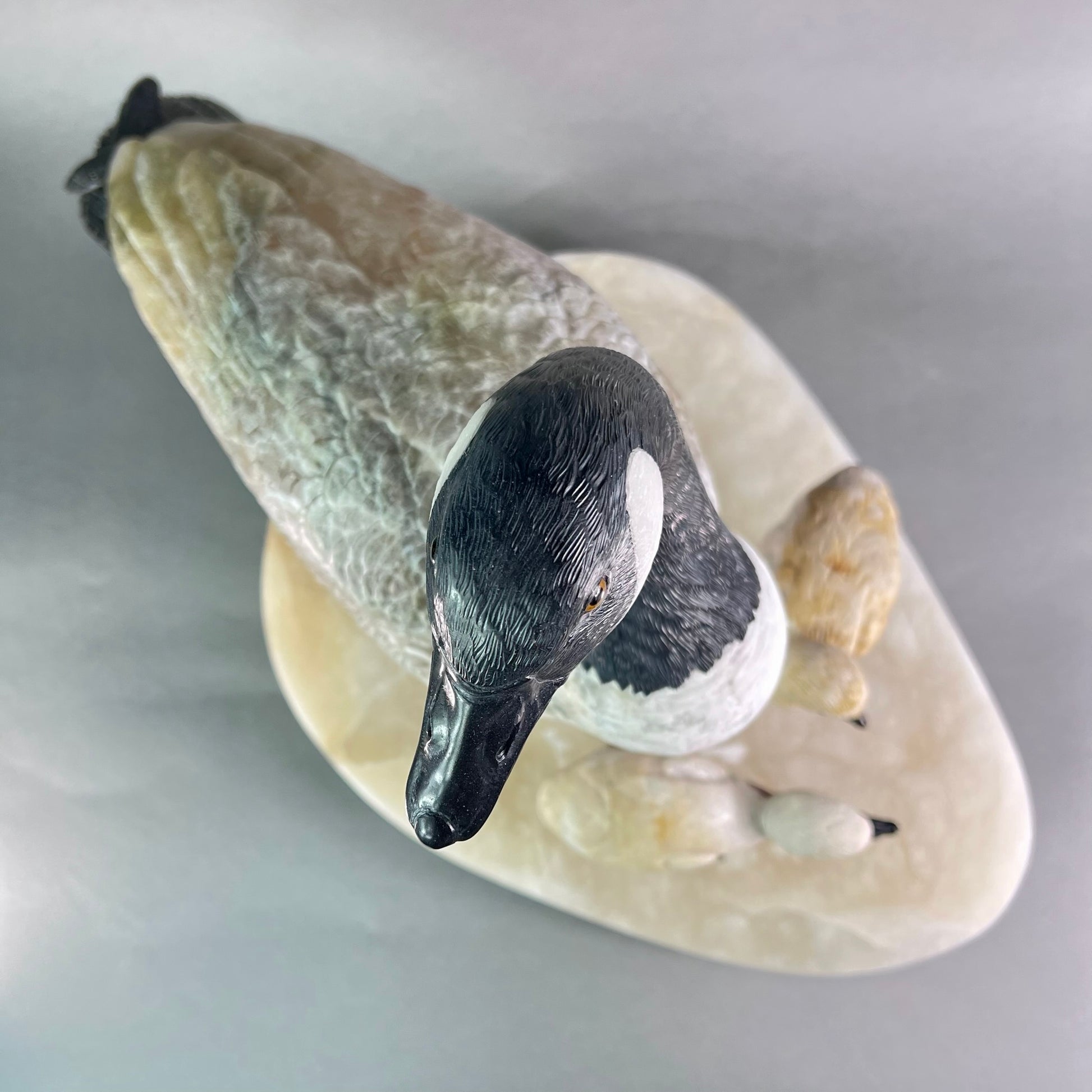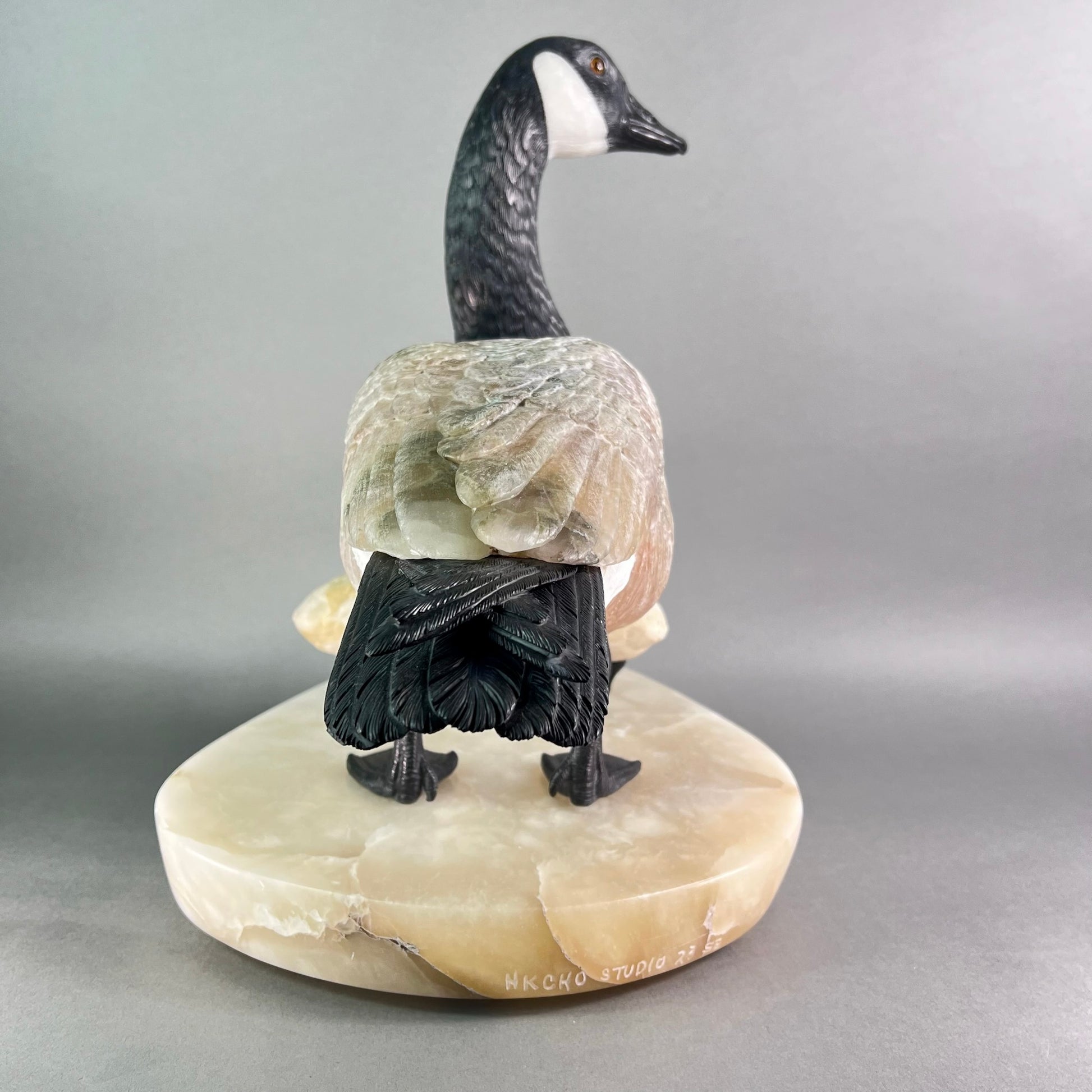 Behold a sculptural celebration one of nature's most devoted guardians. This Canadian Goose Family captures the tender bond between mother and goslings in exquisite stone, each figure meticulously carved to embody grace and familial devotion. The matriarch stands sentinel in luxurious black and white marble, her neck elegantly rendered while her body flows in creamy alabaster. Black jade legs ground her presence, while smoky quartz eyes gleam with maternal wisdom. Her goslings mirror her majesty in miniature—their bodies crafted from warm jasper, adorned with black jade beaks and legs, their eyes reflecting the same smoky quartz luminescence. At an impressive 22" x 13" x 17" and weighing 42 pounds, this monumental piece commands attention in any space. Hand-carved in British Columbia by artisans who understand stone's soul, it transforms raw earth into a timeless testament to nature's most enduring love. A gallery-worthy centerpiece that speaks to the heart.