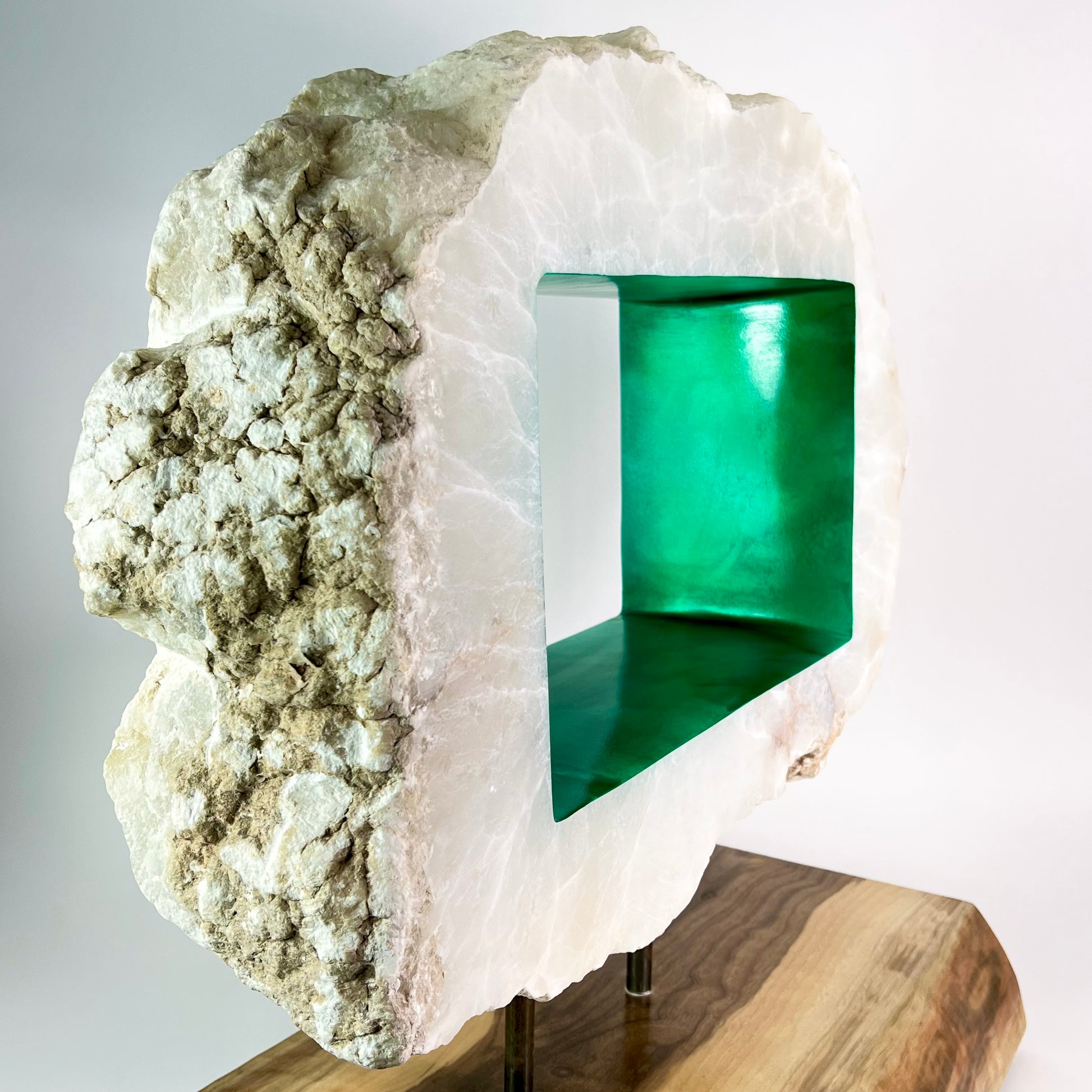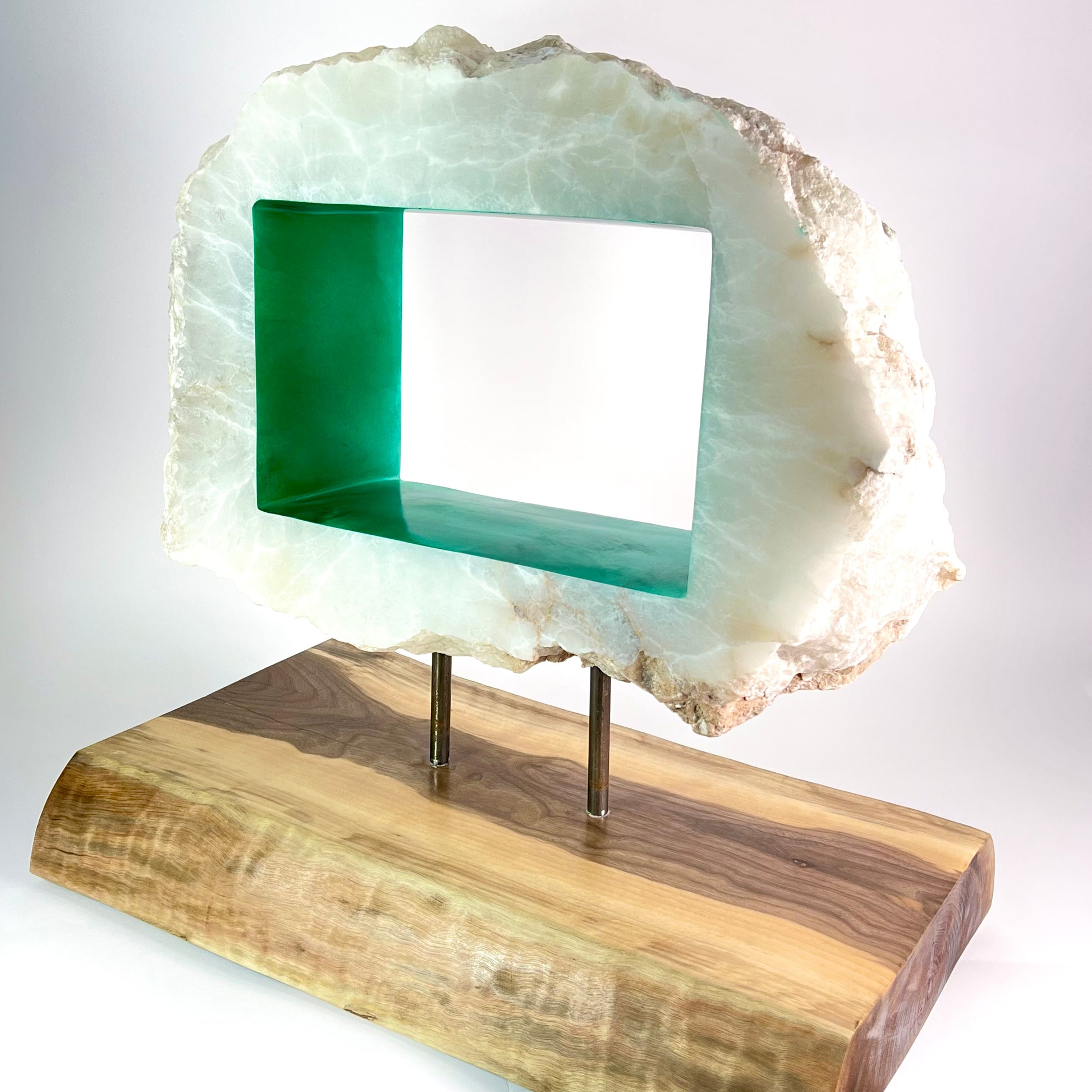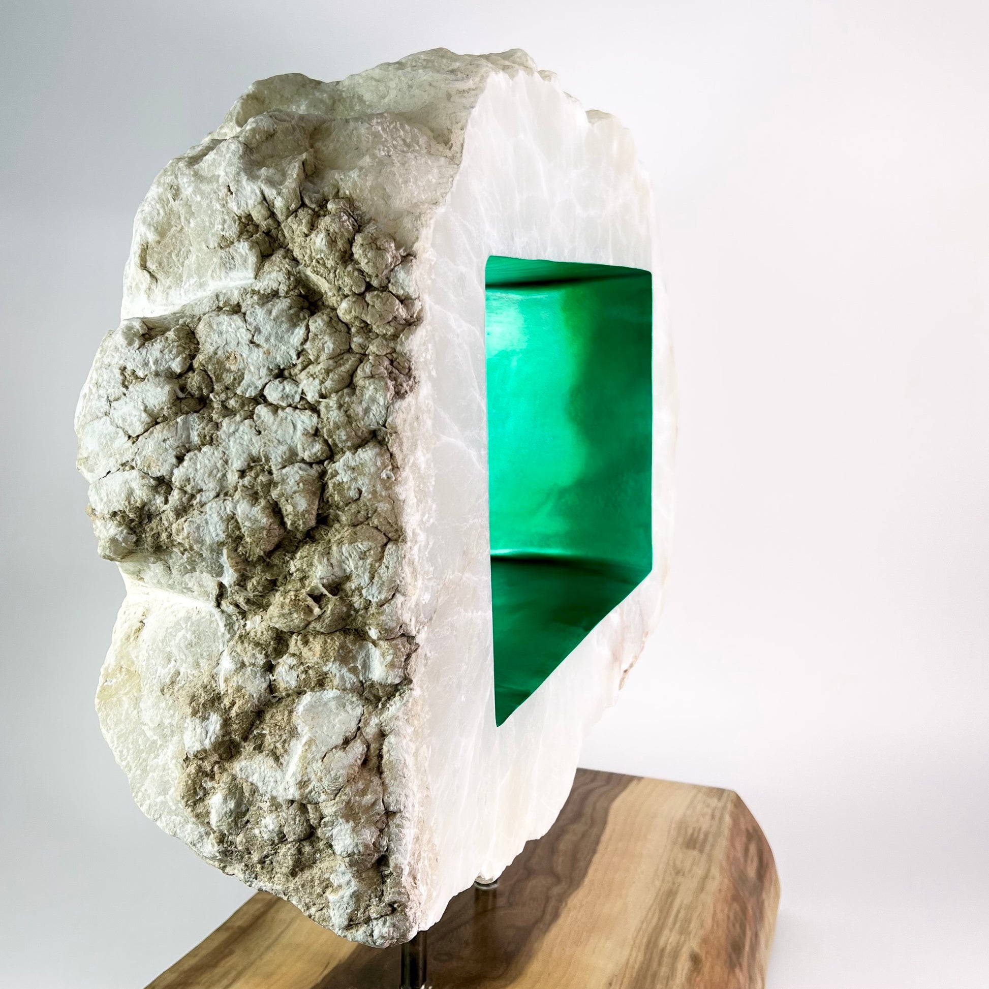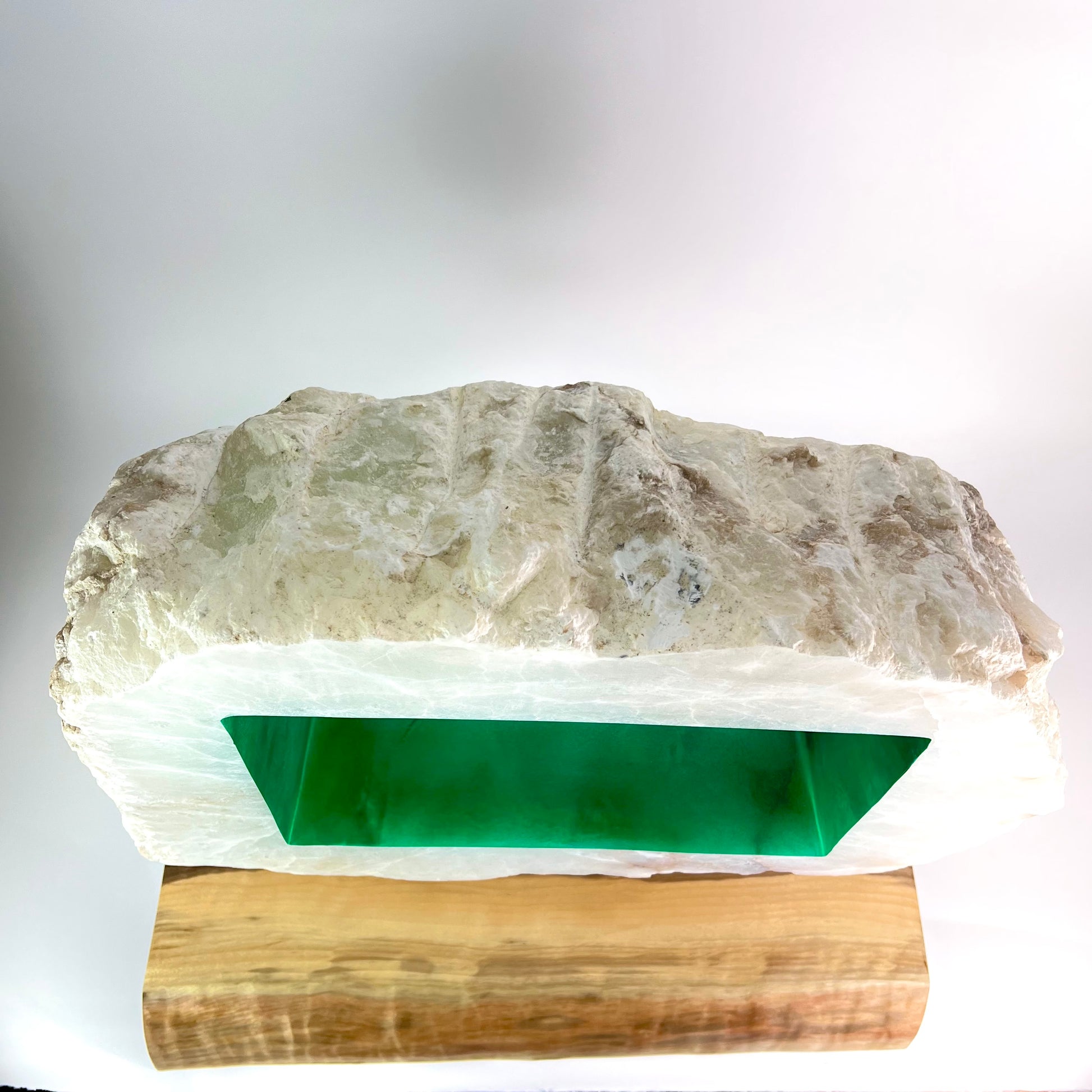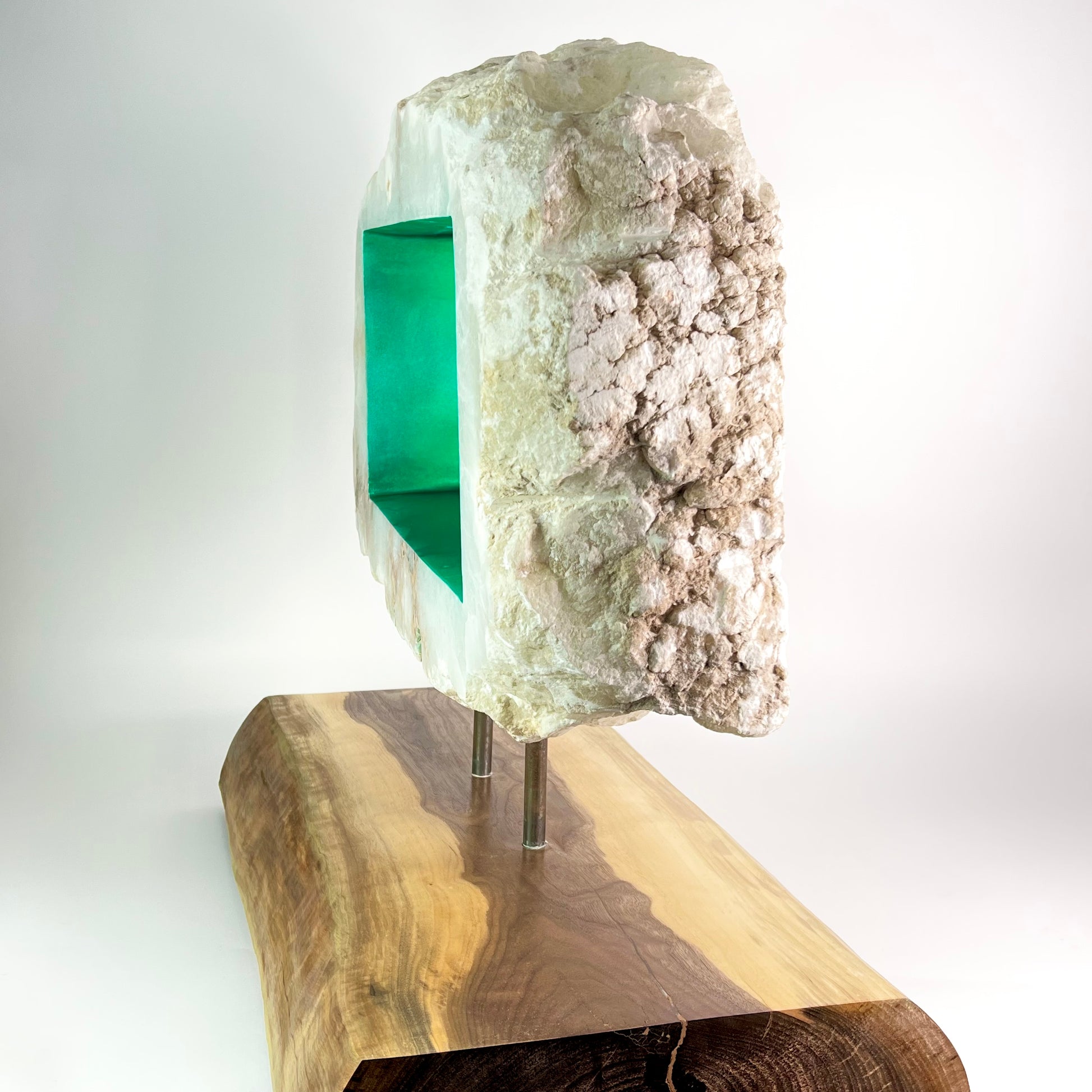 This striking series of stone sculptures celebrates the harmonious contrast between nature’s raw beauty and the artistry of human craftsmanship. Each piece is meticulously hand crafted from Italian alabaster, a translucent stone prized for its noble origins and luminous qualities. The sculptures feature a rugged, natural rough exterior, preserving the stone's organic form, while the interiors are polished to a sleek, lustrous finish.