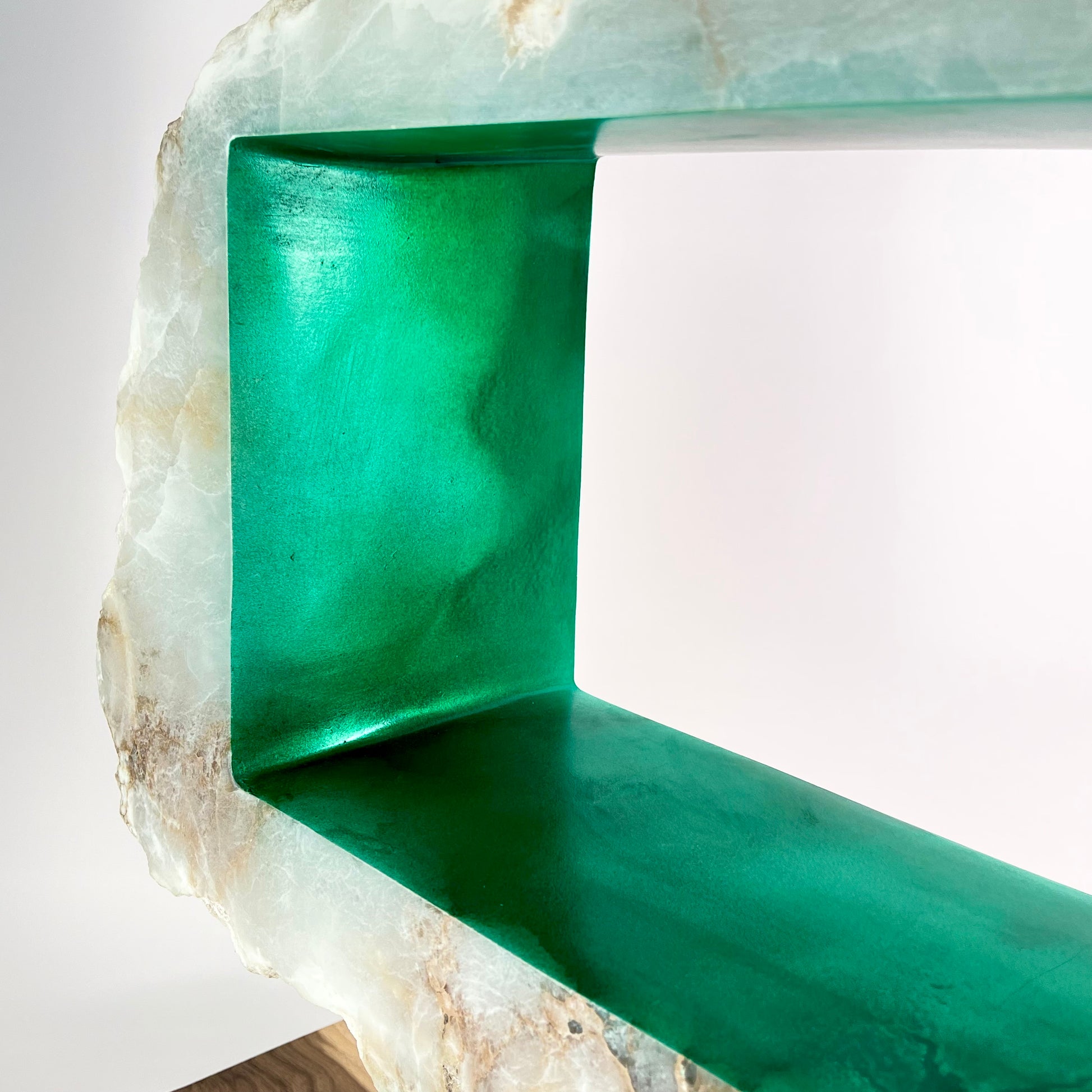 Vibrant metallic paints are applied with precision, creating a dazzling interplay of light and color. The radiant hues gently seep into the translucent alabaster, allowing the stone to absorb and reflect the pigments, adding depth and vibrancy to the natural material. The minimalist design emphasizes the purity and elegance of the stone, while the vivid colors evoke a sense of creativity, refinement, and contemporary artistry.
