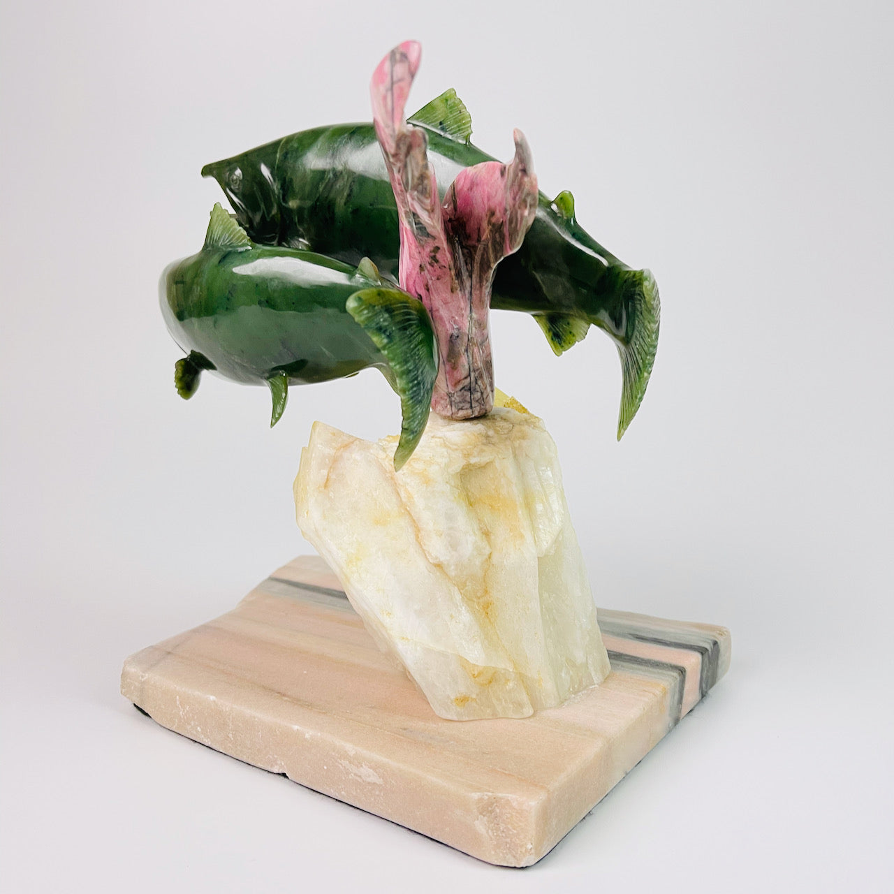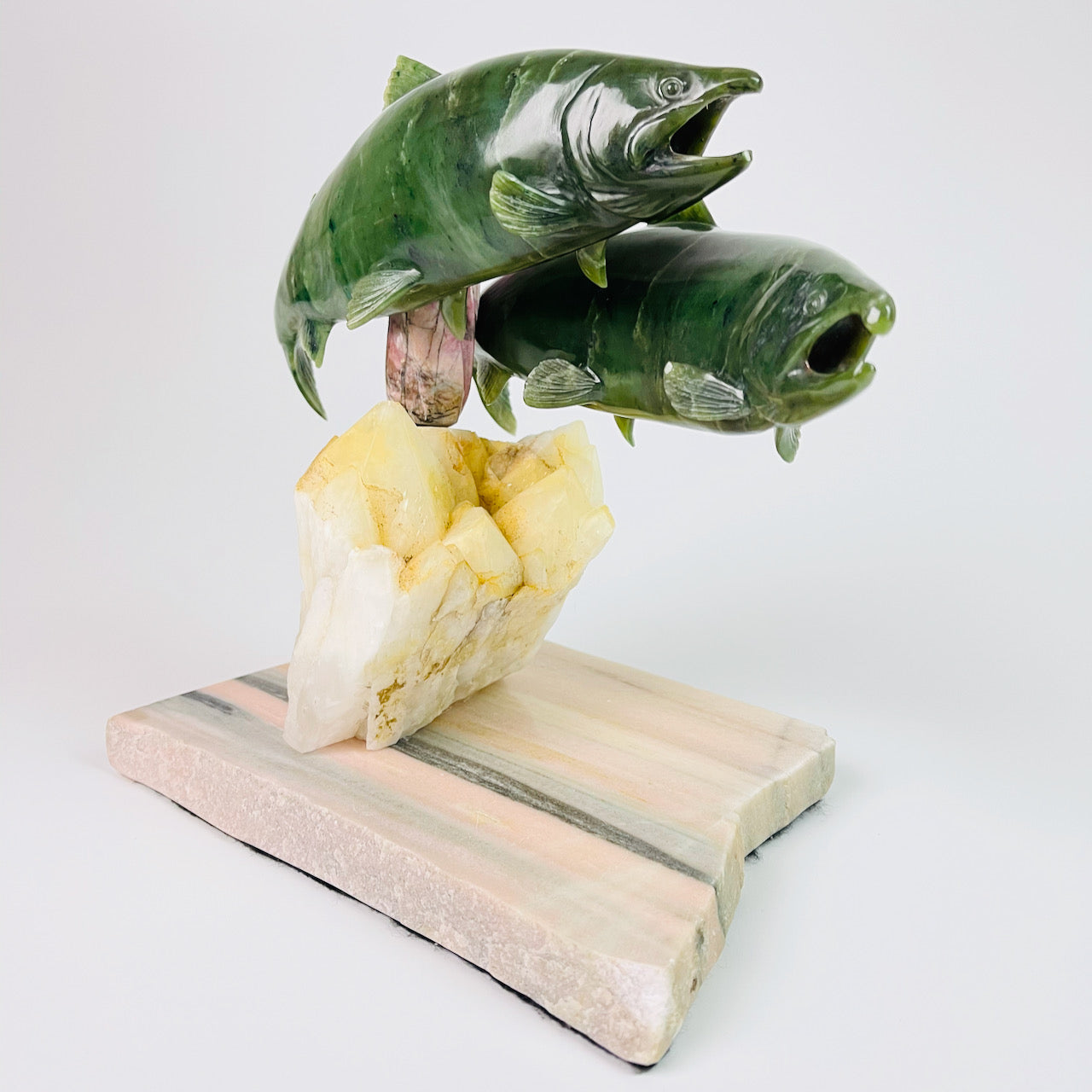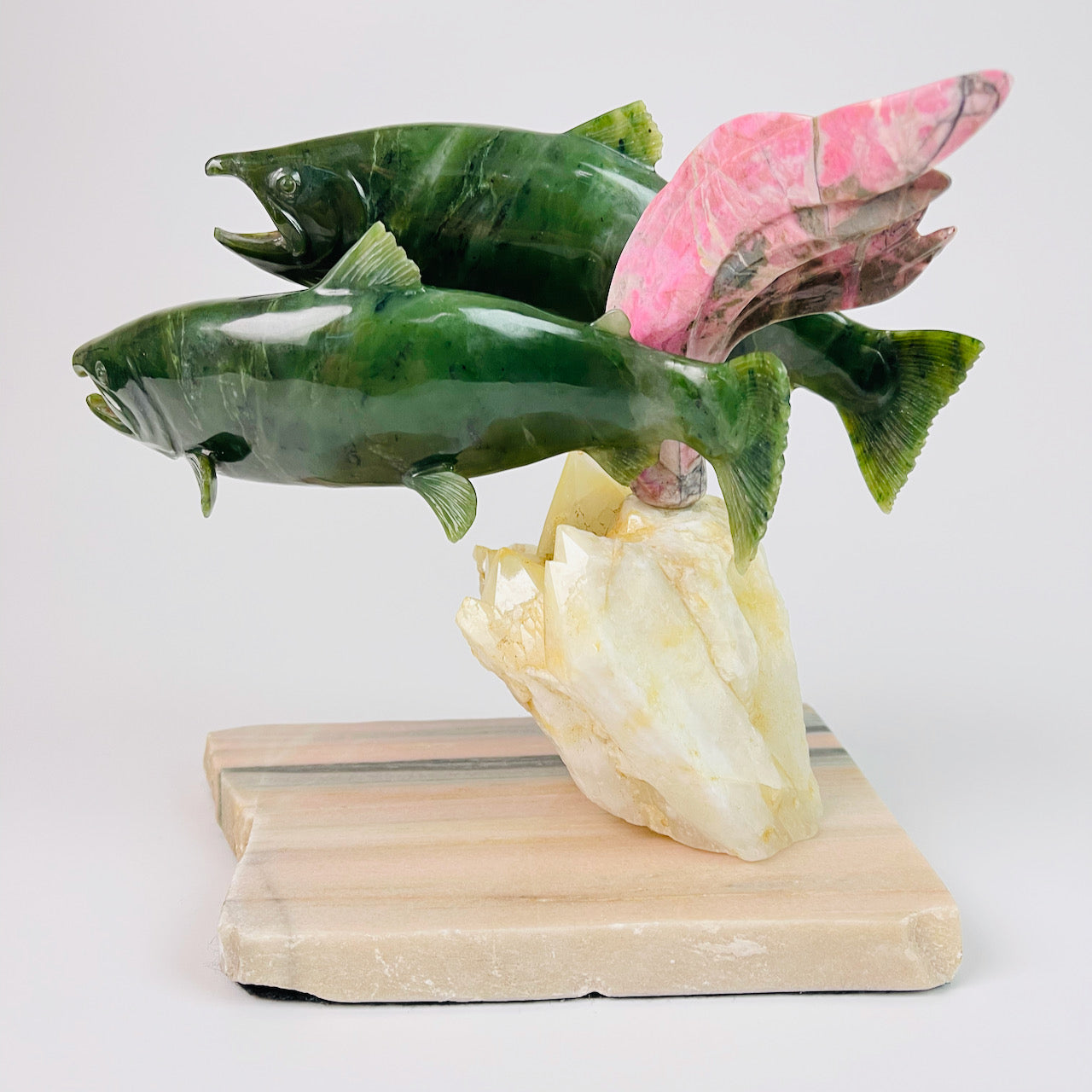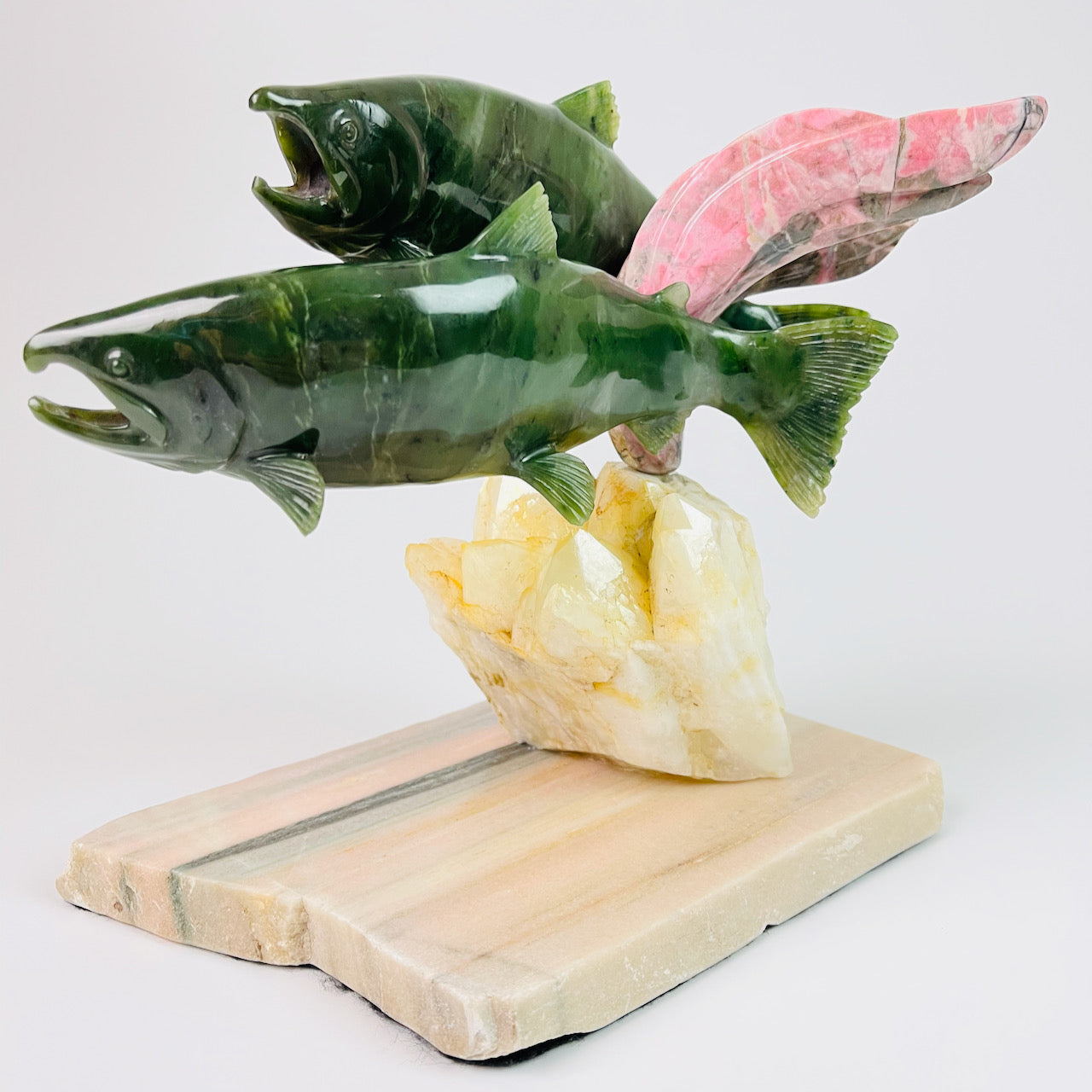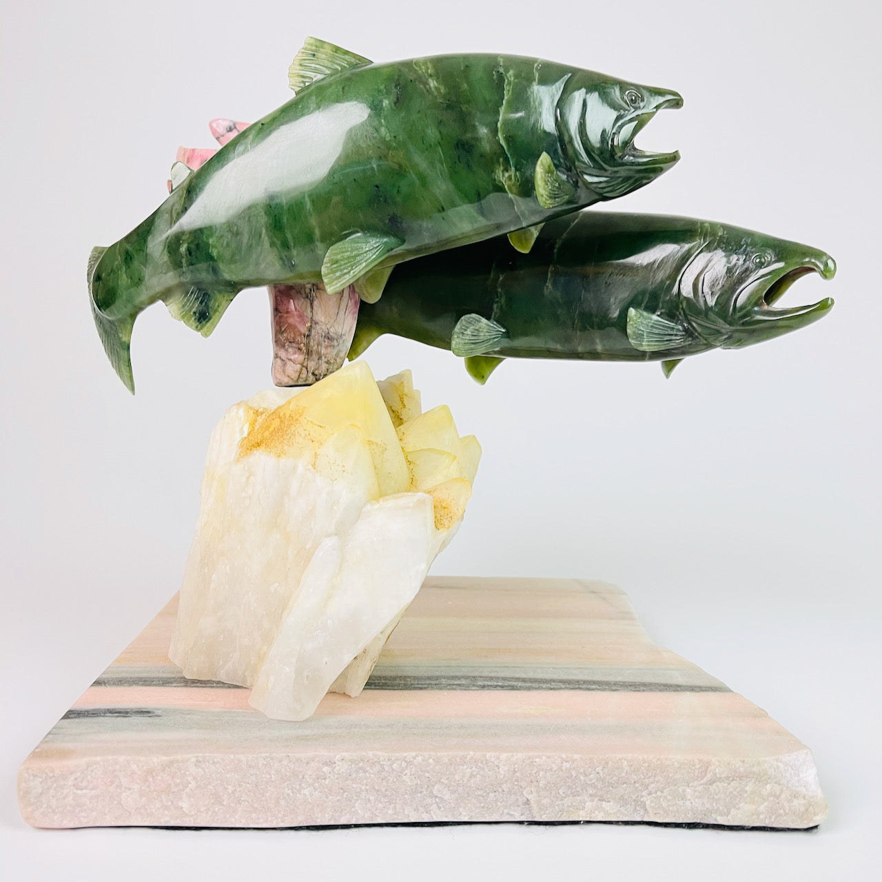This vibrant sculpture showcases the dynamic interplay of BC Green Jade and BC Pink Rhodonite in the form of two salmon, their fluid motion captured in mid-leap. Standing 8 inches tall and weighing 7 pounds, the piece features the fish emerging from a striking citrine crystal, anchored by a pink marble base. The artist skillfully combines the deep green hues of the jade with the vivid pink of the rhodonite, enhancing the realism and vitality of the salmon. The use of citrine crystal not only adds a touch of elegance but also symbolizes the purity and clarity of the natural world. This piece, carved in British Columbia, pays homage to the region's rich aquatic life and geological diversity. In comparison to other sculptures in the gallery, this work stands out for its intricate use of multiple stones, each contributing to the overall harmony and beauty of the composition.