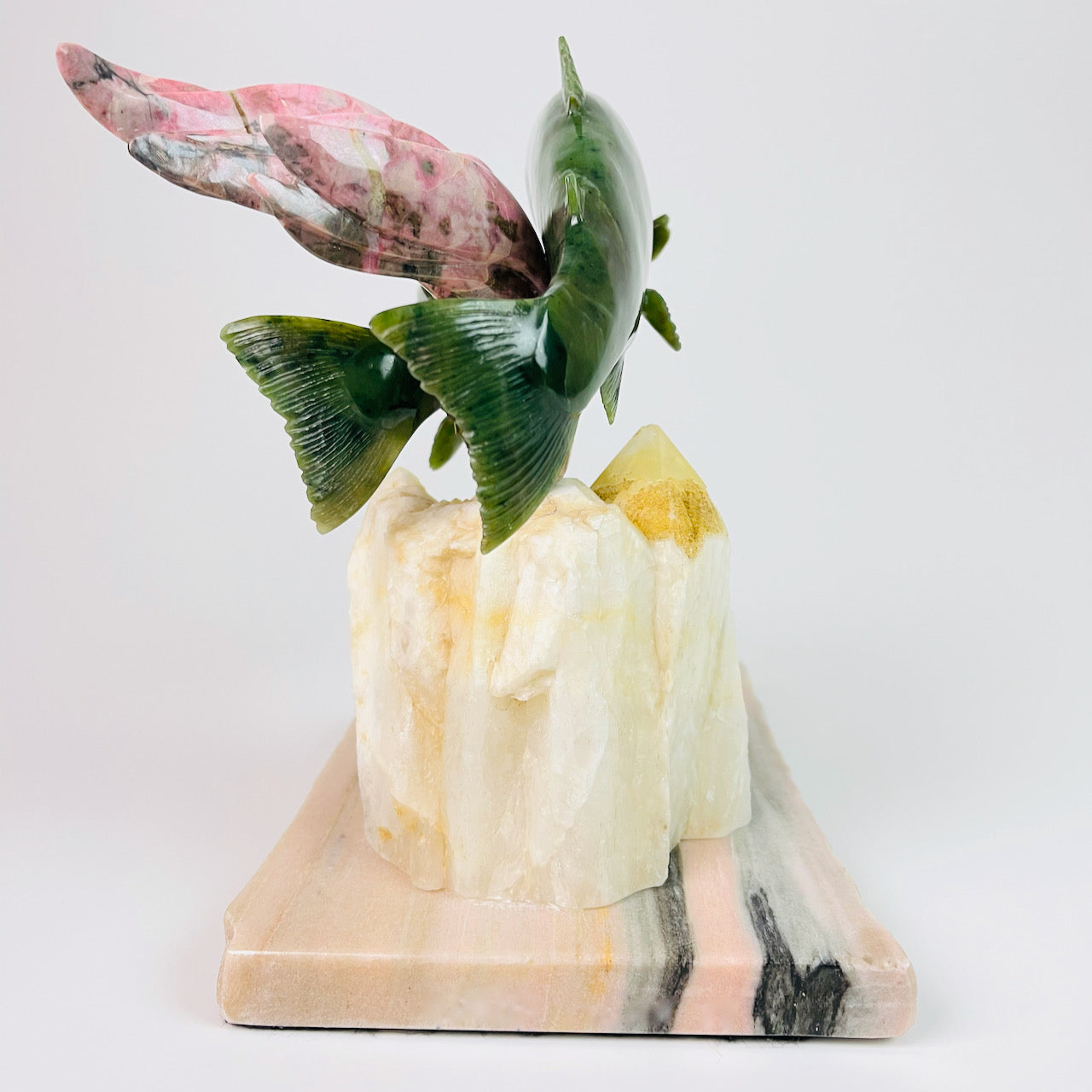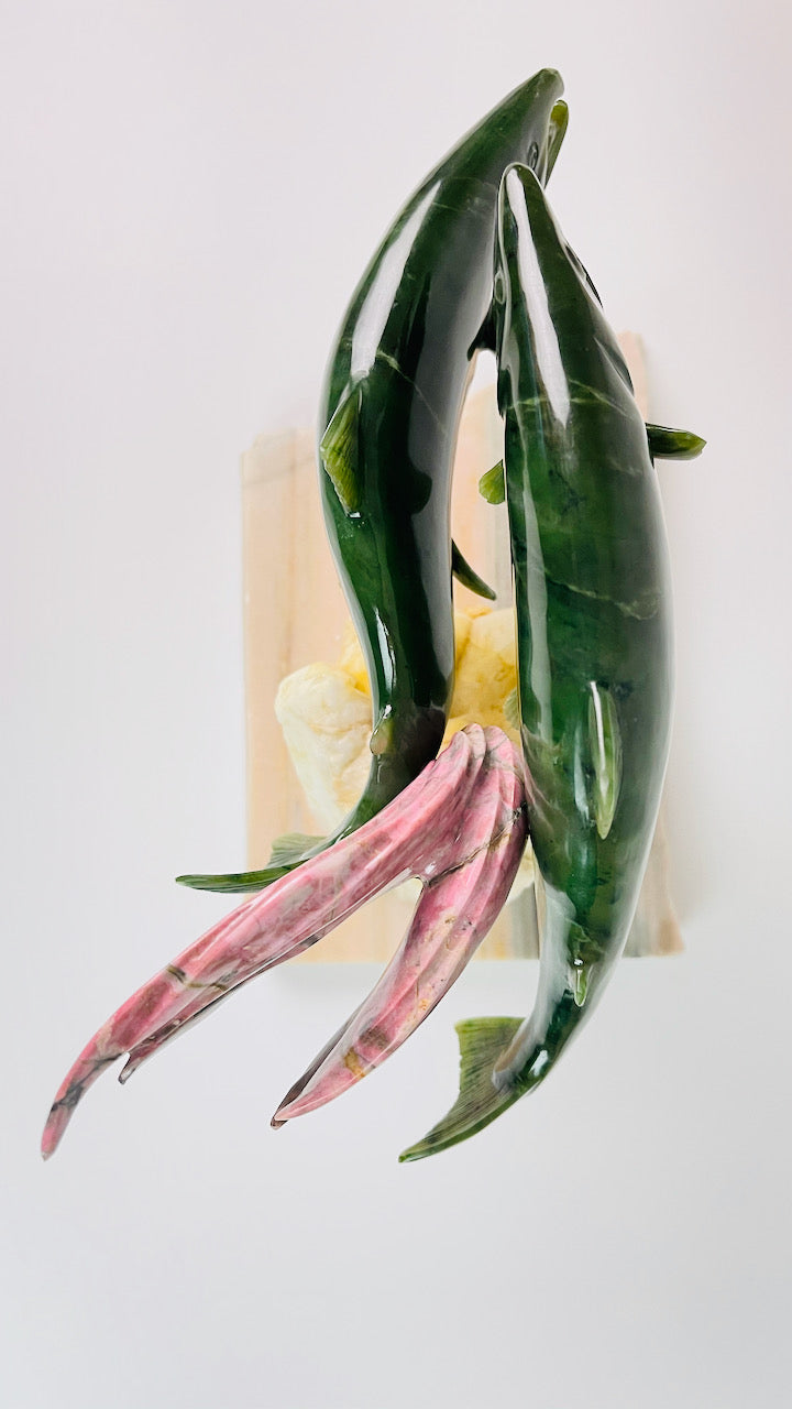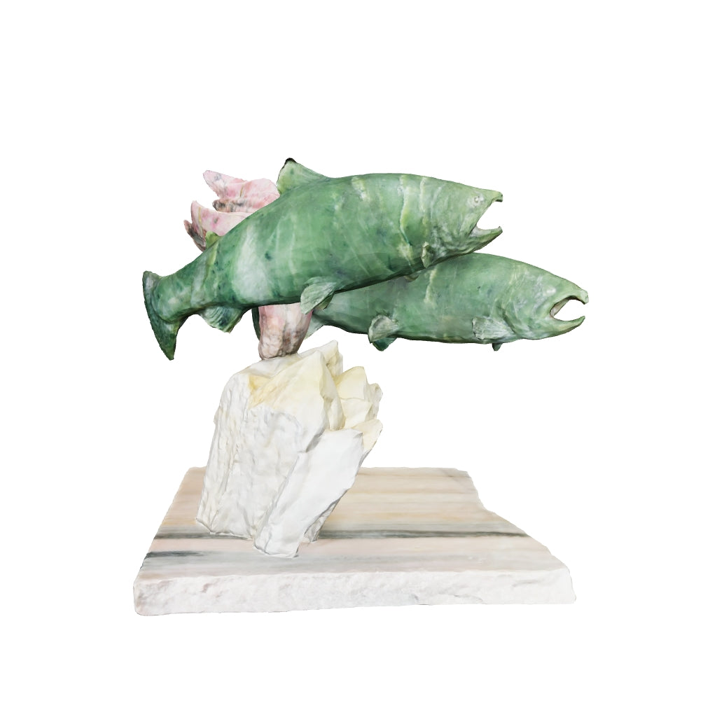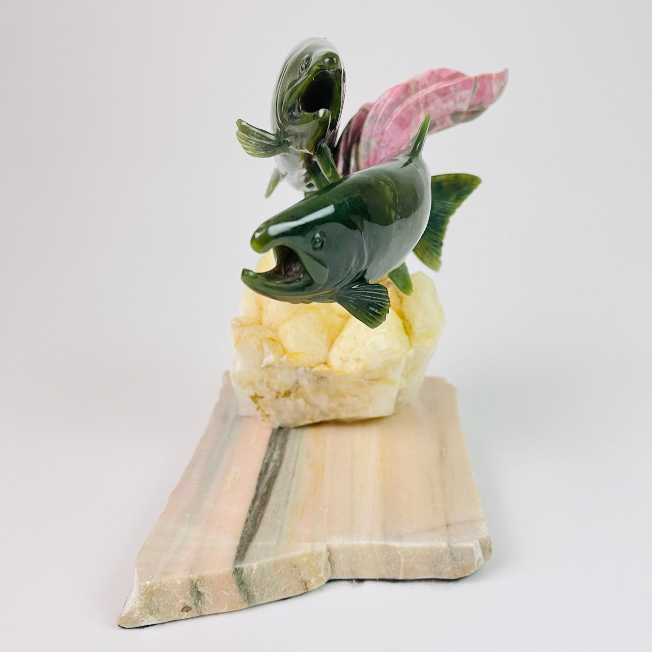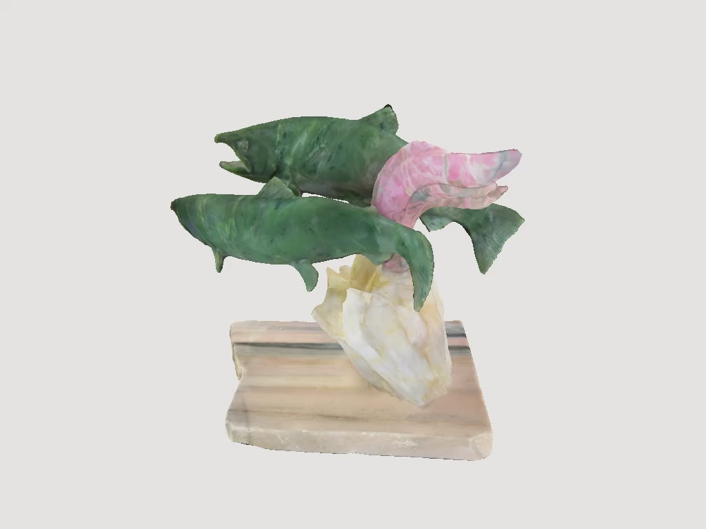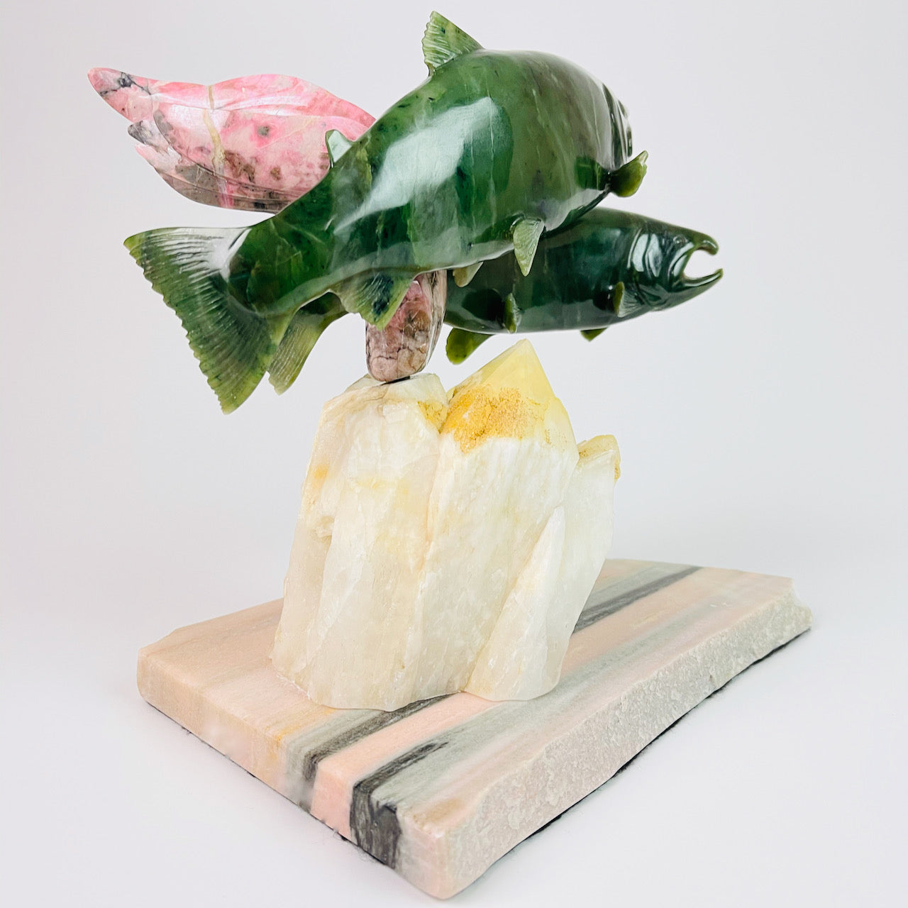 This vibrant sculpture showcases the dynamic interplay of BC Green Jade and BC Pink Rhodonite in the form of two salmon, their fluid motion captured in mid-leap. Standing 8 inches tall and weighing 7 pounds, the piece features the fish emerging from a striking citrine crystal, anchored by a pink marble base. The artist skillfully combines the deep green hues of the jade with the vivid pink of the rhodonite, enhancing the realism and vitality of the salmon. The use of citrine crystal not only adds a touch of elegance but also symbolizes the purity and clarity of the natural world. This piece, carved in British Columbia, pays homage to the region's rich aquatic life and geological diversity. In comparison to other sculptures in the gallery, this work stands out for its intricate use of multiple stones, each contributing to the overall harmony and beauty of the composition.