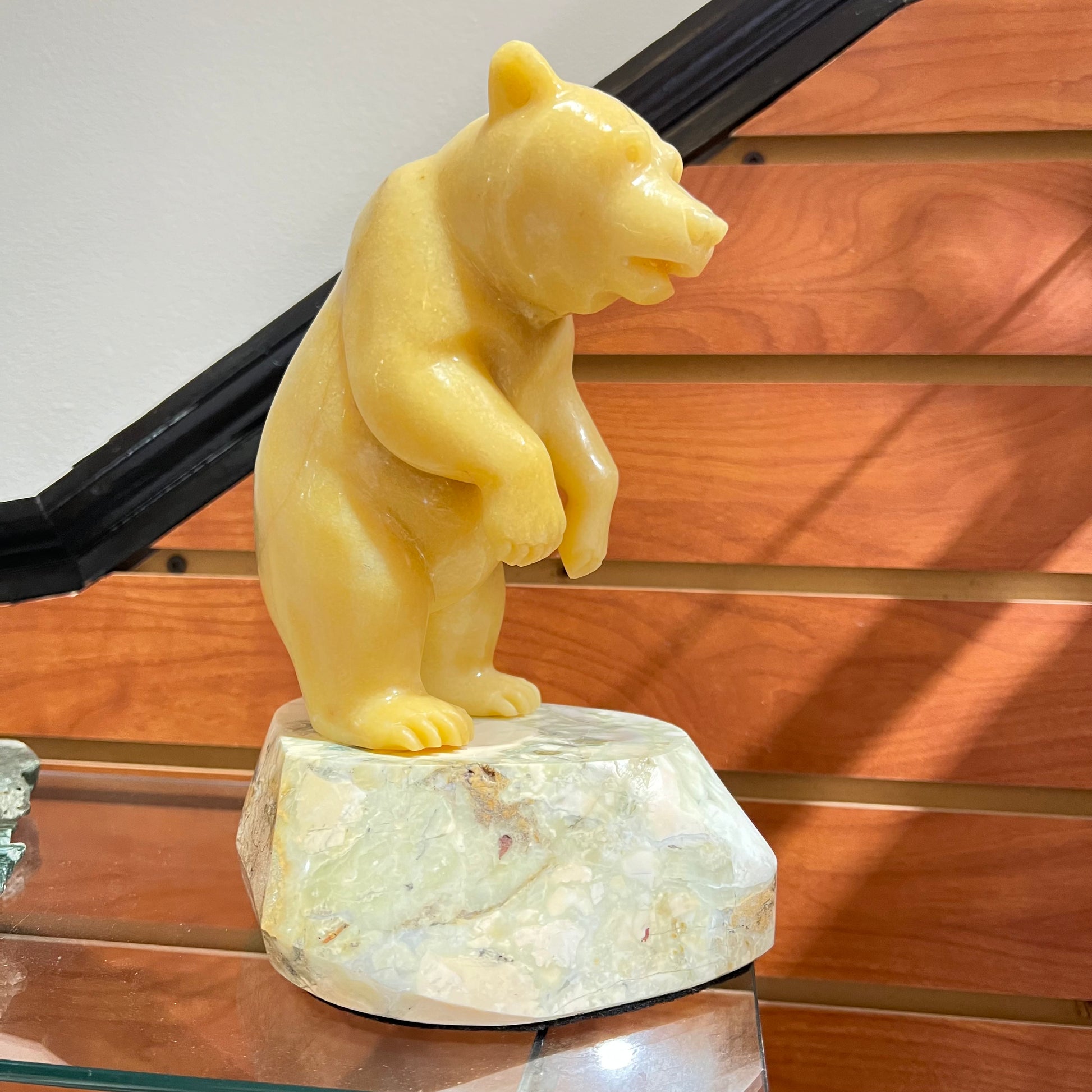 This adorable BC Golden Marlbe Grizzly is standing on a Lillooet Green Yalacomite base and has is standing up peering out to see into a river.