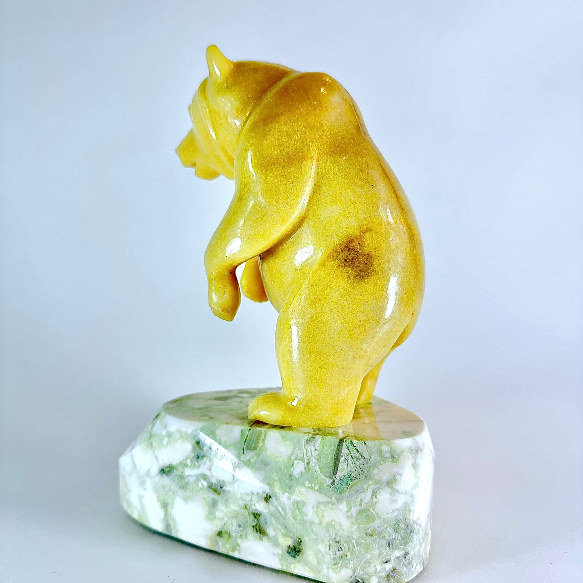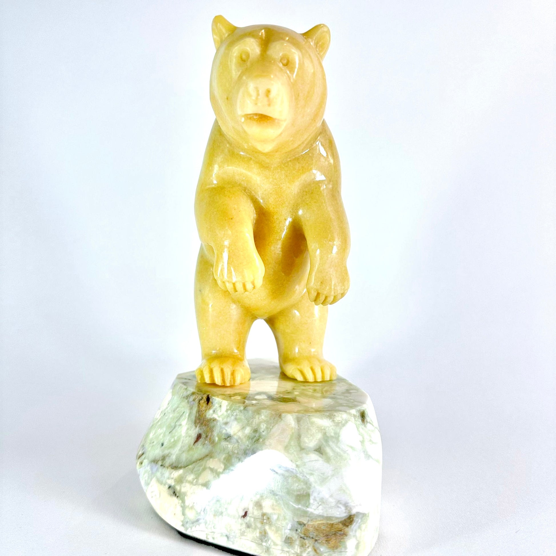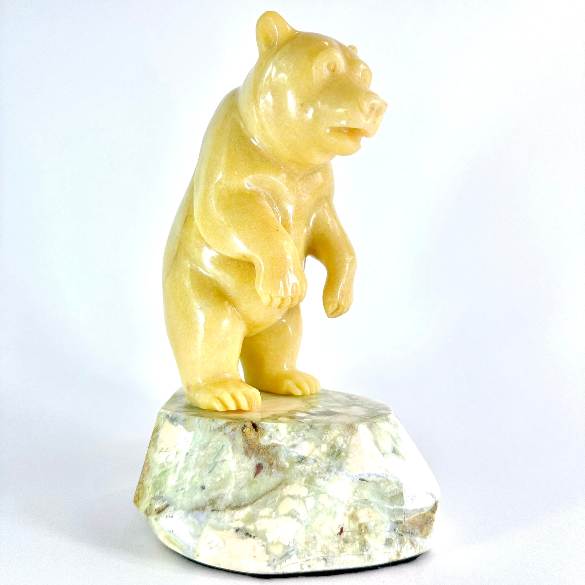 This smooth BC Golden Marble Grizzly is standing on a Lillooet Green Yalacomite base and has is standing up peering out to see into a river.