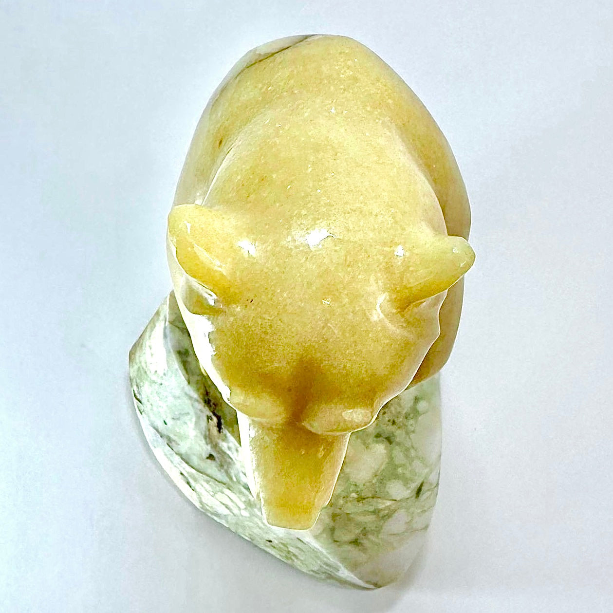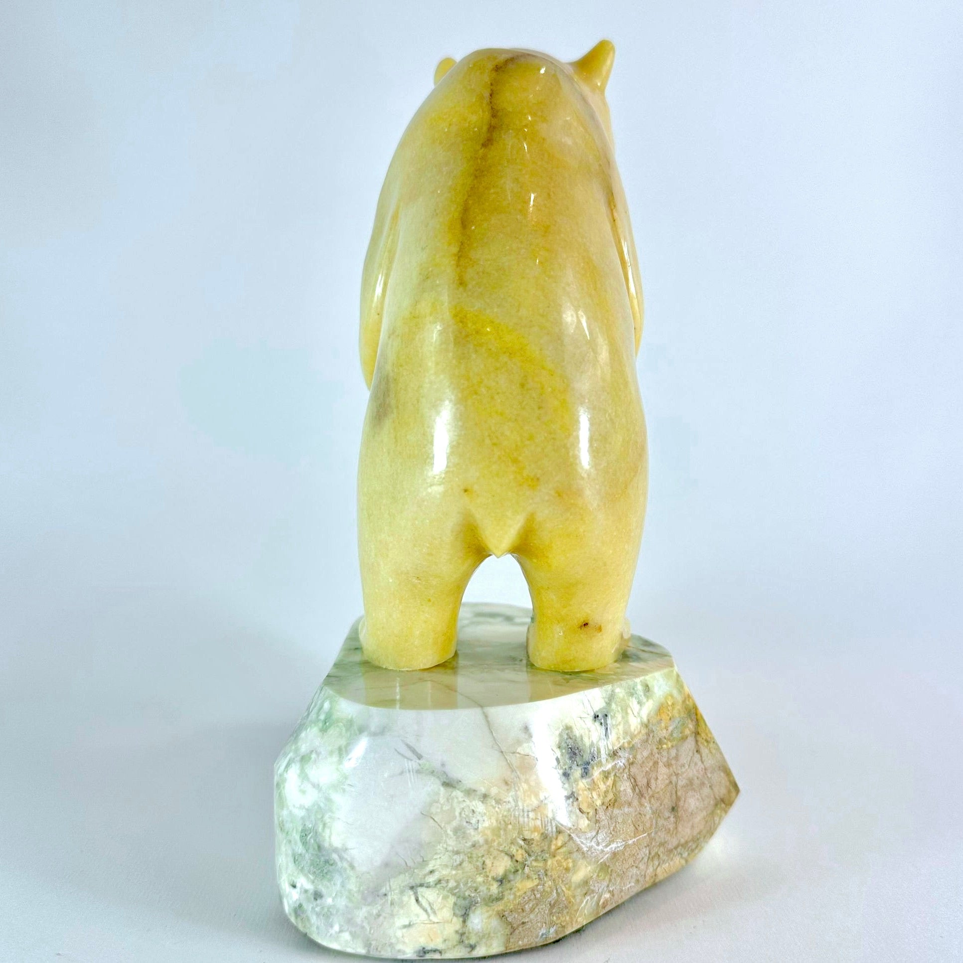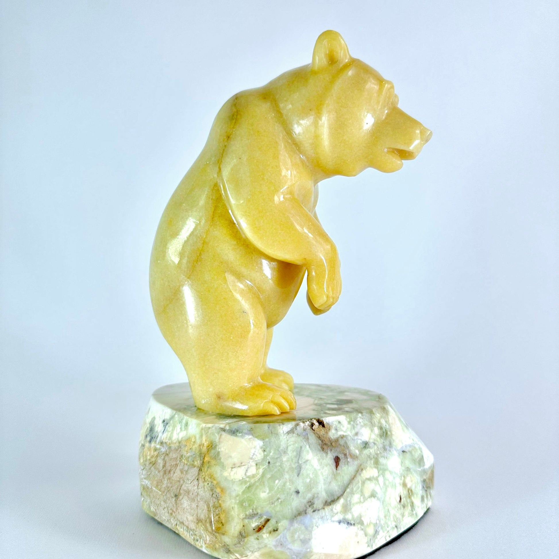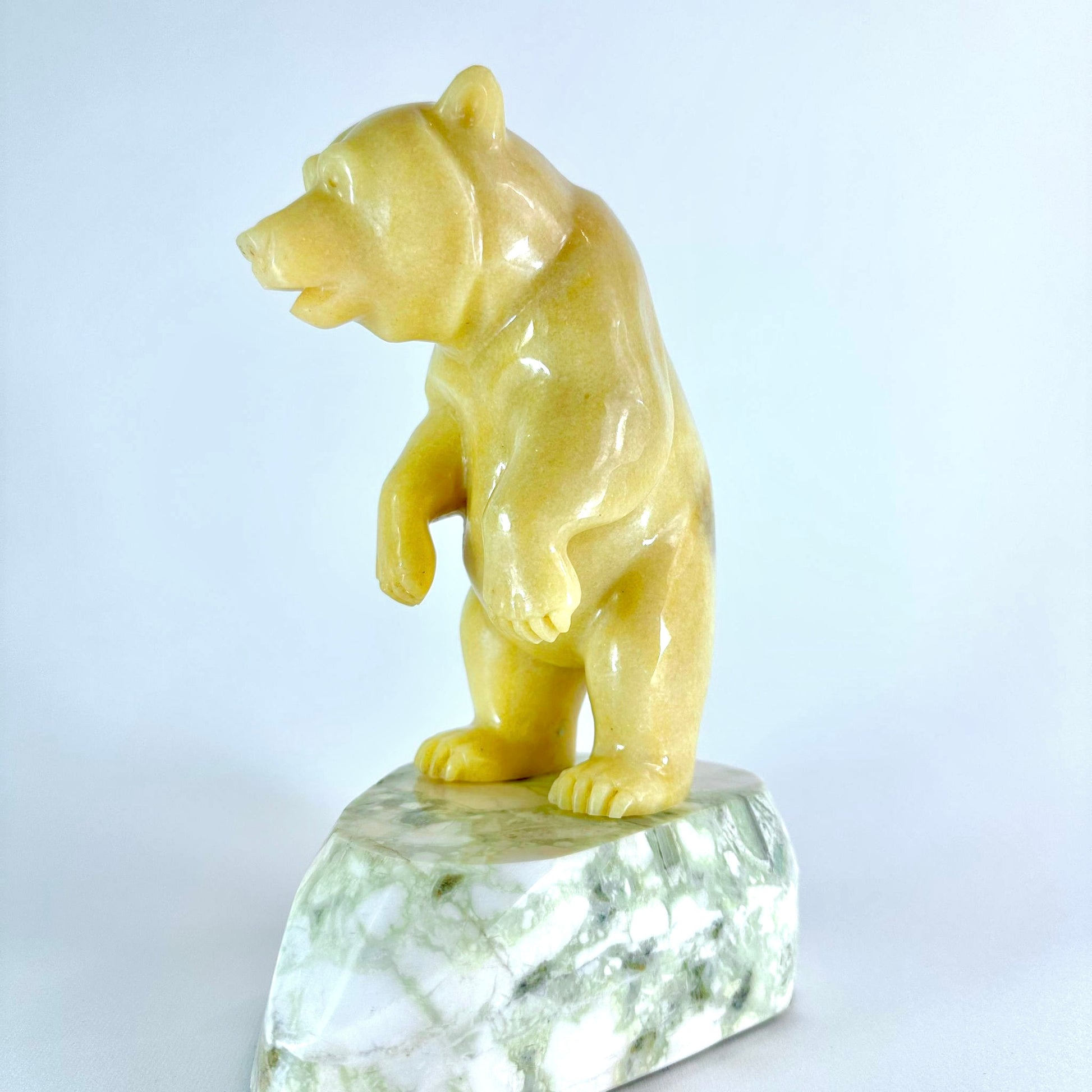 This smooth BC Golden Marble Grizzly is standing on a Lillooet Green Yalacomite base and has is standing up peering out to see into a river.