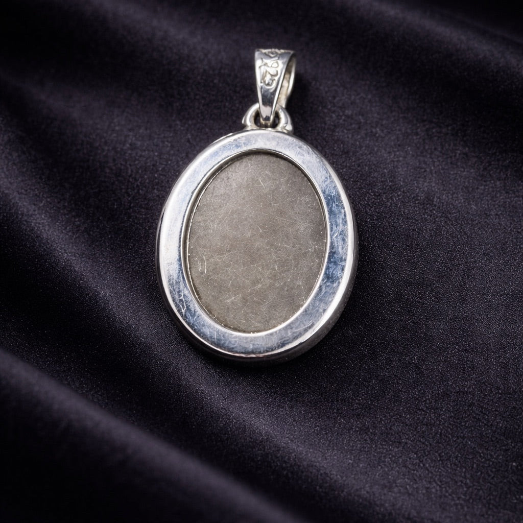 This pendant features a natural ammolite stone with layered tones of green, amber, and subtle red, revealing its organic pattern beneath a smooth polished surface. Set in a simple sterling silver bezel, the design allows the stone’s natural variation to remain the focal point. Thoughtfully made and one of a kind, this piece offers a bold sense of depth and character.