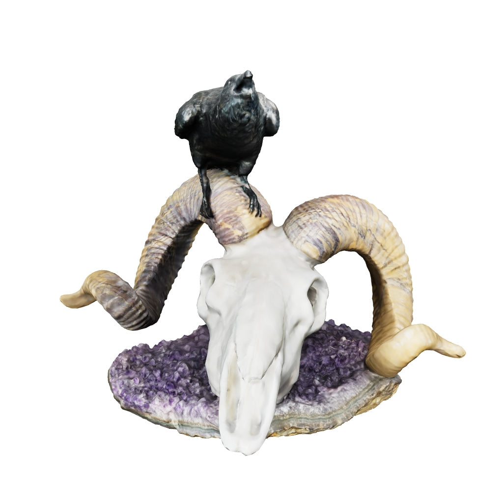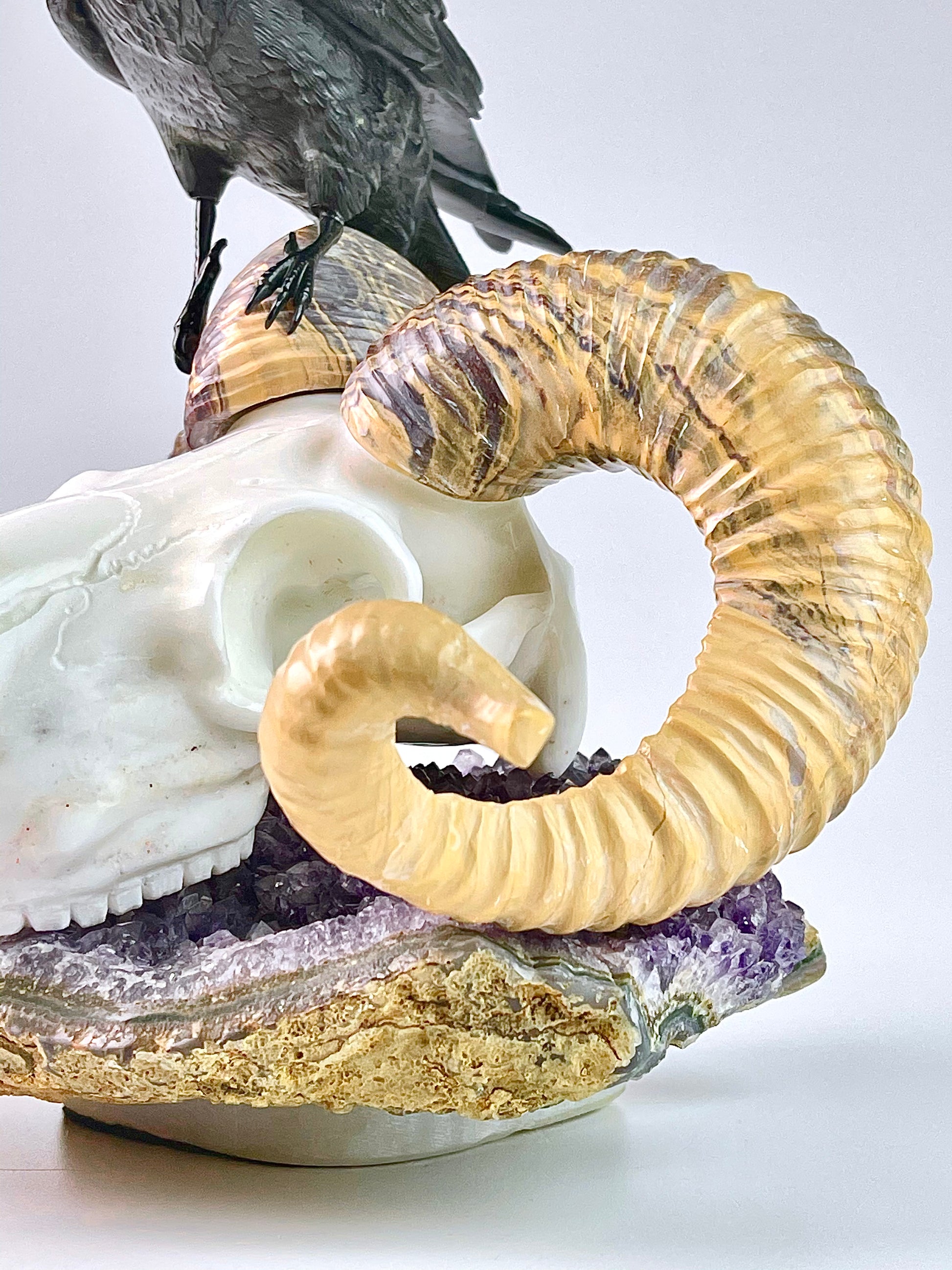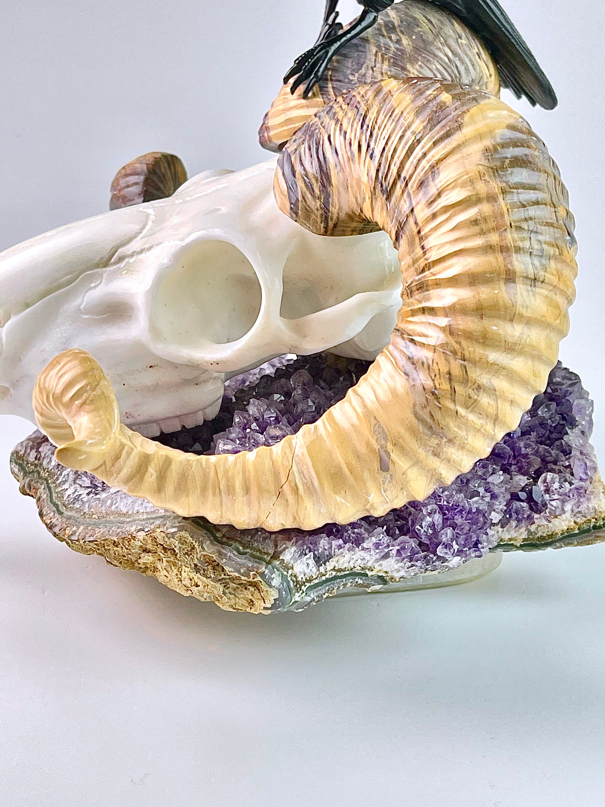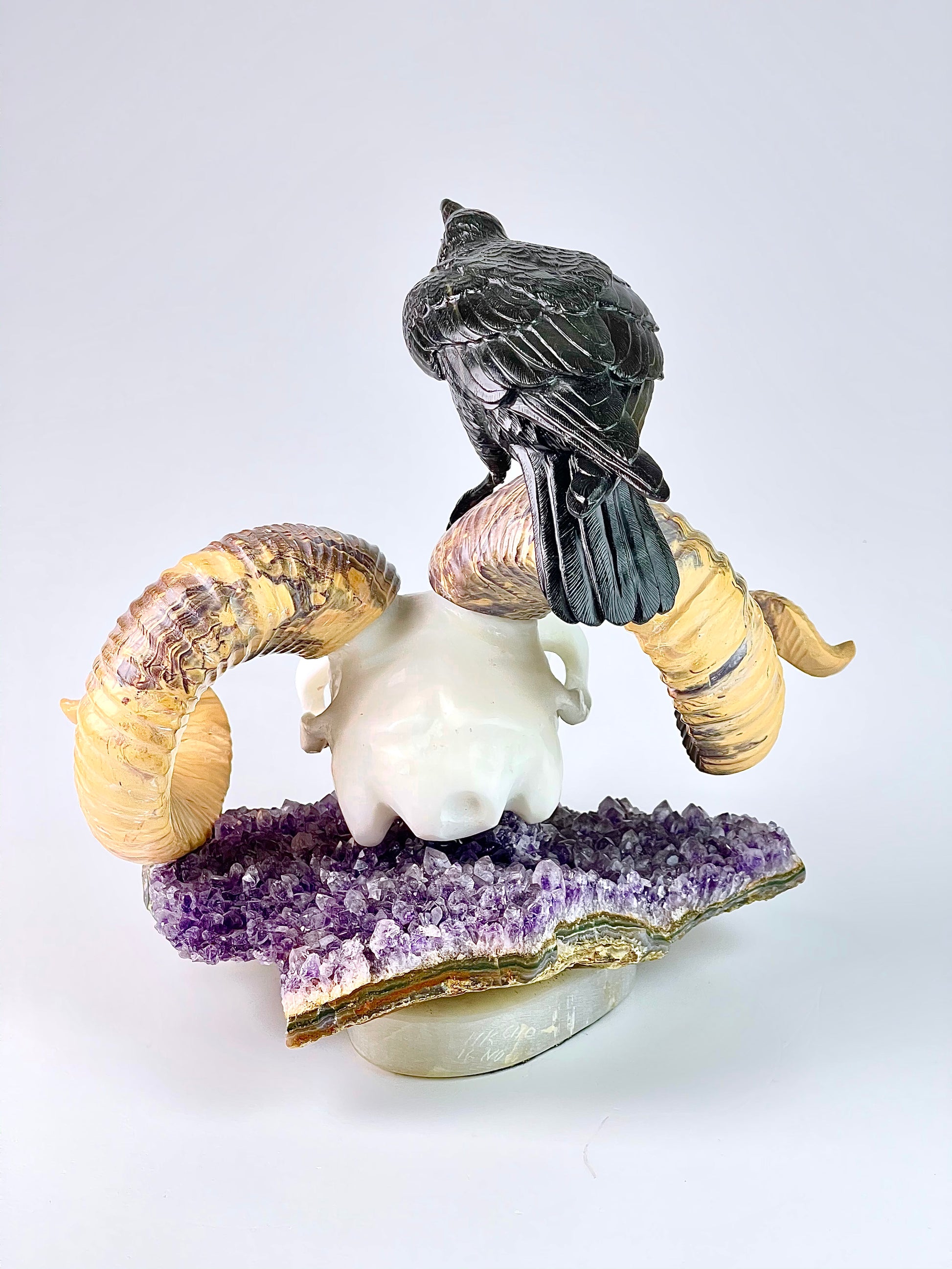This striking sculpture, titled "Crow," intricately combines various stones to create a vivid tableau. The raven, sculpted from black jade, stands atop a ram's skull carved from pristine white marble, its open beak suggesting a moment of vocal expression. The ram's horns, made from pyrophyllite, exhibit a rich, translucent texture that adds depth and realism. The entire composition is anchored on a base of raw amethyst crystals, their vibrant purple hues providing a striking contrast and a mystical foundation. Measuring 12 inches by 10 inches by 11 inches and weighing 14 pounds (6 kg), this piece is a testament to the artist's craftsmanship and ability to evoke themes of life, death, and transformation. Created in British Columbia, Canada, this sculpture masterfully blends realism with symbolic depth, showcasing the natural beauty of each stone used.