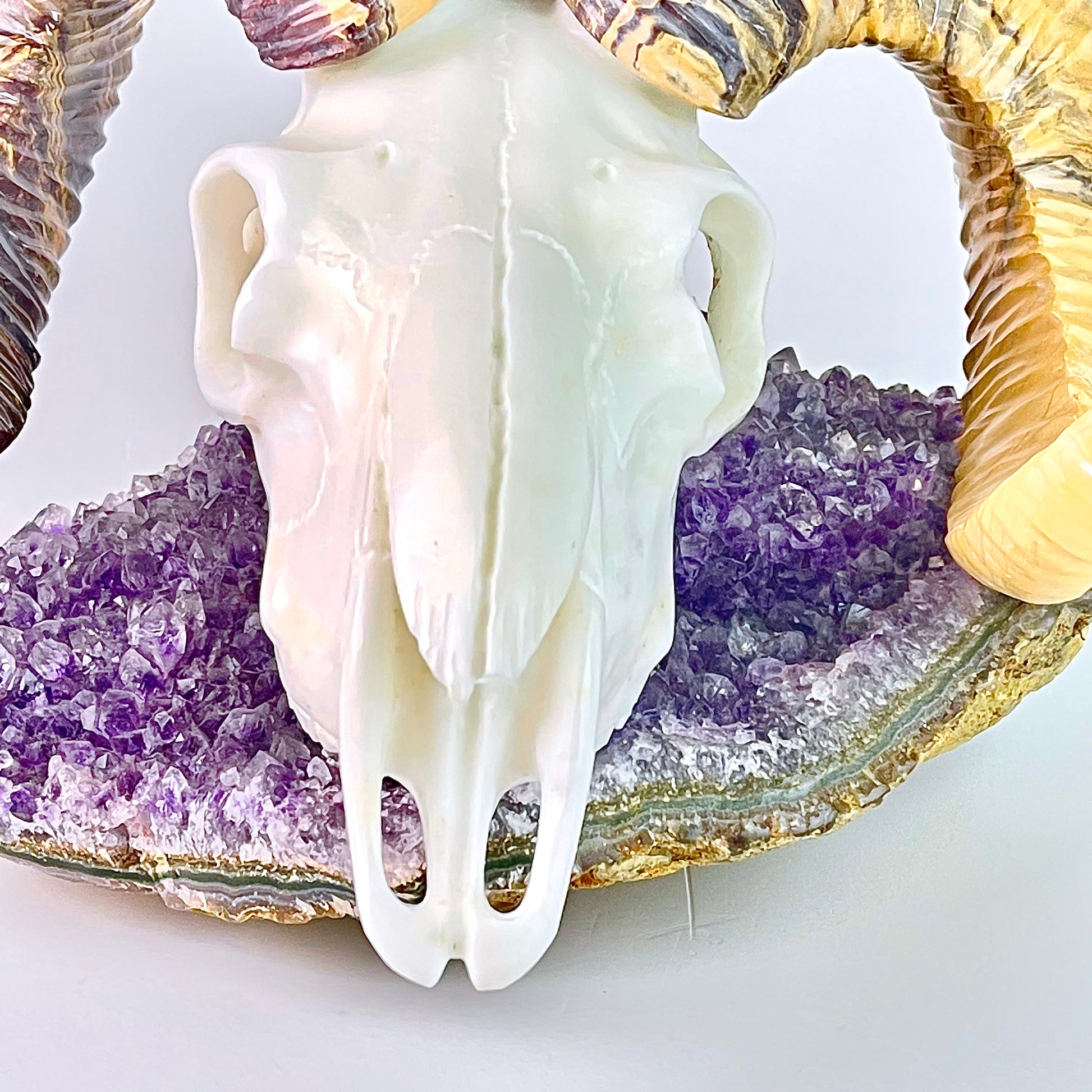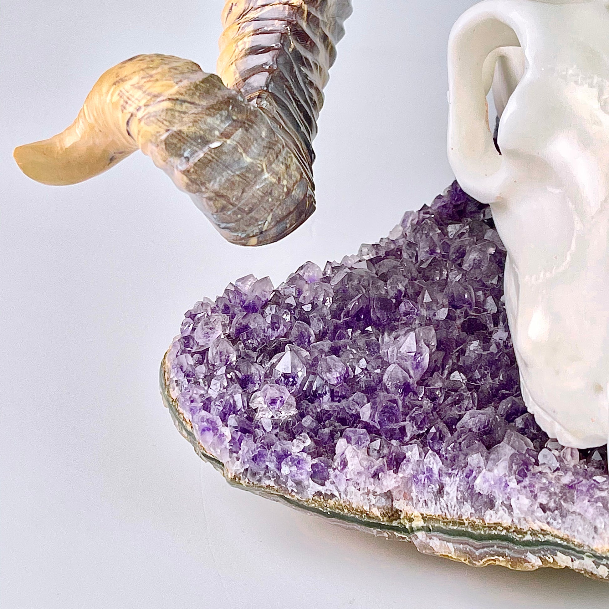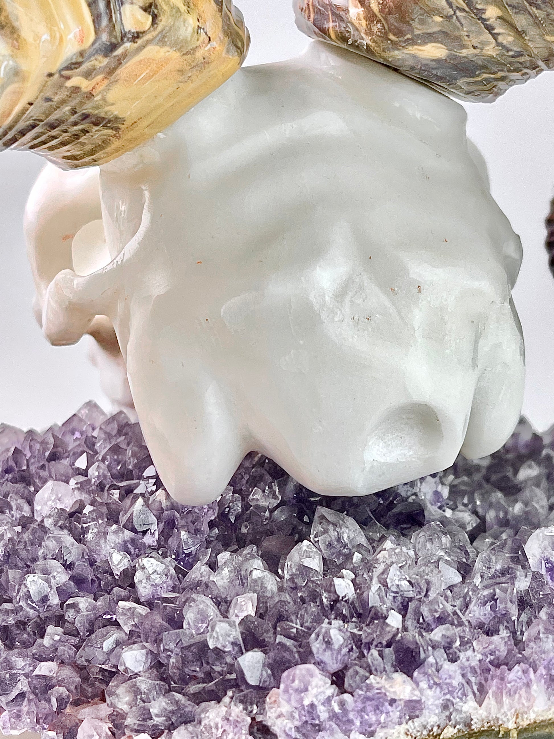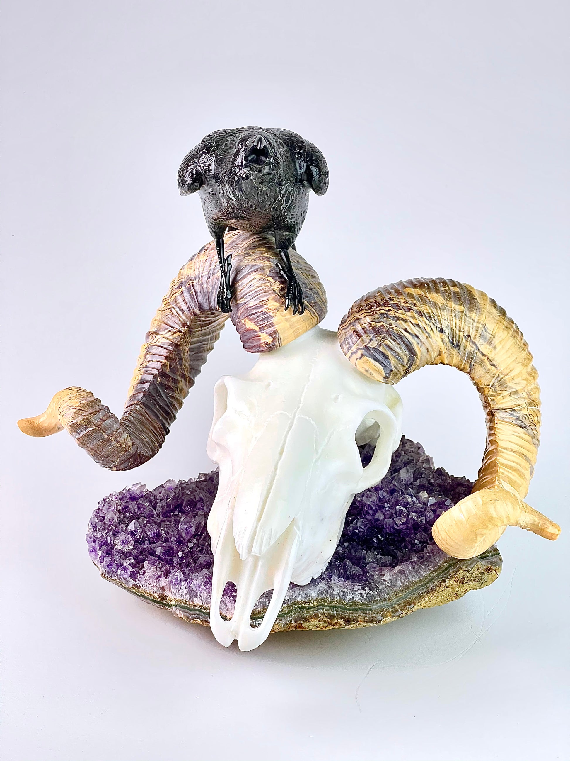 This striking sculpture, titled "Crow," intricately combines various stones to create a vivid tableau. The raven, sculpted from black jade, stands atop a ram's skull carved from pristine white marble, its open beak suggesting a moment of vocal expression. The ram's horns, made from pyrophyllite, exhibit a rich, translucent texture that adds depth and realism. The entire composition is anchored on a base of raw amethyst crystals, their vibrant purple hues providing a striking contrast and a mystical foundation. Measuring 12 inches by 10 inches by 11 inches and weighing 14 pounds (6 kg), this piece is a testament to the artist's craftsmanship and ability to evoke themes of life, death, and transformation. Created in British Columbia, Canada, this sculpture masterfully blends realism with symbolic depth, showcasing the natural beauty of each stone used.