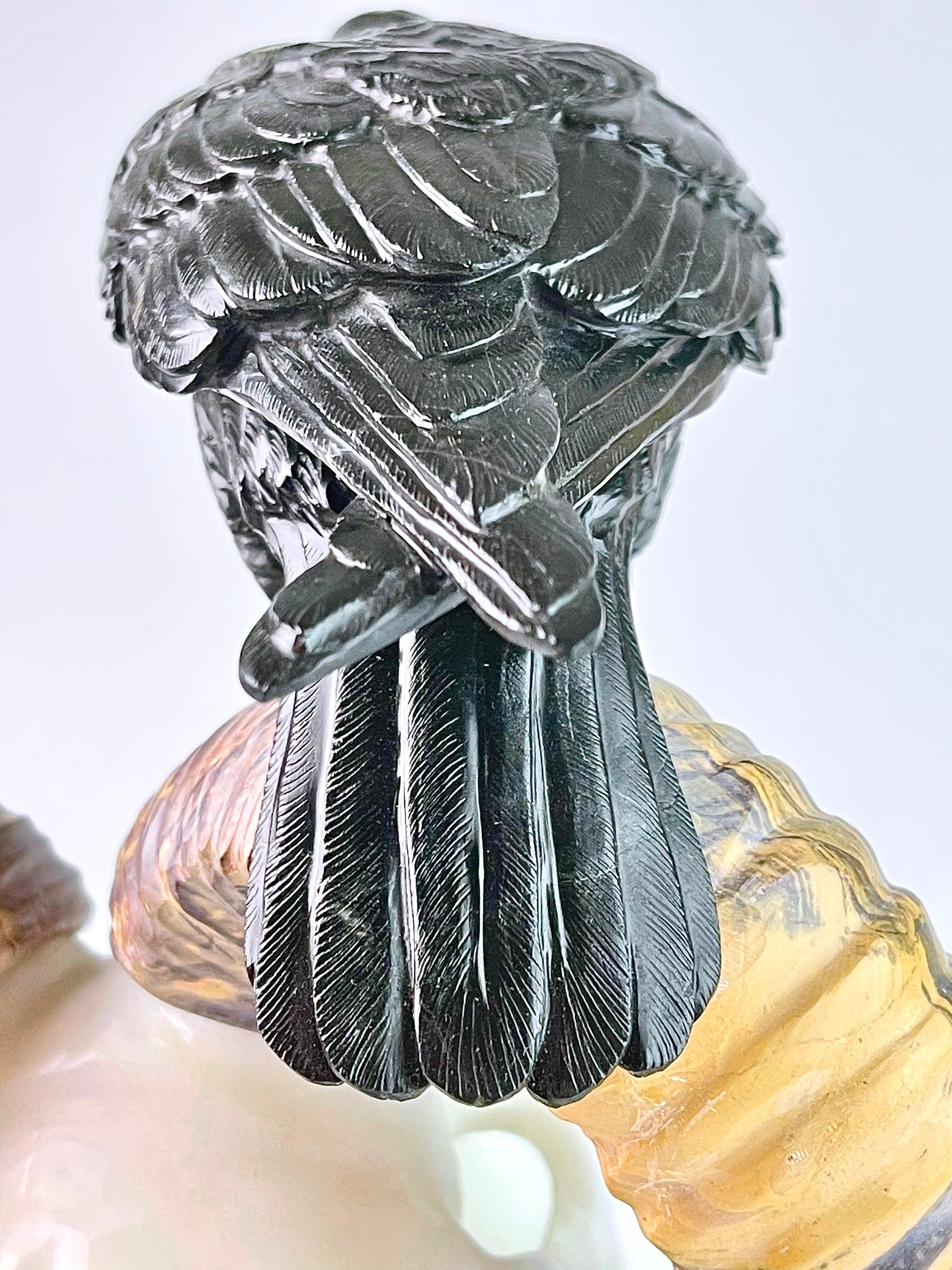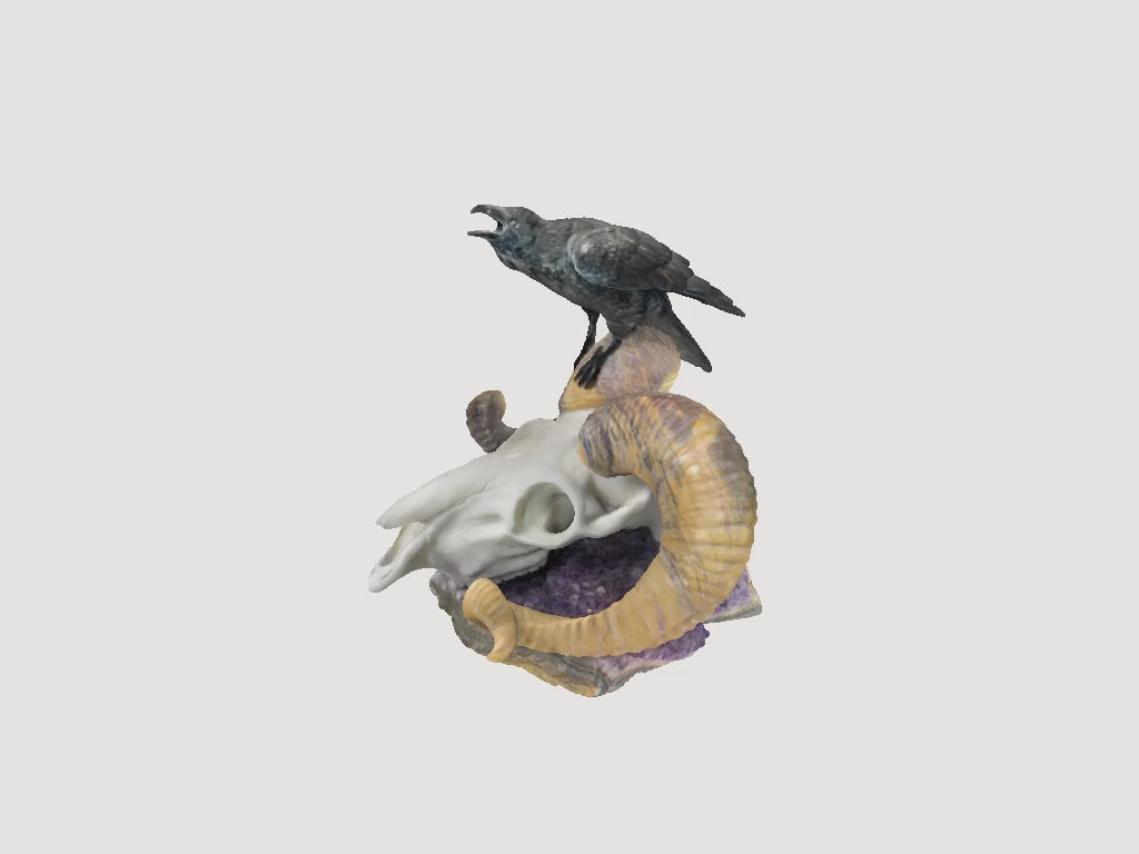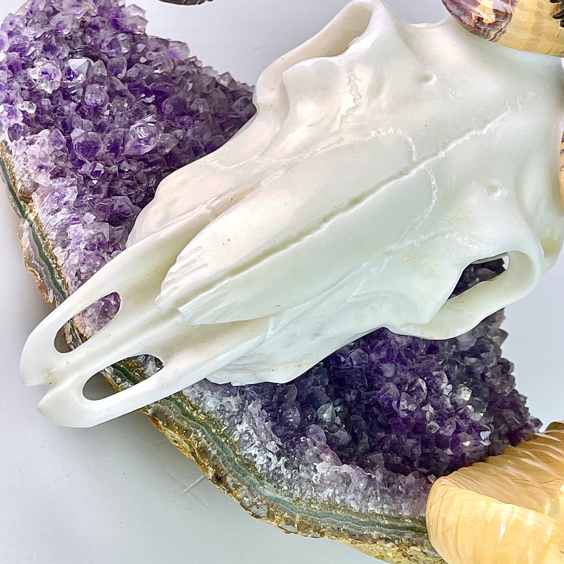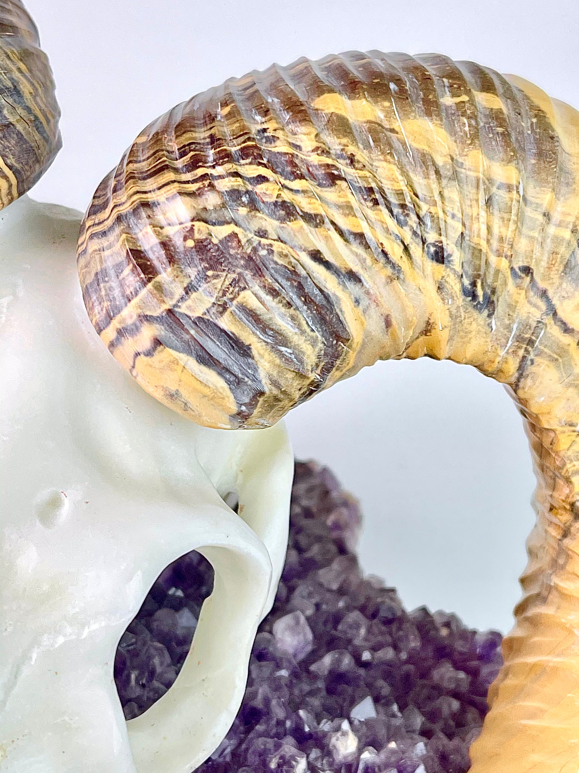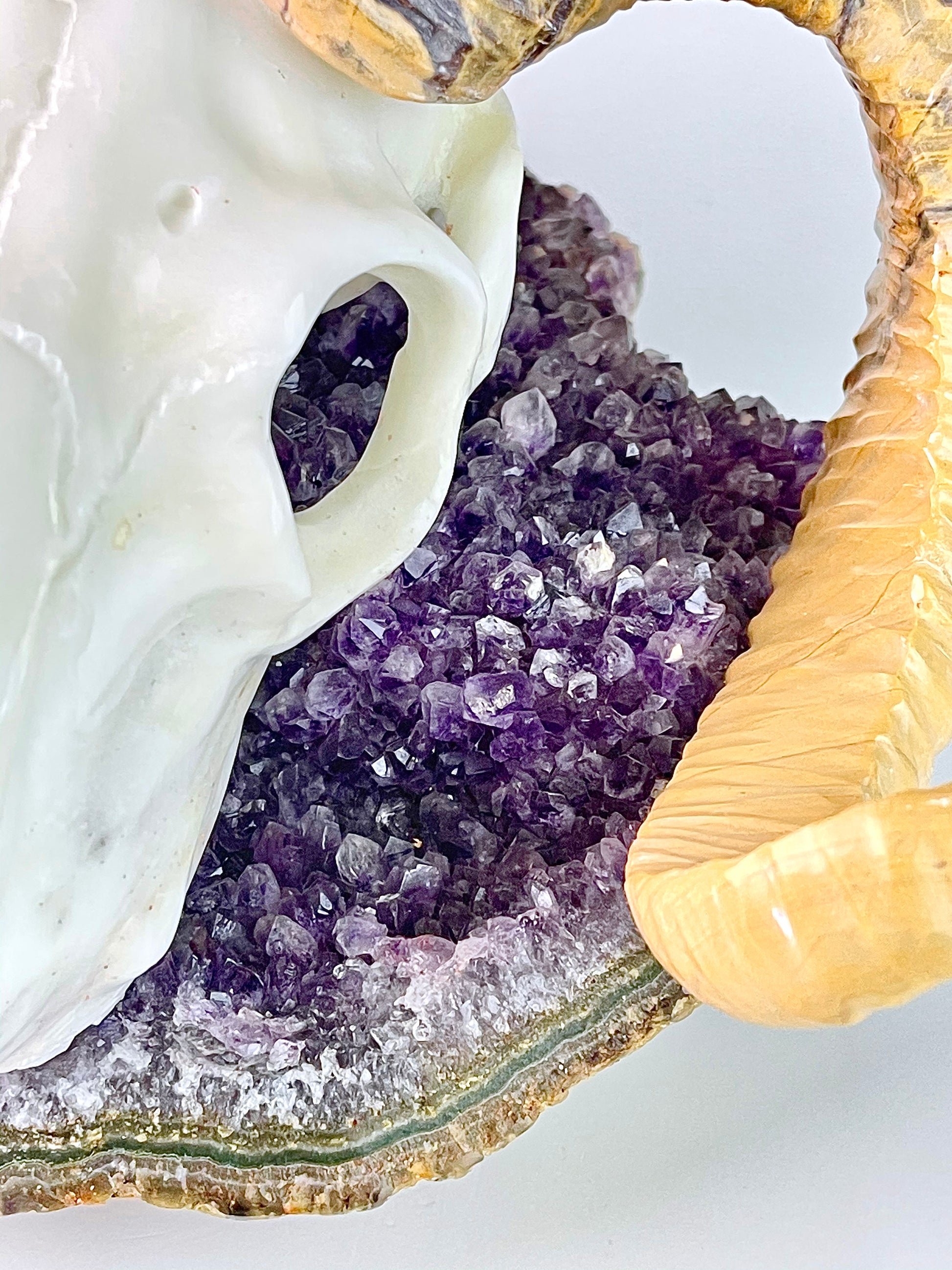This striking sculpture, titled "Crow," intricately combines various stones to create a vivid tableau. The raven, sculpted from black jade, stands atop a ram's skull carved from pristine white marble, its open beak suggesting a moment of vocal expression. The ram's horns, made from pyrophyllite, exhibit a rich, translucent texture that adds depth and realism. The entire composition is anchored on a base of raw amethyst crystals, their vibrant purple hues providing a striking contrast and a mystical foundation. Measuring 12 inches by 10 inches by 11 inches and weighing 14 pounds (6 kg), this piece is a testament to the artist's craftsmanship and ability to evoke themes of life, death, and transformation. Created in British Columbia, Canada, this sculpture masterfully blends realism with symbolic depth, showcasing the natural beauty of each stone used.
