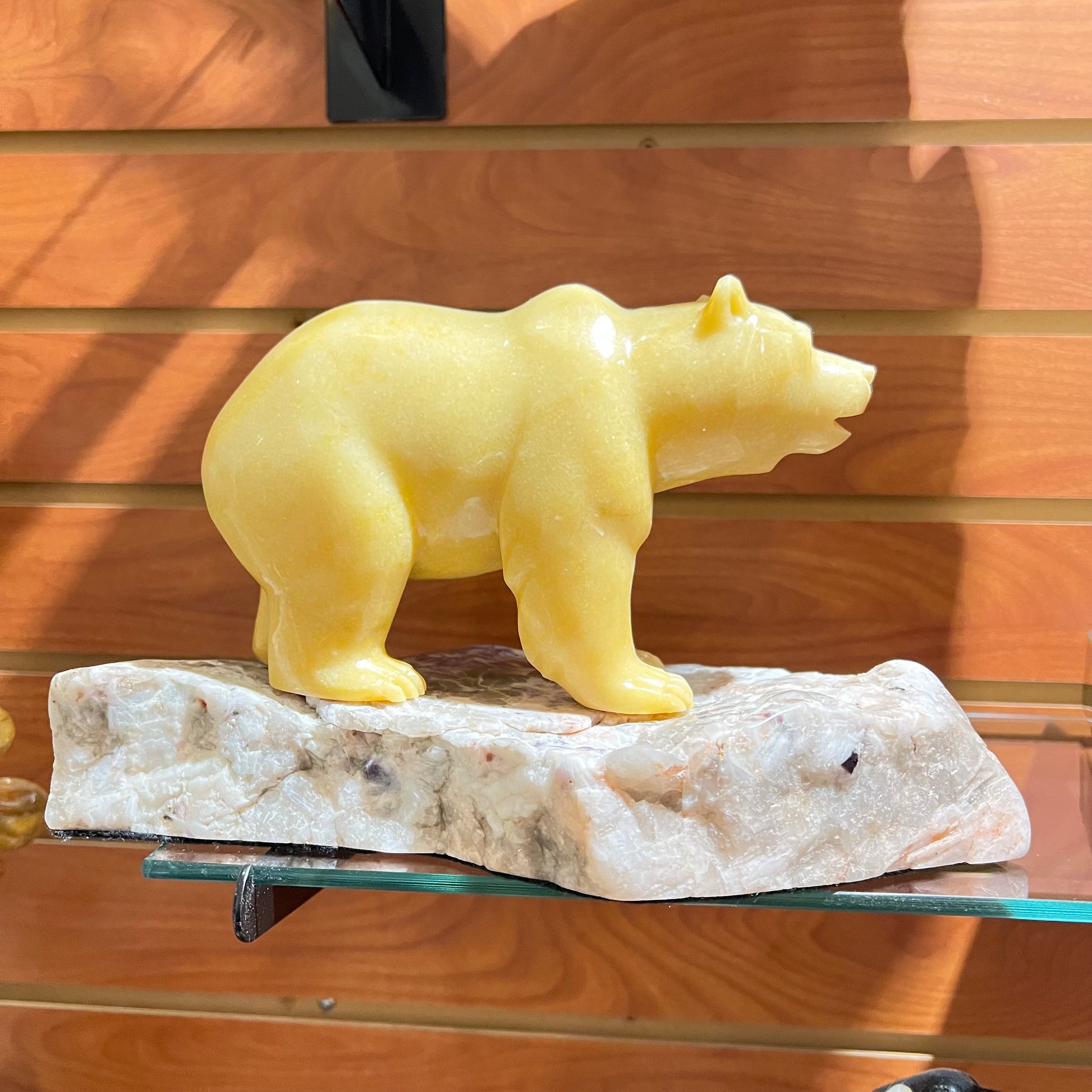 This adorable BC Golden Marlbe Grizzly is standing on a Canadian Purple Quartz base and has is strolling along the rocky shores of BC's beautiful coastline.