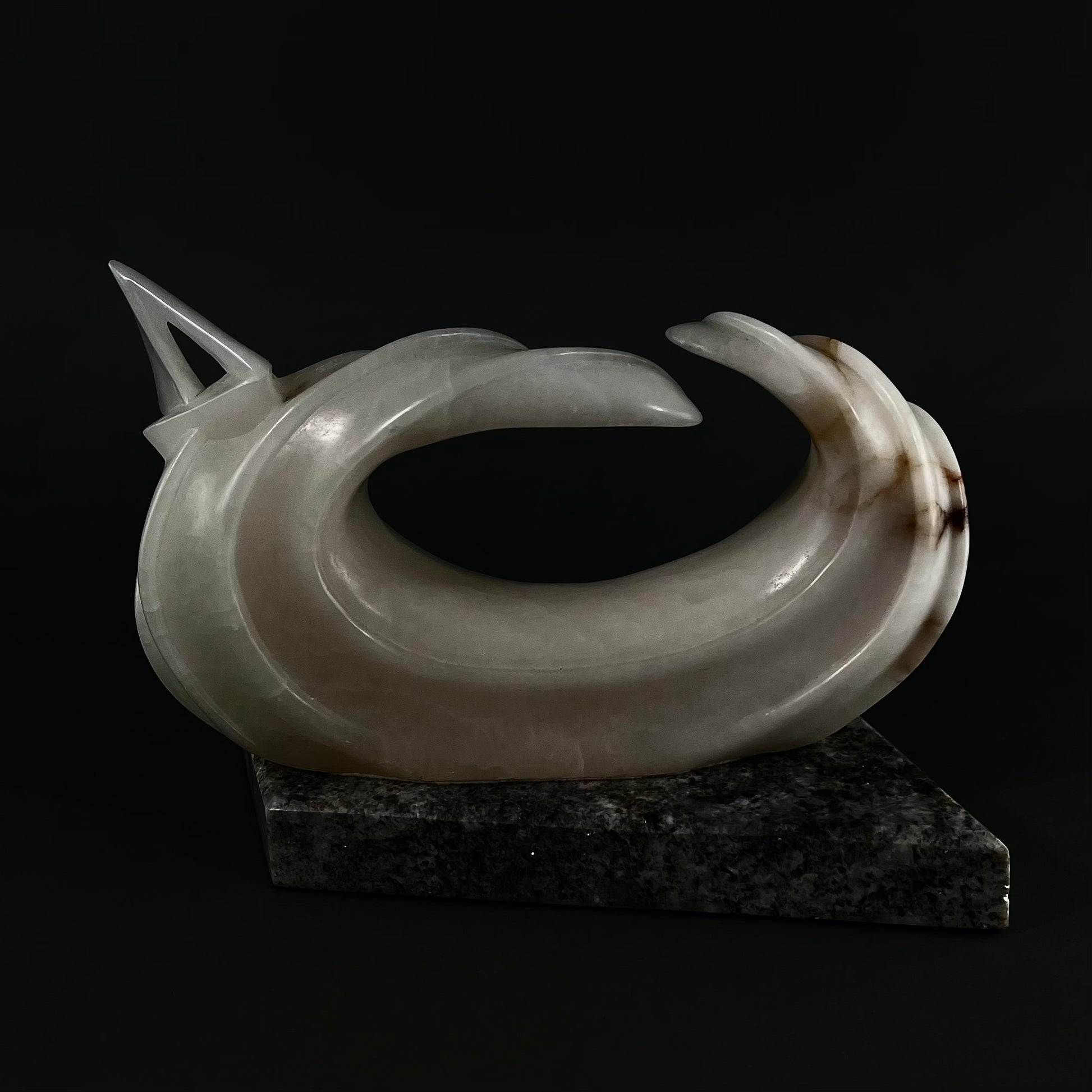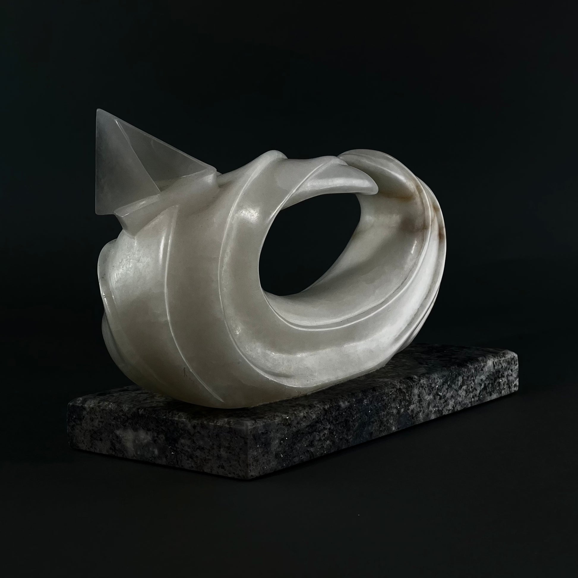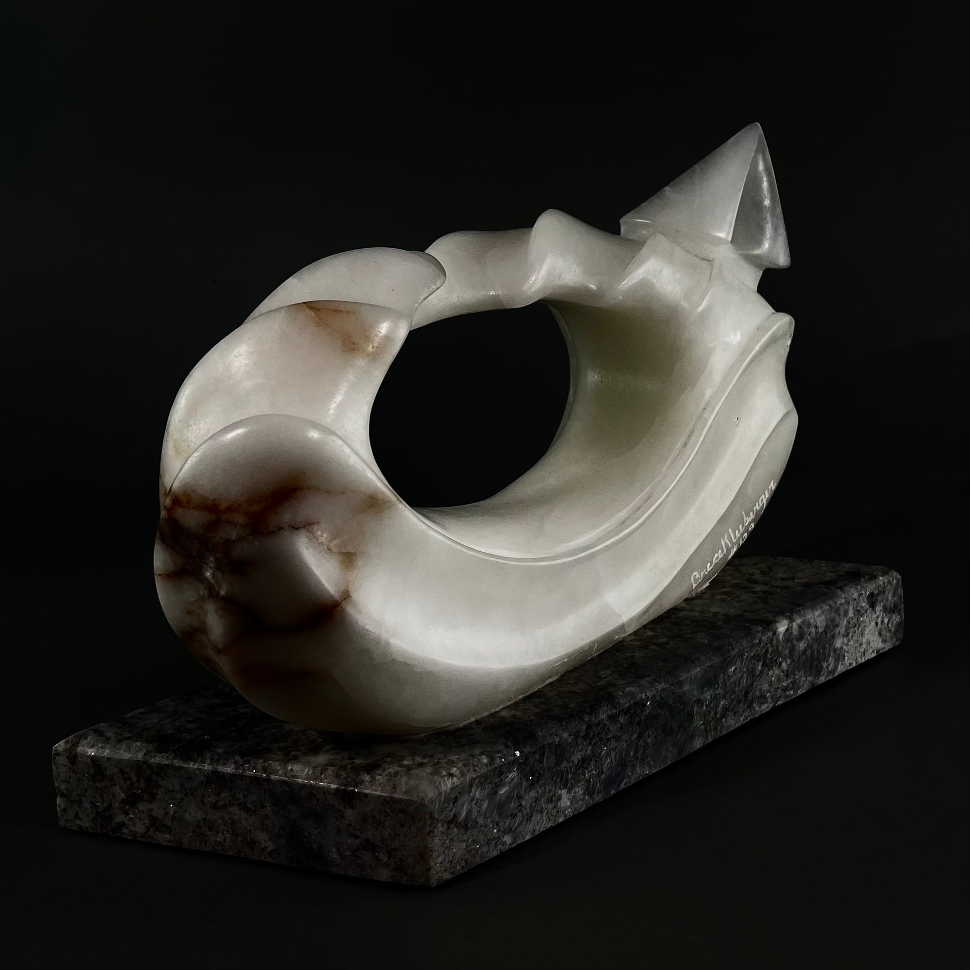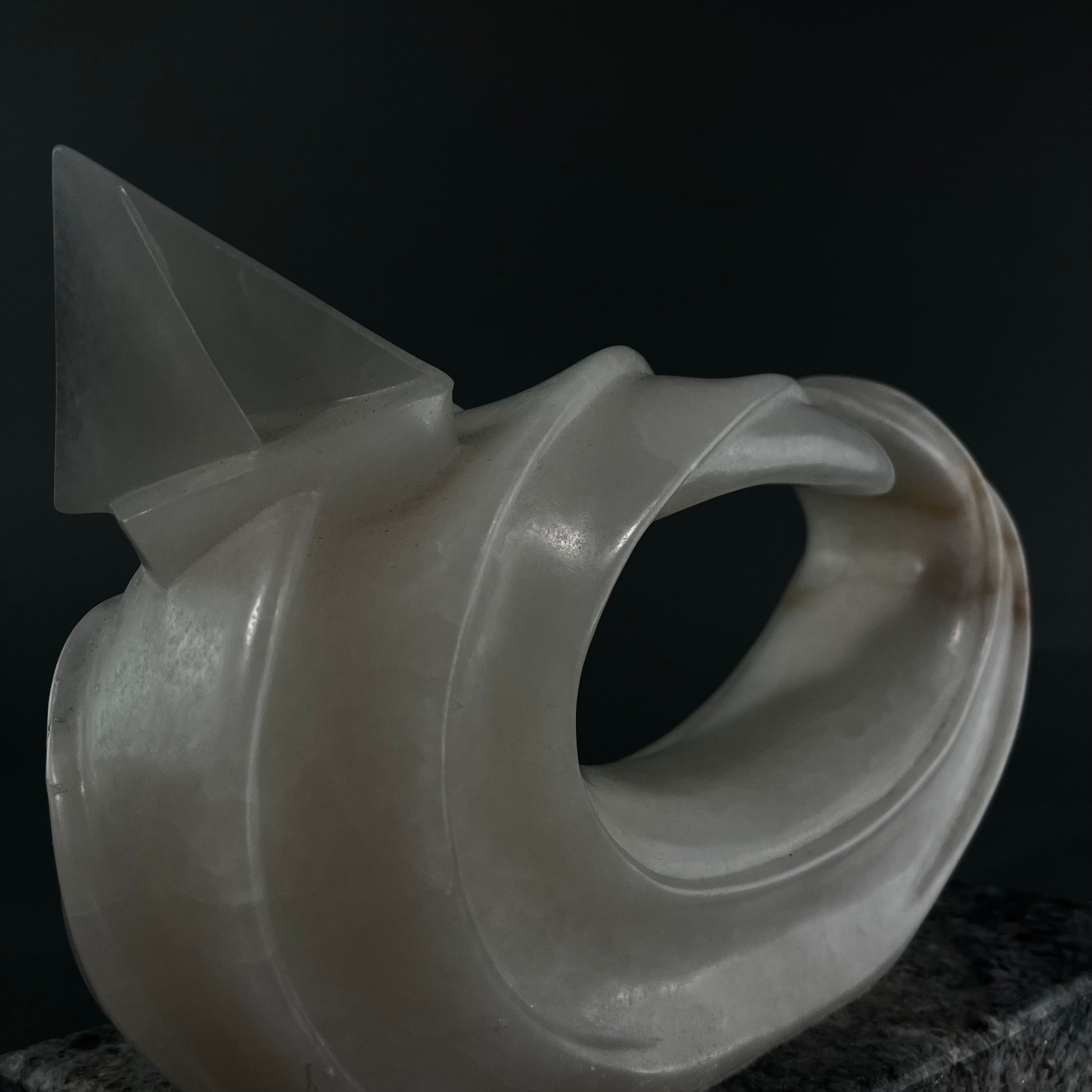 "Sailing Waveform" is an elegant and abstract sculpture crafted from alabaster, set on a sturdy marble base. The alabaster's translucent quality is beautifully showcased in the fluid, wave-like design, evoking the motion and grace of a sailing vessel navigating through water. The dynamic curves and hollow center suggest movement and continuity, capturing the essence of a wave's perpetual flow.