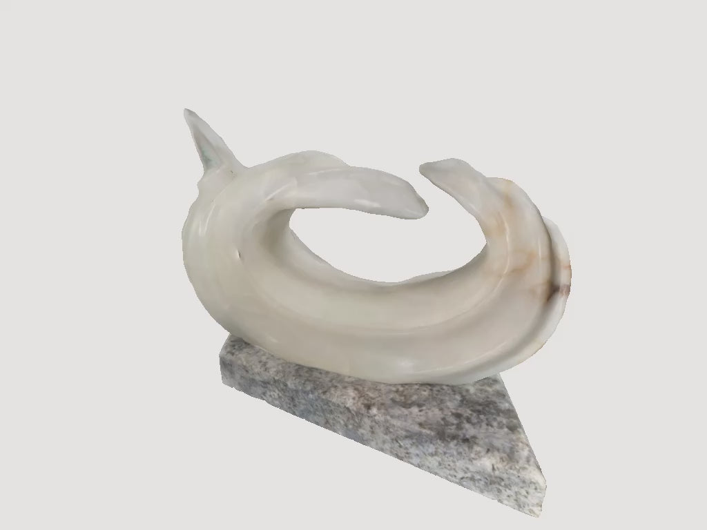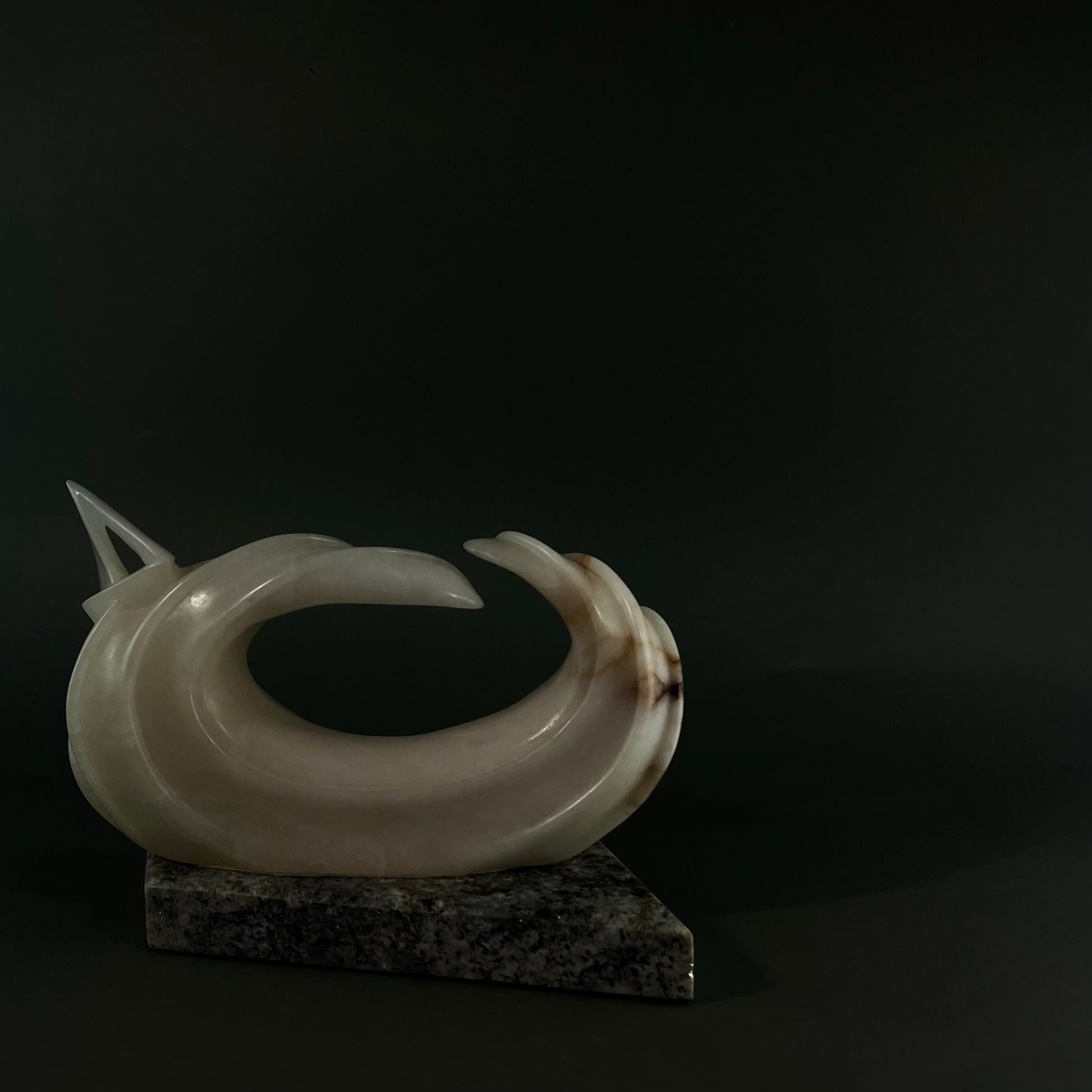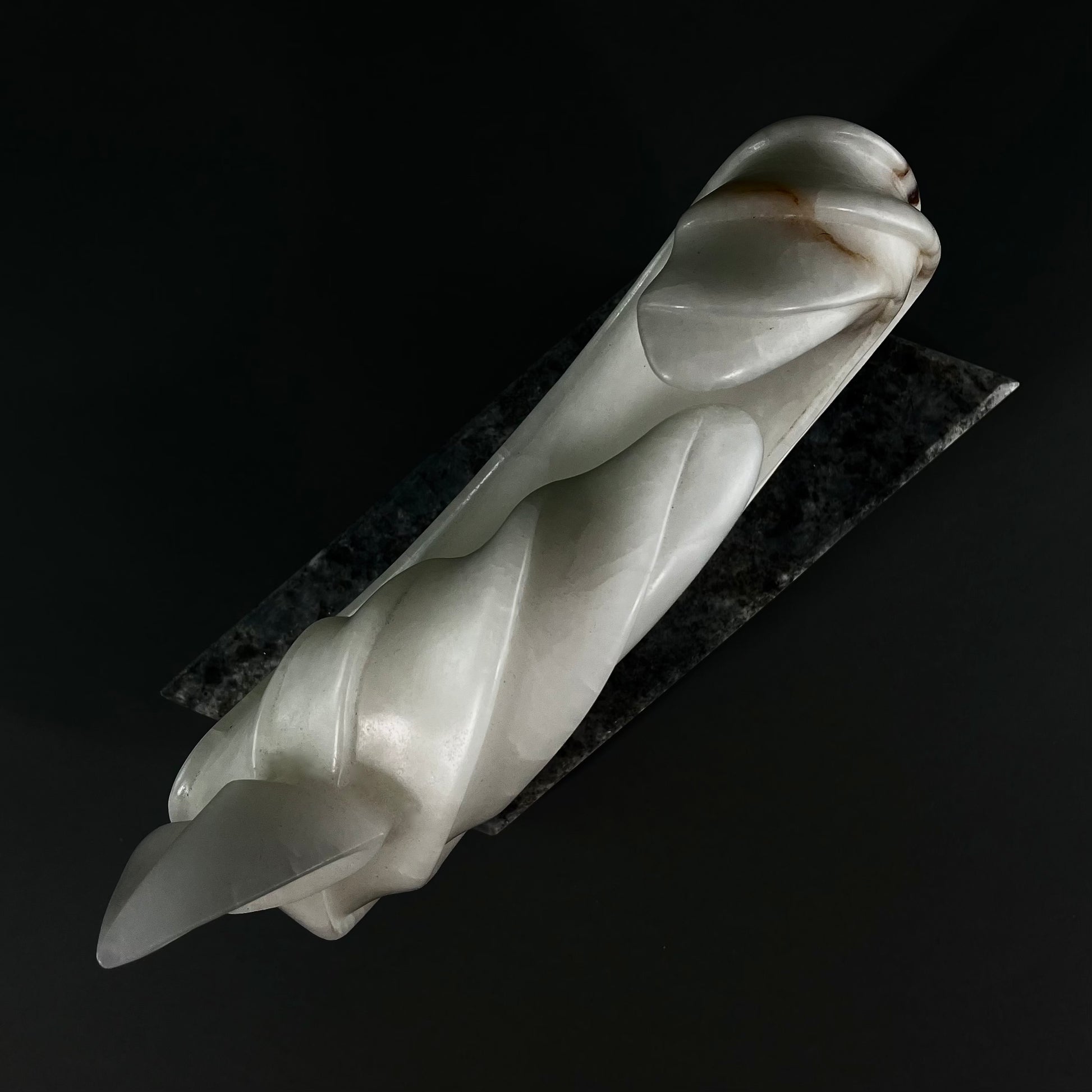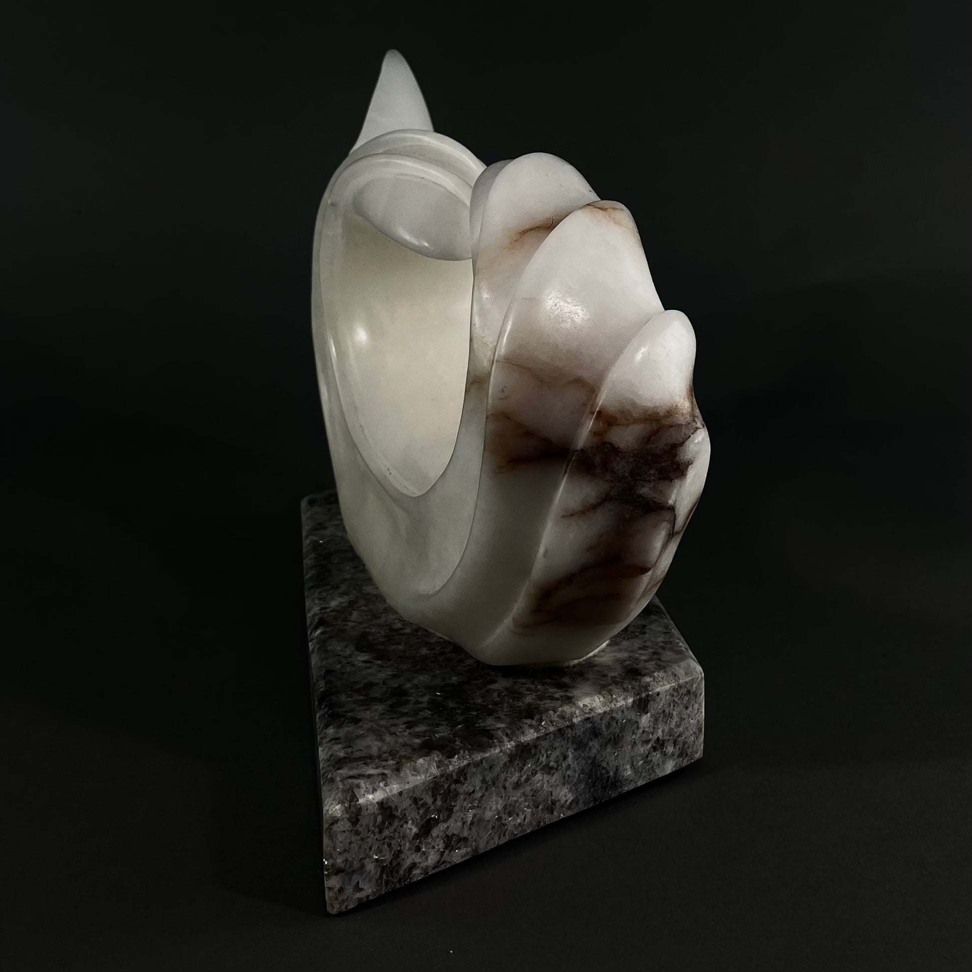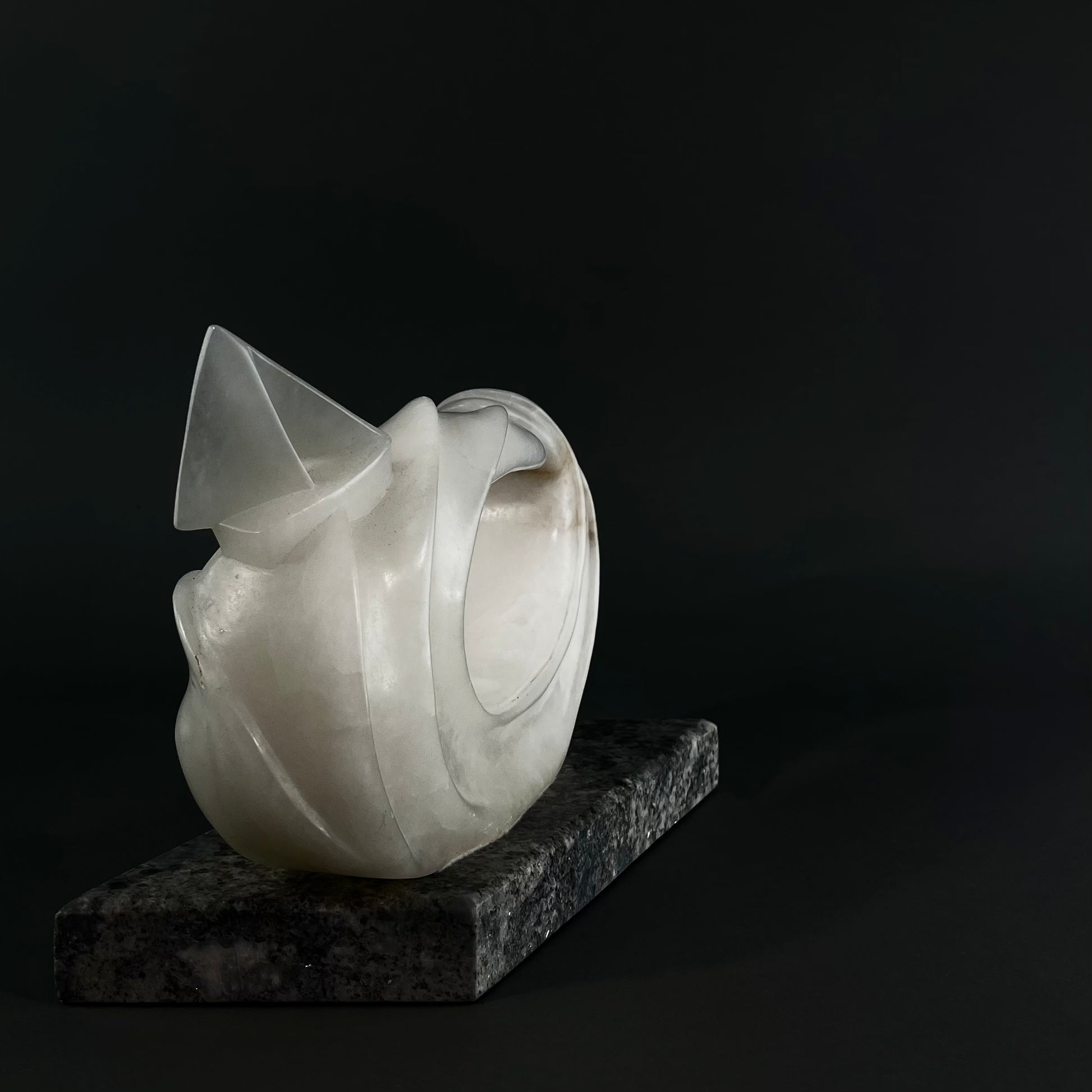 "Sailing Waveform" is an elegant and abstract sculpture crafted from alabaster, set on a sturdy marble base. The alabaster's translucent quality is beautifully showcased in the fluid, wave-like design, evoking the motion and grace of a sailing vessel navigating through water. The dynamic curves and hollow center suggest movement and continuity, capturing the essence of a wave's perpetual flow.