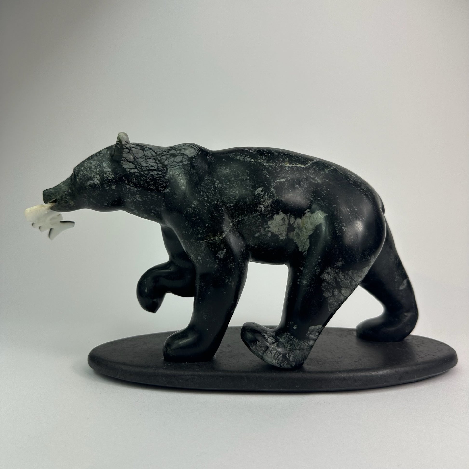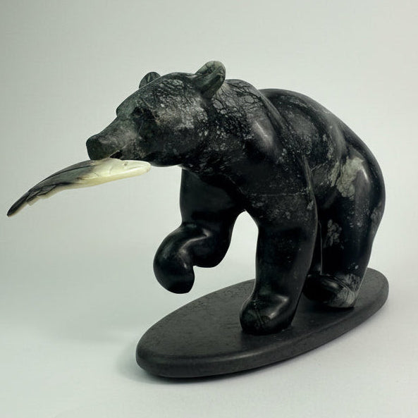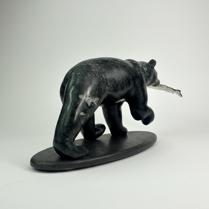 Hand-carved from striking black and green brucite, this sculpture captures a black bear carrying salmon—an enduring moment drawn from the rhythms of the wild. A luminous Tahitian mother-of-pearl shell and opal eye adds a quiet, unexpected brilliance, enhancing the sculpture’s depth and presence.