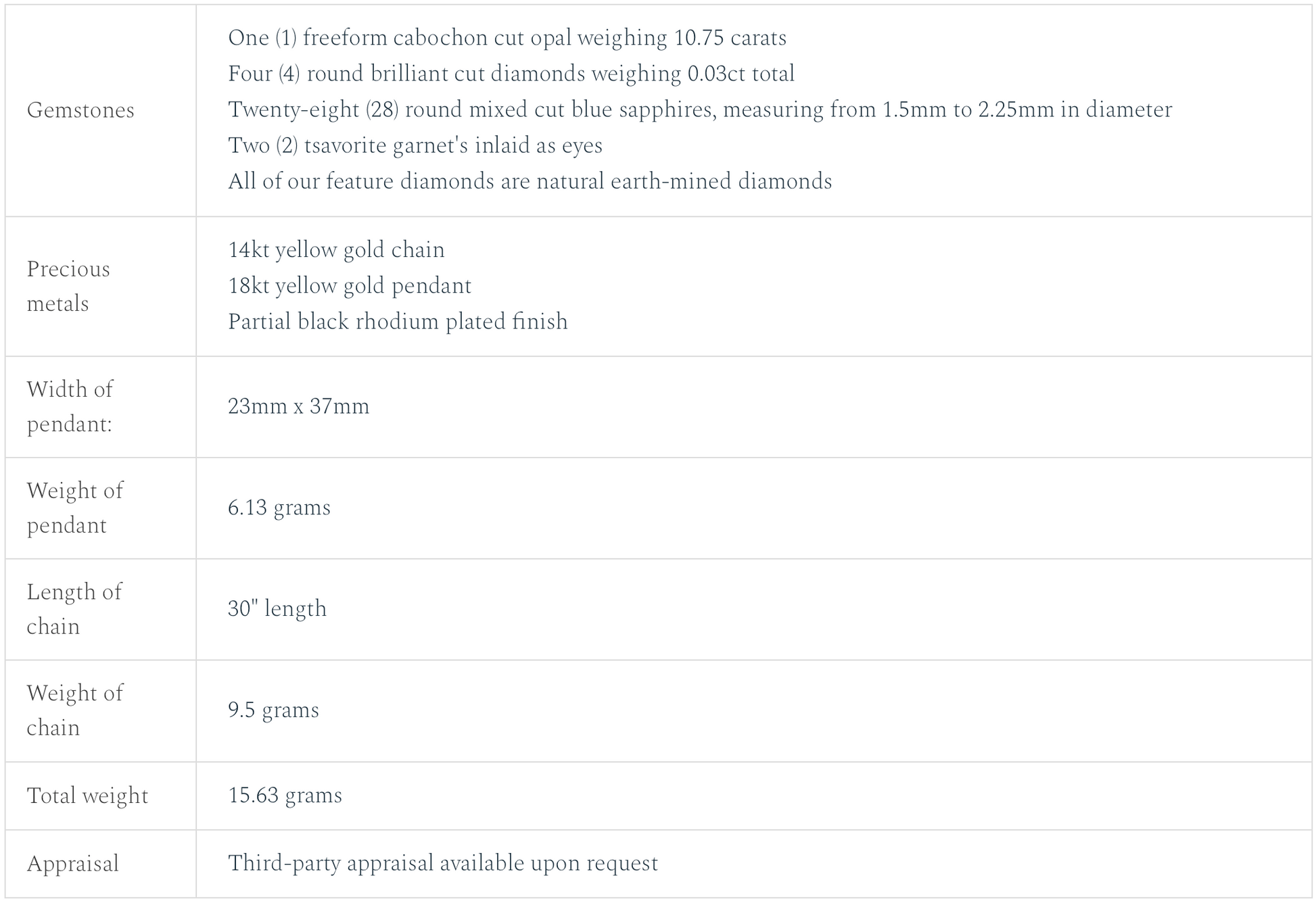 The Stingray Pendant emanates the wild and mysterious beauty of the oceanic animal. Its essence is captured by an exquisite freeform white opal, inlaid with glinting tsavorite garnet and 18k yellow gold. Deep blue pavée sapphires fade from their fins to the tail with a sleek diamond finish. The opal emanates pink, green, and gold flecks of fire, representing the stingray’s intelligence and protective instincts.