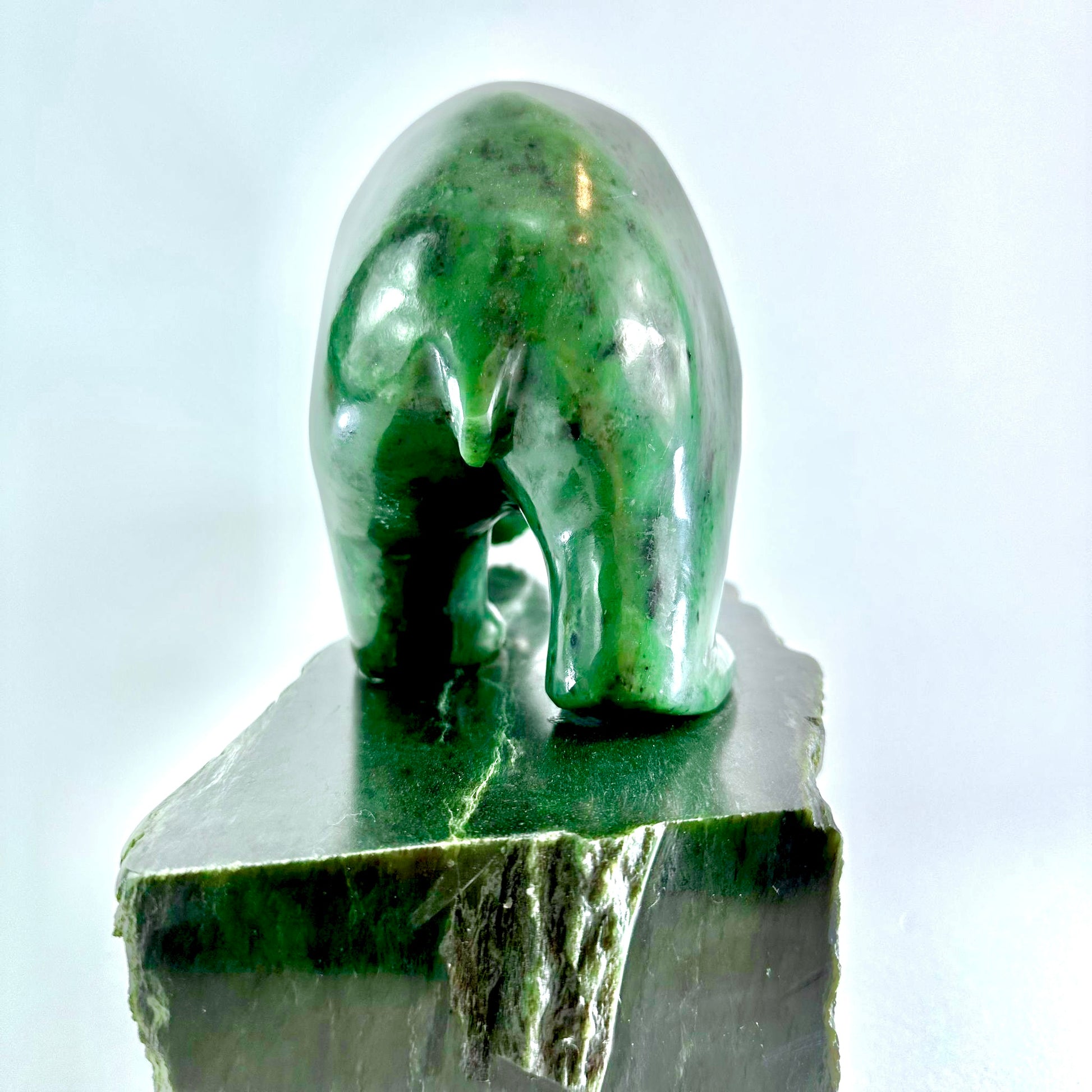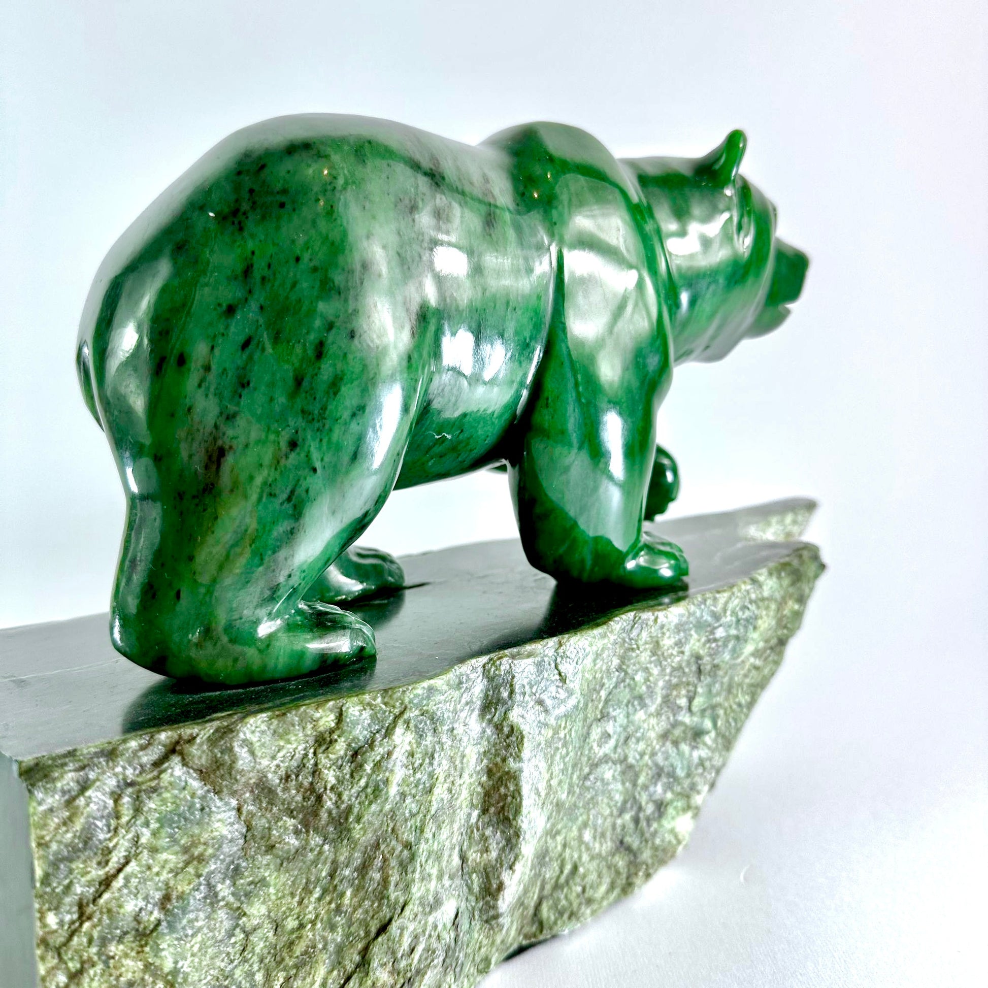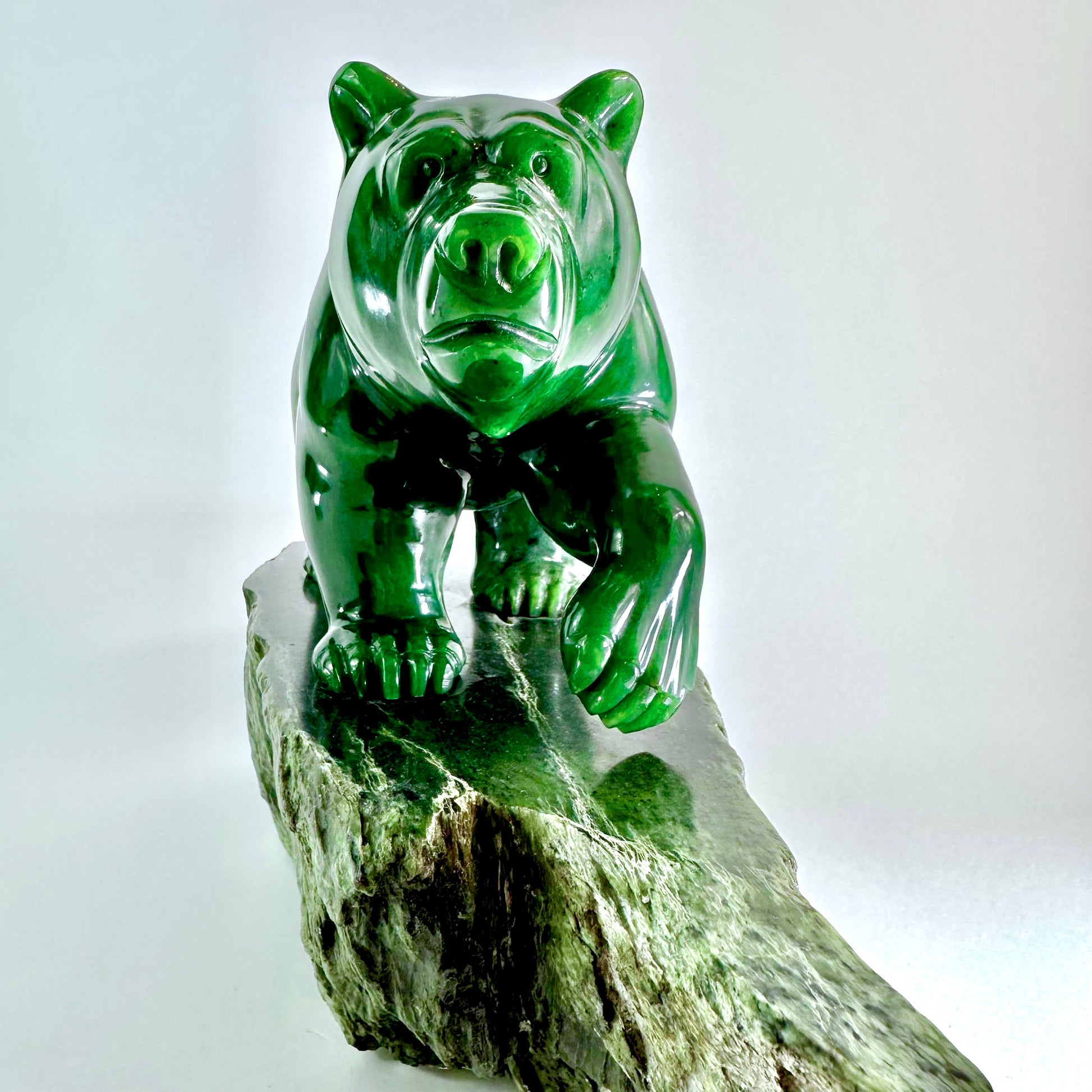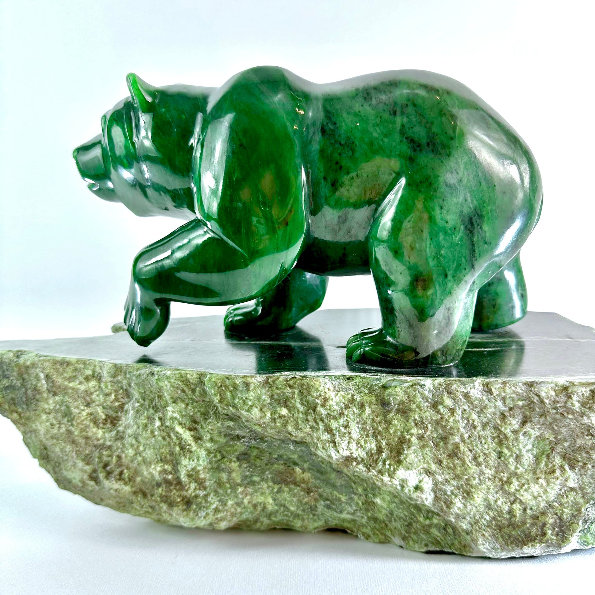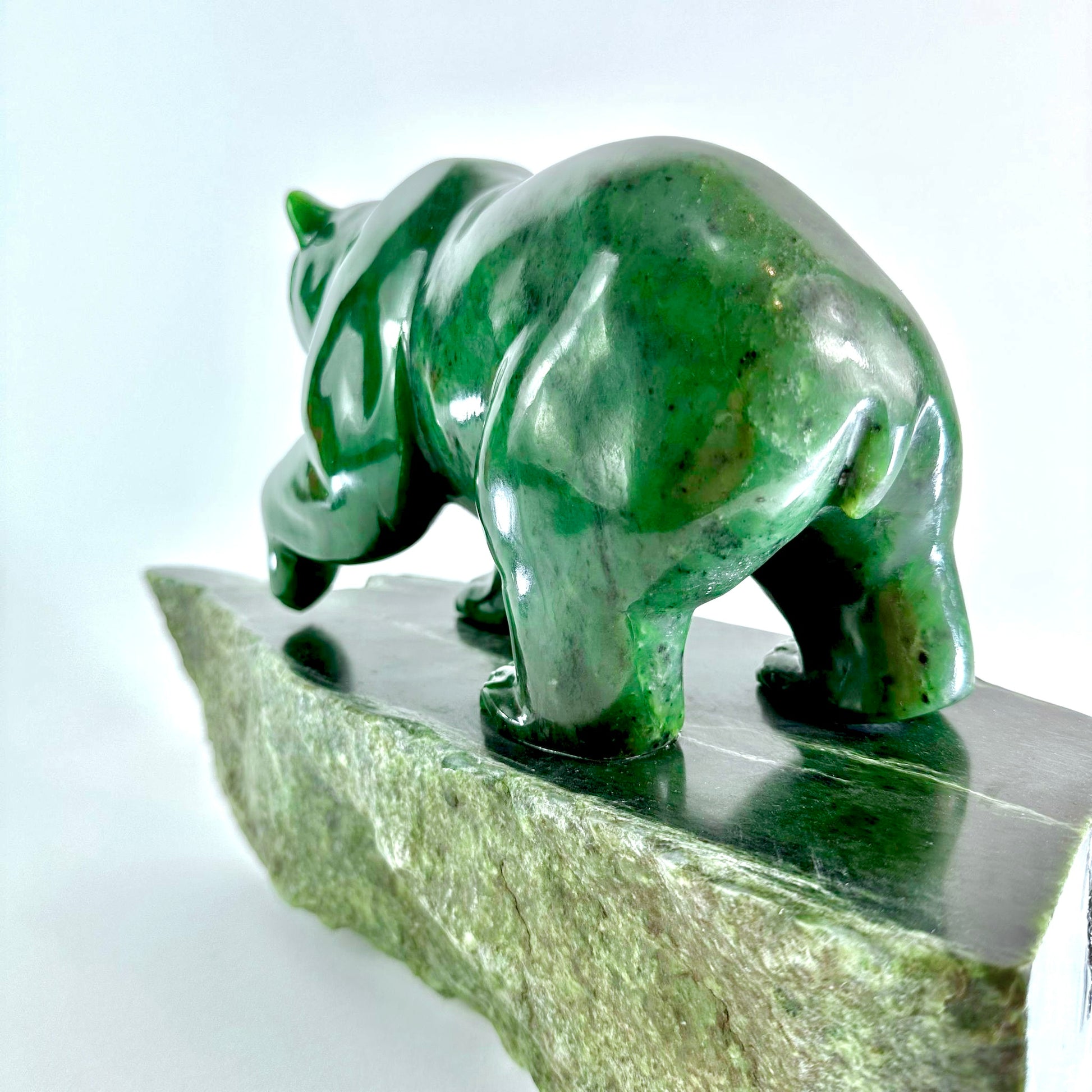 Meet Stout, a breathtaking grizzly bear sculpture carved from authentic BC jade. This remarkable piece showcases the deep, rich green tones that make British Columbia jade so prized by collectors and art enthusiasts worldwide. Every curve and contour has been thoughtfully sculpted to capture the strength and character of a grizzly in its natural habitat. The substantial heft of this jade carving speaks to its quality and craftsmanship—a piece designed to be held, admired, and treasured for generations. It's an ideal gift for wildlife lovers, a stunning addition to any collection, or a meaningful investment in authentic Canadian artisanal work. Stout isn't just a sculpture—it's a connection to the wild heart of the Pacific Northwest.