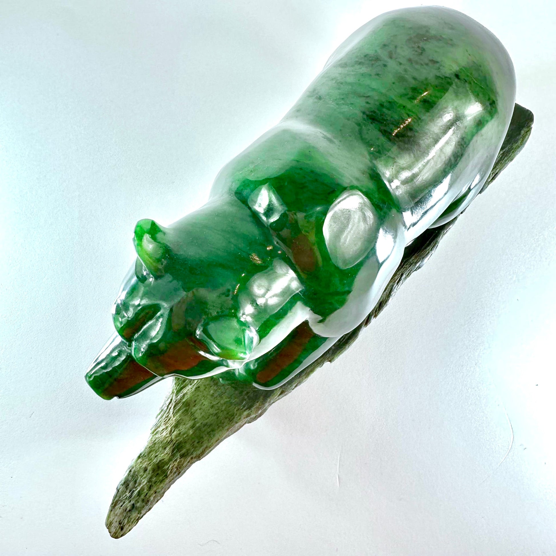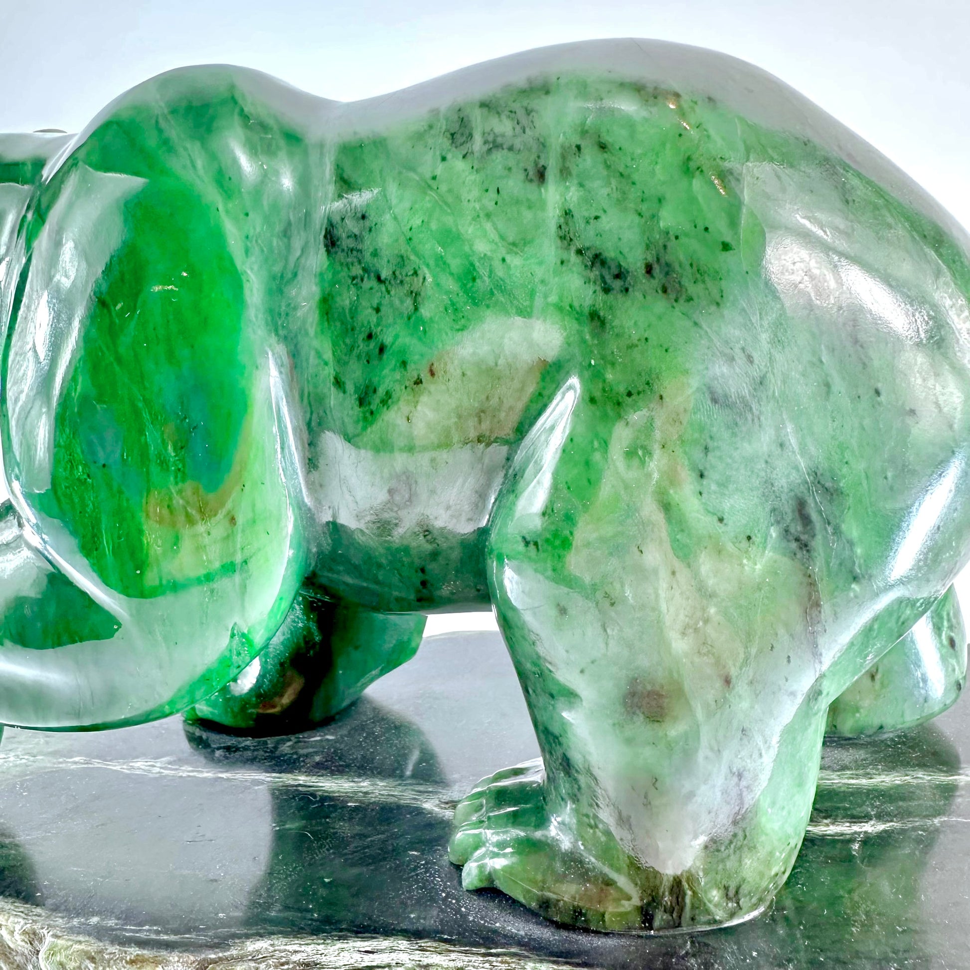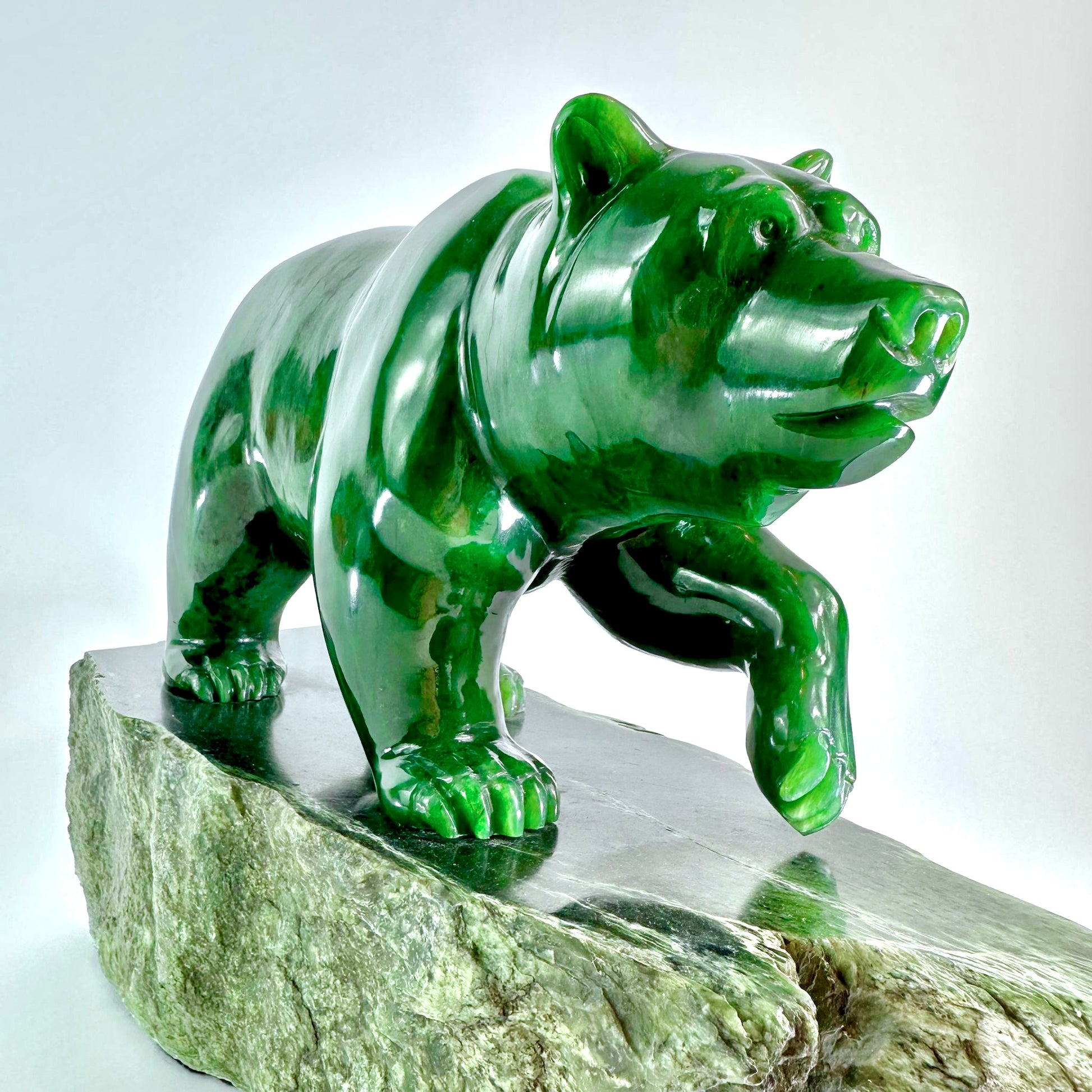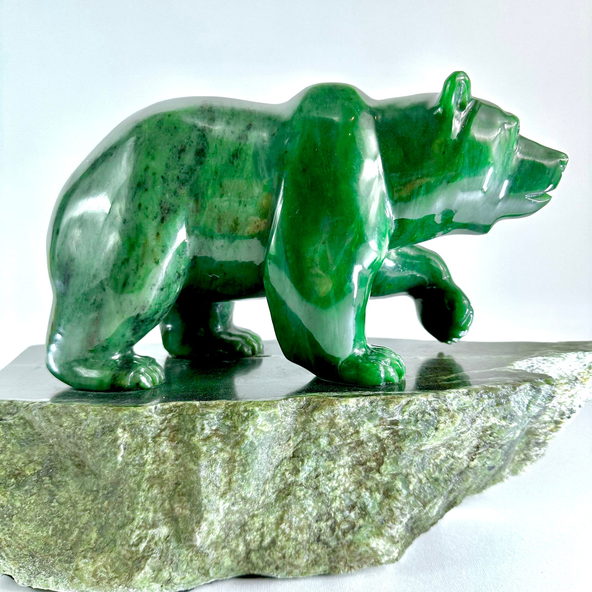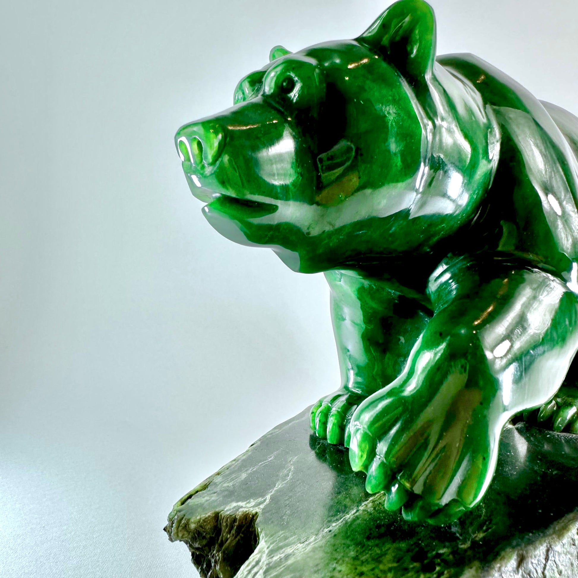Meet Stout, a breathtaking grizzly bear sculpture carved from authentic BC jade. This remarkable piece showcases the deep, rich green tones that make British Columbia jade so prized by collectors and art enthusiasts worldwide. Every curve and contour has been thoughtfully sculpted to capture the strength and character of a grizzly in its natural habitat. The substantial heft of this jade carving speaks to its quality and craftsmanship—a piece designed to be held, admired, and treasured for generations. It's an ideal gift for wildlife lovers, a stunning addition to any collection, or a meaningful investment in authentic Canadian artisanal work. Stout isn't just a sculpture—it's a connection to the wild heart of the Pacific Northwest.