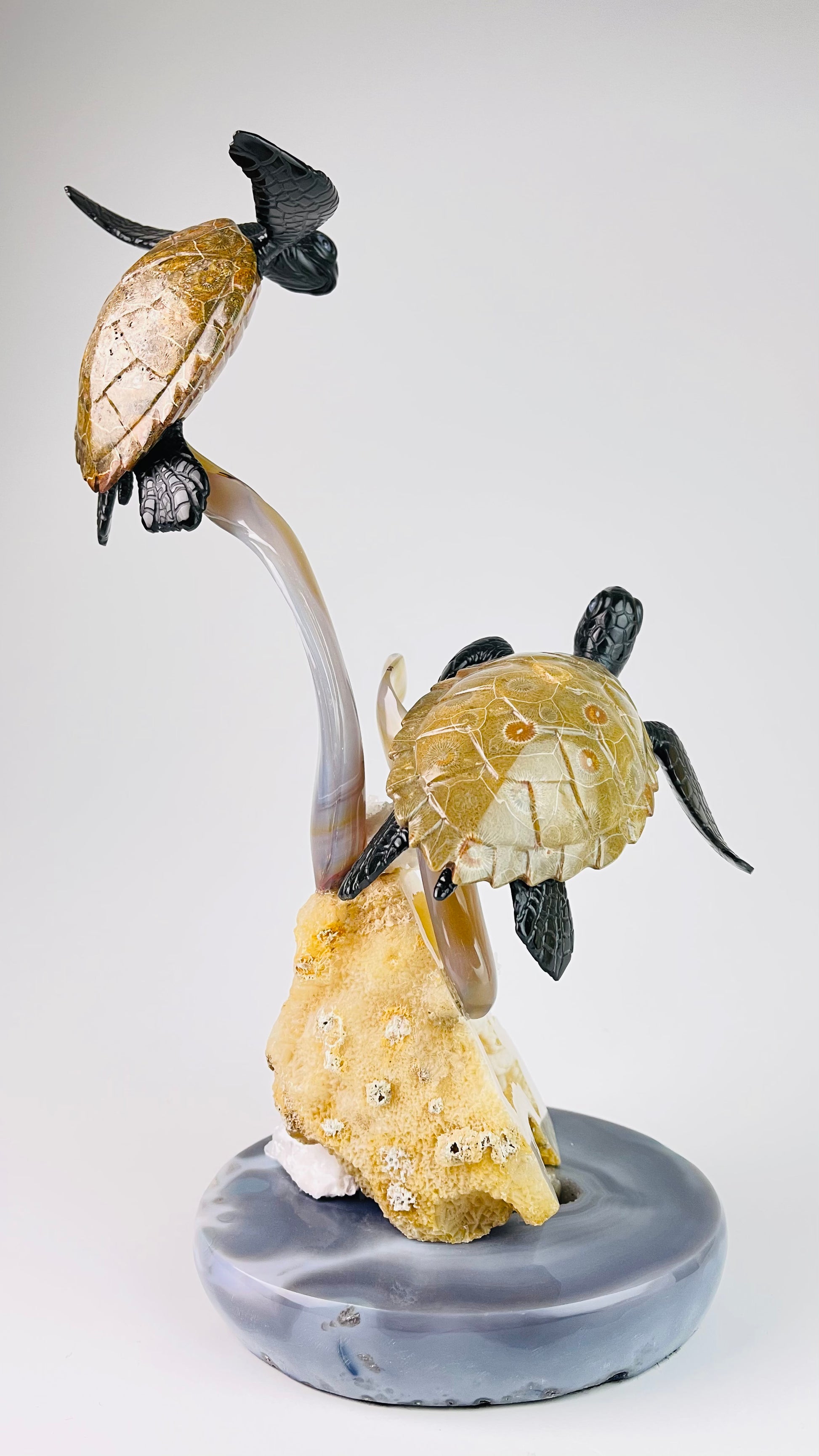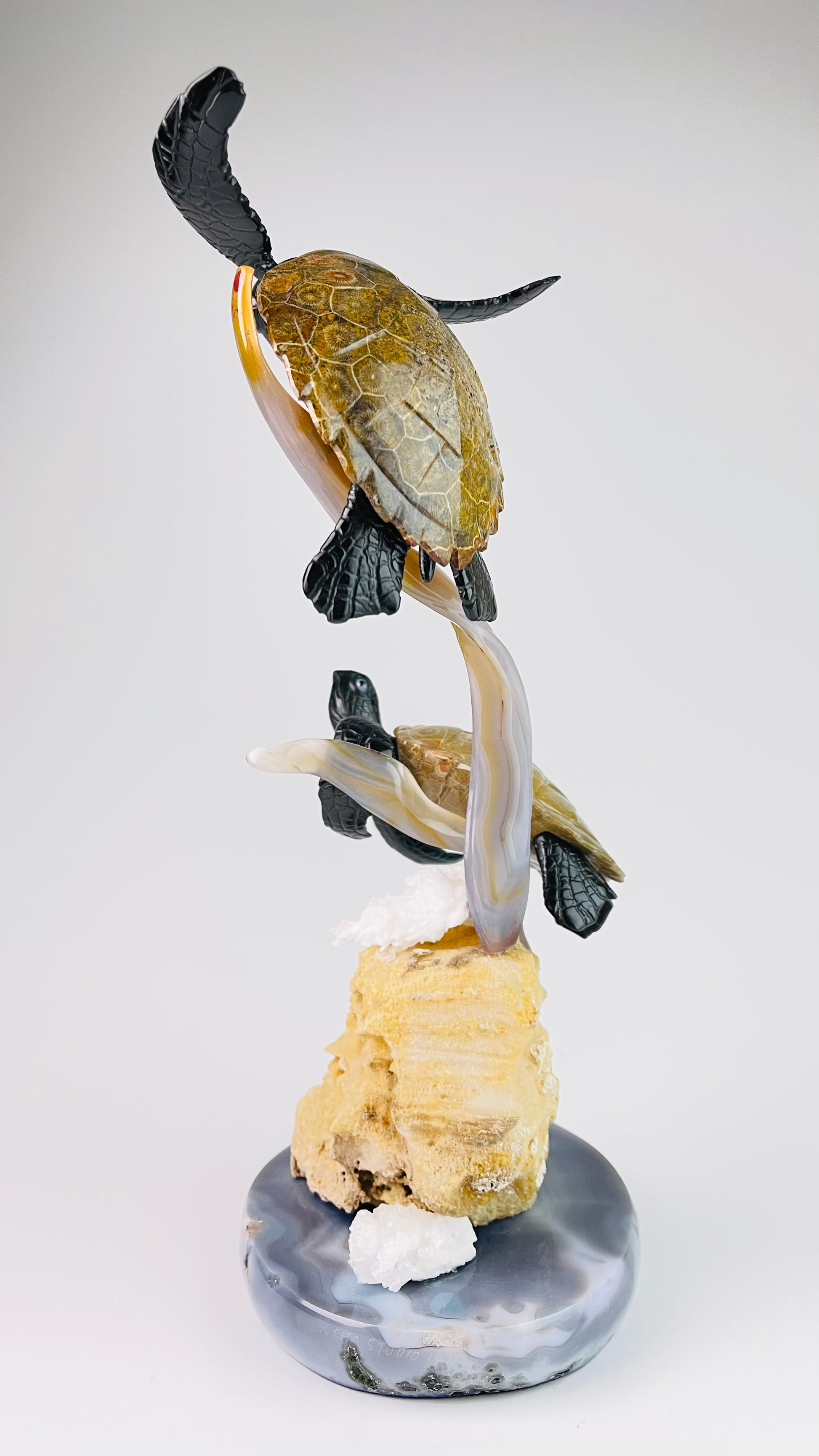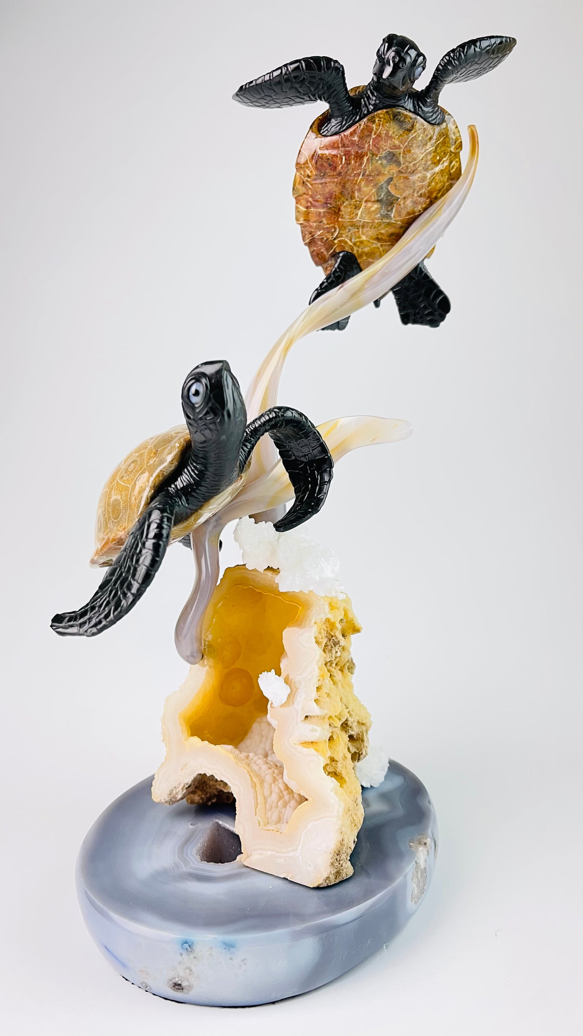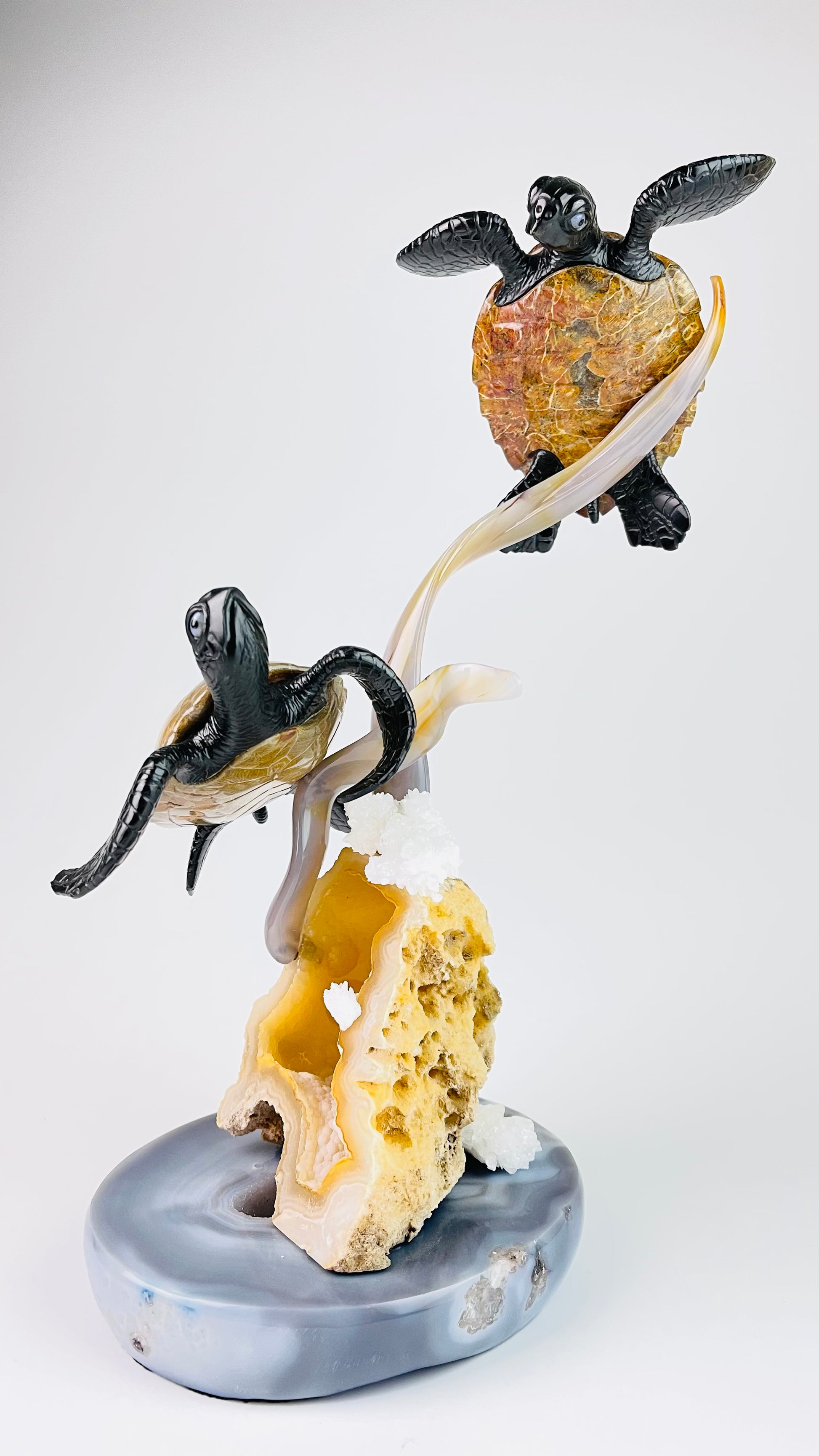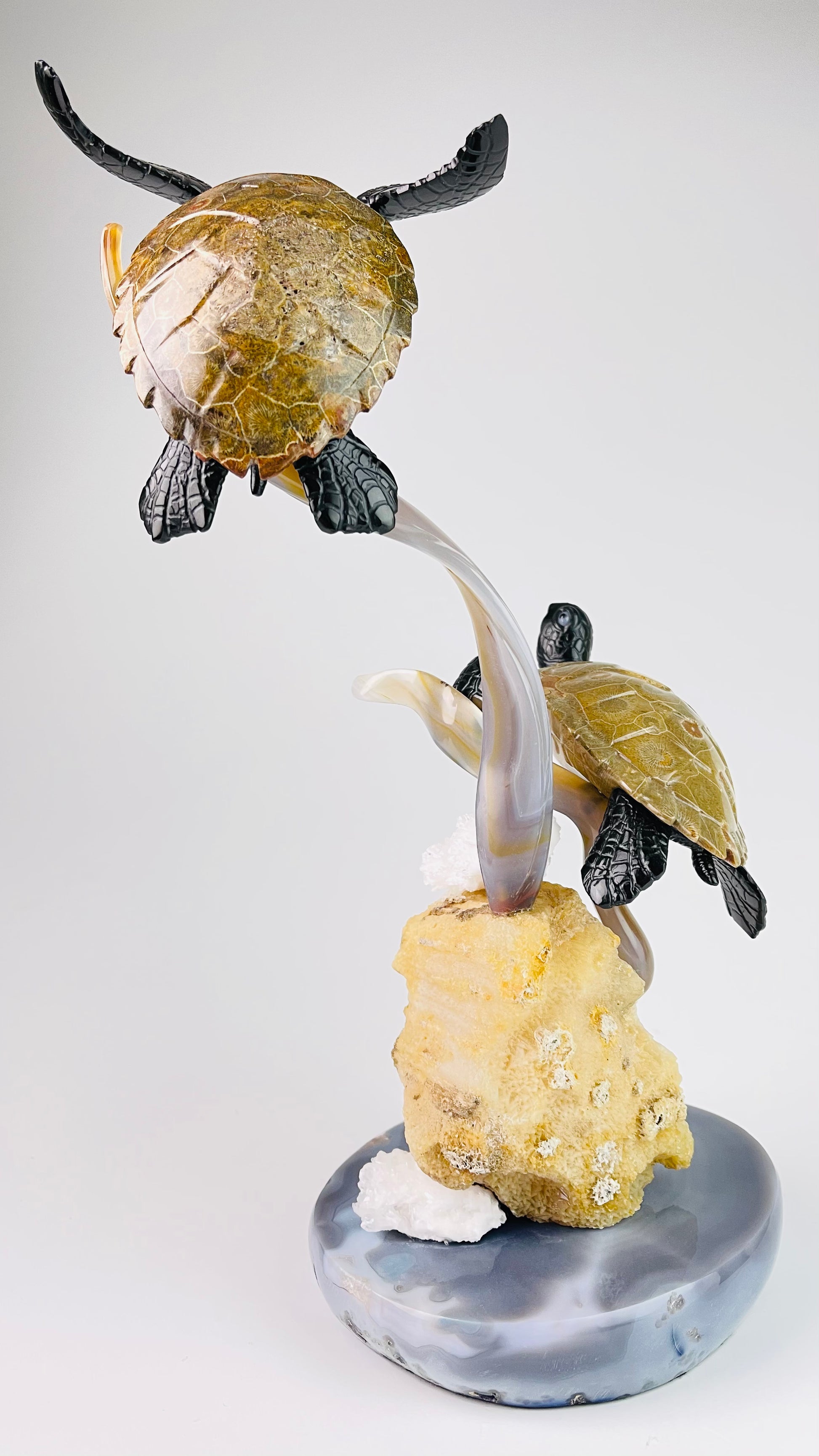 "Turtles" is an enchanting sculpture that intricately captures the graceful motion of sea turtles amidst an underwater landscape. This piece, standing 13 inches tall and measuring 6 by 9 inches, features turtles carved from lustrous black jade, each detailed with coral shells that impart a textured, lifelike appearance. The turtles' eyes, crafted from blue agate, add a captivating depth to their expressions. The sculpture is further adorned with golden agate kelp, gracefully arching between the turtles, and white quartz elements that mimic the look of sea foam. Anchoring this exquisite tableau is a robust base of gold and blue agate, which not only provides stability but also complements the natural tones and textures of the entire composition. Weighing 13 pounds, "Turtles" is a testament to the artist's skill in harmonizing diverse stones to create a vibrant and dynamic scene. This piece, made in British Columbia, Canada, invites viewers to appreciate the serene beauty and delicate balance of marine life, making it a distinguished addition to any art collection.