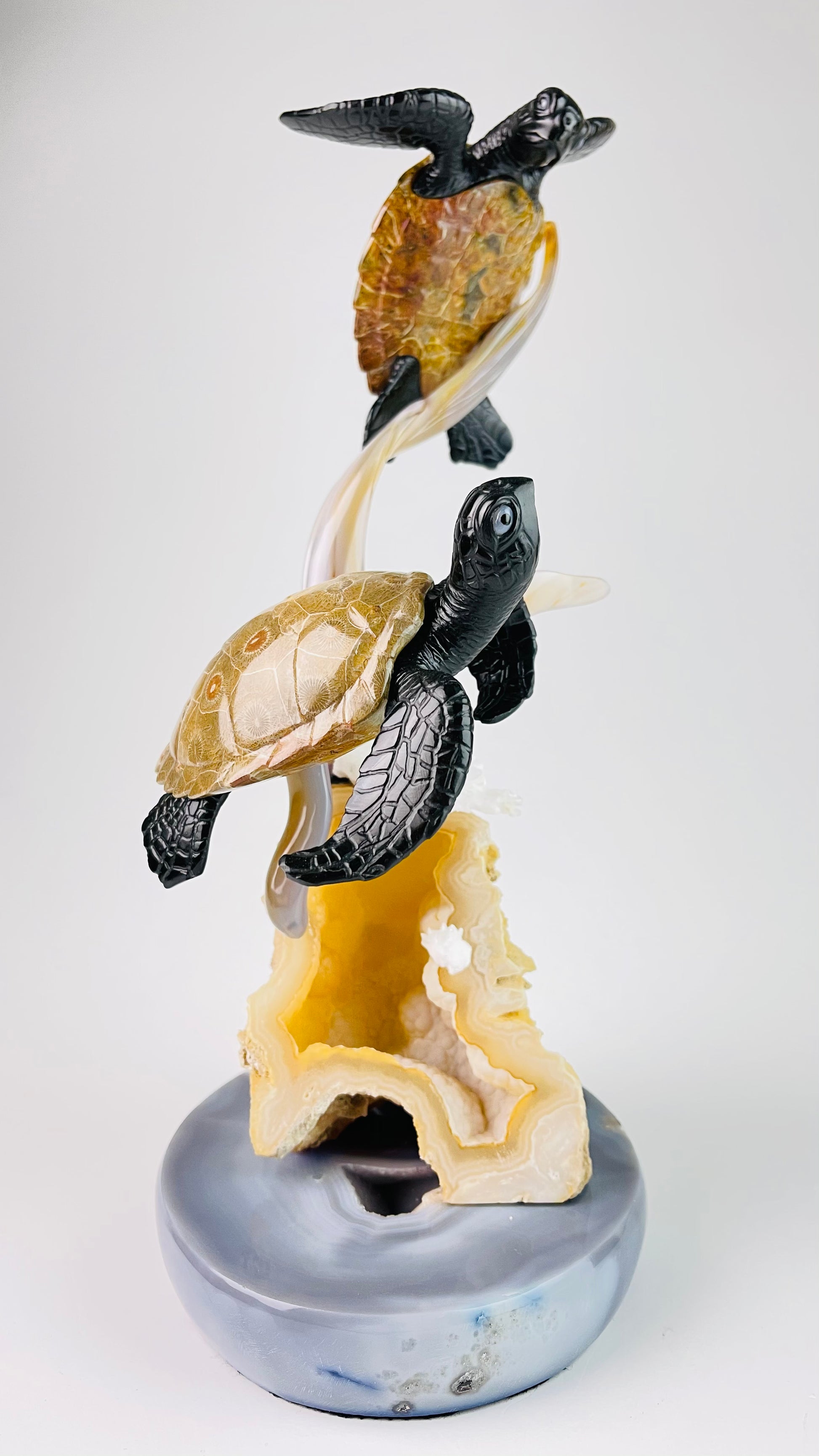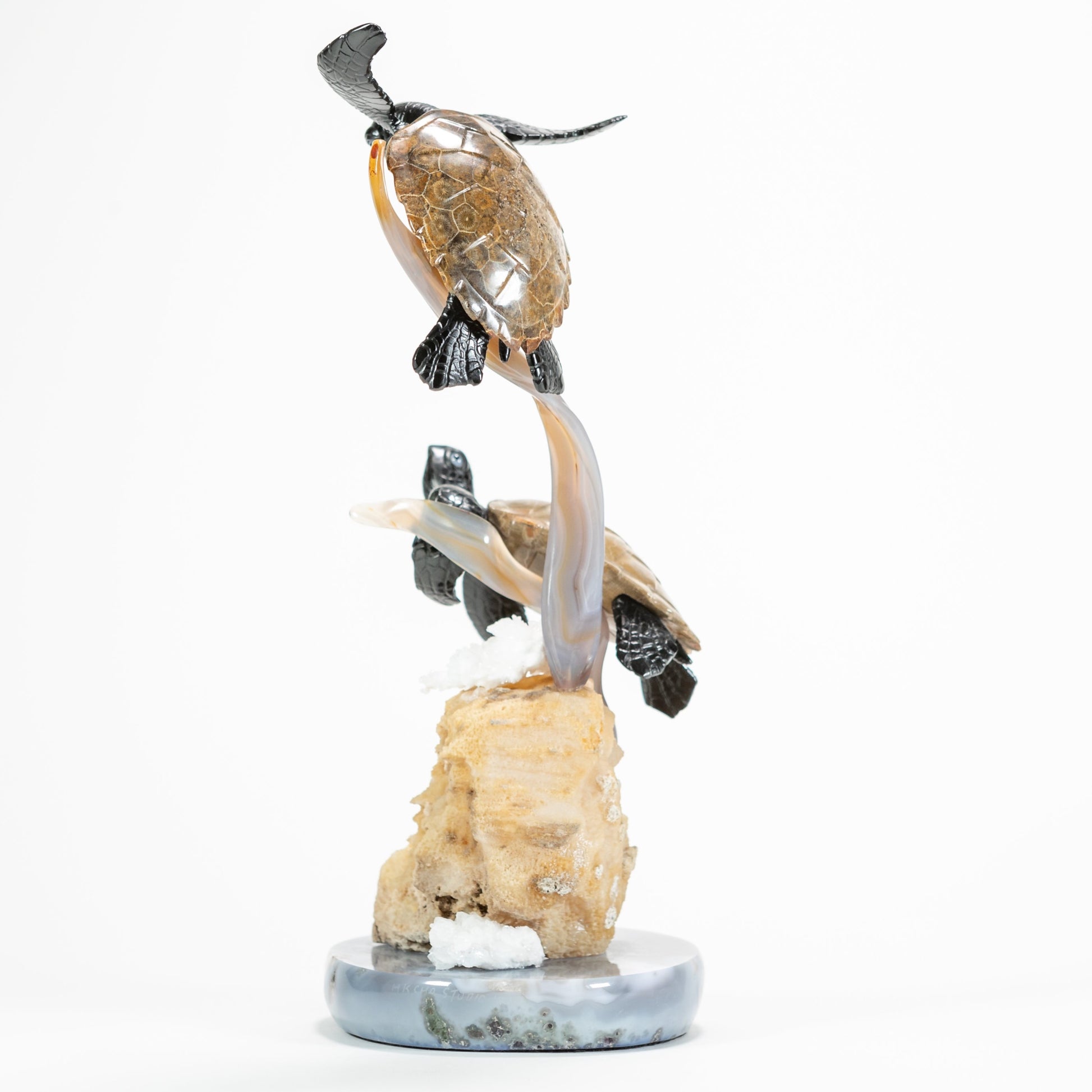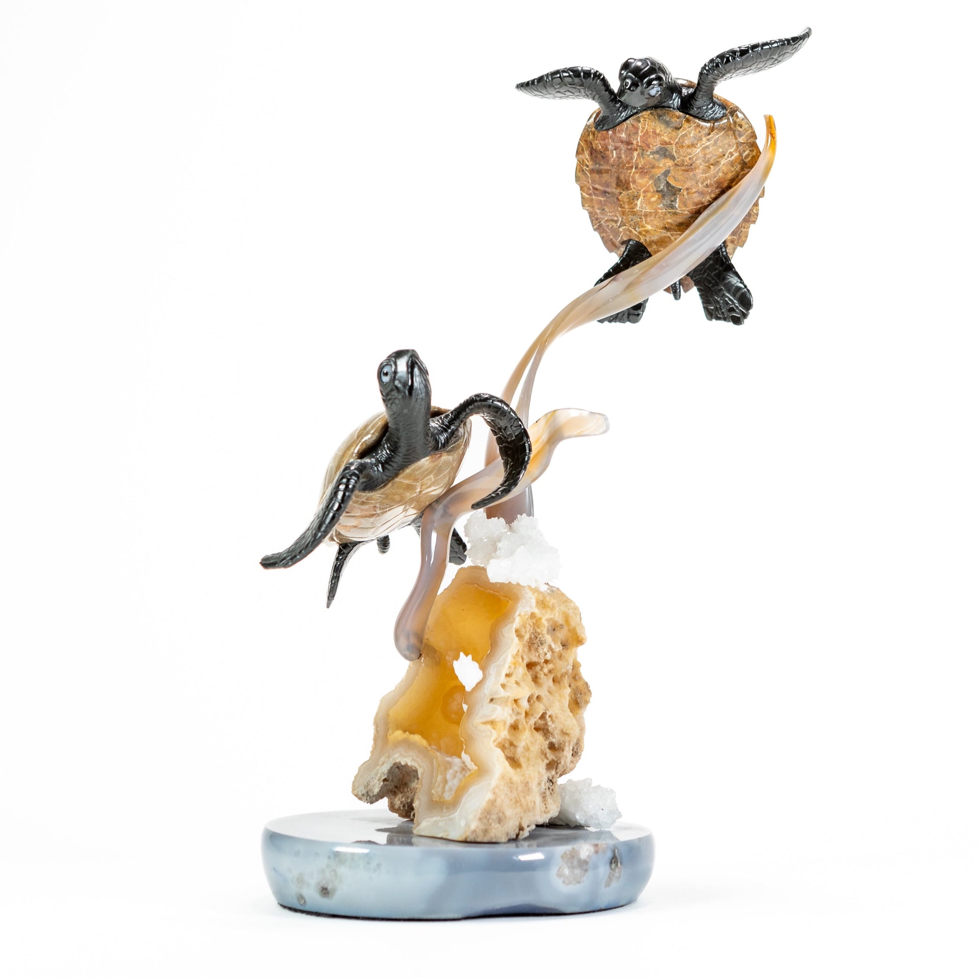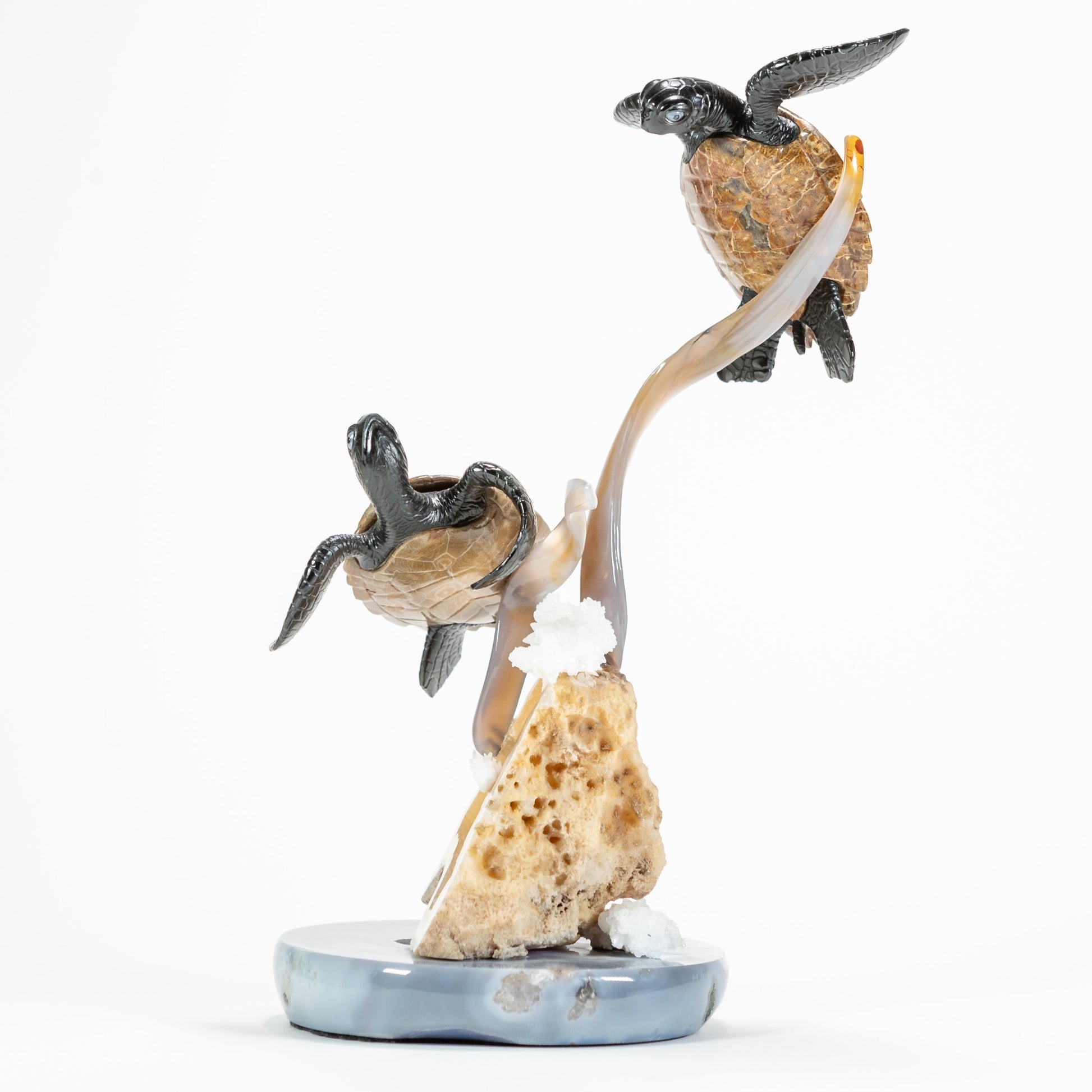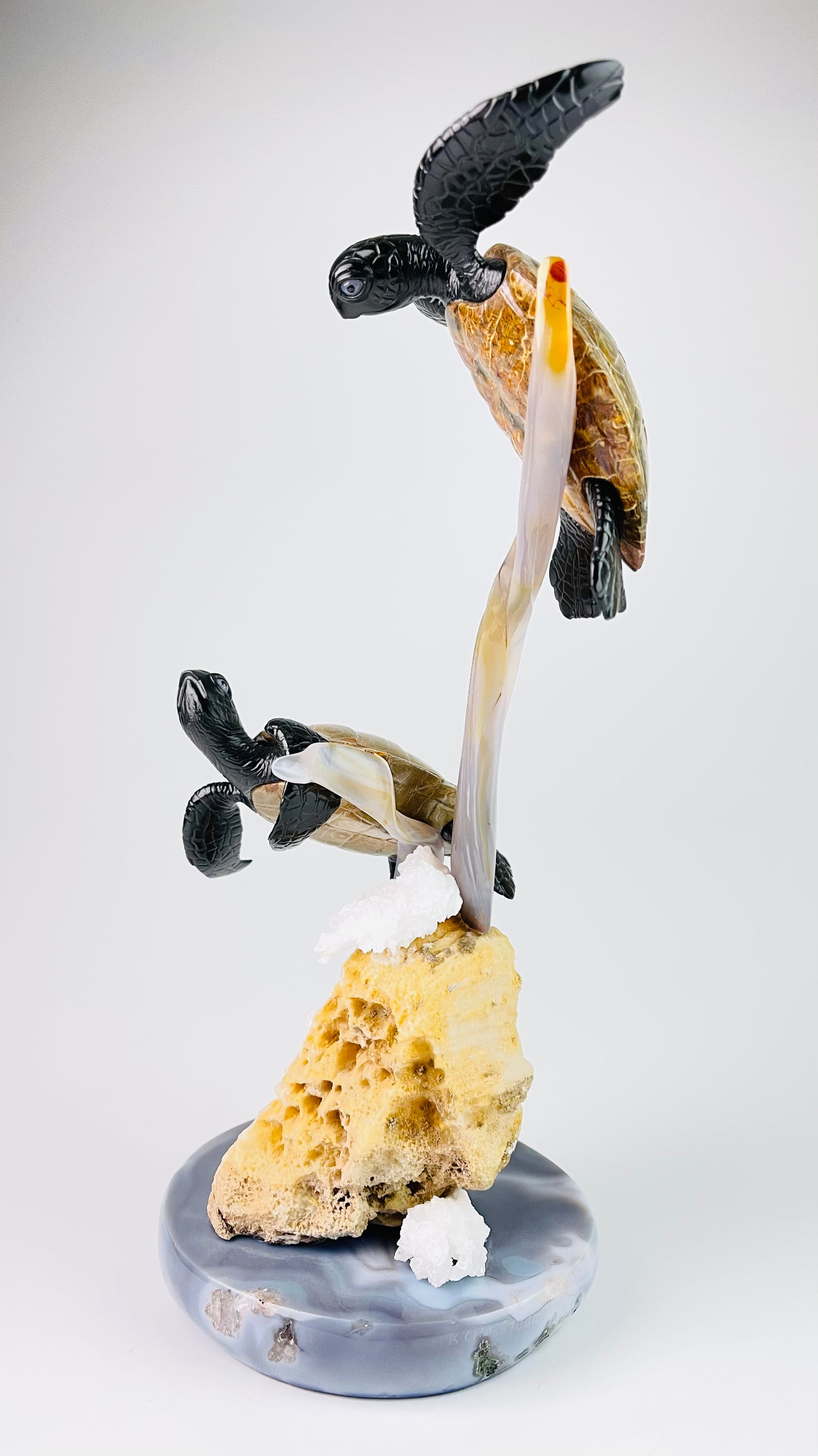 "Turtles" is an enchanting sculpture that intricately captures the graceful motion of sea turtles amidst an underwater landscape. This piece, standing 13 inches tall and measuring 6 by 9 inches, features turtles carved from lustrous black jade, each detailed with coral shells that impart a textured, lifelike appearance. The turtles' eyes, crafted from blue agate, add a captivating depth to their expressions. The sculpture is further adorned with golden agate kelp, gracefully arching between the turtles, and white quartz elements that mimic the look of sea foam. Anchoring this exquisite tableau is a robust base of gold and blue agate, which not only provides stability but also complements the natural tones and textures of the entire composition. Weighing 13 pounds, "Turtles" is a testament to the artist's skill in harmonizing diverse stones to create a vibrant and dynamic scene. This piece, made in British Columbia, Canada, invites viewers to appreciate the serene beauty and delicate balance of marine life, making it a distinguished addition to any art collection.