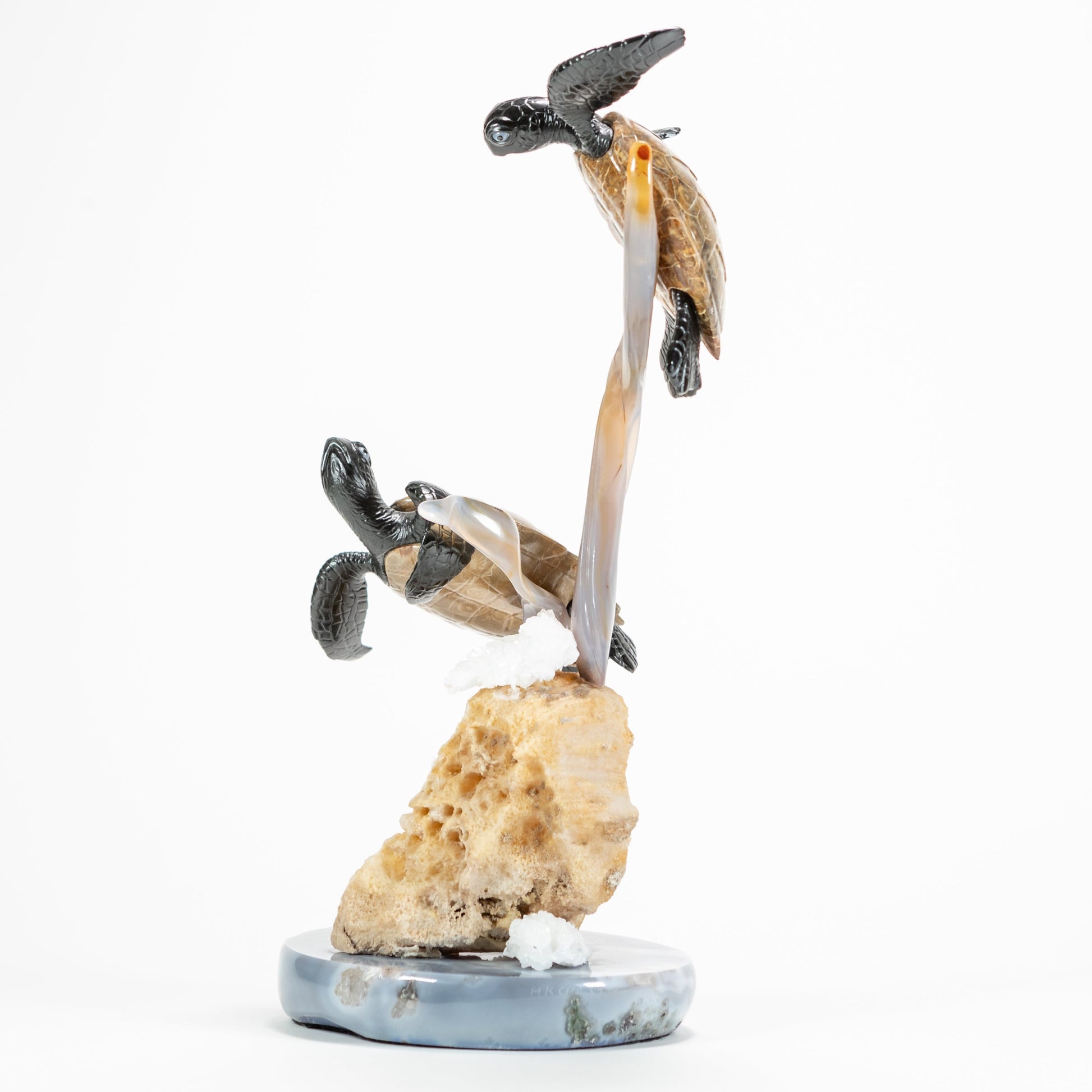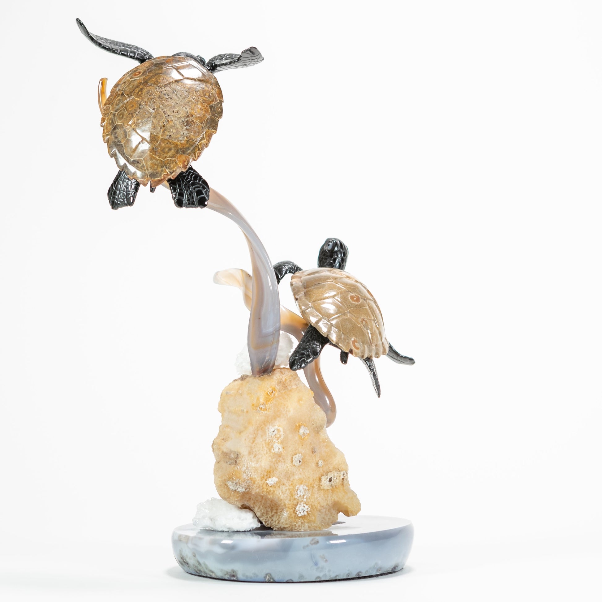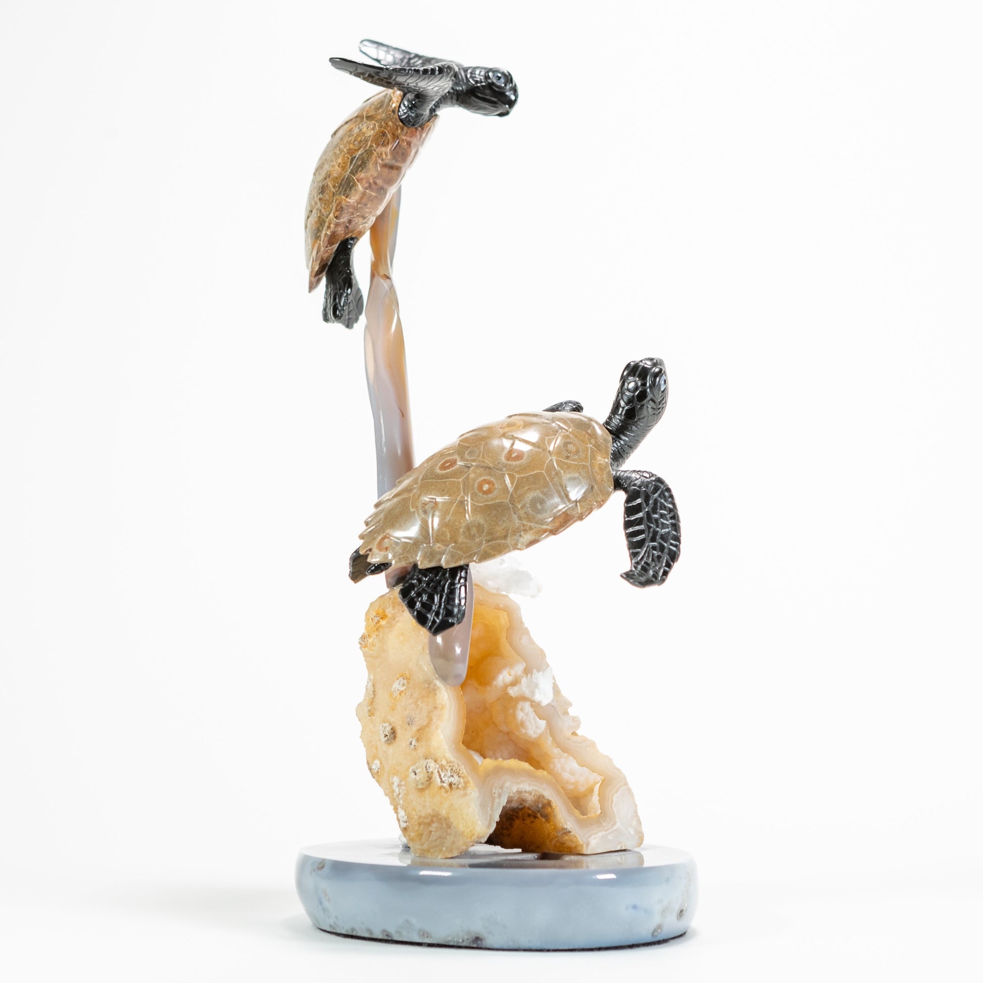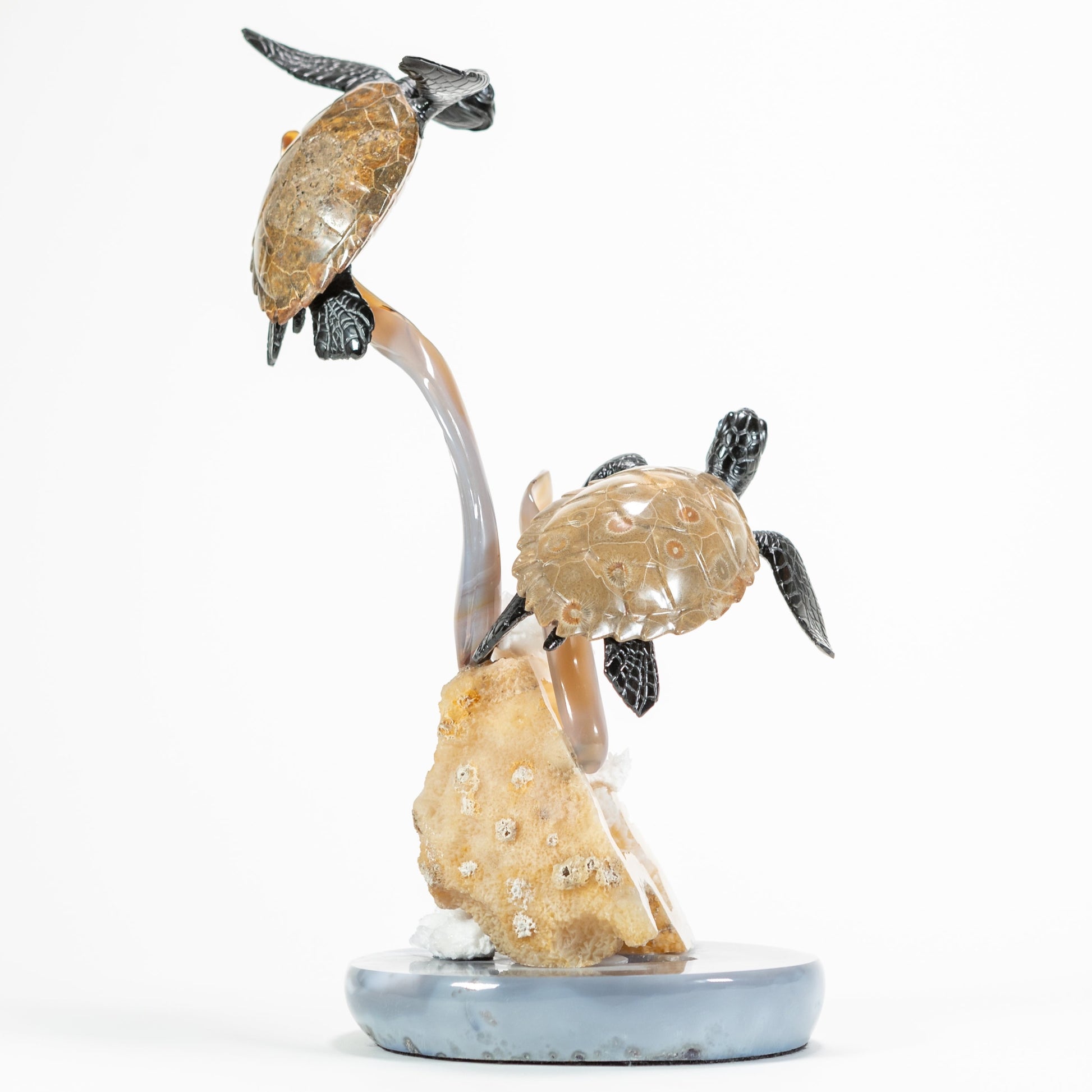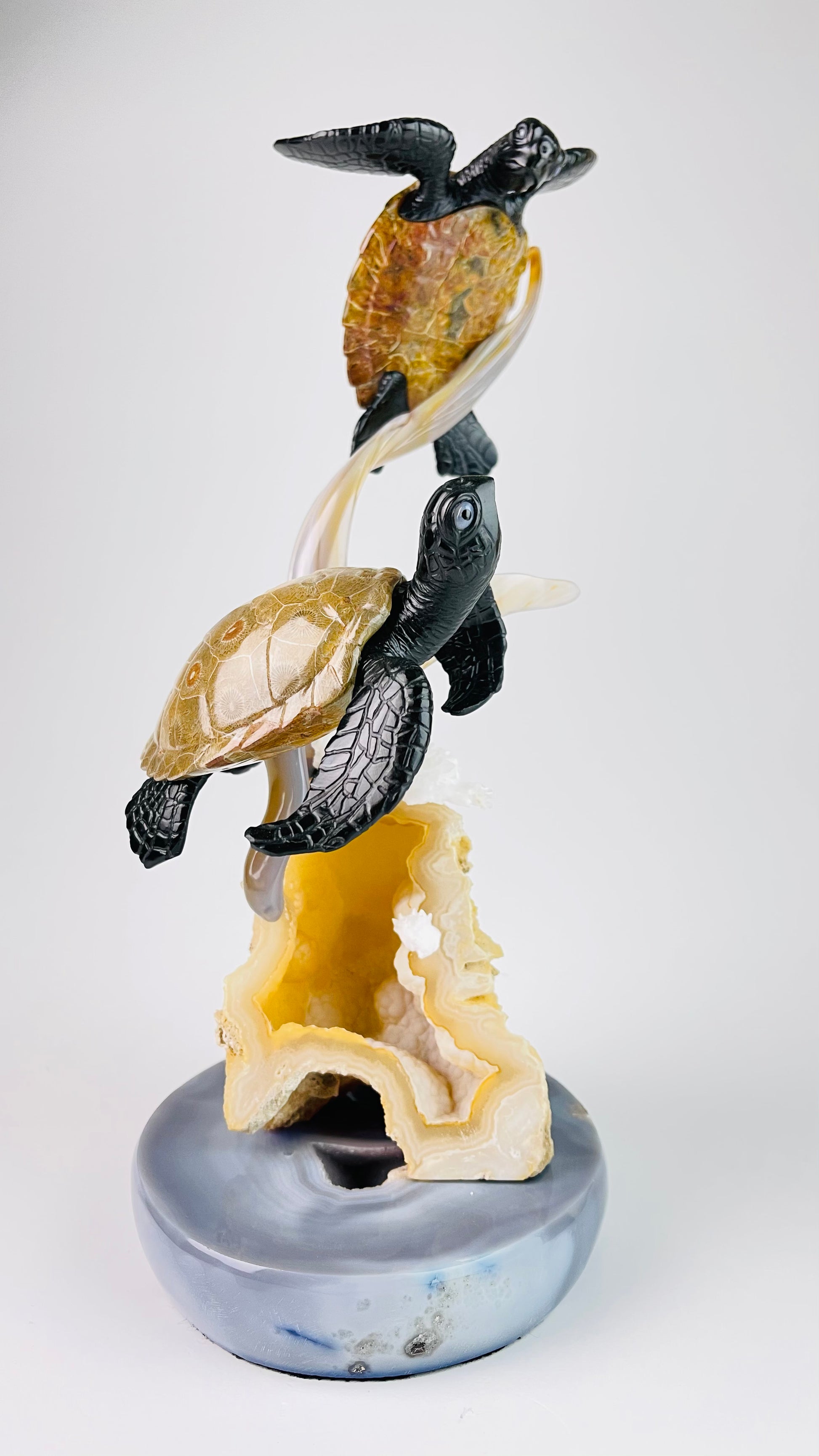 "Turtles" is an enchanting sculpture that intricately captures the graceful motion of sea turtles amidst an underwater landscape. This piece, standing 13 inches tall and measuring 6 by 9 inches, features turtles carved from lustrous black jade, each detailed with coral shells that impart a textured, lifelike appearance. The turtles' eyes, crafted from blue agate, add a captivating depth to their expressions. The sculpture is further adorned with golden agate kelp, gracefully arching between the turtles, and white quartz elements that mimic the look of sea foam. Anchoring this exquisite tableau is a robust base of gold and blue agate, which not only provides stability but also complements the natural tones and textures of the entire composition. Weighing 13 pounds, "Turtles" is a testament to the artist's skill in harmonizing diverse stones to create a vibrant and dynamic scene. This piece, made in British Columbia, Canada, invites viewers to appreciate the serene beauty and delicate balance of marine life, making it a distinguished addition to any art collection.