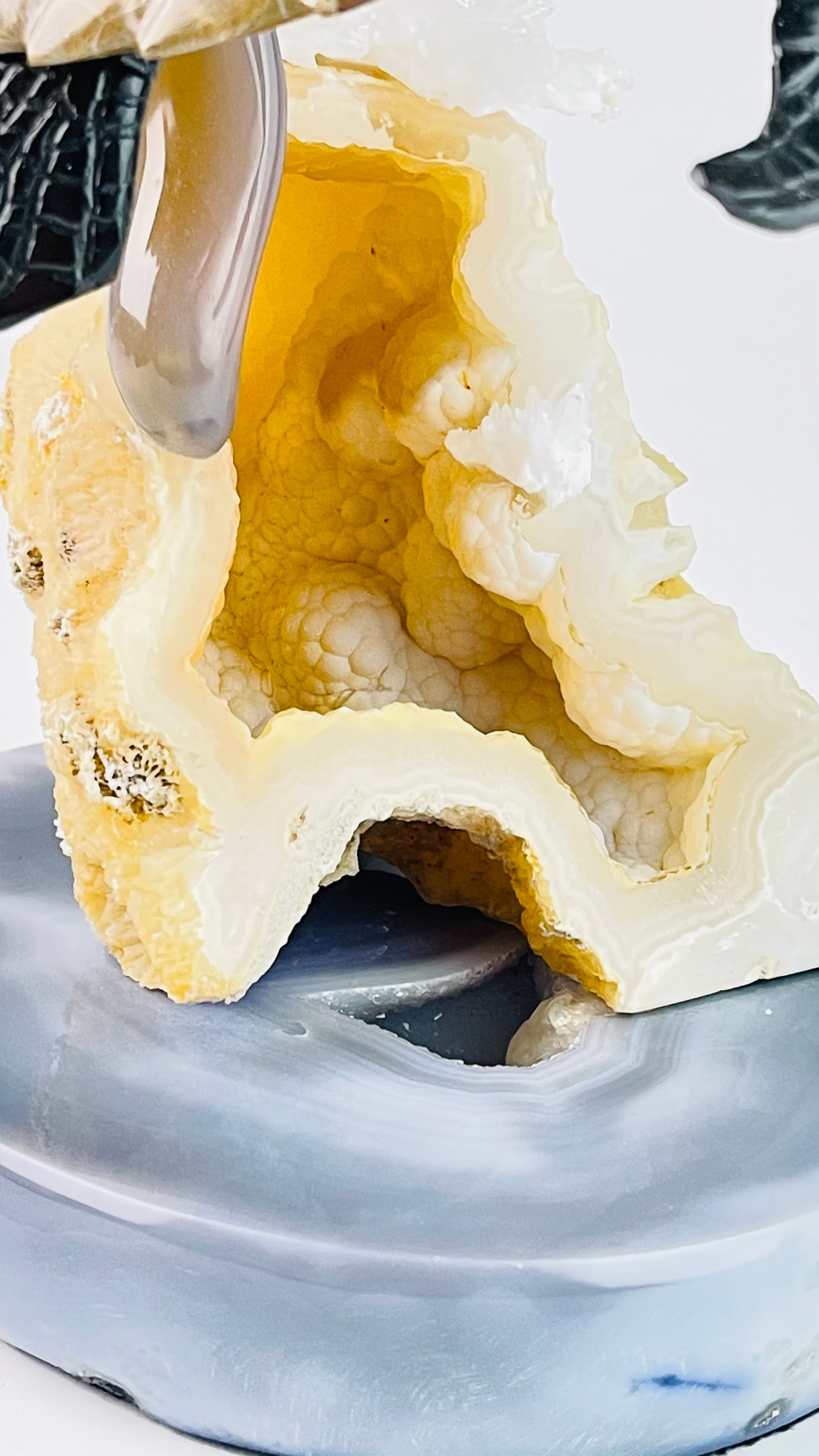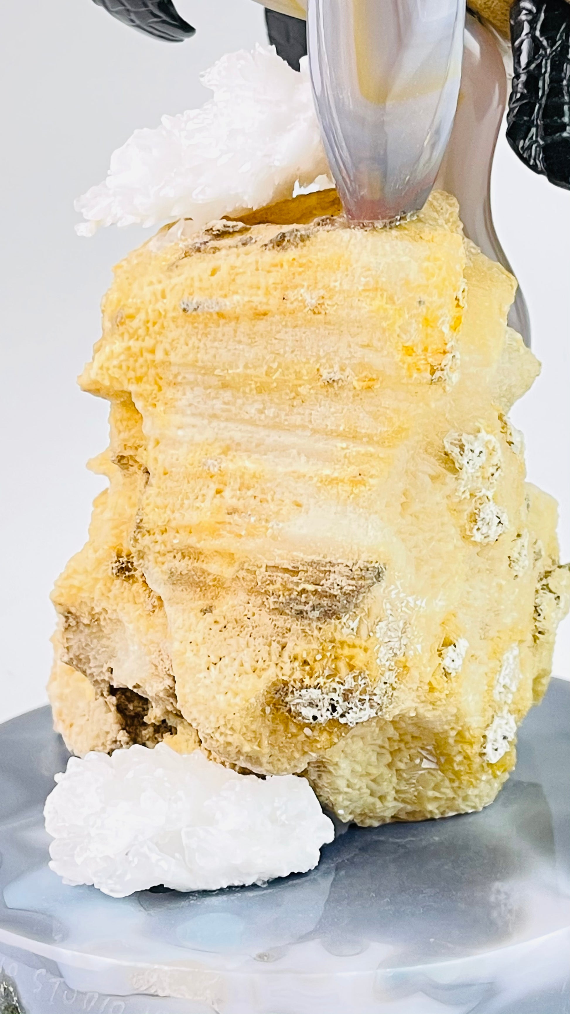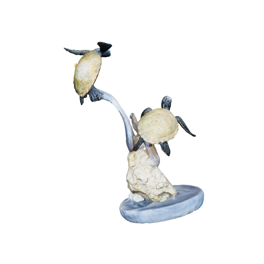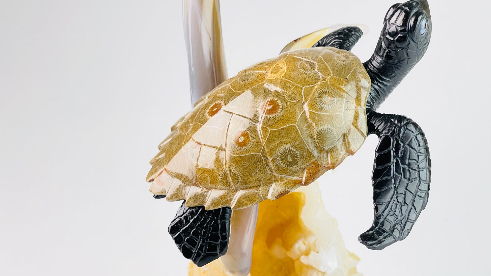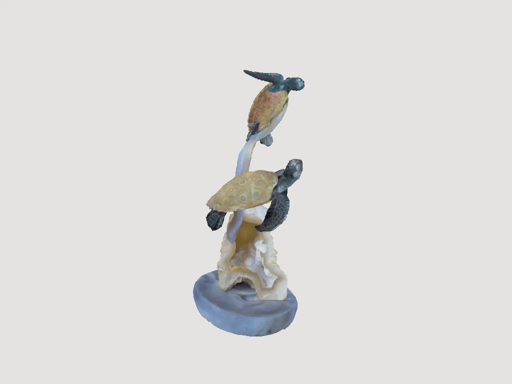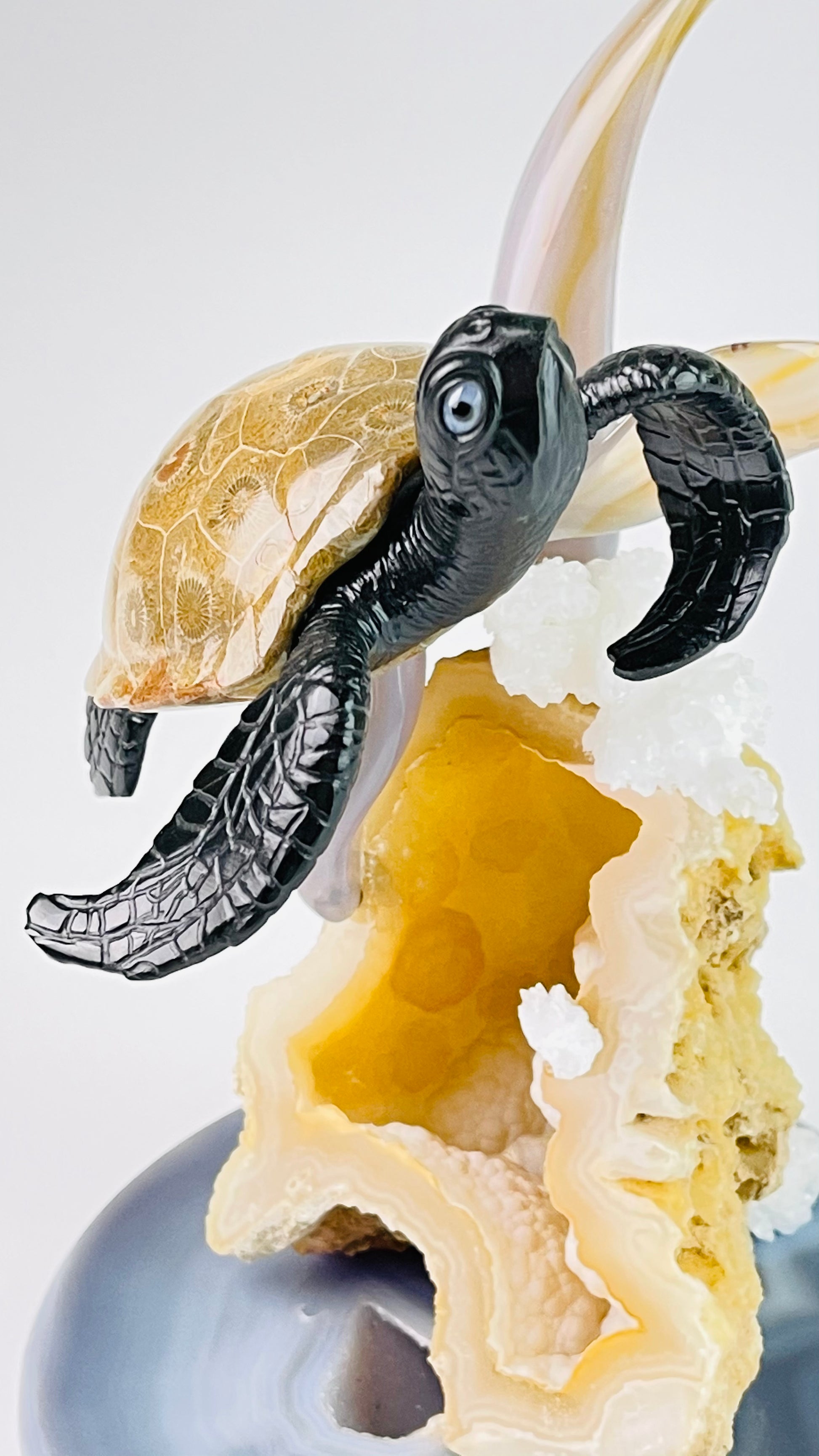 "Turtles" is an enchanting sculpture that intricately captures the graceful motion of sea turtles amidst an underwater landscape. This piece, standing 13 inches tall and measuring 6 by 9 inches, features turtles carved from lustrous black jade, each detailed with coral shells that impart a textured, lifelike appearance. The turtles' eyes, crafted from blue agate, add a captivating depth to their expressions. The sculpture is further adorned with golden agate kelp, gracefully arching between the turtles, and white quartz elements that mimic the look of sea foam. Anchoring this exquisite tableau is a robust base of gold and blue agate, which not only provides stability but also complements the natural tones and textures of the entire composition. Weighing 13 pounds, "Turtles" is a testament to the artist's skill in harmonizing diverse stones to create a vibrant and dynamic scene. This piece, made in British Columbia, Canada, invites viewers to appreciate the serene beauty and delicate balance of marine life, making it a distinguished addition to any art collection.