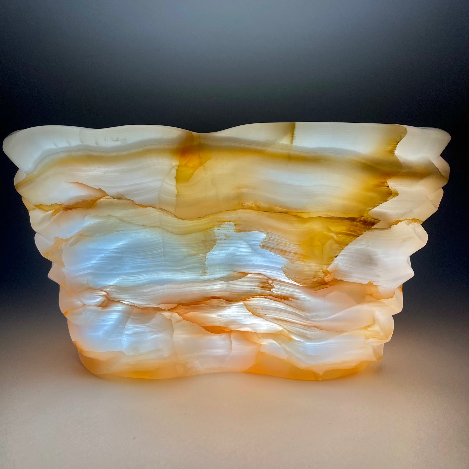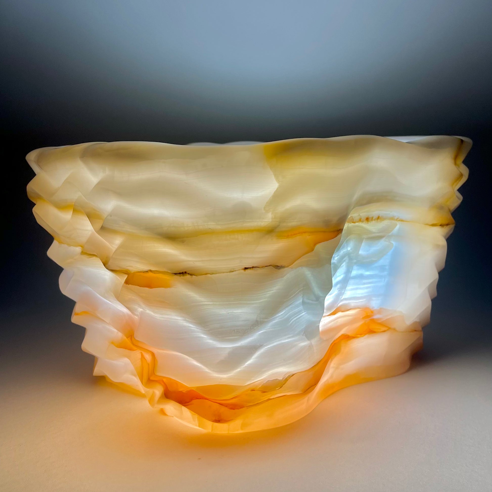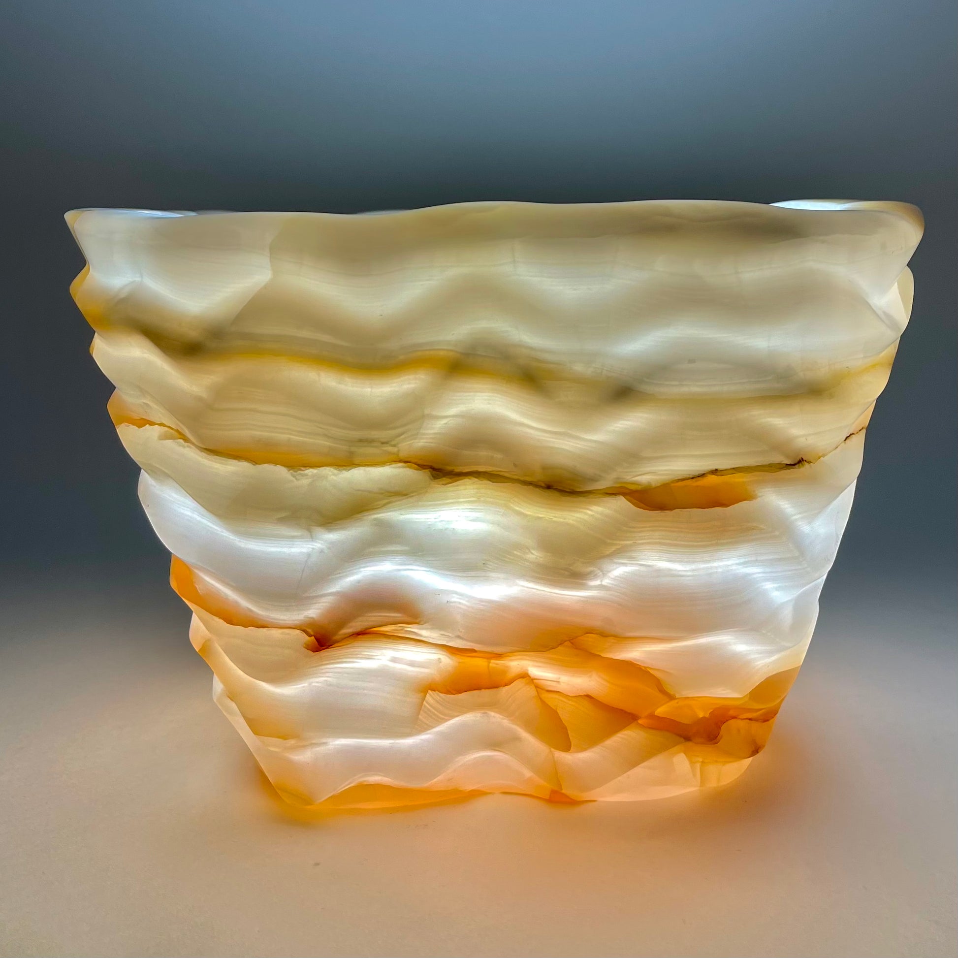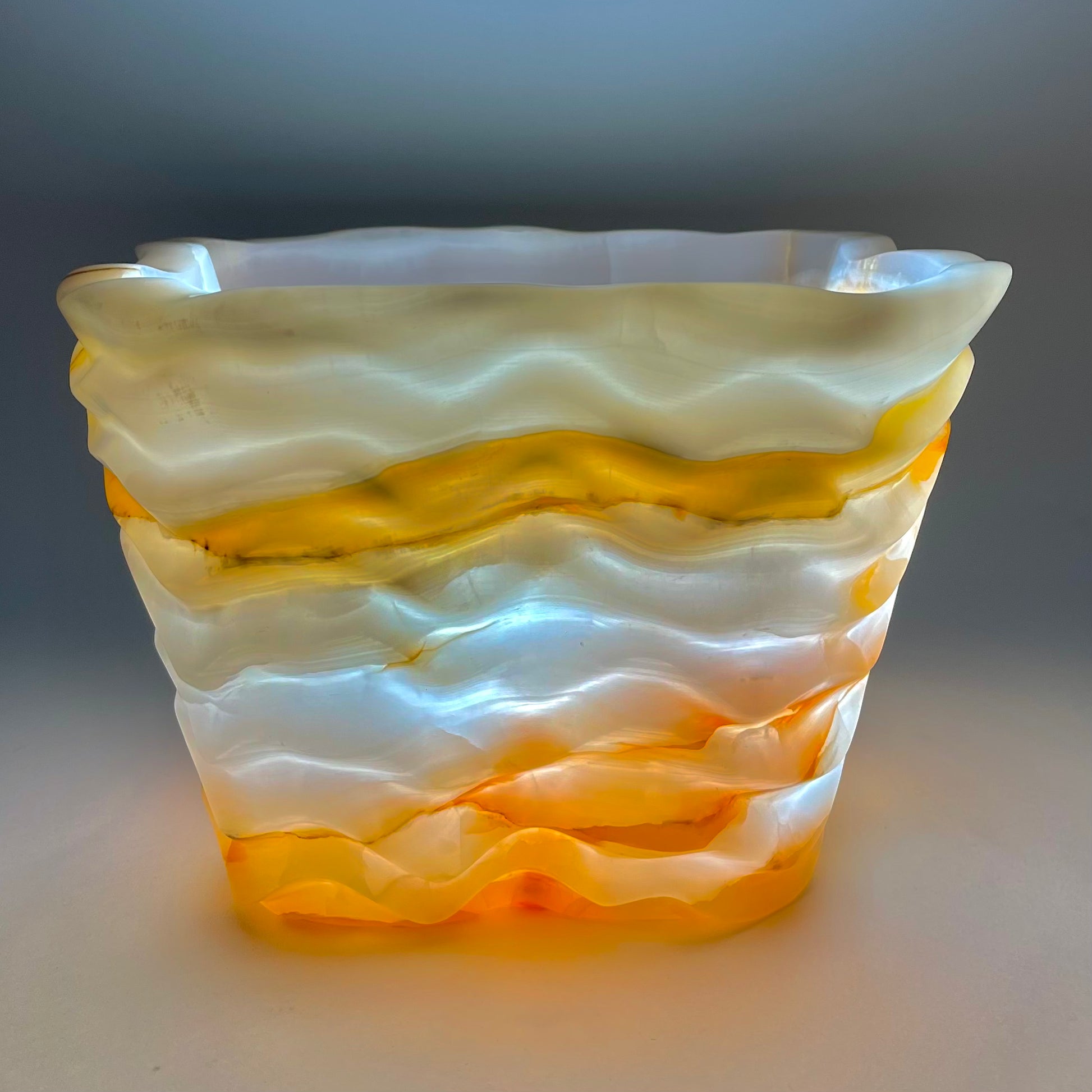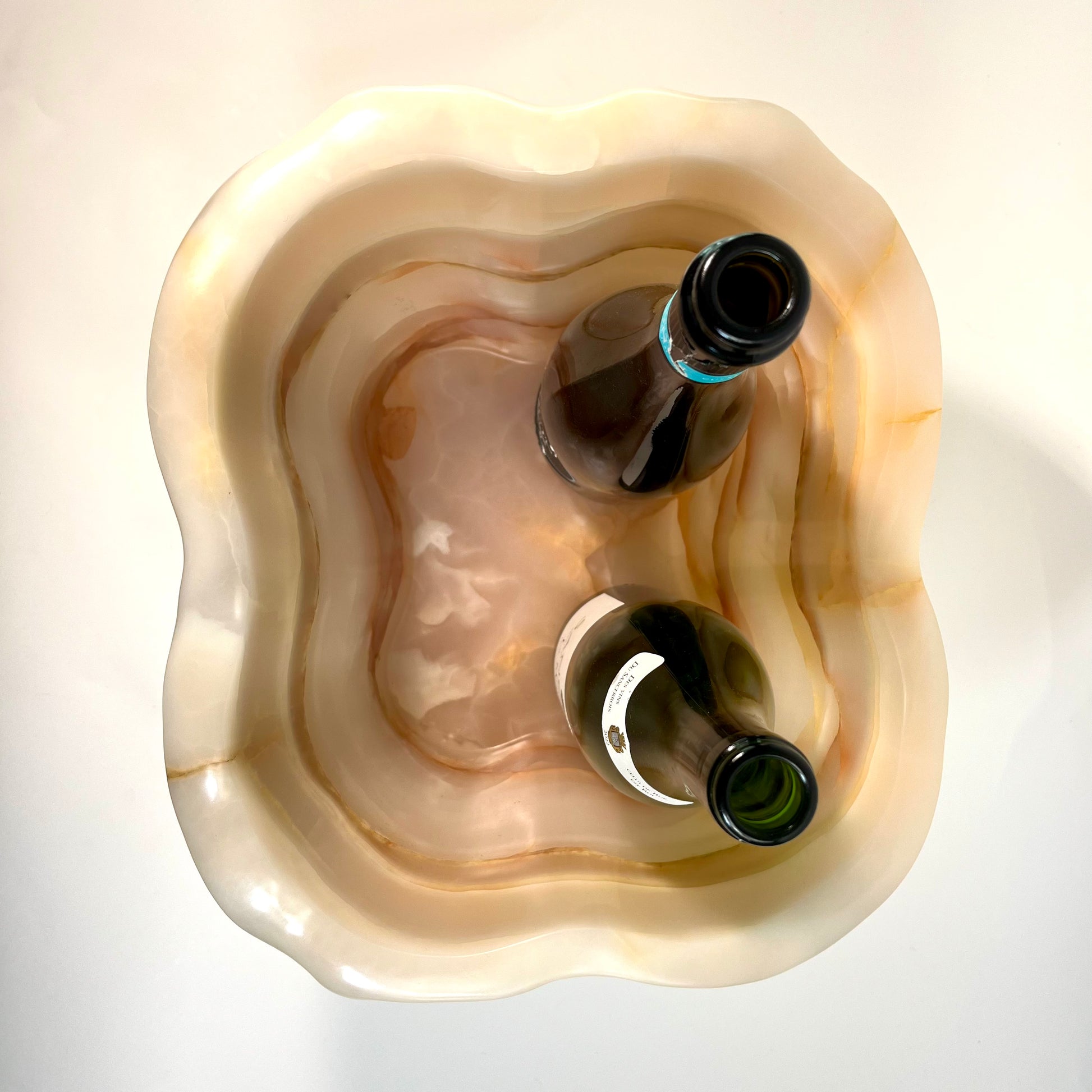 This translucent pink onyx wine chiller fits 4+ bottles of wine. It comes with waterproof lights that you can place into the ice to illuminate the chiller.