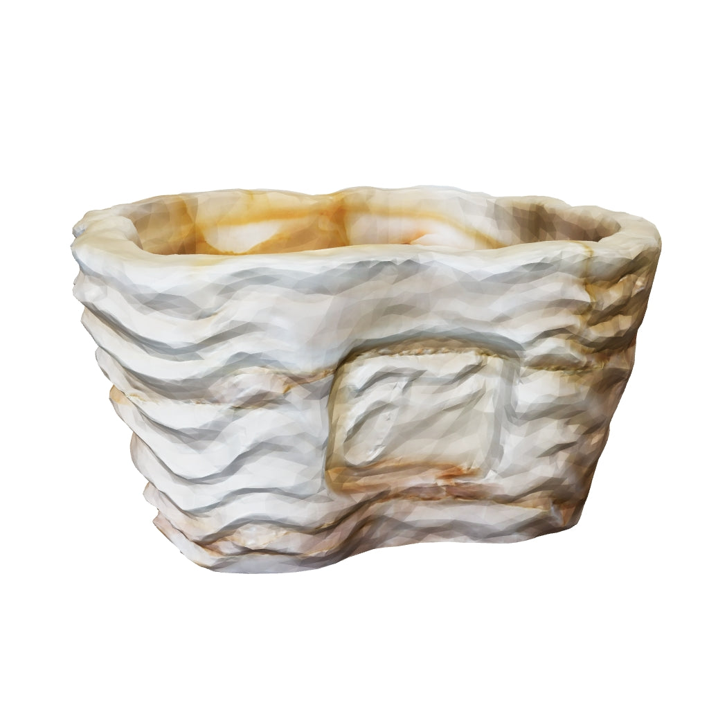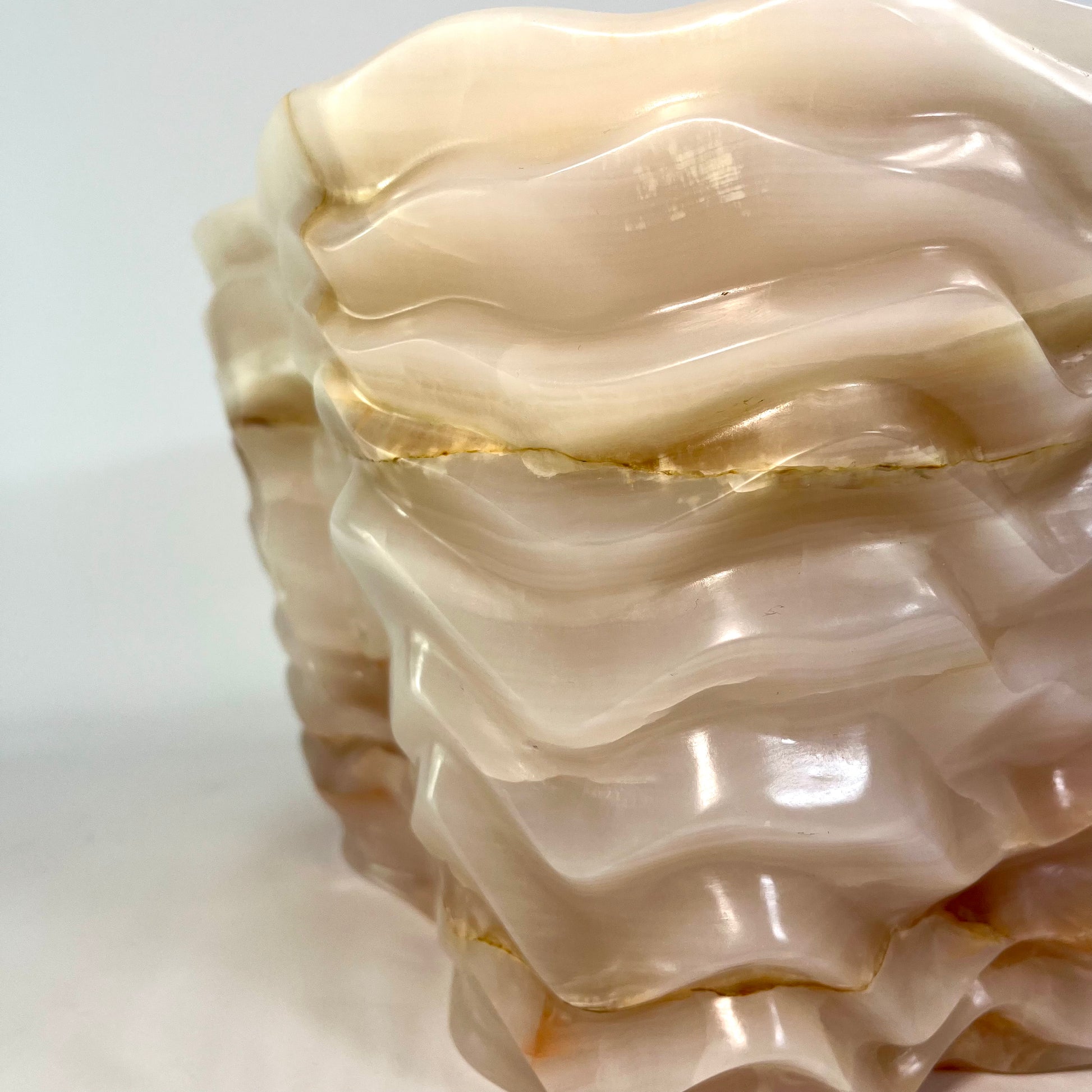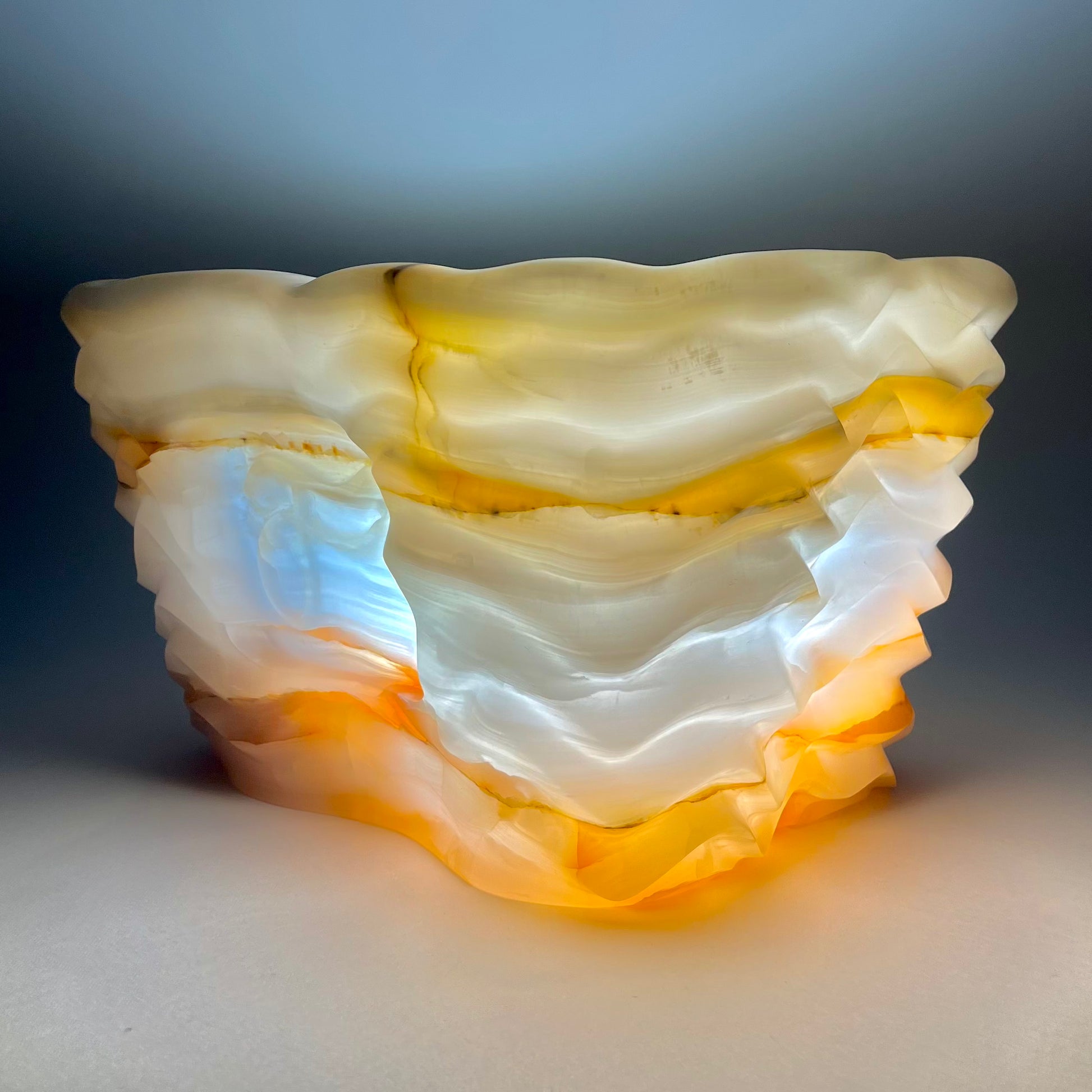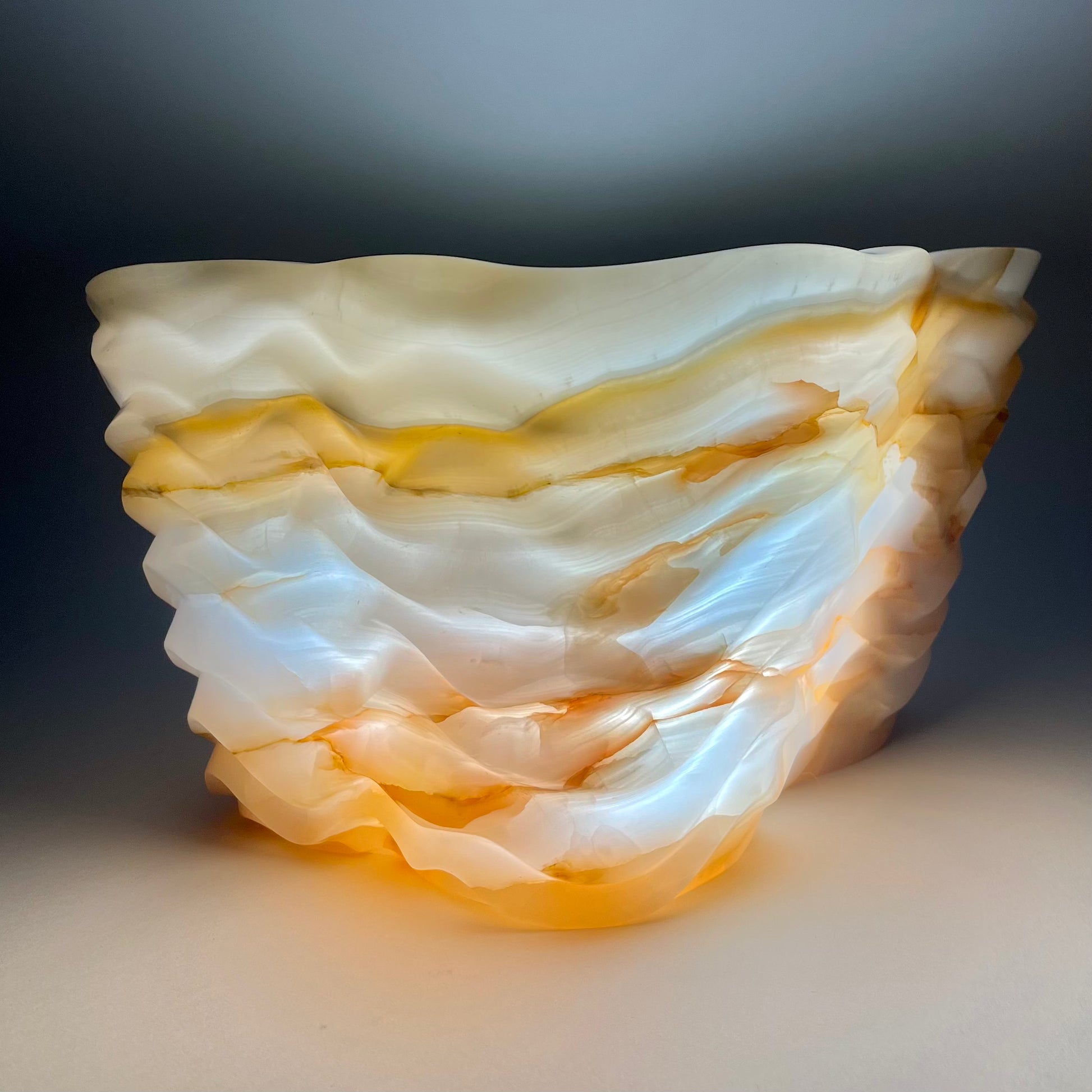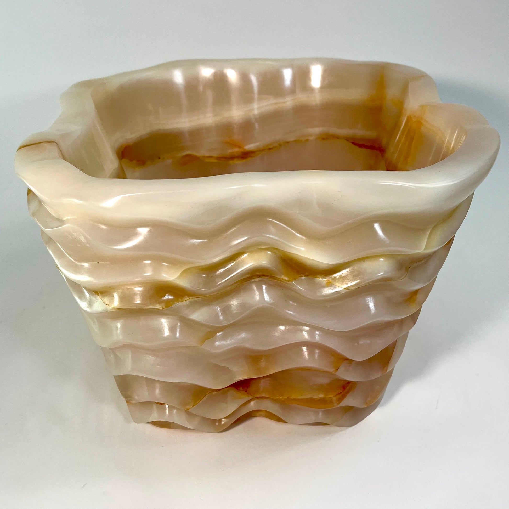 This translucent pink onyx wine chiller fits 4+ bottles of wine. It comes with waterproof lights that you can place into the ice to illuminate the chiller.