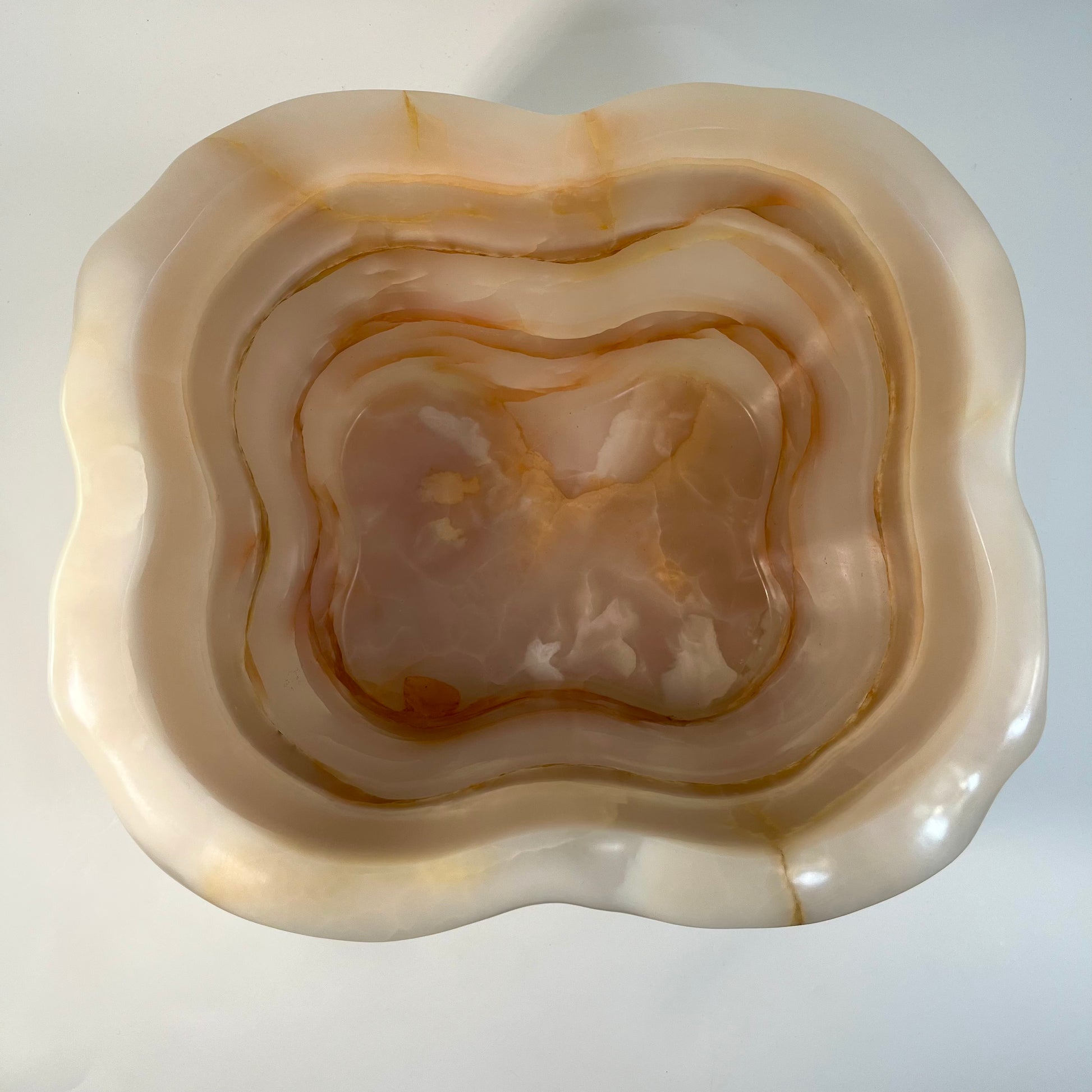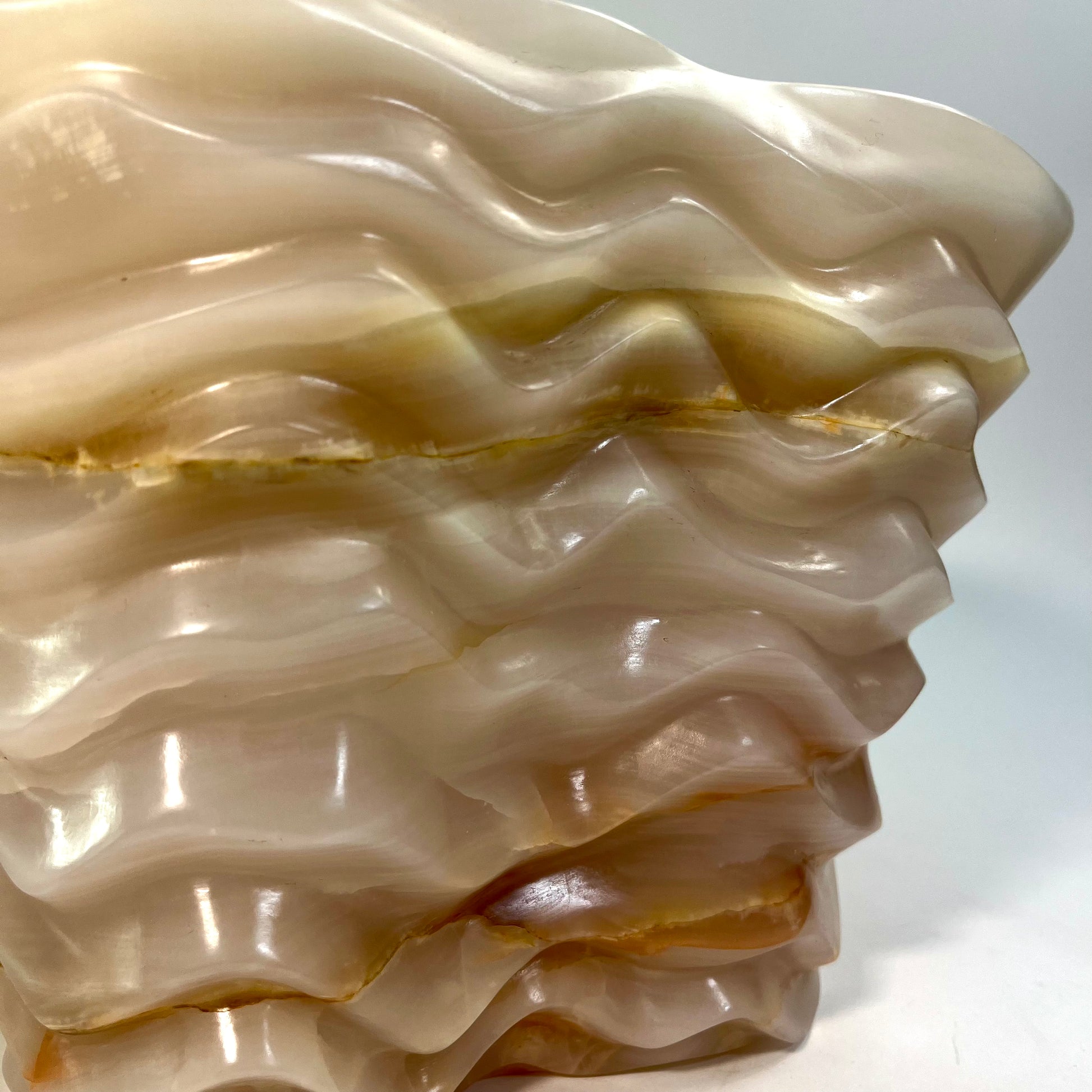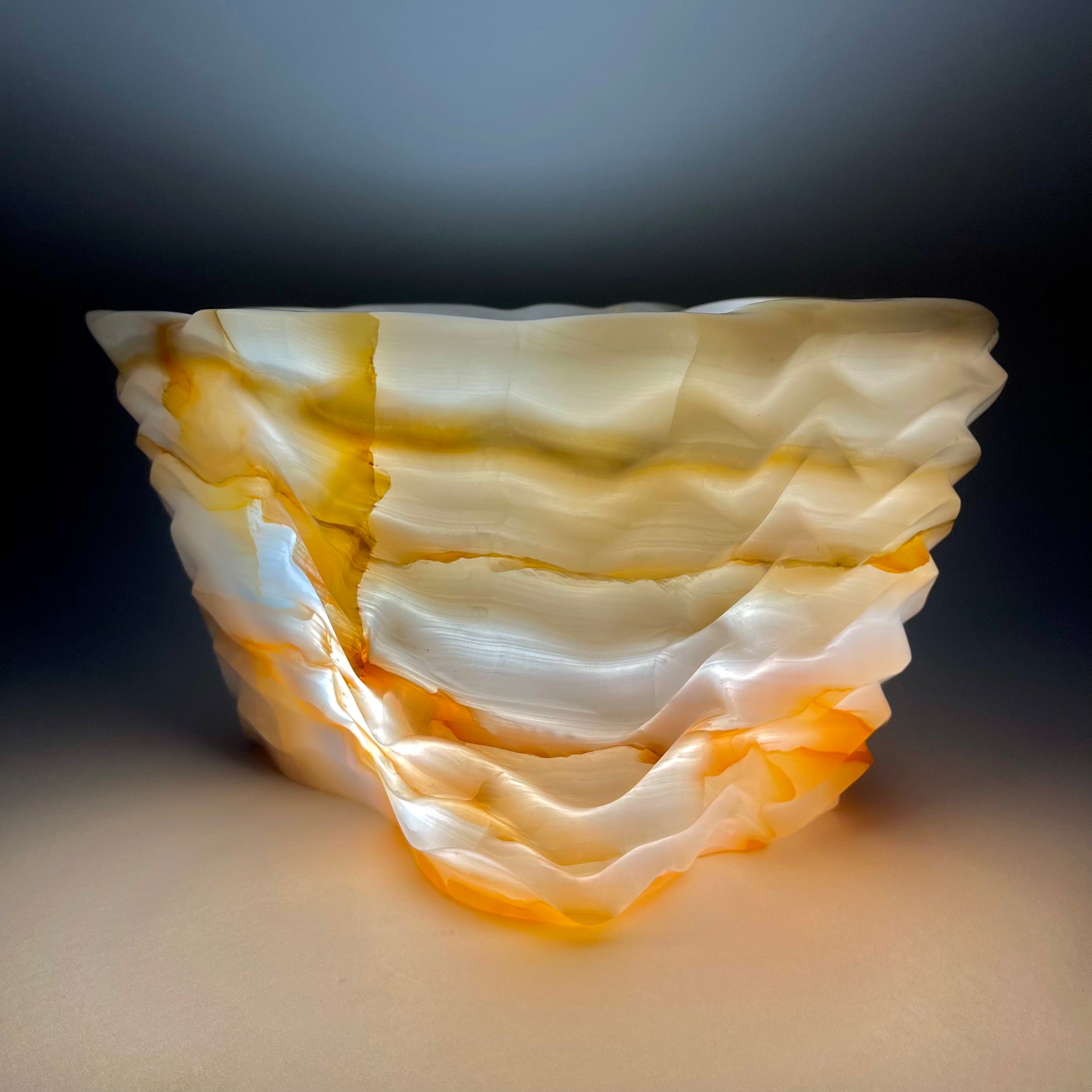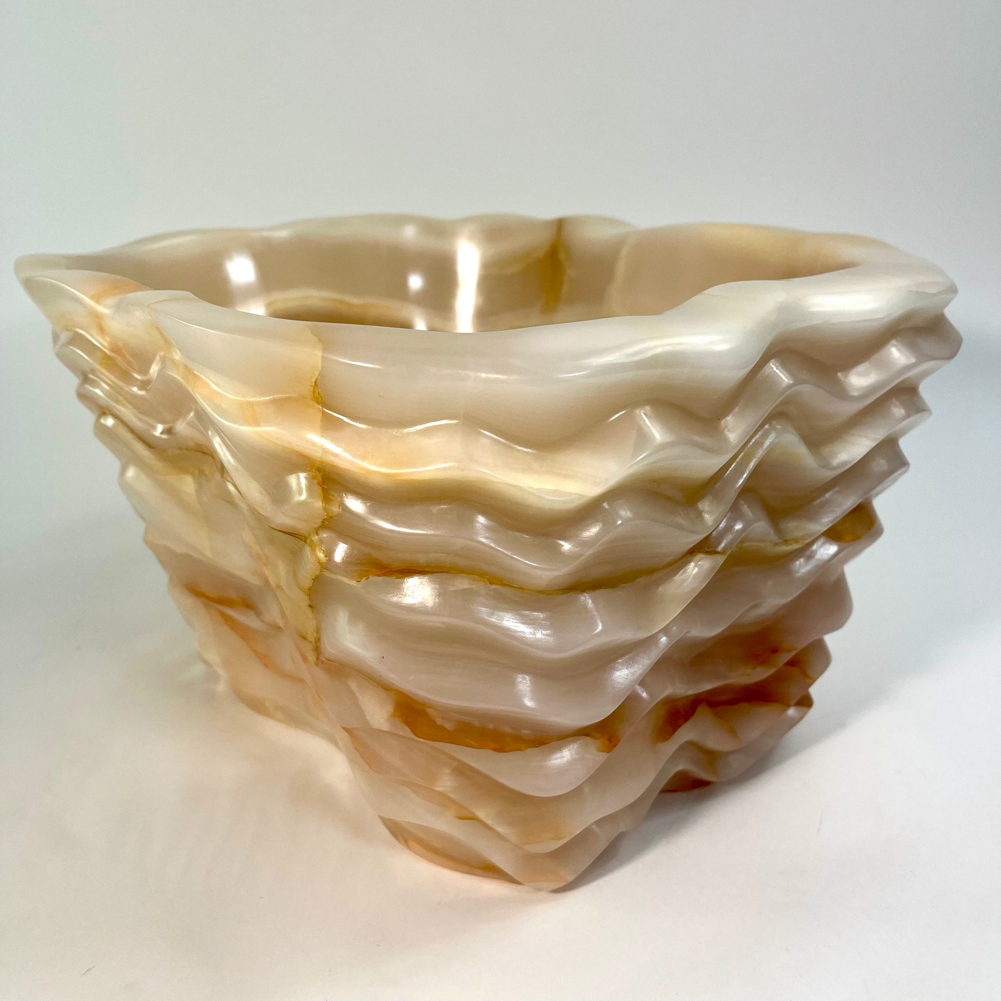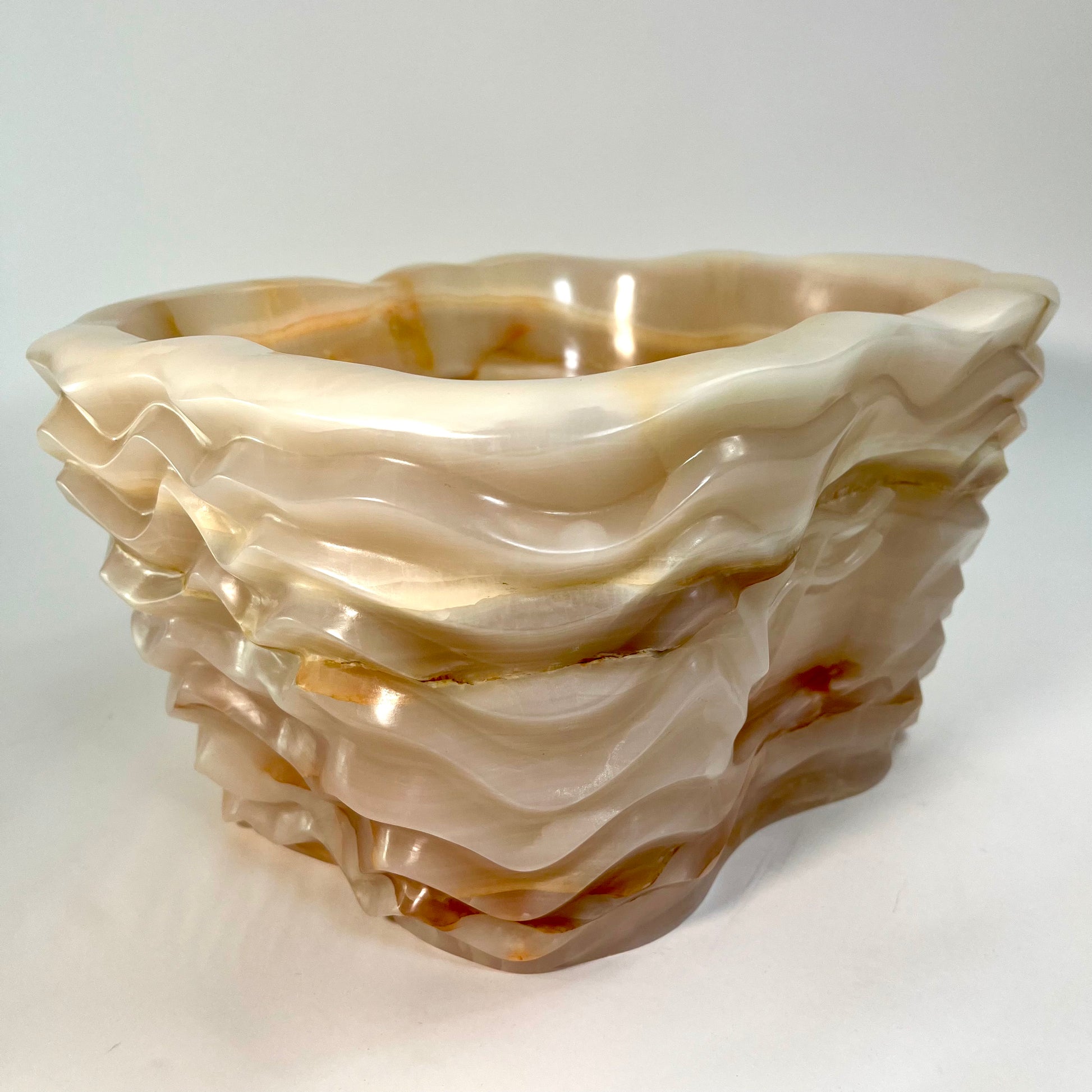 This translucent pink onyx wine chiller fits 4+ bottles of wine. It comes with waterproof lights that you can place into the ice to illuminate the chiller.